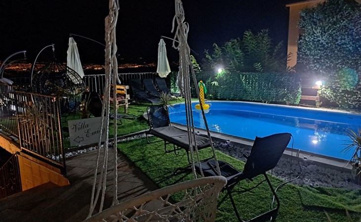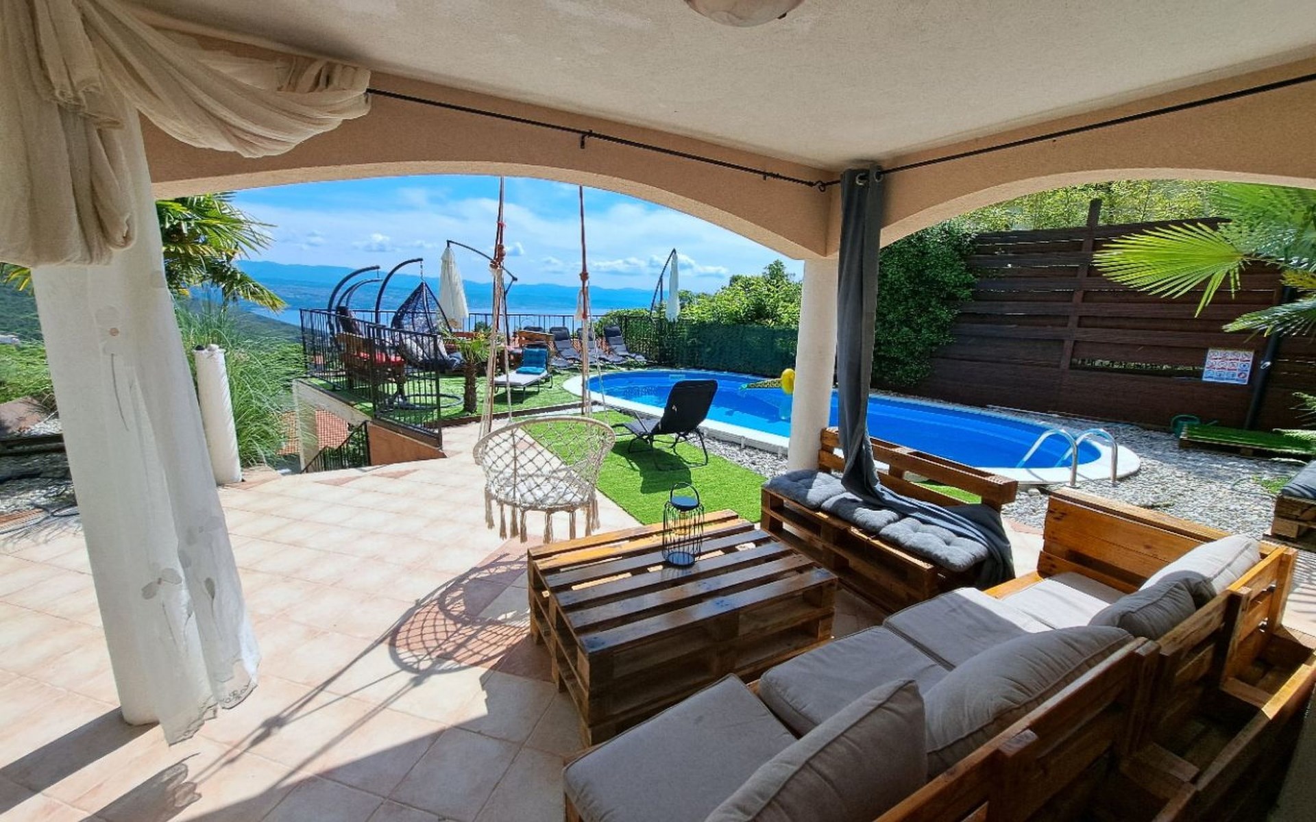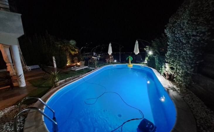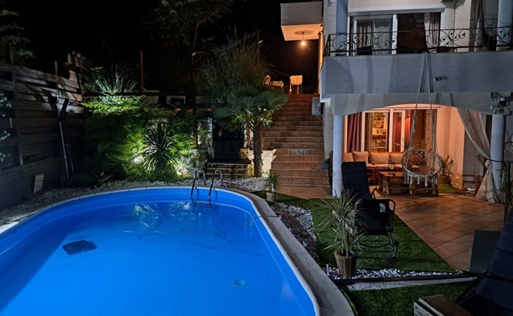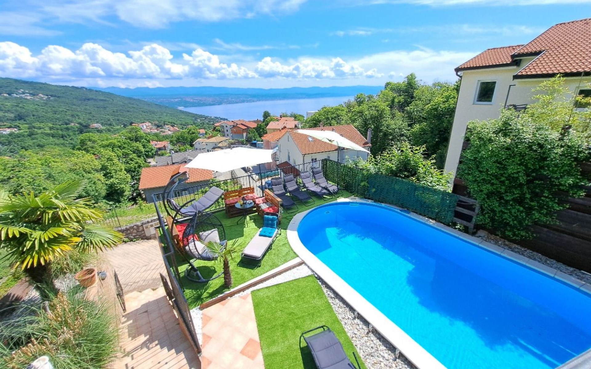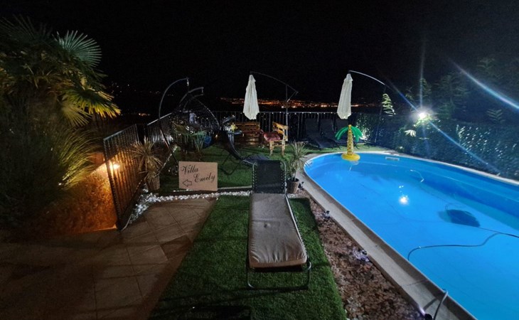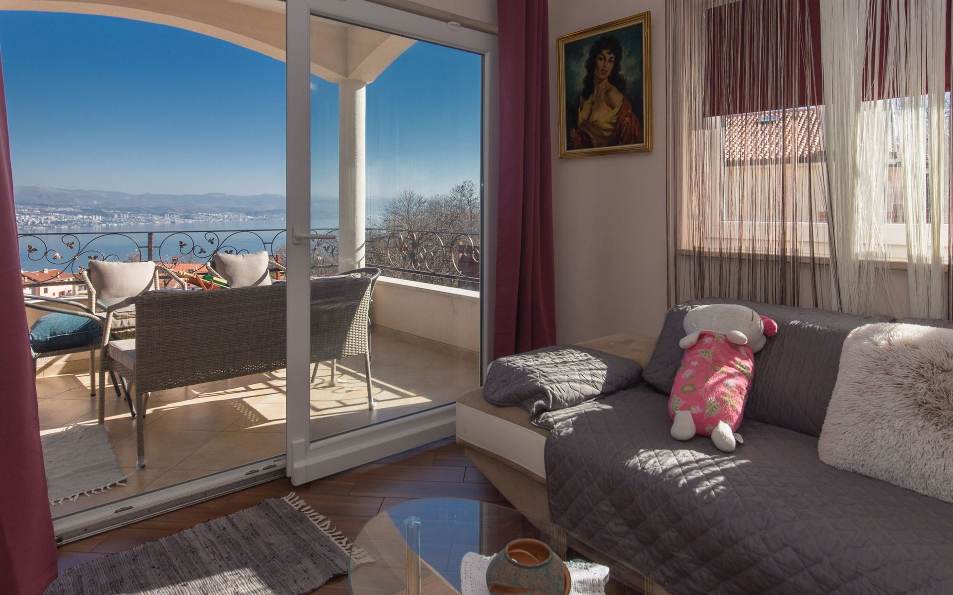 Beautiful Apartment In Unique Villa With Amazing Sea View. If you wan't to have an unforgettable and unique holiday this is a right place for you. This beautiful modern villa is nested on a hill side over a small medieval town of Lovran on the famous Opatija riviera. It boasts wonderful views of the Adriatic from the terraces and very private garden featuring an infinity pool. The location is excellent with all the amenities and the beach in short walking distance. Outside you will find an all fresco dining area, sun loungers and some nice lounge furniture to enjoy the views and the sun. Indoors there is a spacious open living area folded with light and opened to the garden.Villa is a residential facility, built on three floors: ground floor, first floor and attic with a swimming pool and Jacuzzi in the front of the house and an outside kitchen in back of the Villa. The house has, 2 bathrooms, 1 guest toilet, 4 bedrooms, 3 terraces, attic and it is fully air-conditioned. This unique Villa is made in combination of modern living style and vintage style. Apartment in Villa can host up to 8 people and it is perfect for 8 people, like young couples, or one big Family, or even two Families. The Villa has been fully refurnished and decorated in a new fashion cozy design. Each room is different and each room is unique. From master's room which has it's own private bathroom, you can enjoy a beautiful view on the Kvarner Bay and sea with mountains behind while you are laying on your big bad, and in the morning you will see the sun rising while you wake up. Enjoy your morning coffe on your terrace while watching the sea in front of you. On the ground floor or first floor is a beautiful large living room with view on the Kvarner Bay with a fireplace, covered terrace, kitchen and dining room with access to the rear of the house to the terrace. The rear terrace behind the kitchen and dinning room is equipped with a big large table and summer kitchen, so you can sit outside and enjoy your morning breakfast, launch or dinner. On the small hill behind the house is big fireplace where you can prepare your favourite meals outside in the nature, surrounded by beautiful garden with lots of flowers, palms and green wood. From this point you have also a beautiful view on the swimming pool and Kvarner bay and City of Rijeka which shines at nights giving you a wonderful feeling and a great view. This place is a place where you will for sure enjoy your stay in the villa. Imagine yourself staying outside on the fresh air, with a fireplace burning, drinking a glass of homemade vine or a glass of cold beer, overlooking the Kvarner bay and City of Rijeka while the music is playing your favourite song. It is just fantastic and this is something you can just imagine but you can feel it in Villa. Internal stairs lead to the second floor where there are three large bedrooms and a large bathroom. Each room is decorated in a unique cozy style, like Lover's room in violet colour, or Paris room in red and grey, or master room with it's own private bathroom with a terrace and view on the sea. In the attic is a small studio with big double bed, perfect place for kids to play. On each floor there are wonderful large covered balcony overlooking the entire Kvarner bay and Adriatic sea. The house is situated in a peaceful location with beautiful sea views and surrounded by greenery and overlooking Lovran chestnuts. The garden is well tendered with lots of green trees, flowers, palms, and green grass, making your stay more confortable. Interior of the house is completely decorated with beautiful pictures from famous academic painter Claudio Frank. The house has parking space for approximately three vehicles. In front of the house, in the garden there is a big swimming pool with a beautiful view on a sea and City of Rijeka and Kvarner bay, where you can enjoy swimming and relaxing in the pool drinking your favourite cocktail. The area around the pool is equipped with sun loungers and some nice lounge furniture to enjoy the views and the sun. There are also lots of palm trees around the swimming pool making you feel like you are on the beautiful beach. Close to the swimming pool is another terrace with a Jacuzzi and hidromasage where you can enjoy your stay in this massage pool and drink your favorite cocktail. Just to point out what is so special in the Villa: -The house is situated on the hill with a beautiful view on the sea and Kvarner bay -The house is surrounded by the trees so you have a complete privacy at this place -The interior of the house is completely new and the house is equipped with everything you need to make your stay comfortable and unforgettable -The wine cellar with more than 50 different vines that you can taste and drink if you like it -Outside covered kitchen so you can stay outside on the fresh air in the hot summer days and nights -Outside Jacuzzi with a view on the sea -Outside swimming pool with the view on the sea -A butler on your disposal if you need it -If you don’t want to go to the supermarket for a shopping there is a butler at your disposal who will make a shopping for you or any other thing you need -You don’t have a time to make a bed or clean the kitchen or house no problem -There is a cleaning women also at your disposal when ever you need it she will came and do her job. And a thing that you will really like is the next one: -The first day when you arrive I can make a barbecue for all of you so you can eat and drink as much as you want and can. And I’m sure you will love this barbecue because it is made from home made staff, like meat, mushrooms, vegetables, all natural, and homemade vine. And that is just for a single price. - Or I can make also a fish diner for all of you with fresh sea food like fresh fish and other sea specialties and a home made white vine that will taste so good that you will really remember this dinner. And this is also for a single price . -And if you need any 