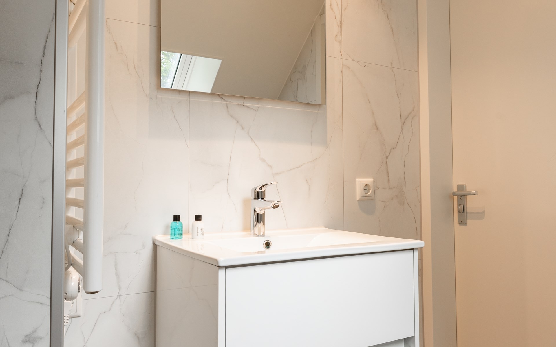 Op de begane grond vindt u de ruim opgestelde woonkamer met tv. Door de grote raampartijen geniet u van veel lichtinval. De open keuken is voorzien van hoogwaardige inbouwapparatuur, zoals een inductiekookplaat, Quooker, vaatwasser en koel-vriescombinatie. Ook bevindt zich hier het aparte toilet. Op de eerste verdieping liggen de 2 slaapkamers, elk met een eigen ensuite badkamer.