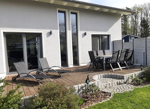 Maximaal 3 huisdieren/honden toegestaan. This semi-detached holiday home offers enough space for up to eight people and an additional small child on a living space of approx. 120 m². The holiday home was completed in November 2015 and is located in the Ostseeferienpark Rerik. The house has been certified with 5 stars by the German Tourism Association.Two parking spaces are available one behind the other, behind which an additional vehicle could be parked. If you have brought your own bikes or are hiring bikes, you can store them in a lockable bike shed. The large garden table with space for eight people invites you to enjoy a cosy barbecue. The garden is fenced in by a natural stone wall or wire mesh fence (height approx. 80 cm). An electric charging station, only for guests of the semi-detached house.You can open the entrance door to the outside with your individual access code, making it easy to get into the house. On the ground floor there is a large living/dining room with a cosy leather seating area, wood-burning stove and a large dining area as well as a high-quality and fully equipped fitted kitchen. From the living/dining room you can access the large terrace. There is also a large shower room with sauna. If you are not out and about, you can enjoy satellite TV or a good film on DVD from the living area. For those who prefer music, there is a stereo system with radio/CD, iPod and USB connection. Or you can relax in front of the wood-burning stove and listen to the crackling of the fire. A modern, fully equipped and spacious eat-in kitchen is available so that you can indulge in your culinary hobby while on holiday. It has a large fridge with freezer compartment, induction hob, extractor bonnet, raised oven, dishwasher, microwave, etc. The modern bathroom with adjoining sauna consists of a floor-level shower, toilet and washbasin. After a sauna session, you can step out into the fresh Baltic Sea air via a double door. On the first floor you will find a total of three bedrooms and a bathroom. Two bedrooms each have a double bed (180 cm x 200 cm), two bedside tables, two stools, wardrobe and satellite TV. One bedroom has two single beds (90 cm x 200 cm), bedside tables, stools, board and satellite TV. All beds have adjustable slatted frames and high-quality mattresses and are at a comfortable height. On this level you will also find a beautiful wellness bathroom to relax in with a bathtub, floor-level shower, toilet, hand basin and hairdryer. For the safety of our younger guests, we have fitted the upper floor with child safety doors on the stairs. The loft is the perfect place for your children. They sleep in two bunk beds (90 cm x 200 cm). If you want to study or work while on holiday, you will find a desk here - WLAN access is available free of charge. You can relax in the cosy corner with two beanbags and satellite TV.The nearby Baltic Sea cycle path is an ideal starting point for cycling tours through the beautiful Kühlung countryside. The location between the old Hanseatic cities of Wismar and Rostock, but also the nearby Kühlungsborn offers numerous opportunities for interesting excursions.The house is ideal for families with children, intergenerational holidays, holidays with friends or colleagues, but also for couples looking for peace and quiet. The high-quality and stylish furnishings will make your holiday an unforgettable experience. The ground floor and ground floor are fully tiled, the loft is covered with vinyl. A travel cot and high chair are available for small children. Children's crockery and cutlery are also included in the inventory. Dogs are welcome. However, home textiles, couch and all beds are off-limits for four-legged friends. A washing machine is also available. Each bedroom has fly screens and blackout blinds (pleated blinds or curtains). A safe has been installed for your valuables. Charcoal, open fires and fireworks are not permitted due to the fire hazard of the thatched roofs.