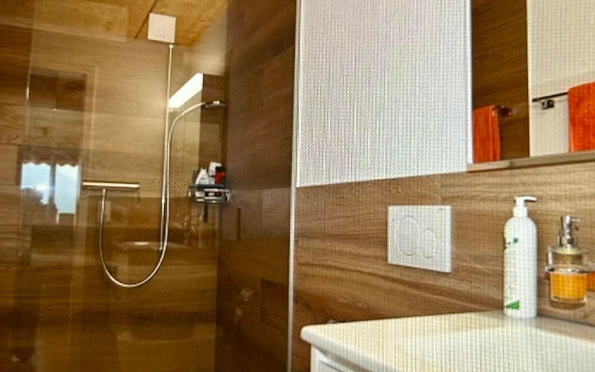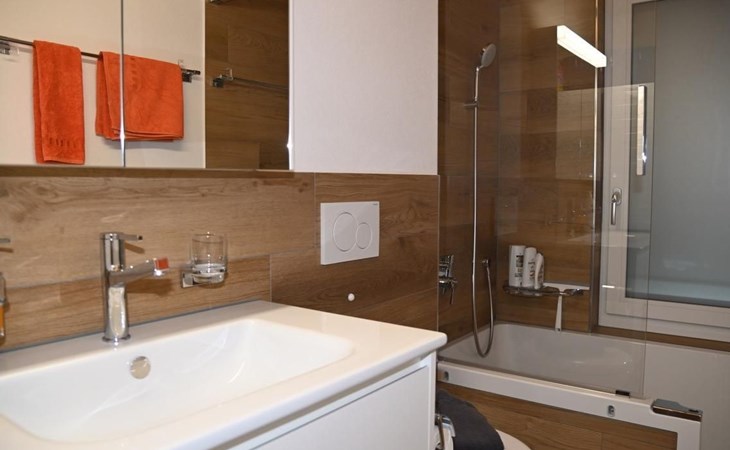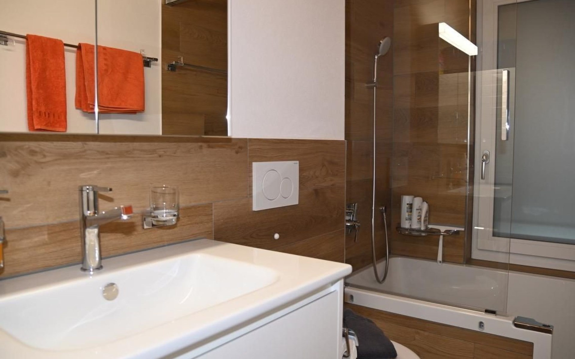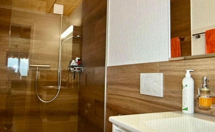 Two bathrooms – one with shower, hand basin, Aquaclean toilet, mirror cabinet; the other with bathtub/shower, hand basin, toilet, mirror cabinet, washing machine and dryer.
