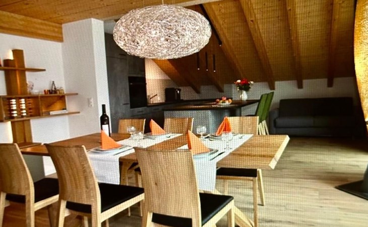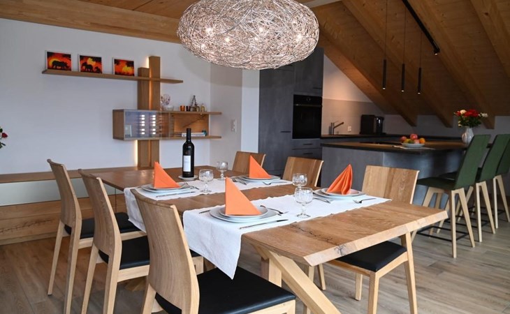 Living area with large wooden table, lounge suite, coffee table, cable TV flatscreen 130 cm and internet connection (Wlan).