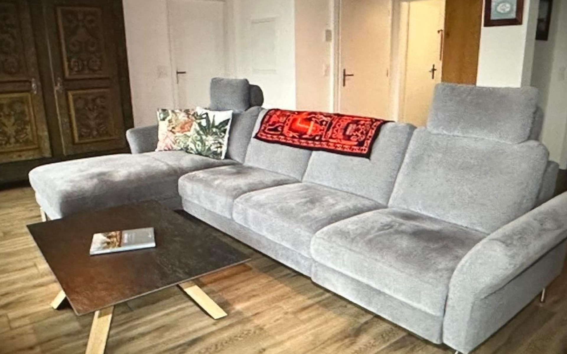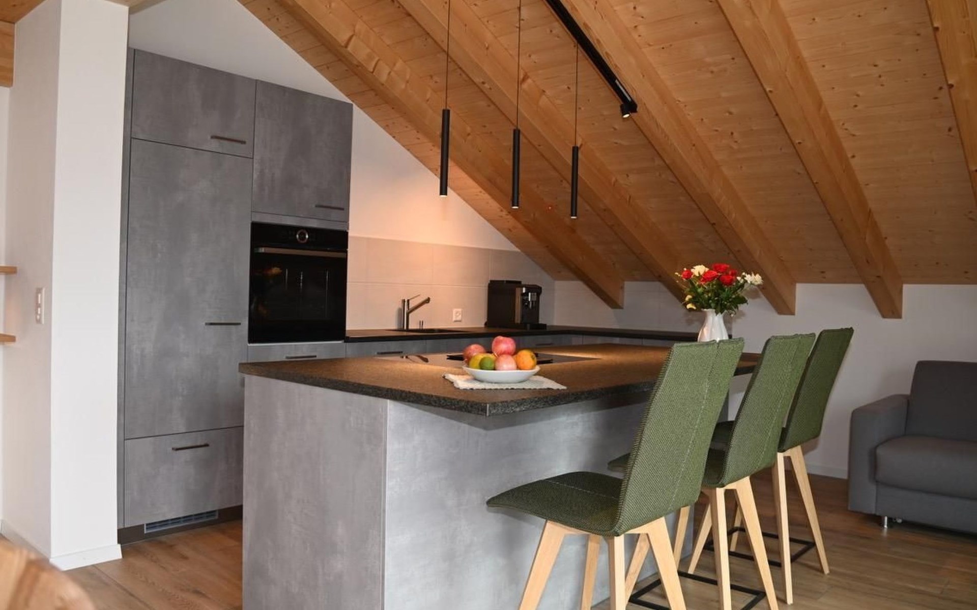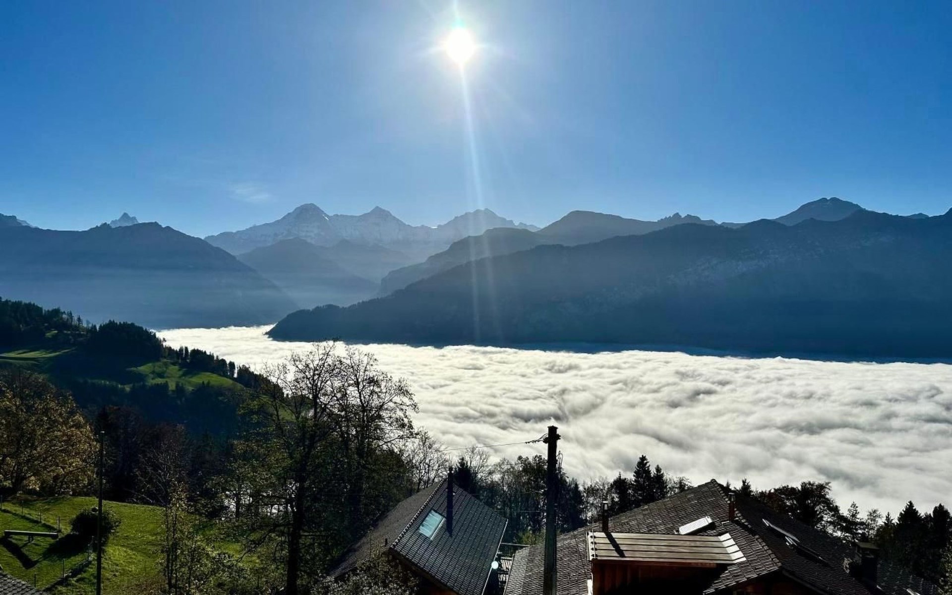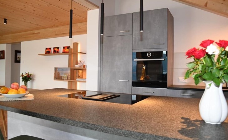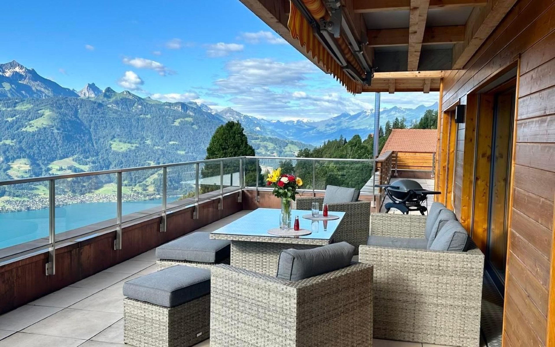 The apartment offers plenty of conveniences so you can enjoy a care-free holiday. The view from the apartment to the mountains and lake Thun is second to none. From the balcony on the South side (44 m2) with comfortable outdoor furniture, sun blind and electric grill you can enjoy the wonderful view to the most famous mountain tops of the Bernese Oberland – Eiger, Mönch and Jungfrau and from the balcony on the Western Side you marvel at the sun setting over the mountains leading to the Kander Valley and beyond.