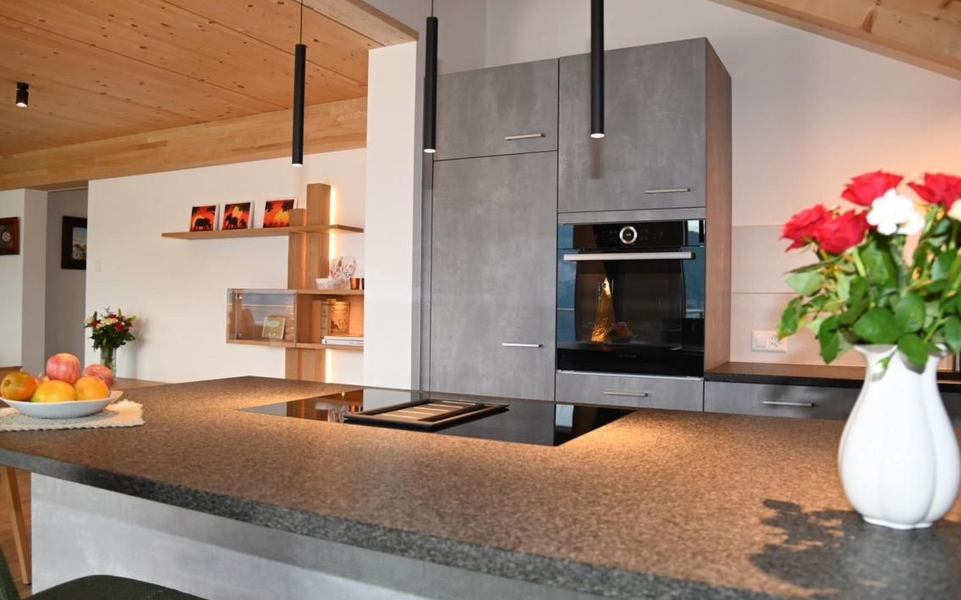Well-appointed kitchen with stone bench tops, island bench with ceramic cooktop (induction), extraction fan, electric oven,