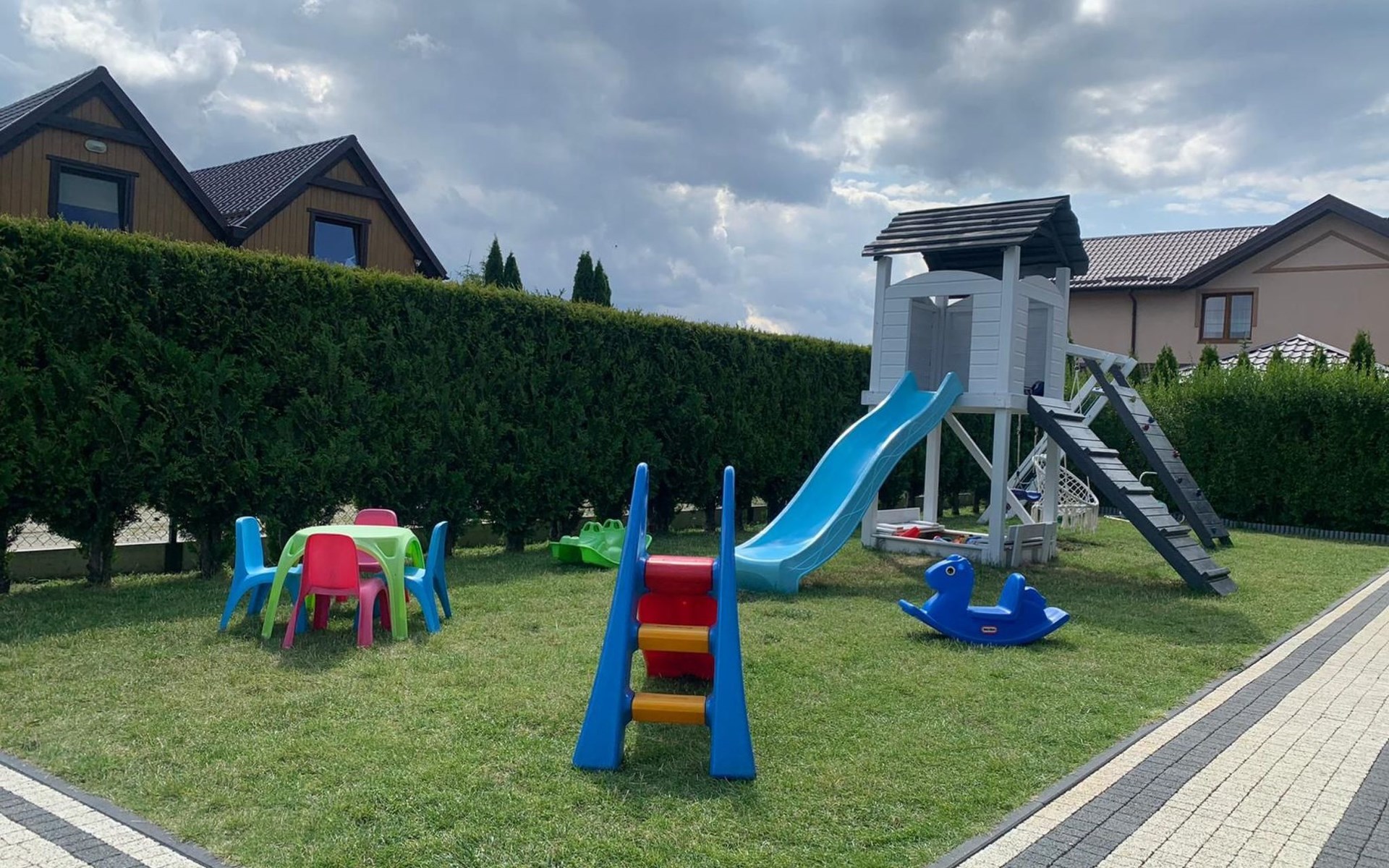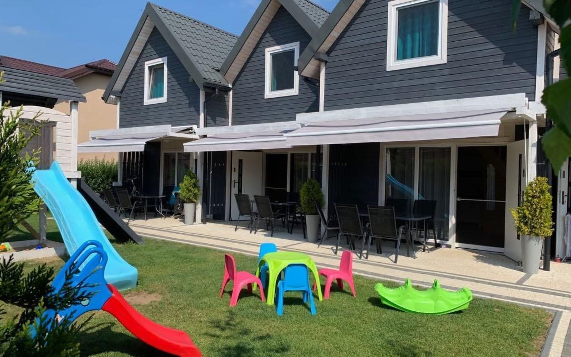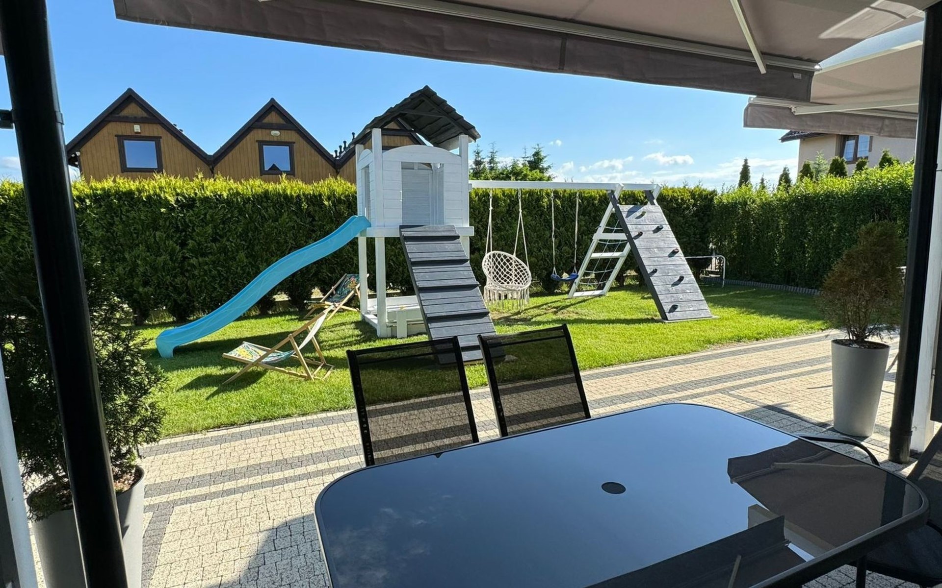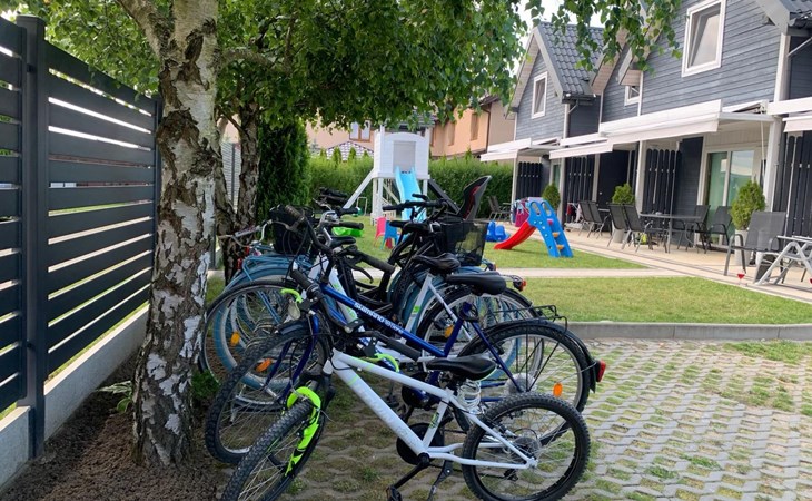 De woning wordt bewaakt. Wij bieden 1 parkeerplaats per huis op het terrein.In de gemeenschappelijke ruimte: kinderspeelplaats, zandbak met speelgoed, fietsen en barbecueplaats.Individuele inrichting van het terras: tuinmeubelen (tafel + 6 stoelen), zonnescherm.