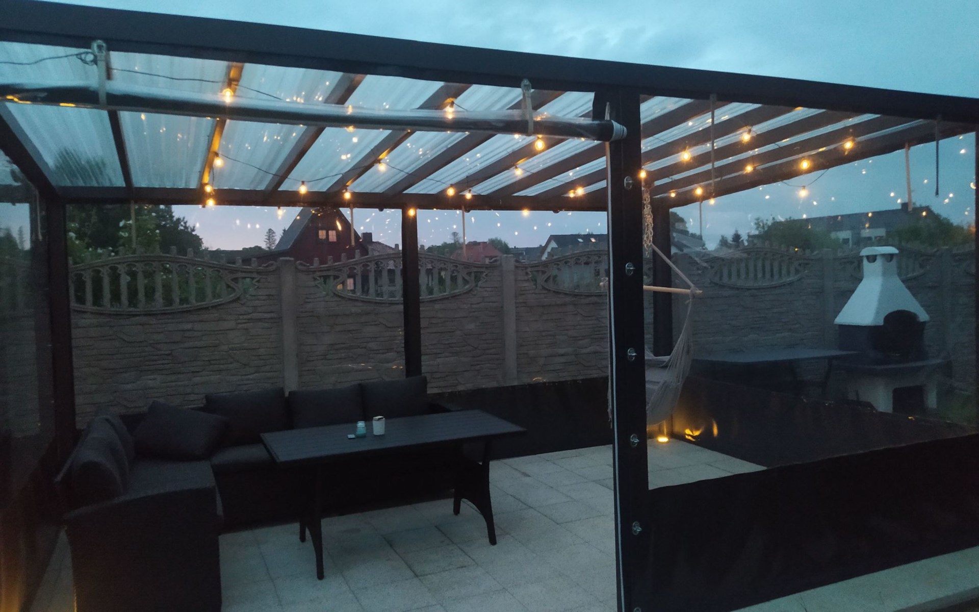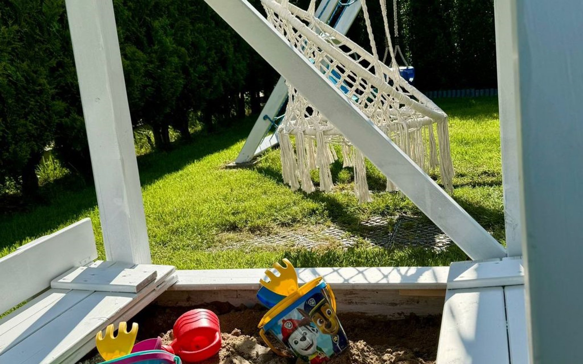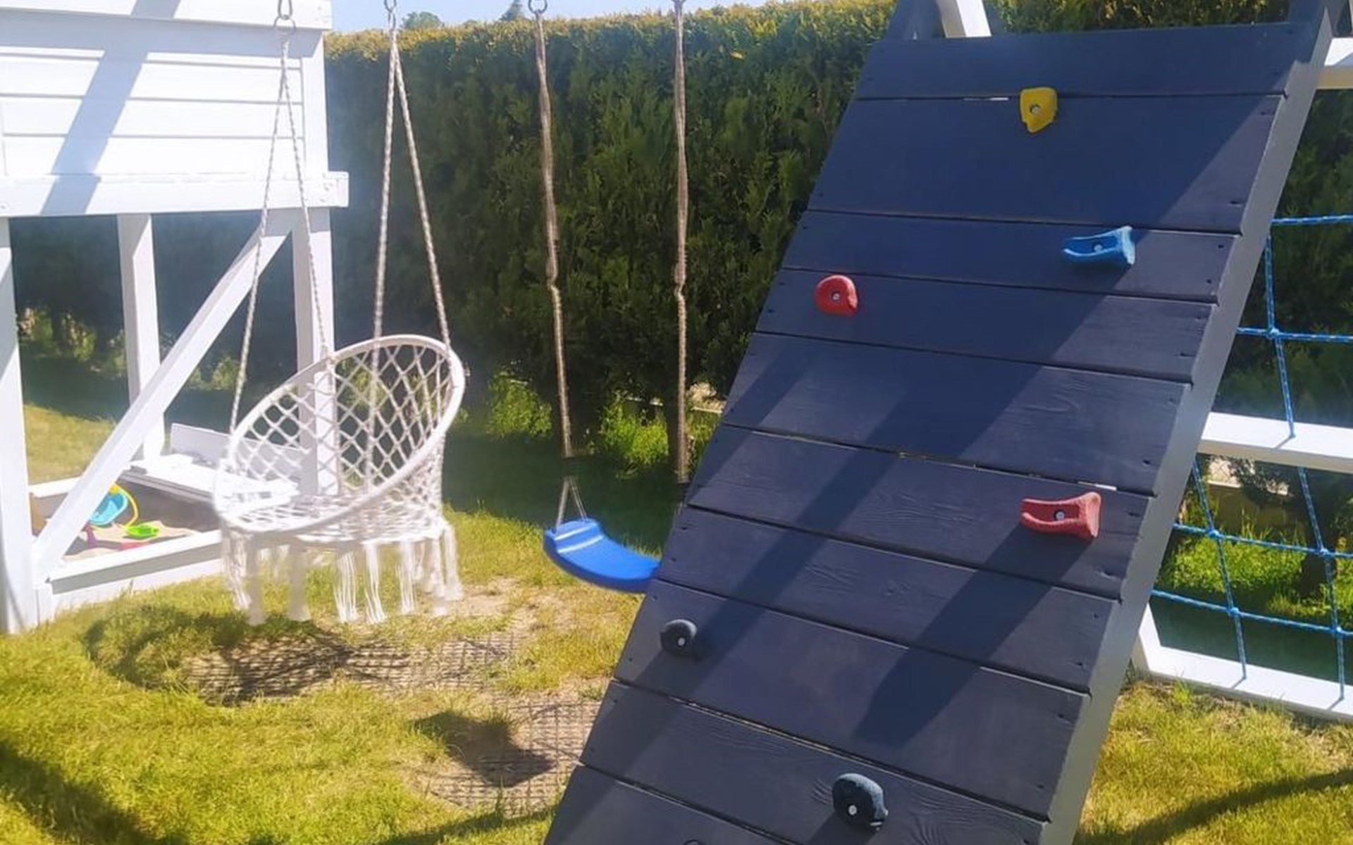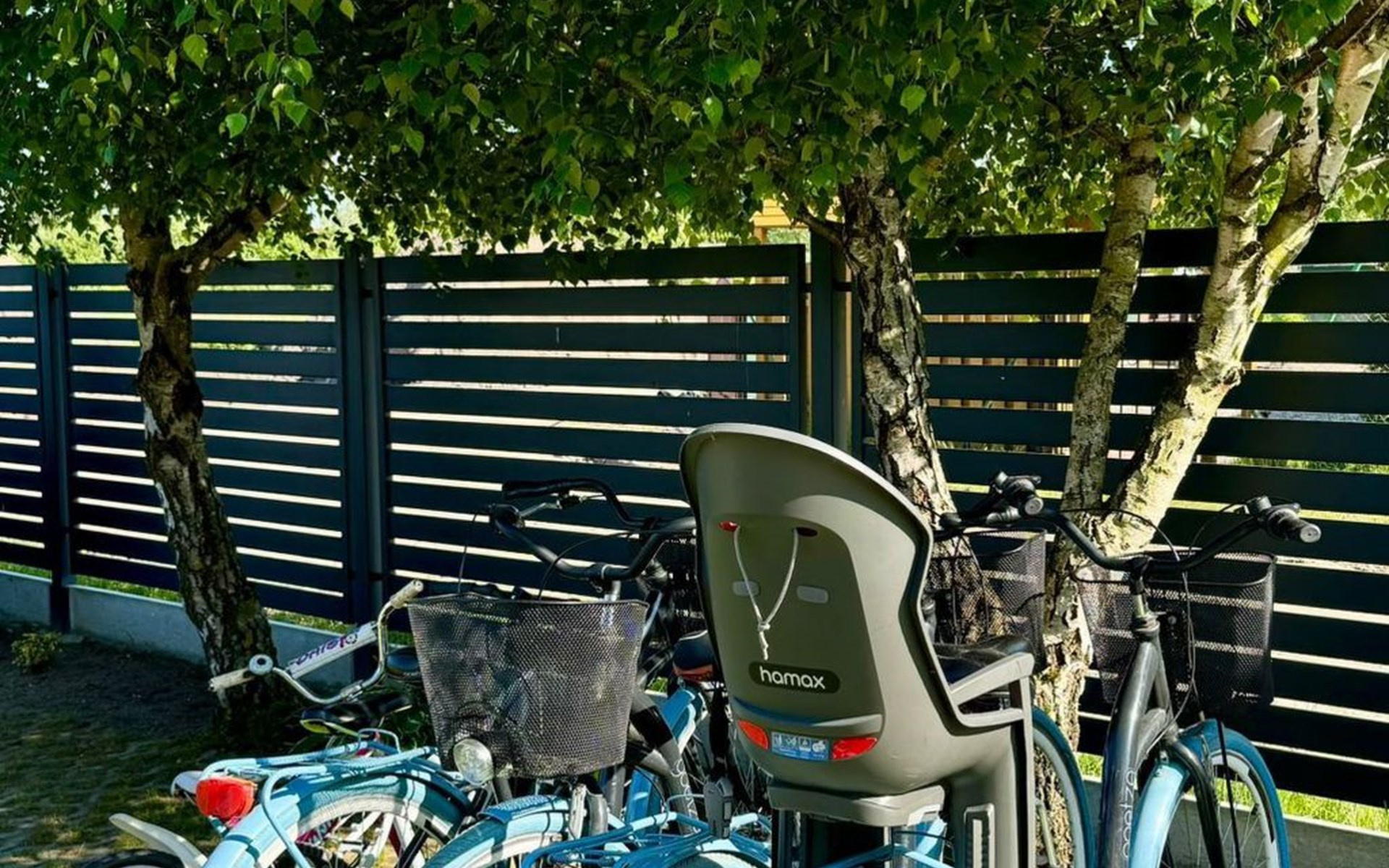 De woning wordt bewaakt. Wij bieden 1 parkeerplaats per huis op het terrein.In de gemeenschappelijke ruimte: kinderspeelplaats, zandbak met speelgoed, fietsen en barbecueplaats.Individuele inrichting van het terras: tuinmeubelen (tafel + 6 stoelen), zonnescherm.