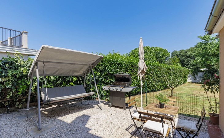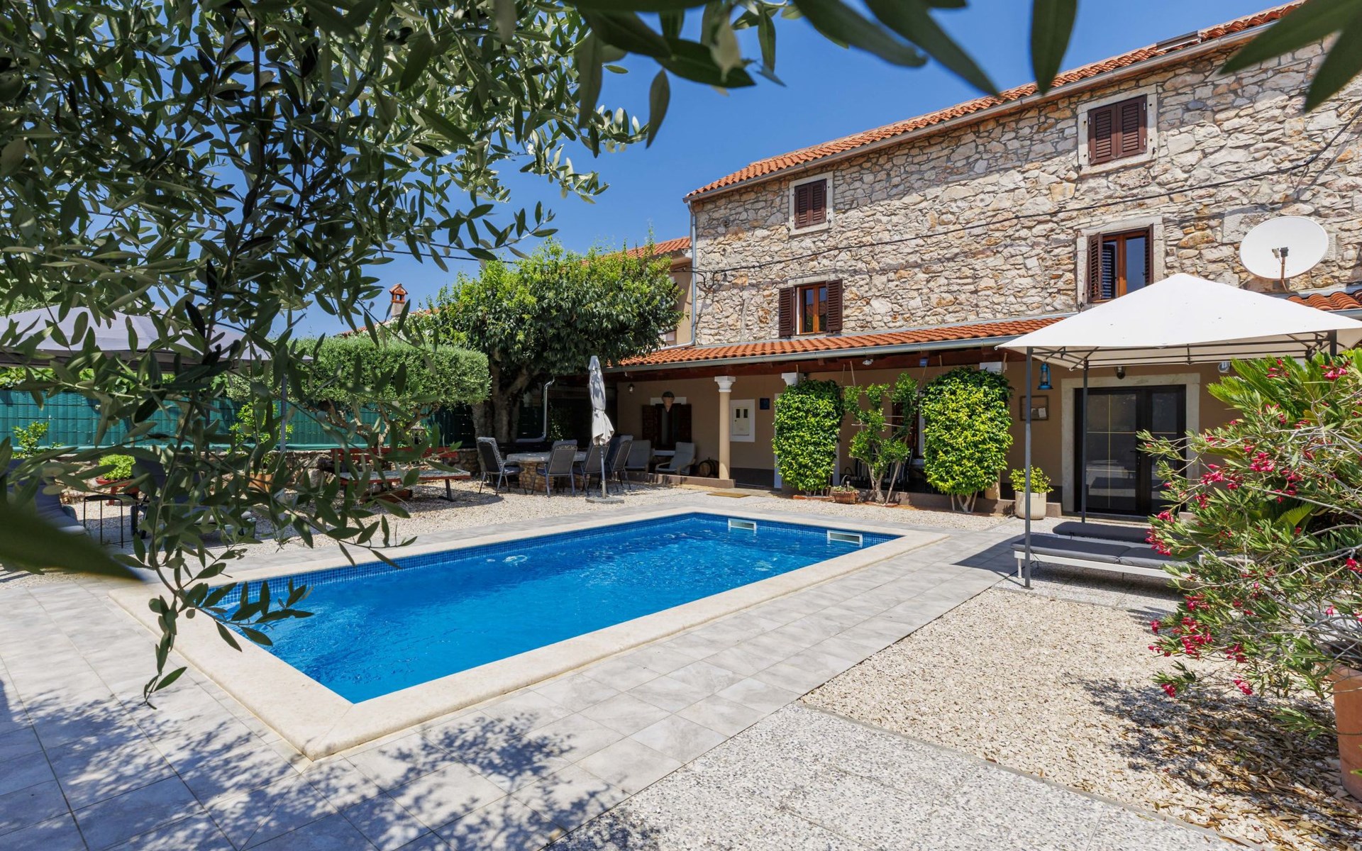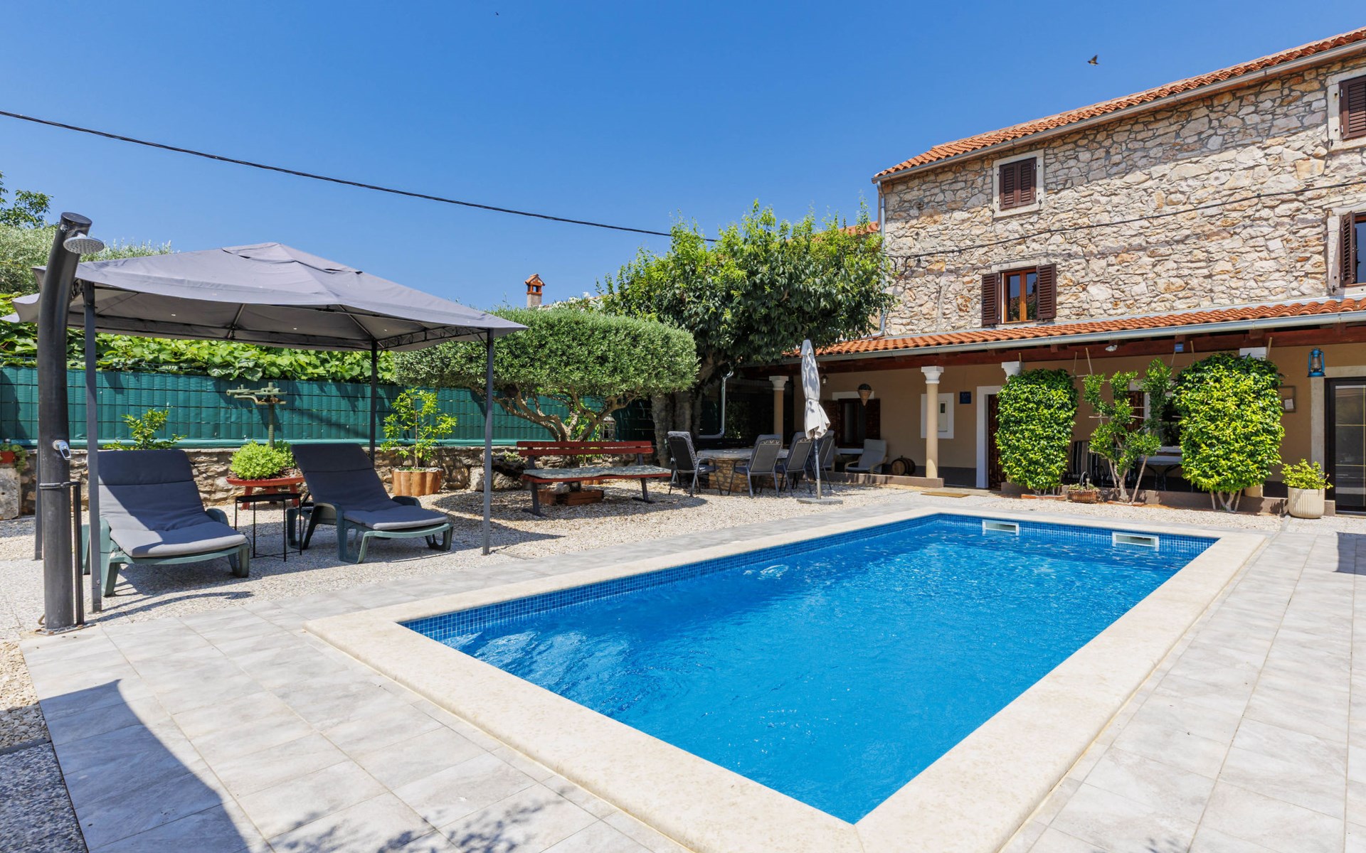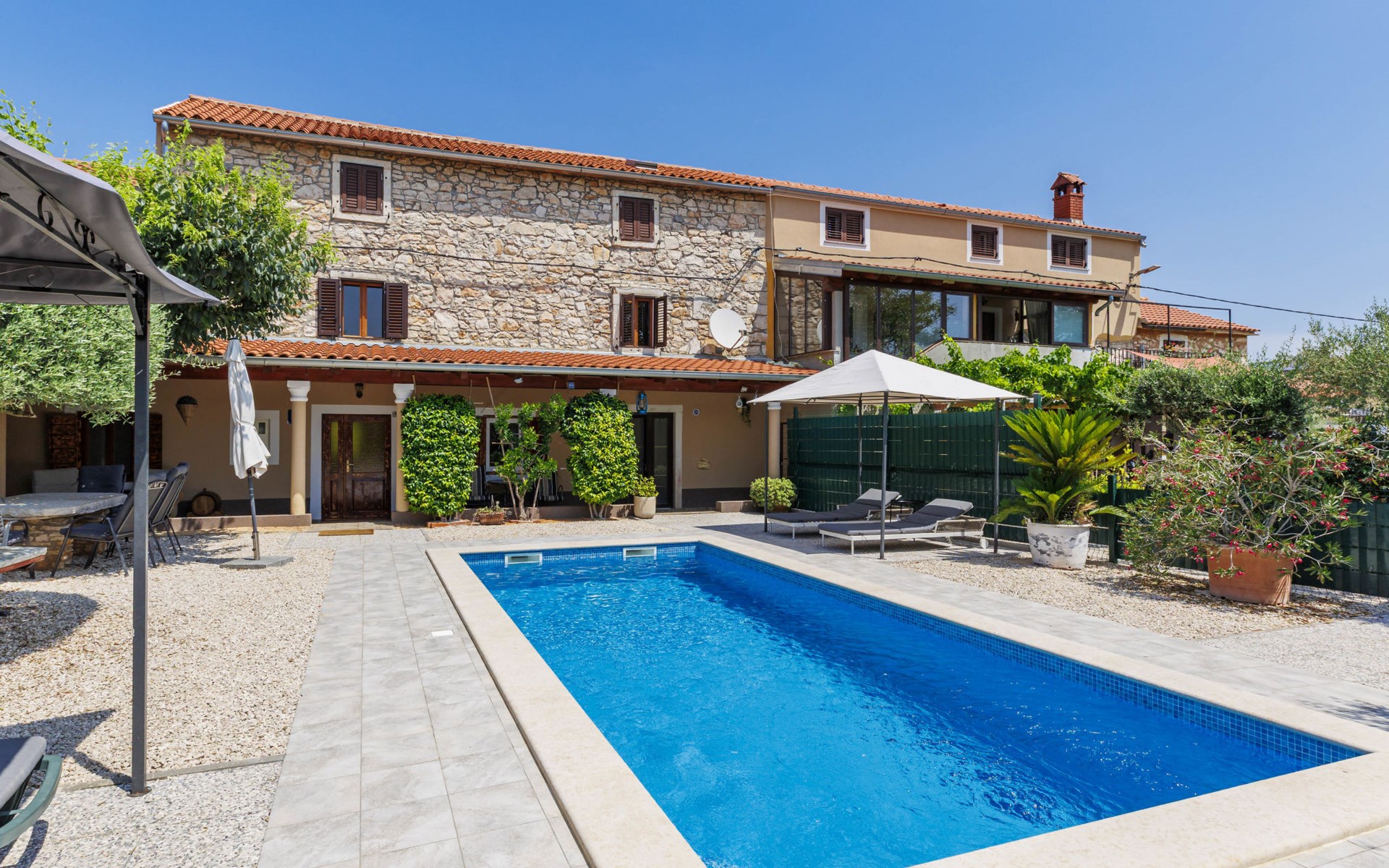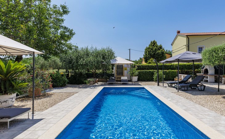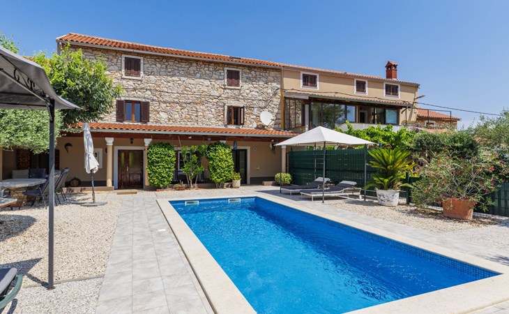 Brtonigla: Mooi twee onder één kap woning "Villa Lucky", van 2 verdiepingen, gerenoveerd in 2020. In het gehucht Lukoni, 3 km van het centrum van Brtonigla, 7 km van het centrum van Buje, 7 km van het centrum van Novigrad, rustige ligging, 4 km van zee, 4 km van het strand. Voor alleengebruik: terrein 400 m2 (omheind), openluchtzwembad hoekig (7 x 3 m, 26 m2, 145 cm diepte, seizoensgebonden beschikbaarheid: 01.Mei. - 30.Okt.) met trap. Buitendouche, terras, tuinmeubelen, onderhoud zwembad door de eigenaar/tuinman. In het huis: internetaansluiting, wasmachine. Parkeerplaats (voor 2 auto's) op het terrein. Winkel 3 km, supermarkt 7 km, restaurant 3 km, café 3 km, bushalte 3.3 km, kiezelstrand 4 km, stenenstrand 4 km, rotsstrand 4 km, betonnen strand 4 km. Geschikt voor families. De eigenaar accepteert geen jeugdgroepen. Dieren in de buurt.