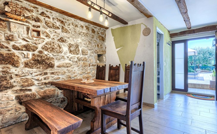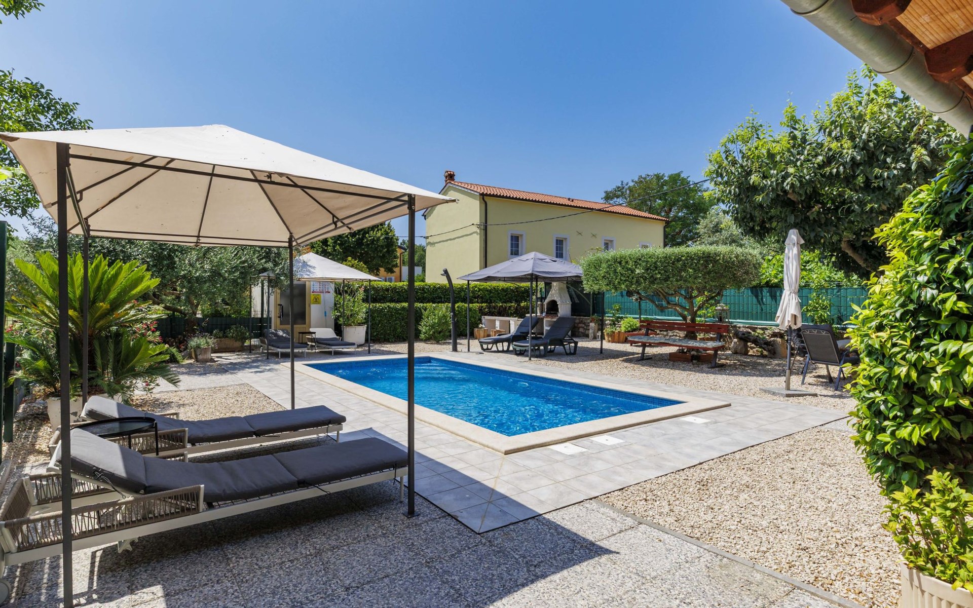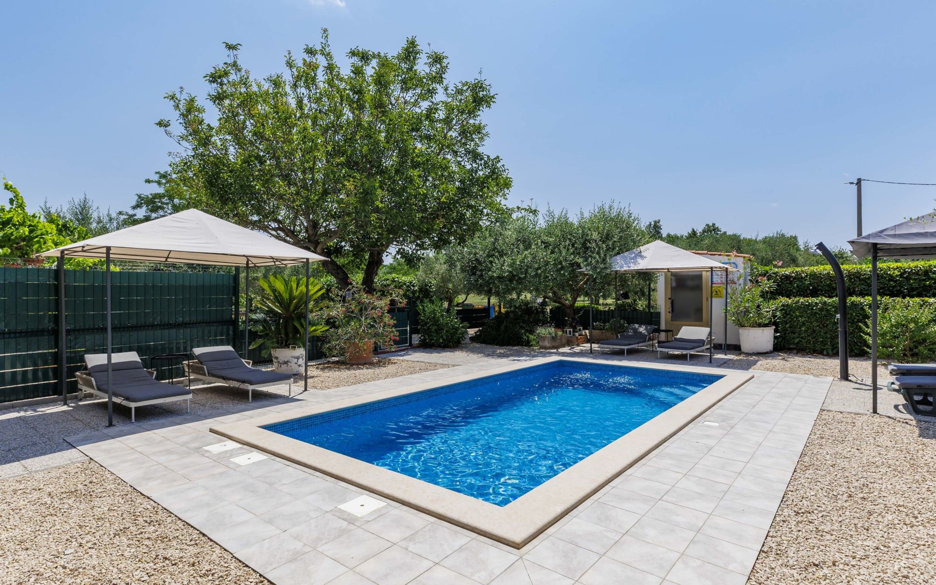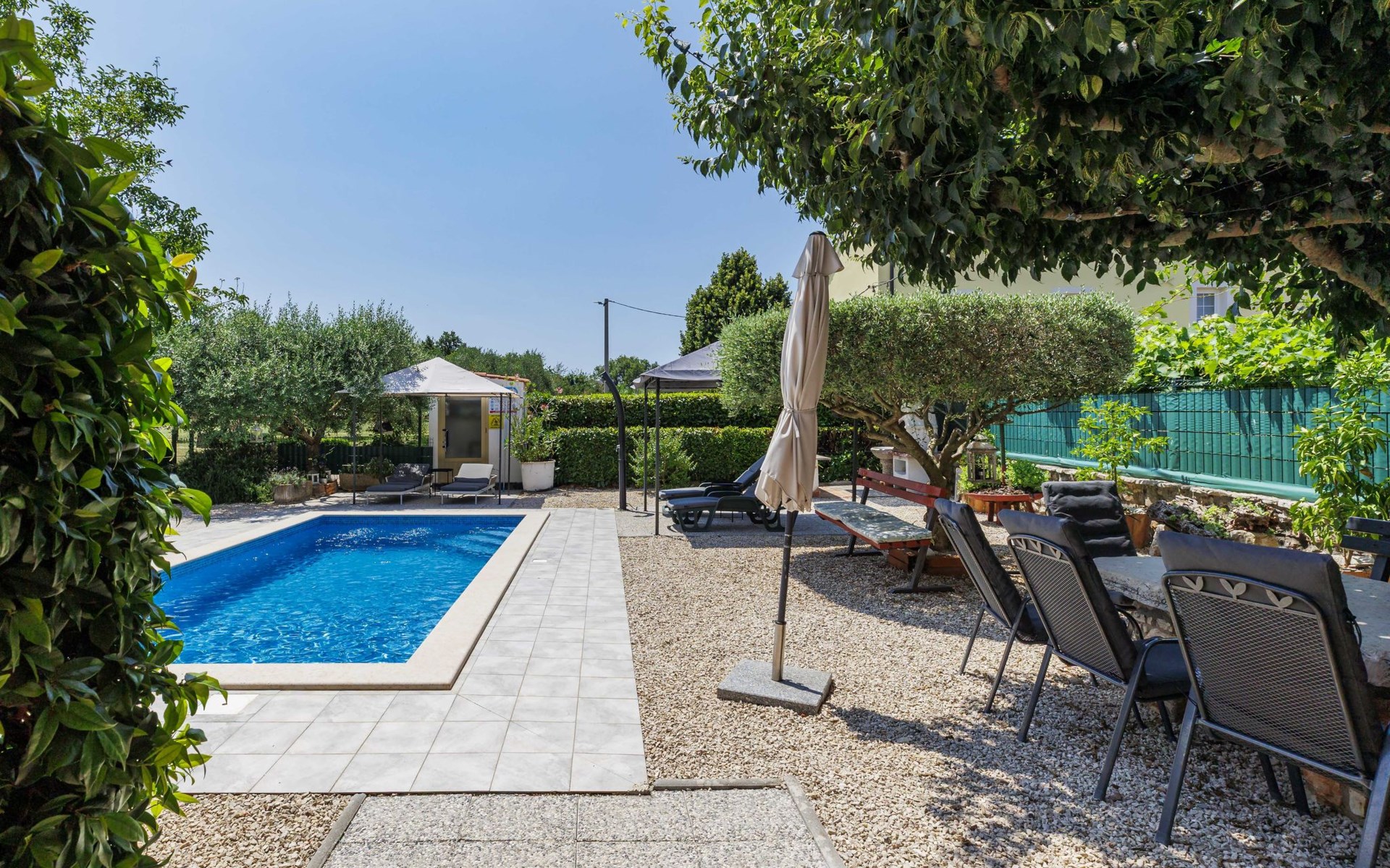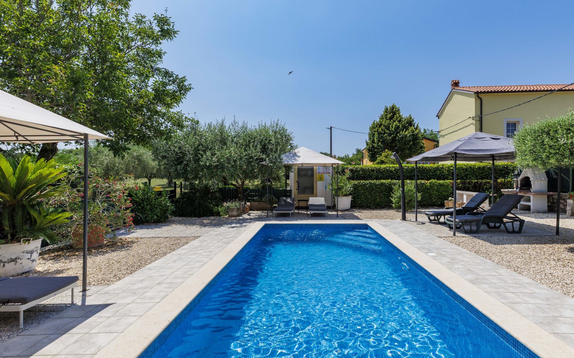 Brtonigla: Mooi twee onder één kap woning "Villa Lucky", van 2 verdiepingen, gerenoveerd in 2020. In het gehucht Lukoni, 3 km van het centrum van Brtonigla, 7 km van het centrum van Buje, 7 km van het centrum van Novigrad, rustige ligging, 4 km van zee, 4 km van het strand. Voor alleengebruik: terrein 400 m2 (omheind), openluchtzwembad hoekig (7 x 3 m, 26 m2, 145 cm diepte, seizoensgebonden beschikbaarheid: 01.Mei. - 30.Okt.) met trap. Buitendouche, terras, tuinmeubelen, onderhoud zwembad door de eigenaar/tuinman. In het huis: internetaansluiting, wasmachine. Parkeerplaats (voor 2 auto's) op het terrein. Winkel 3 km, supermarkt 7 km, restaurant 3 km, café 3 km, bushalte 3.3 km, kiezelstrand 4 km, stenenstrand 4 km, rotsstrand 4 km, betonnen strand 4 km. Geschikt voor families. De eigenaar accepteert geen jeugdgroepen. Dieren in de buurt.