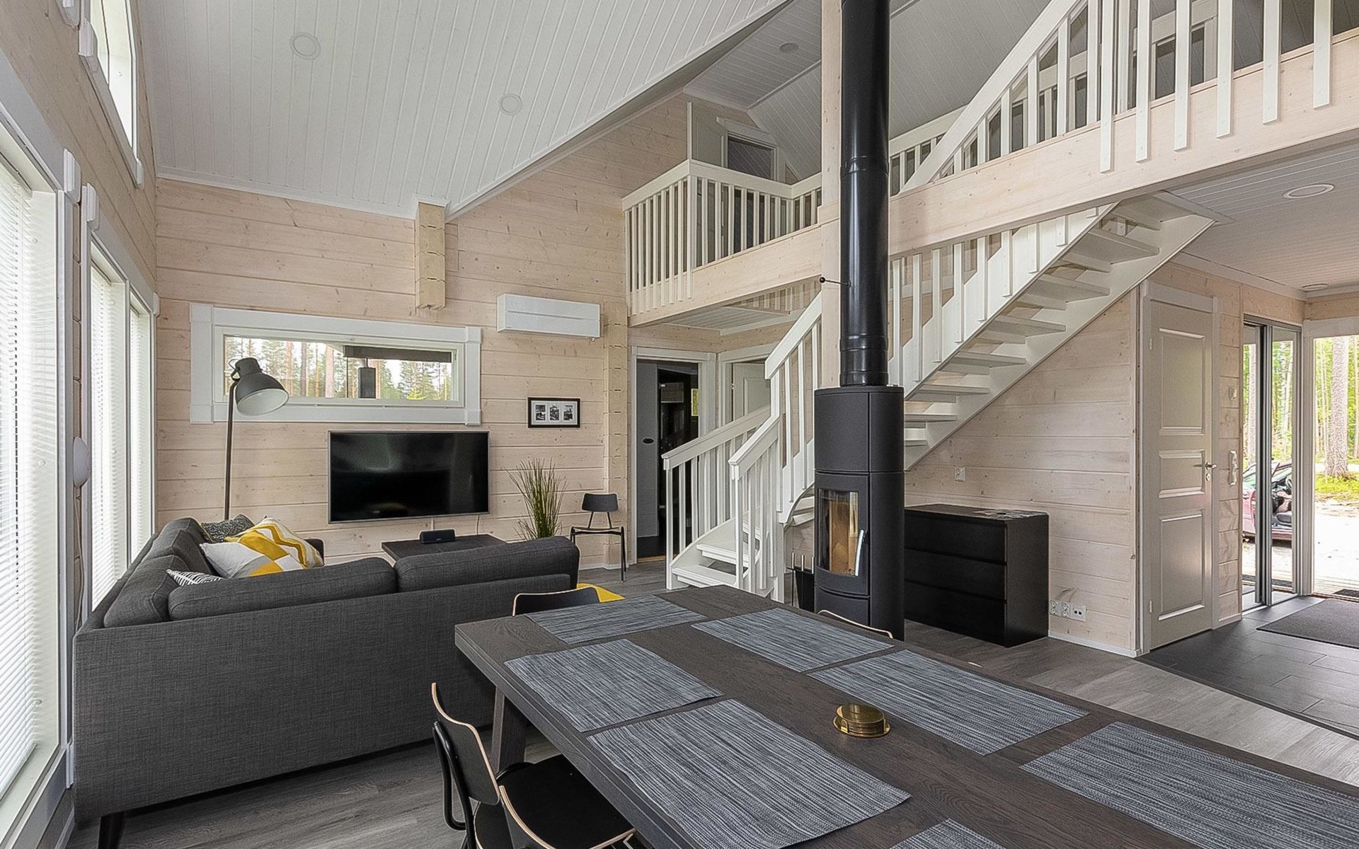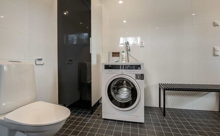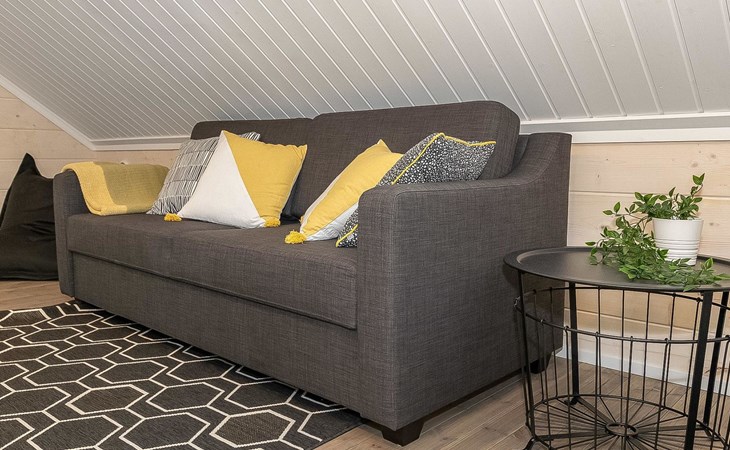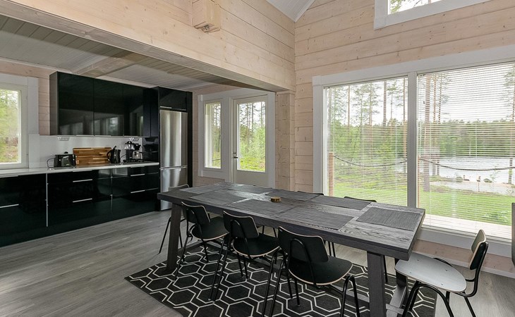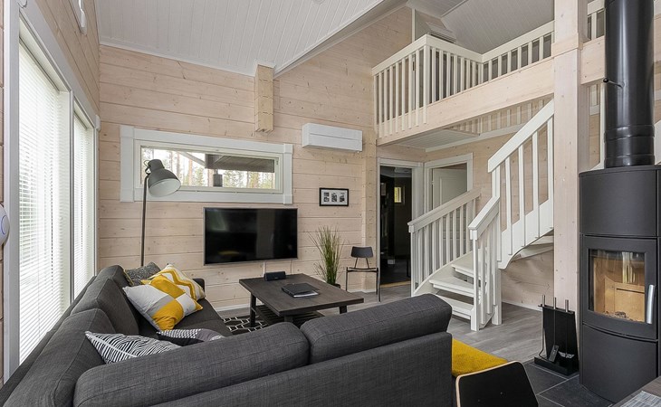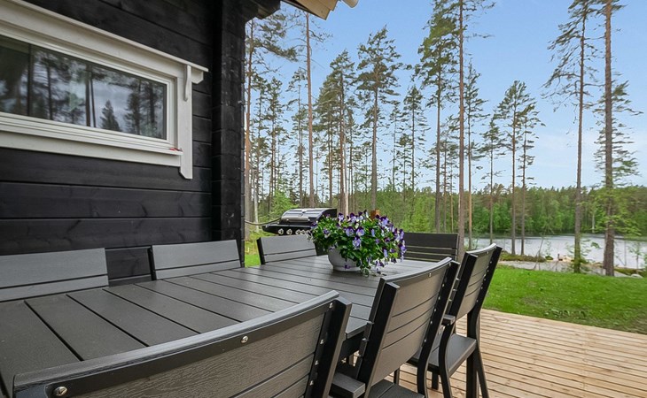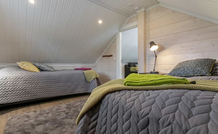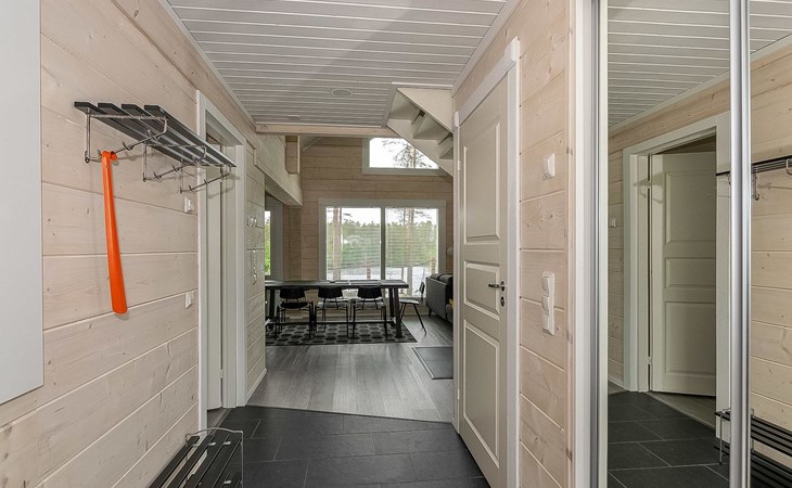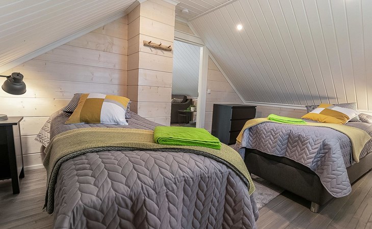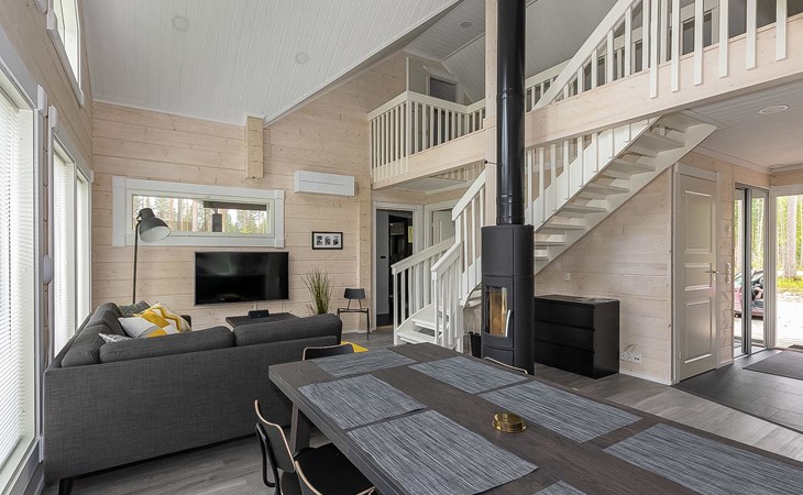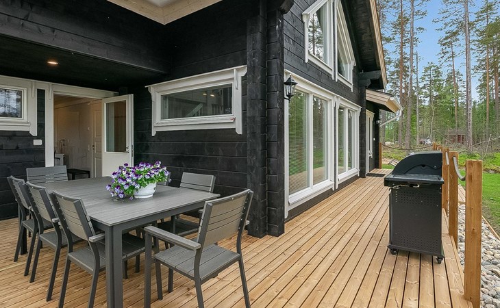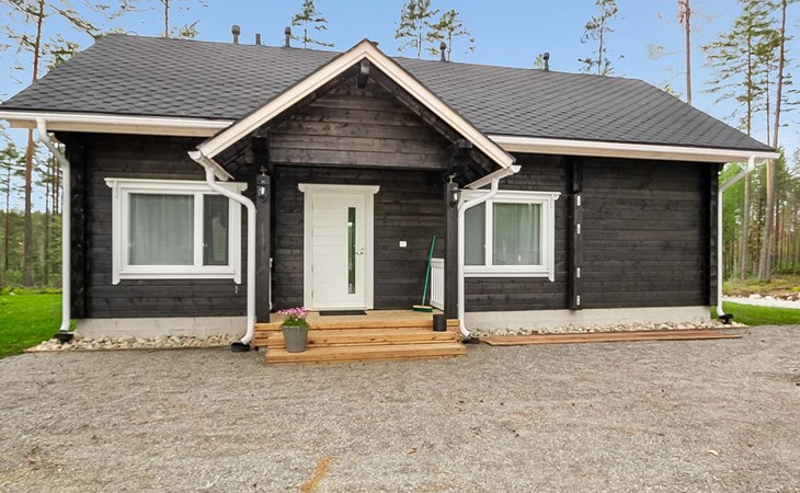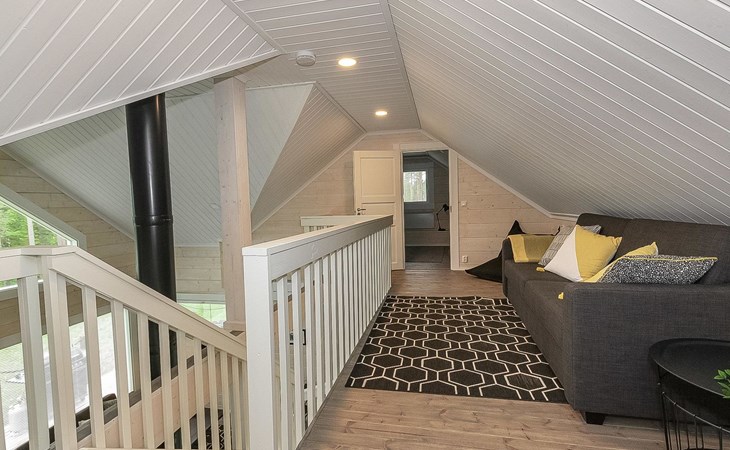 Log cabin 2019, bedroom 1: two 80 x 200 cm beds, bedroom 2: 120 x 200 cm bed, bedroom 3: two 80 x 200 cm beds, bedroom 4: two 80 x 200 cm beds, sofa bed (140 x 190 cm spare bed) in the lobby on the upper floor. Living room with wood-burning stove, dining group which can be extended (for 10 people group), well-equipped kitchen corner, sauna (electric sauna stove), washroom, terrace with gas grill and garden furniture.
