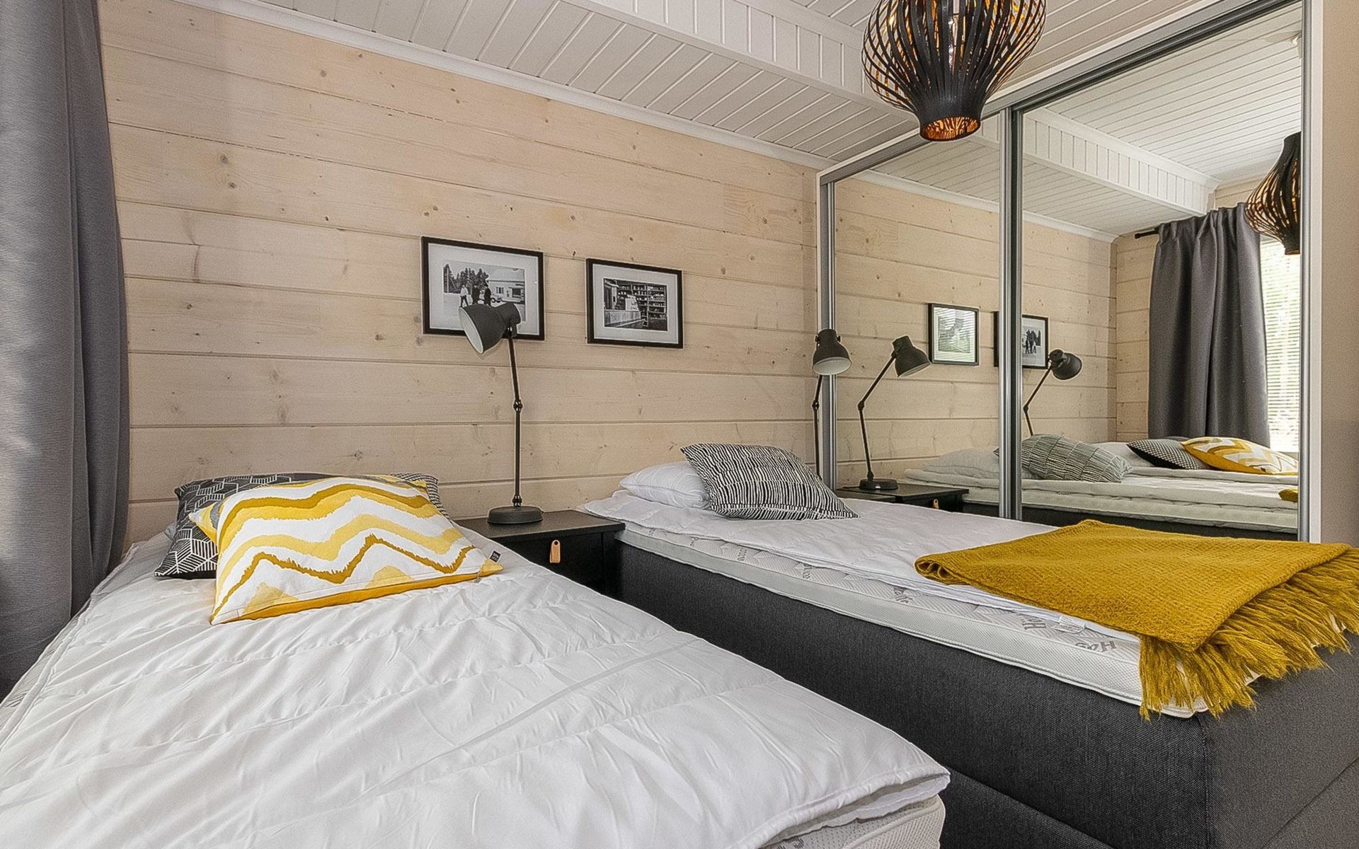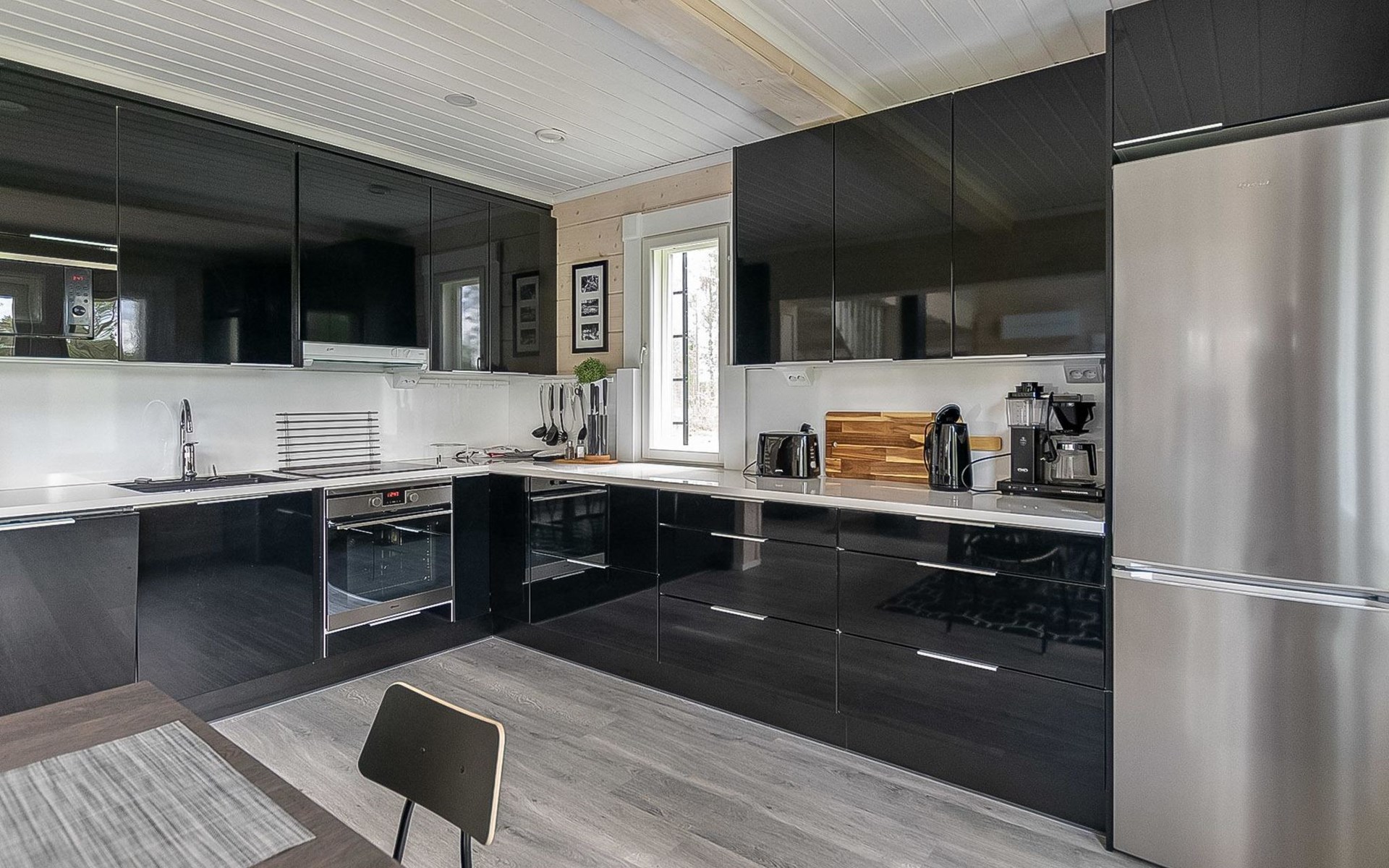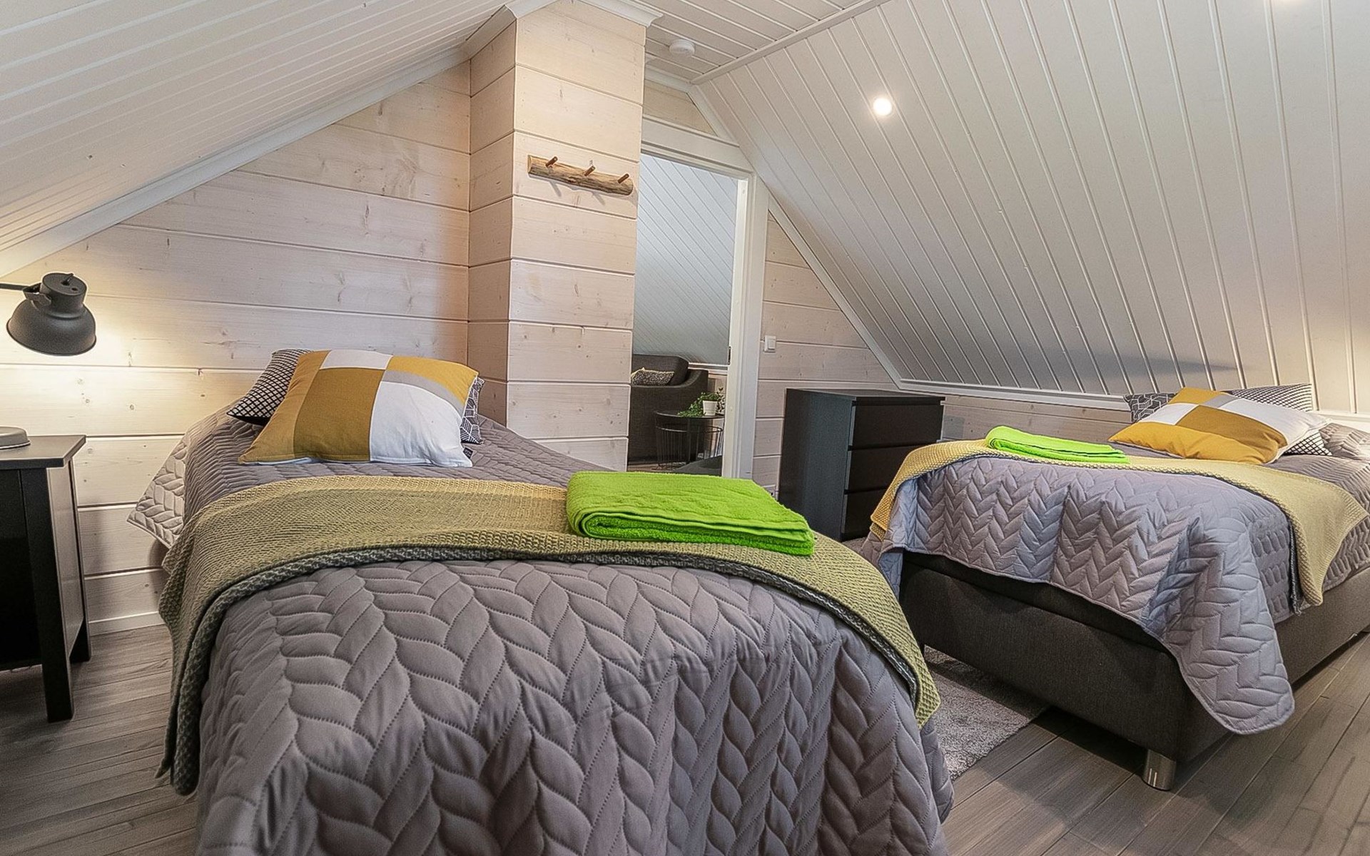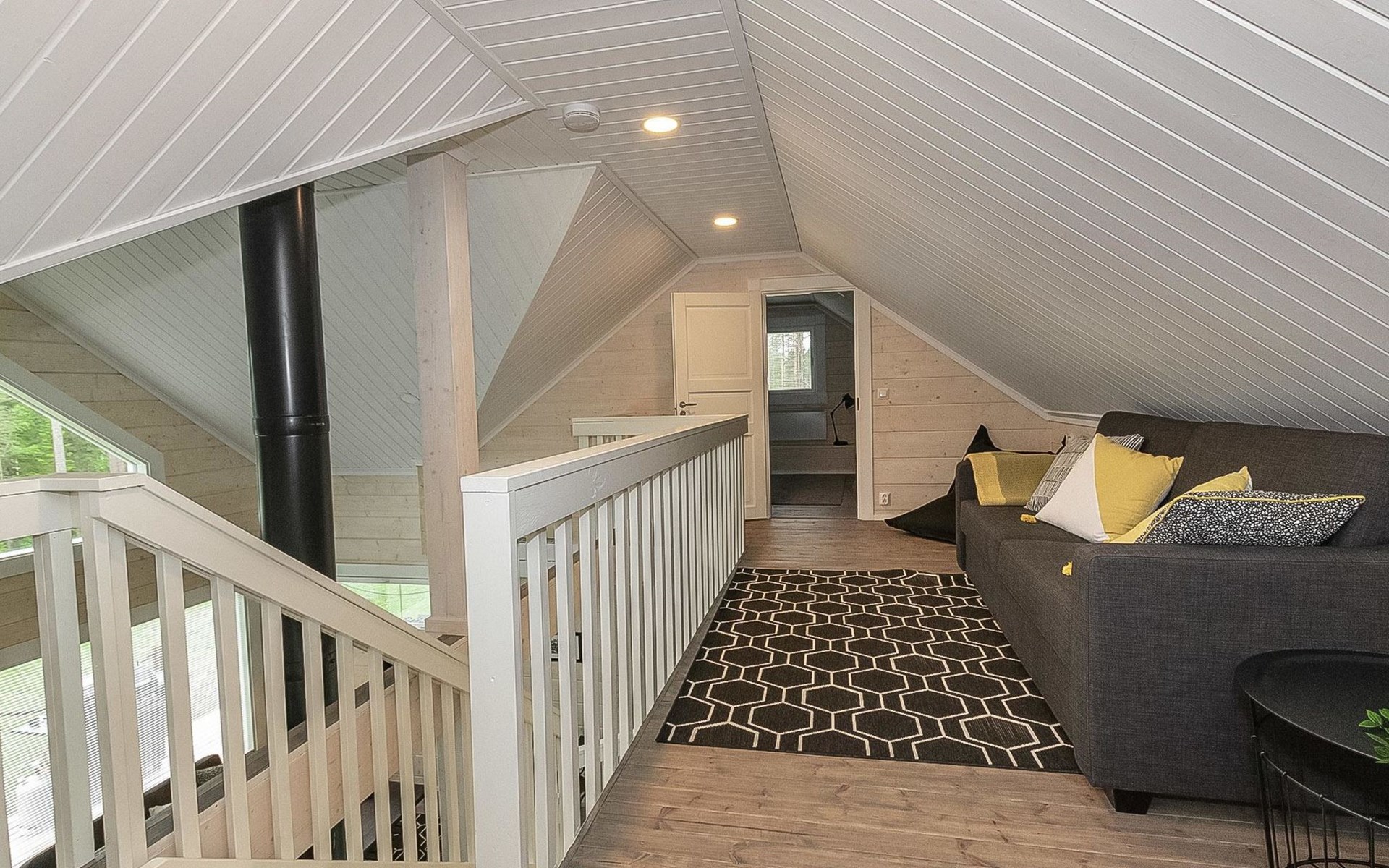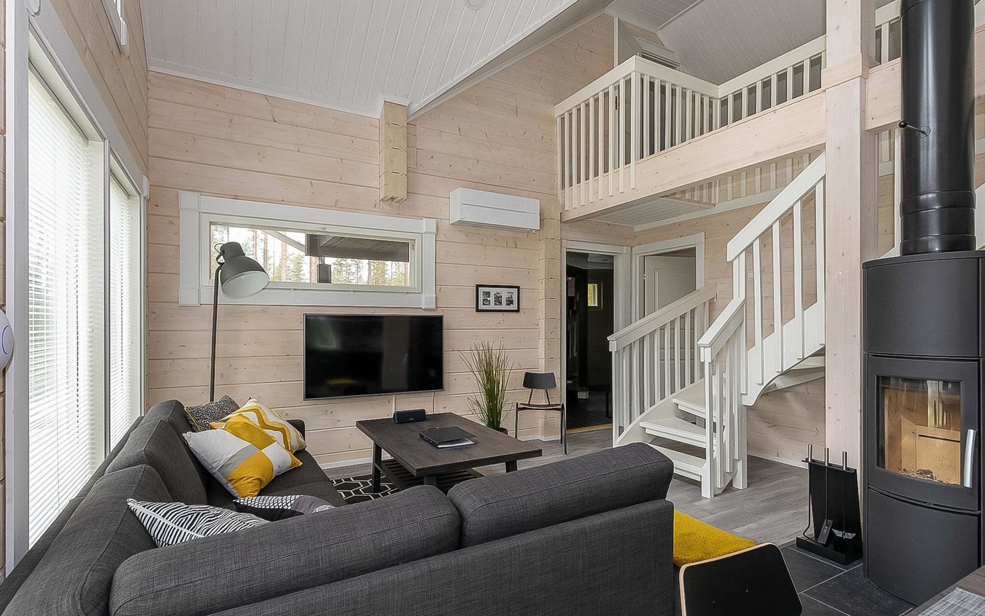 Log cabin 2019, bedroom 1: two 80 x 200 cm beds, bedroom 2: 120 x 200 cm bed, bedroom 3: two 80 x 200 cm beds, bedroom 4: two 80 x 200 cm beds, sofa bed (140 x 190 cm spare bed) in the lobby on the upper floor. Living room with wood-burning stove, dining group which can be extended (for 10 people group), well-equipped kitchen corner, sauna (electric sauna stove), washroom, terrace with gas grill and garden furniture.