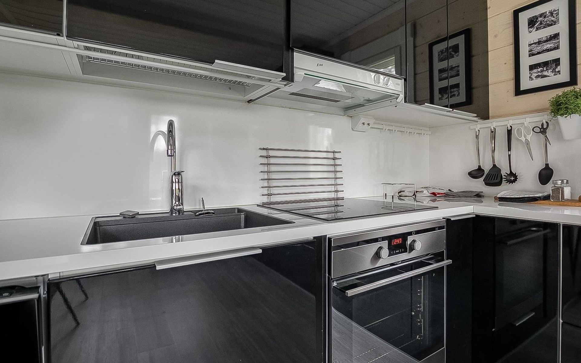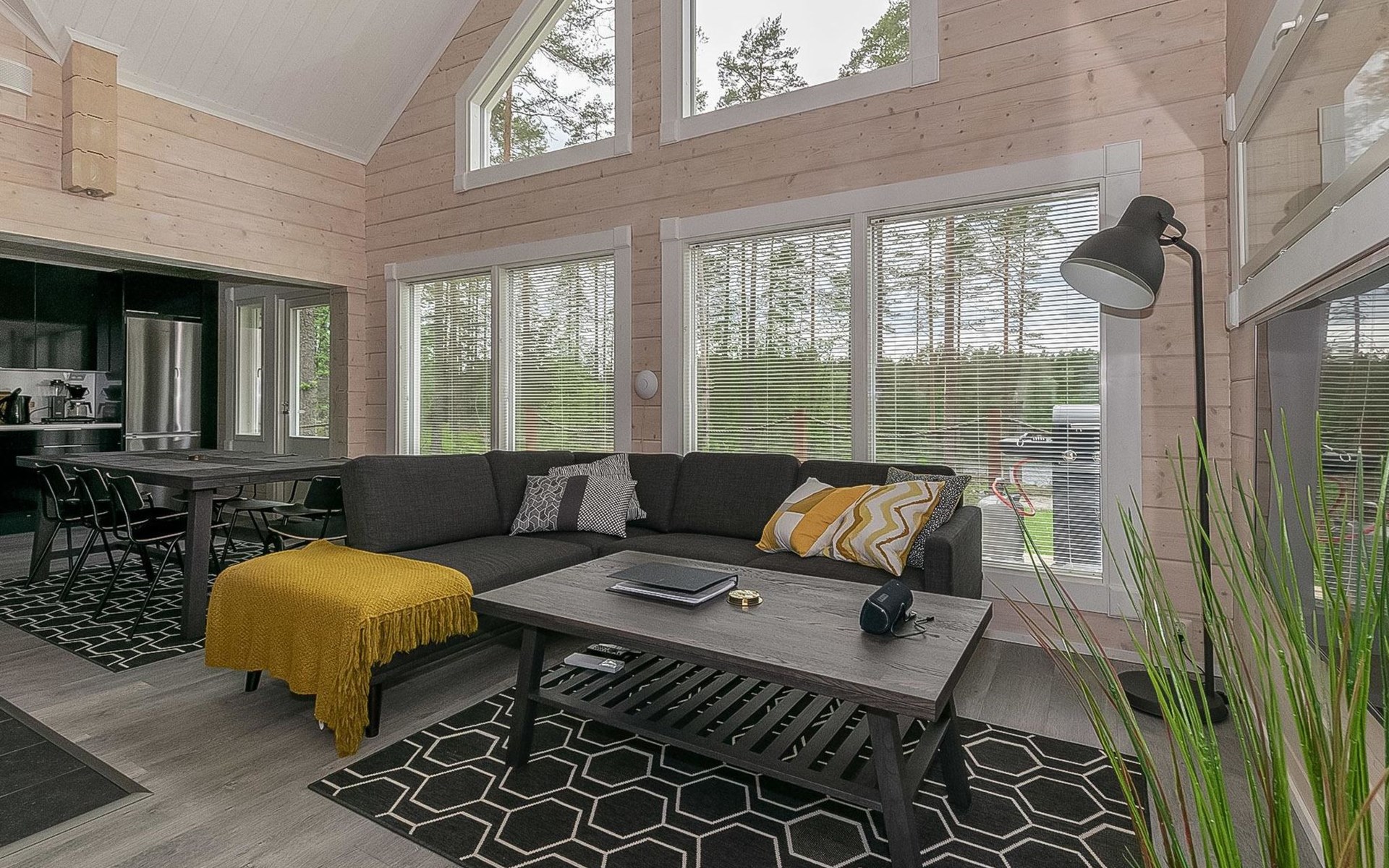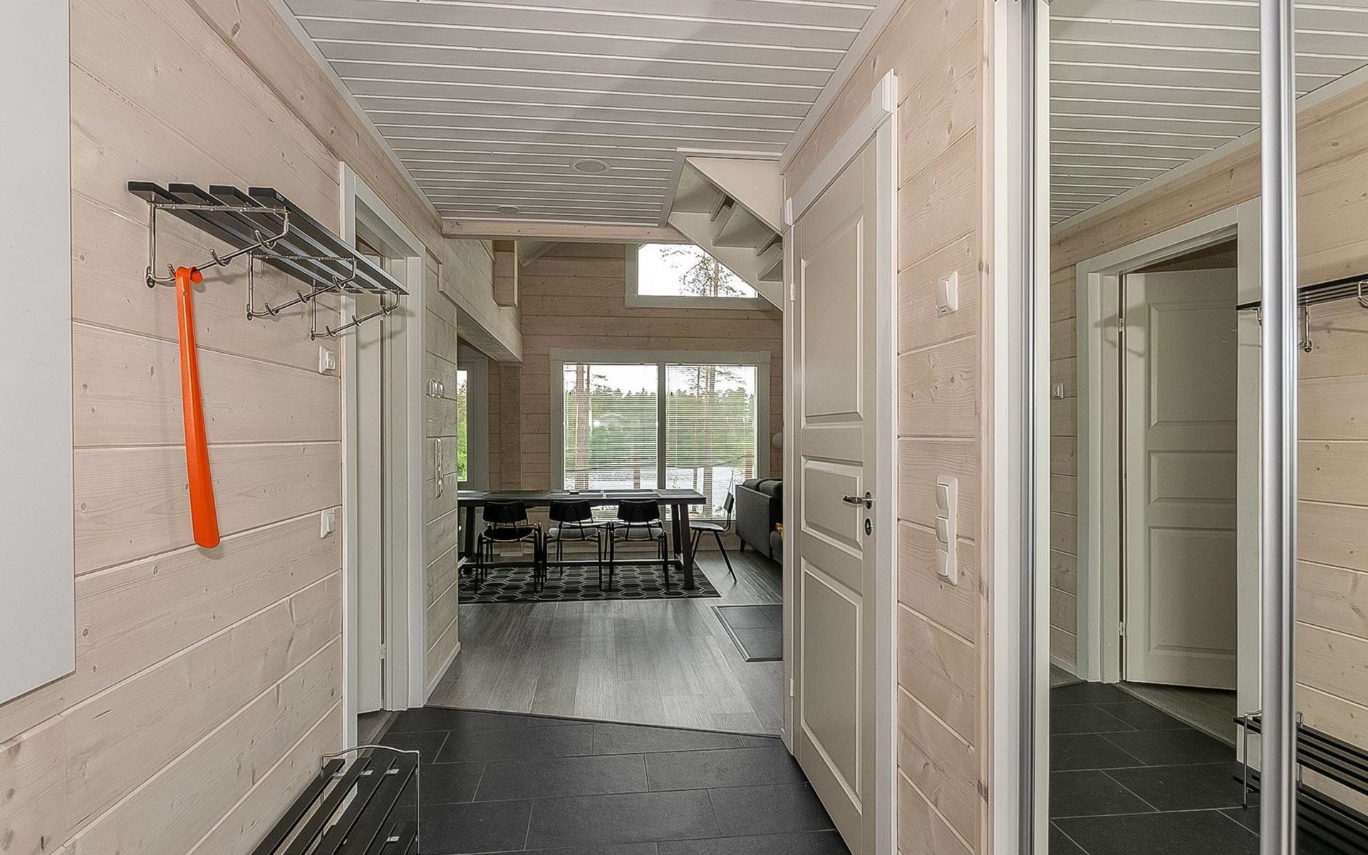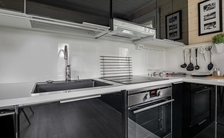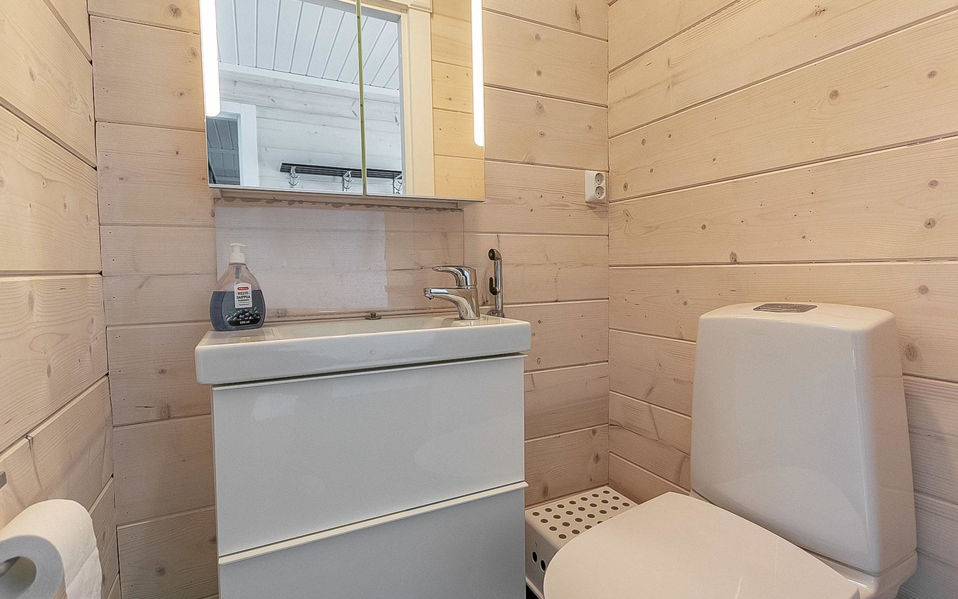 Log cabin 2019, bedroom 1: two 80 x 200 cm beds, bedroom 2: 120 x 200 cm bed, bedroom 3: two 80 x 200 cm beds, bedroom 4: two 80 x 200 cm beds, sofa bed (140 x 190 cm spare bed) in the lobby on the upper floor. Living room with wood-burning stove, dining group which can be extended (for 10 people group), well-equipped kitchen corner, sauna (electric sauna stove), washroom, terrace with gas grill and garden furniture.