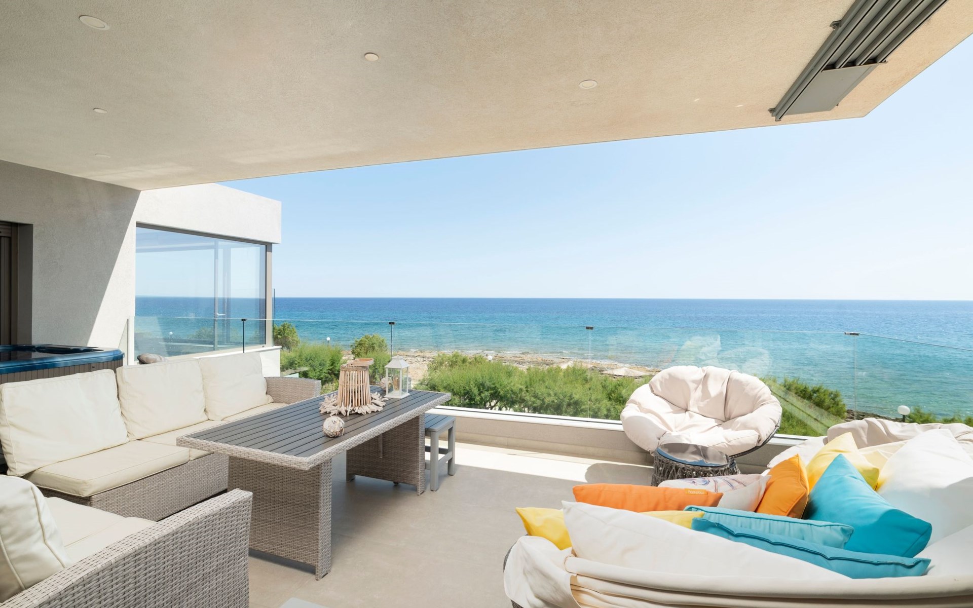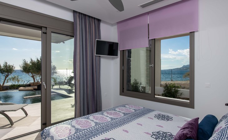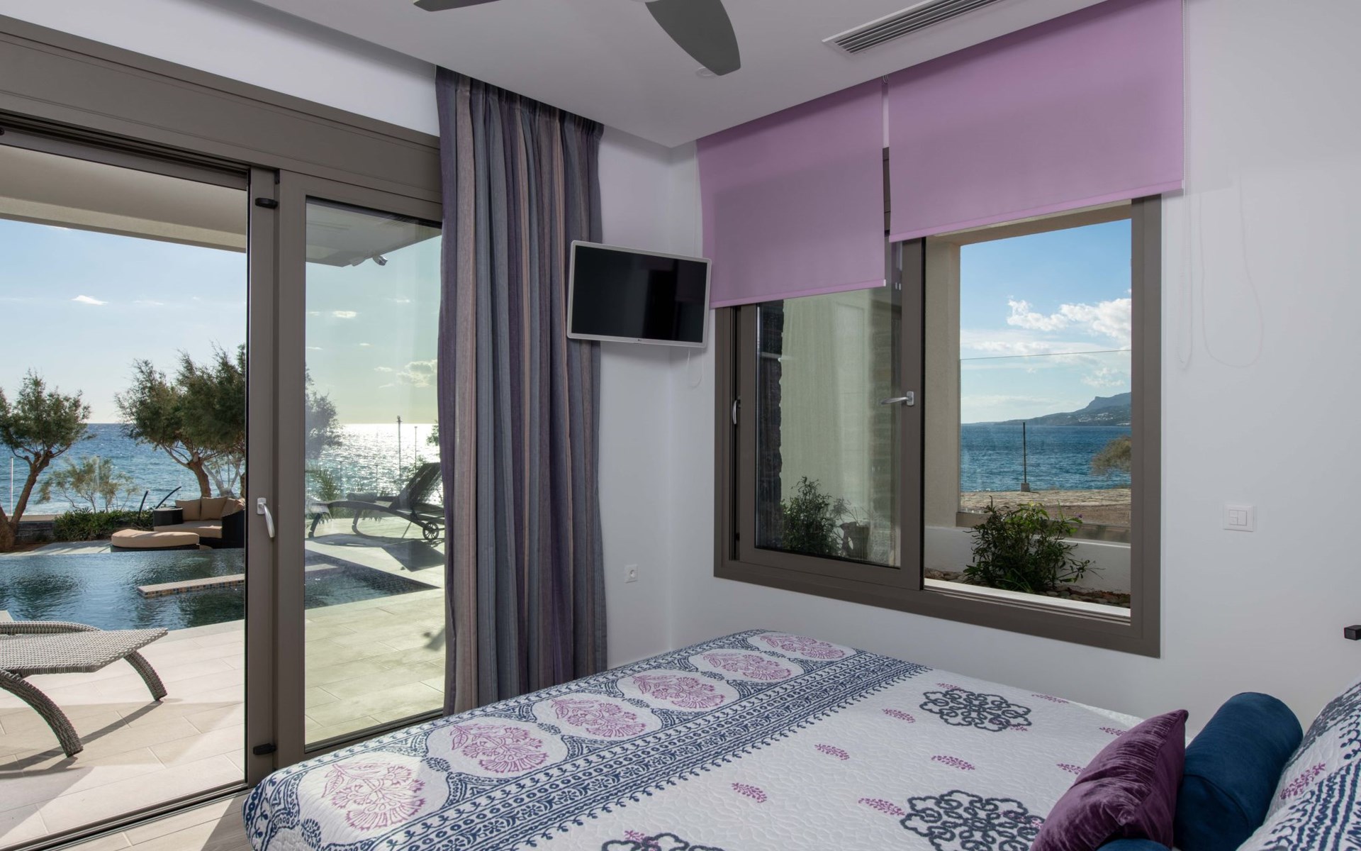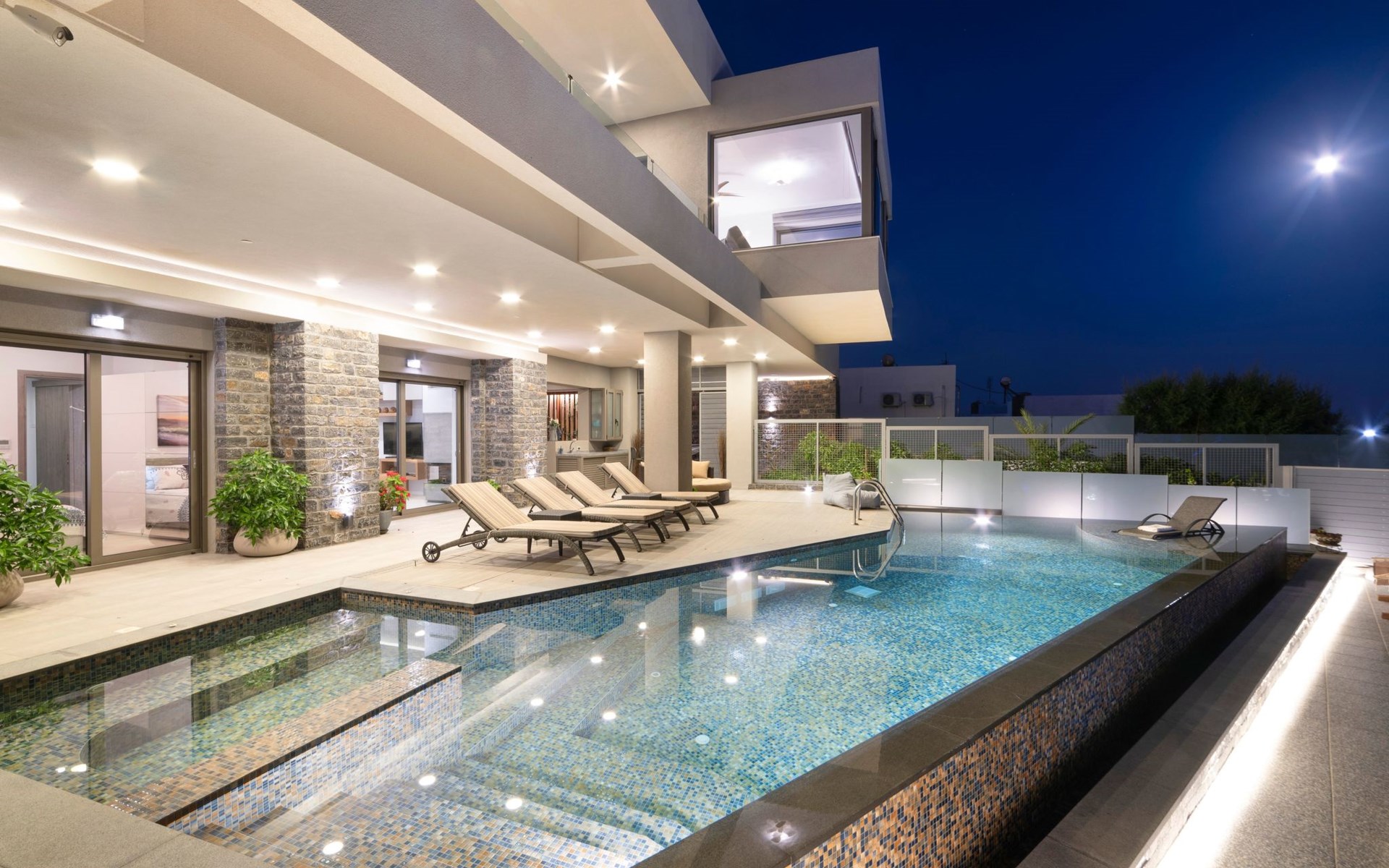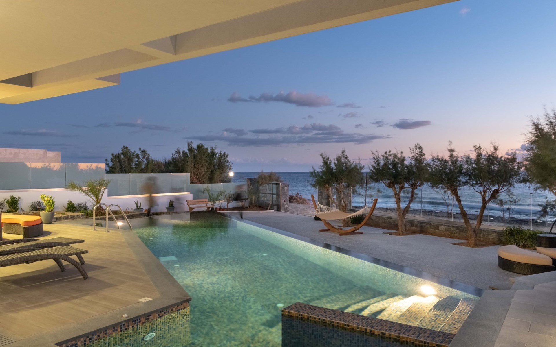 Modern & luxurious, this 10-bedroom seafront luxury villa offers secluded serenity as if the rest of the world no longer exists. Breath-taking, panoramic views of sea, moon on water & sunset. Enjoy Infinity pool & adjoining spa (extra cost for heating) on ground floor, private hot tub on penthouse balcony, BBQ, bicycles. Large outdoor space offers group fun & dining. Less than 4 min walk to modern comforts & beach. Ideal for retreats and celebrations. Concierge services available.----------------Moonlight Villas ('Jupiter Moons' villa) overlook the crystal-clear, blue waters of the Mediterranean sea- a beautiful rocky horizon ideal for swimming, sunbathing, surfing, and other water sports. Set in Koutsourás, a quiet, agricultural village in South-Eastern Crete, this 10 bedroom Jupiter Moons villa is a .450 square meters brand new, private, waterfront estate that provides luxurious accommodation with spectacular views of the southern Crete landscape, moon and sunset. The property features an infinity pool (52 square meters) and adjoining whirlpool, from which guests can enjoy these stunning waterfront vistas. The pool is heatable at an extra cost - please ask.Decorated with modern art-contemporary lines blended with natural elements to reflect the vibrant character of the island. Combining wonderfully the Cretan architecture with modern elegance, this stylishly decorated ambiance exudes a feeling of warmth and privilege by offering a unique experience of ultimate relaxation. Located only a few minutes’ walk from a local pebble beach, bakery, and coffee shops, patisserie, super markets, bars, restaurants, and pharmacy, the villas combine romantic seclusion with proximity to modern comforts. Likewise, the property is located only a few km away from the tourist town of Makry Gialos (with a long sandy beach), as well as traditional Cretan mountain villages with numerous authentic tavernas and bars. The nearest airports are in Sitia (36 km) and Heraklion (114 km; private transportation can be arranged at a fee; ask us).The Jupiter moons villa sets the highest standards of luxury, beauty, elegance, ecological simplicity, and modern comforts. We will share our best-kept secrets about our hidden-treasure beaches, landscapes, hiking paths, culture, best restaurants, best shops and bicycle ride paths, as well as other attractions that may be of interest. Welcome to your seafront, romantic, luxury, and breathtaking home away from home! 1090812