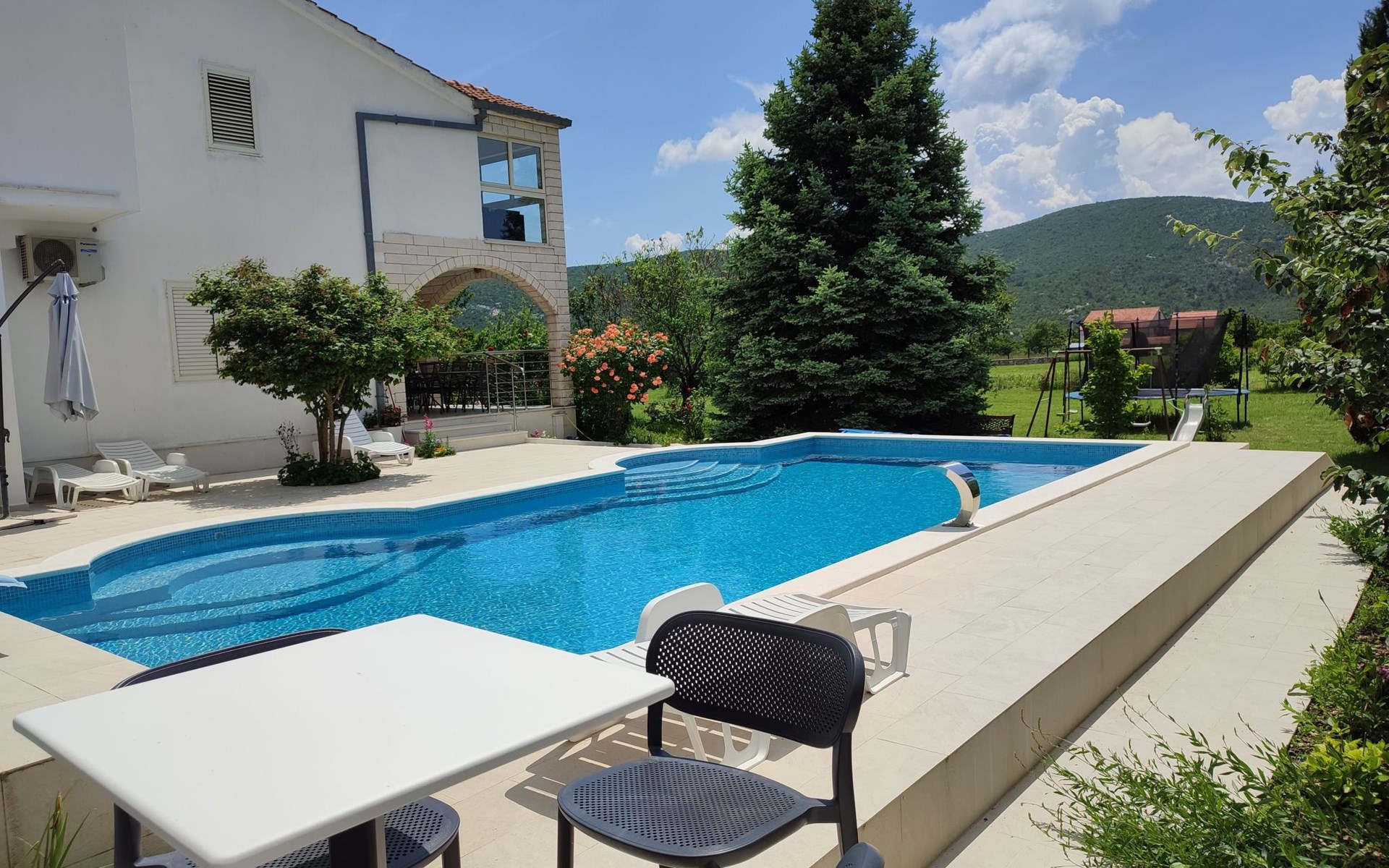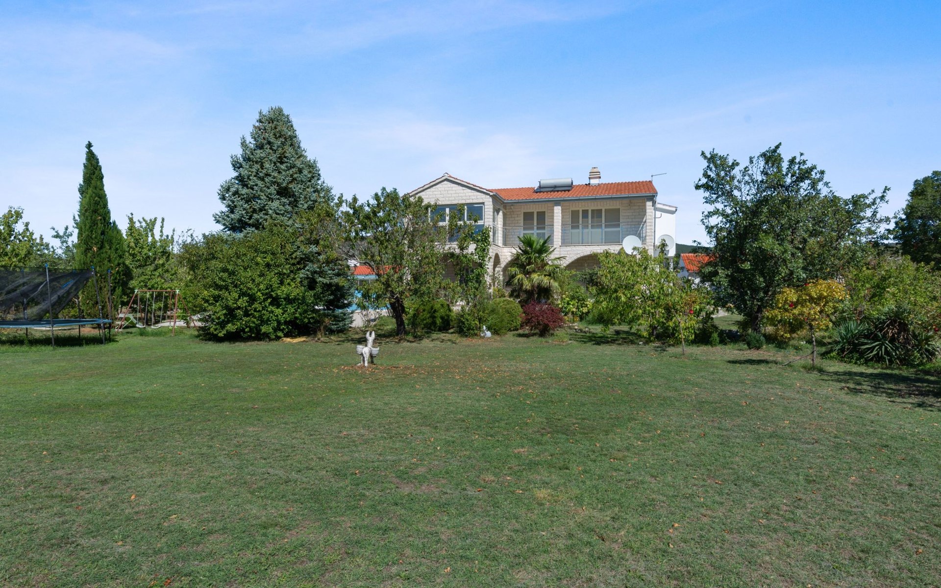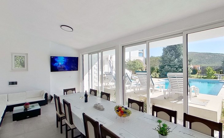 Discover the perfect getaway for a group adventure or family retreat in Neoric, Dalmatia, where this magnificent detached holiday house welcomes up to 10 guests for an unforgettable experience. Nestled in a serene setting, this property combines comfort with all the modern conveniences needed for a stress-free stay. Imagine stepping into a world where every detail is crafted for your comfort and where the amenities cater to all ages and interests.Inside, the property is well-equipped to ensure a comfortable and convenient stay. With air conditioning available throughout, guests can relax in a cool and pleasant environment regardless of the outdoor temperature. The house boasts ample space for everyone with five bedrooms and four bathrooms, ensuring privacy and comfort. The living areas are complemented by a smart TV and a games console, perfect for entertainment after a day of exploring. The inclusion of a washing machine and clothes dryer for sole use adds to the convenience, making it ideal for longer stays.Stepping outside, the property's exterior is just as impressive as its interior. The garden, reserved for the exclusive use of guests, offers a private oasis of tranquility and enjoyment. It features a playground that promises endless fun for younger visitors, while the terrace and balcony provide perfect spots for relaxation and socializing. Those who love the outdoors will appreciate the covered bicycle parking and the charging station for E-cars, ensuring that exploring the stunning surroundings is both easy and eco-friendly.Located in the captivating region of Dalmatia, the house sits in proximity to a grocery store just 800m away, making it convenient to stock up on provisions. The surrounding area is a treasure trove of natural beauty, with mountains providing a spectacular backdrop and numerous opportunities for outdoor activities and exploration. Whether you're looking to immerse yourself in nature, discover the local culture, or simply unwind in a beautiful setting, this location has something special to offer everyone.In summary, this Neoric holiday house is a haven for those seeking a blend of adventure, relaxation, and comfort. With its well-appointed facilities, including renewable energy solutions like solar power, and its idyllic location, it offers an eco-friendly and enjoyable base from which to explore the delights of Dalmatia. Whether you're coming together with family or friends, this property promises a stay filled with cherished memories and rejuvenating experiences. 3578655