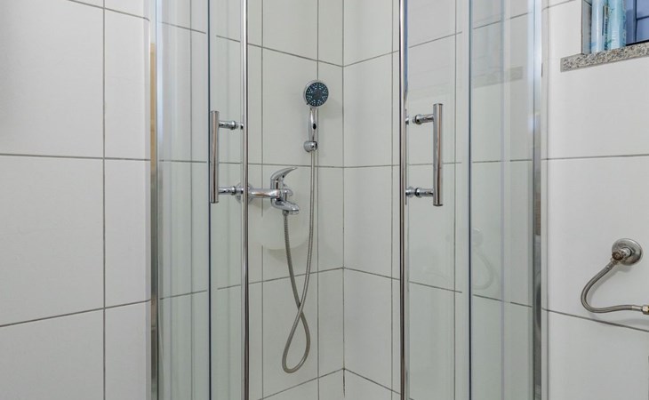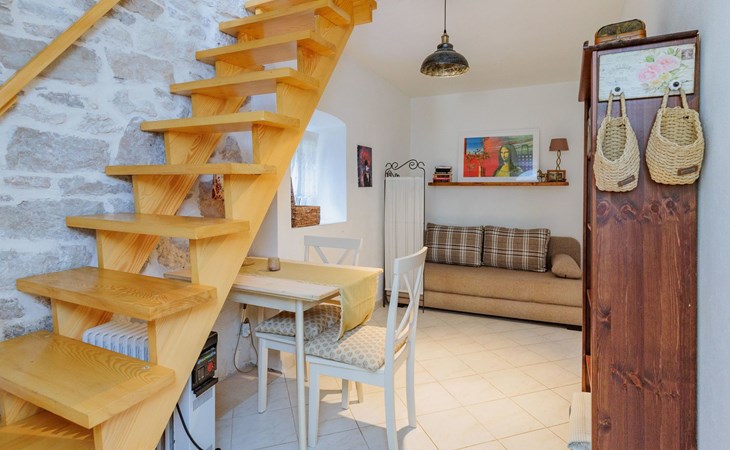 Indoor area is about 50 m² in size and comprises of the following rooms: A living room with a flat screen TV and a double sofa bed, fully-equipped kitchen with an oven, coffee machine and a dining area, as well as an adjoining bathroom with a shower. Bedroom is up on first floor and can be accessed by indoor and outdoor steps with a large balcony attached.