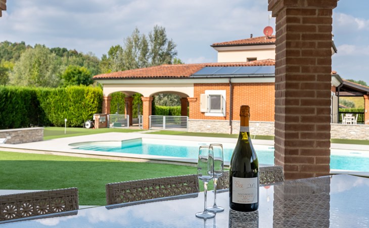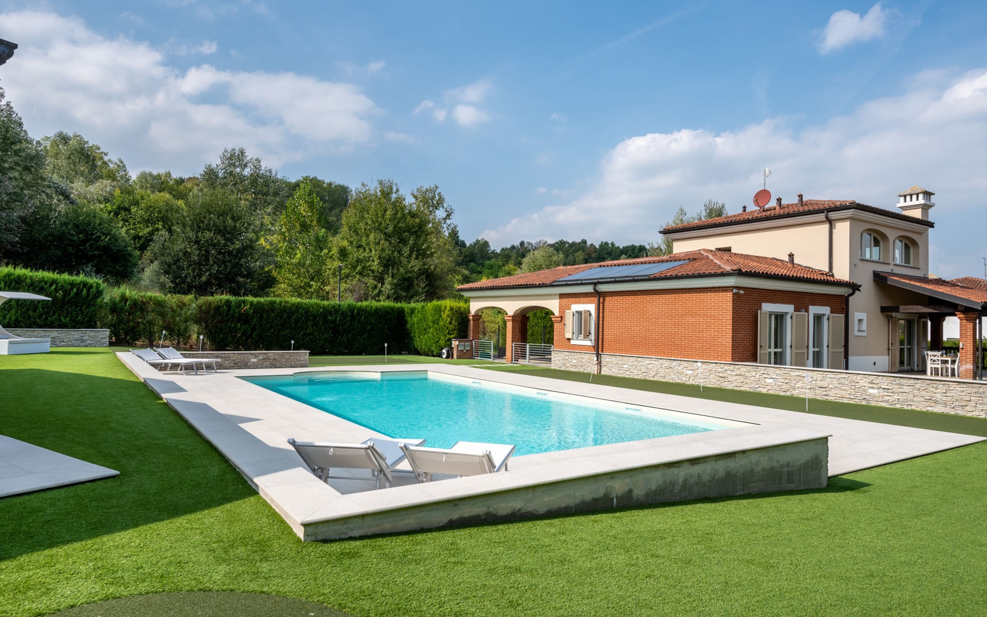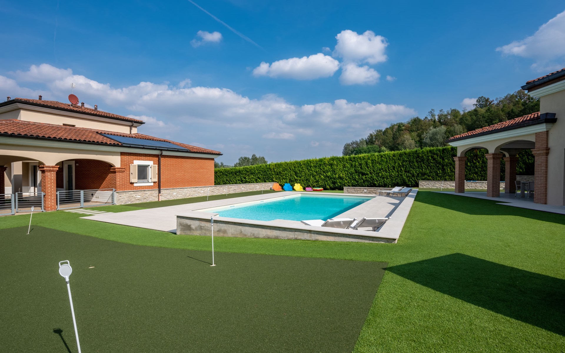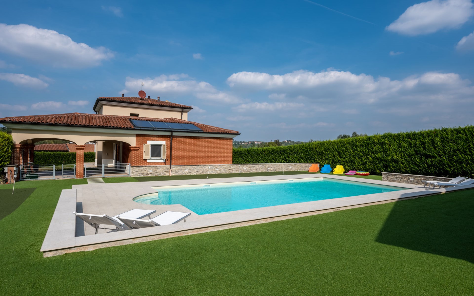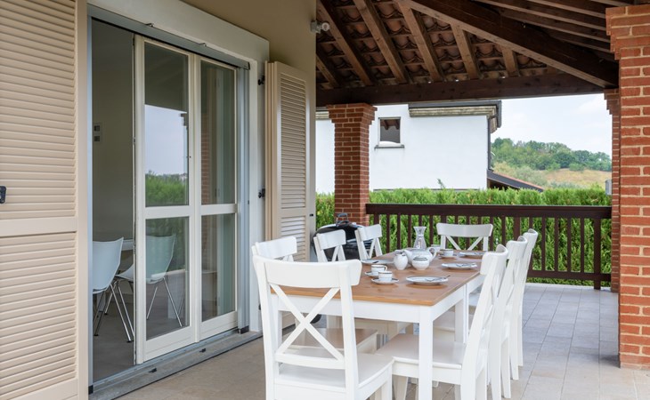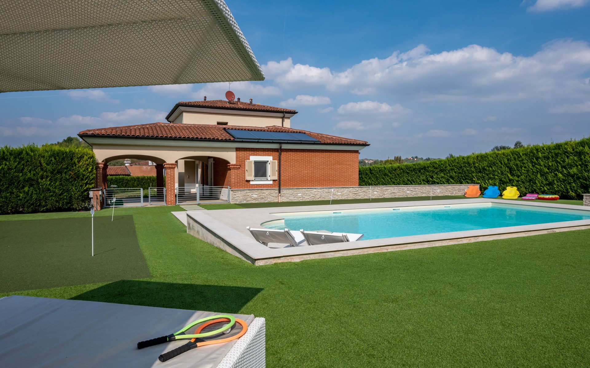 Eengezinswoning "Appendino". Huurobject bestaande uit hoofd-/ bijgebouw, 8 km van het centrum van Asti, 2 km van het centrum van Settime, 55 km van het centrum van Turin. Voor alleengebruik: terrein 2.000 m2 (omheind), tuin met gazon en planten, openluchtzwembad (12 x 6 m, 150 cm diepte, seizoensgebonden beschikbaarheid: 09.Mei. - 26.Sep.). Buitendouche, onderhoud zwembad door de eigenaar/tuinman. Parkeerplaats (voor 2 auto's) bij het huis op het terrein. Winkel 2 km, supermarkt 8 km, bushalte 2 km, treinstation "Asti" 8 km. Het Appendino House, bestaande uit een hoofdgebouw en een bijgebouw, ligt aan de rand van een golfbaan (momenteel gesloten, vanaf augustus 2025) in een nieuwbouwgebied (momenteel geen bouwactiviteit).