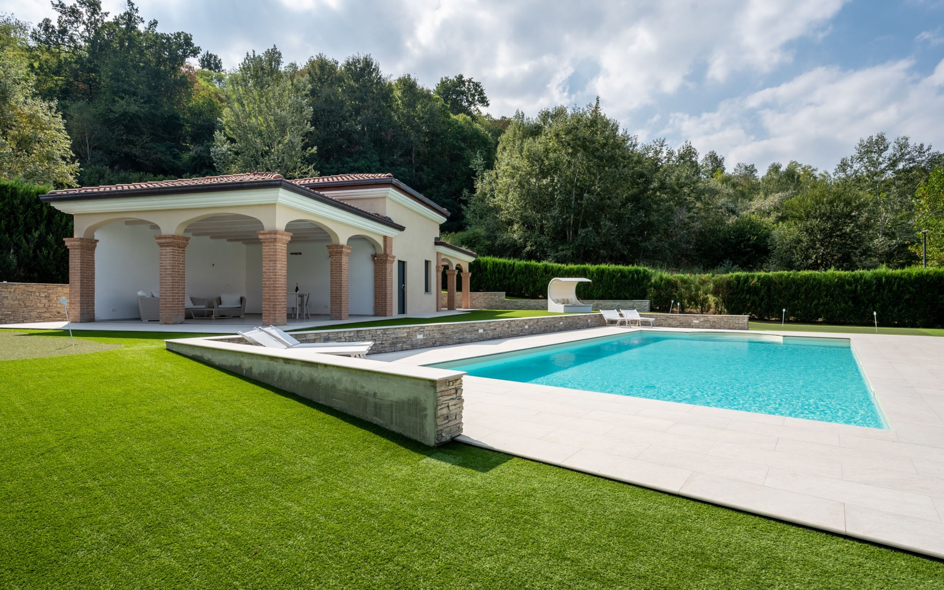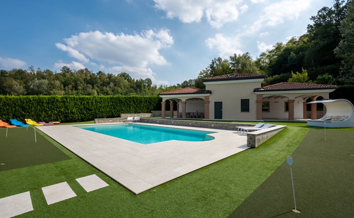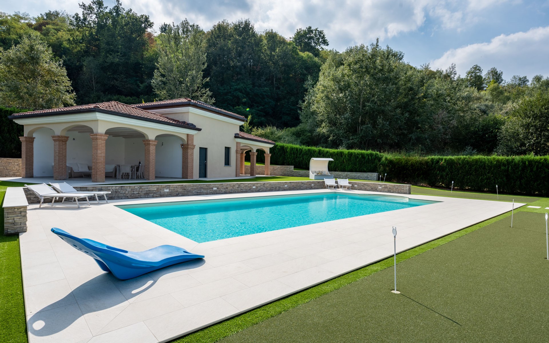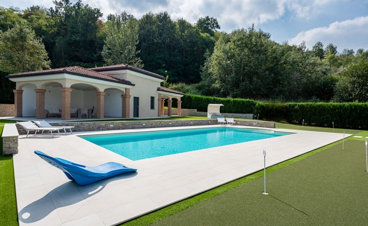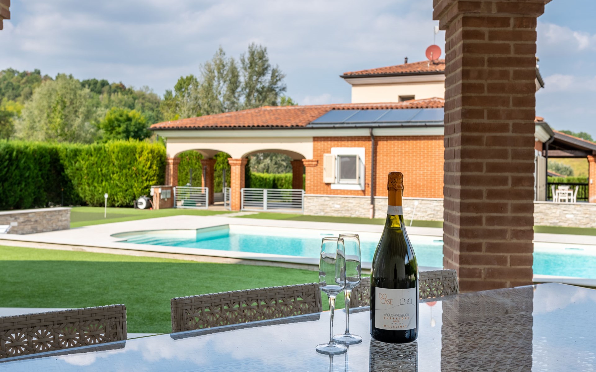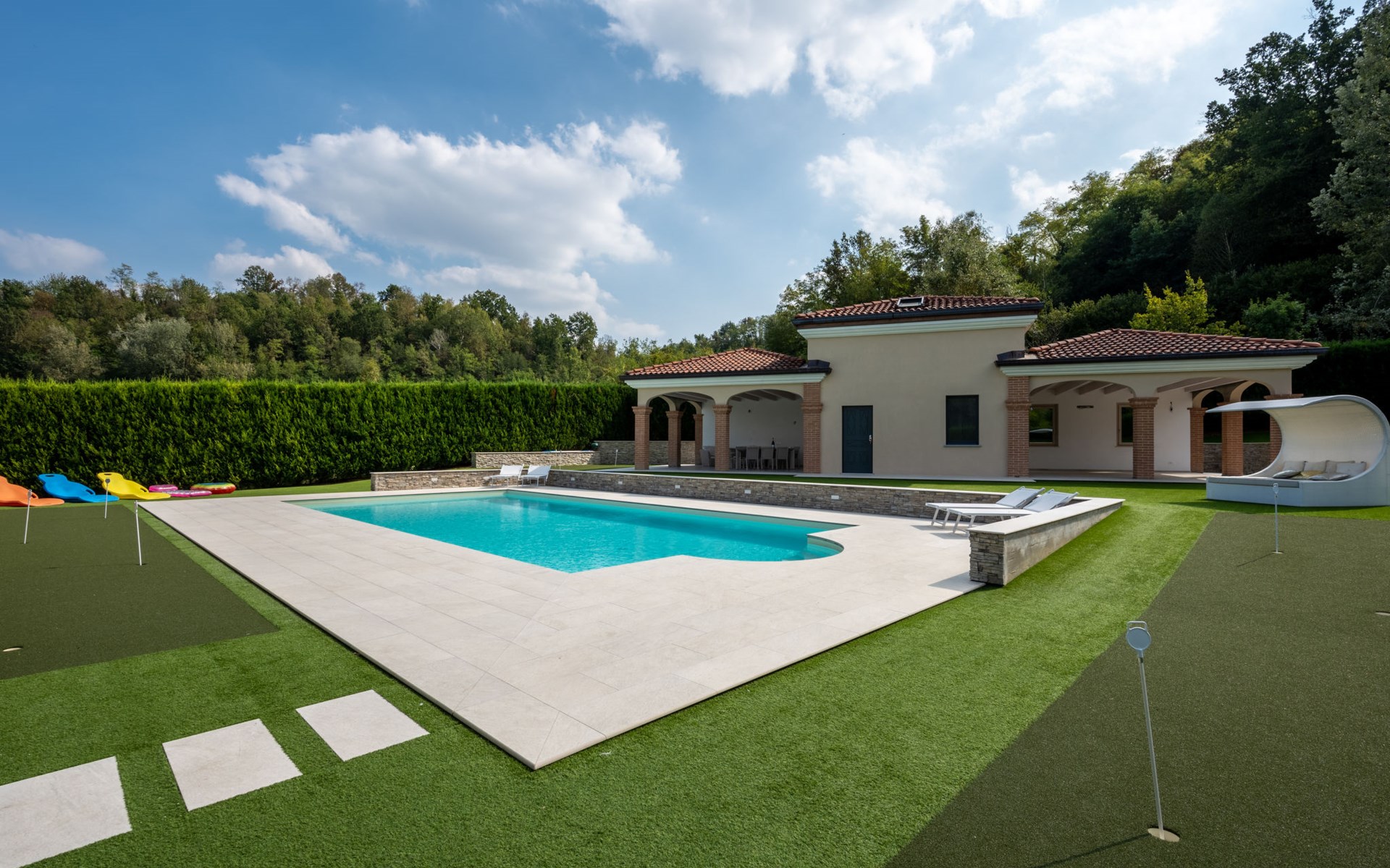 Eengezinswoning "Appendino". Huurobject bestaande uit hoofd-/ bijgebouw, 8 km van het centrum van Asti, 2 km van het centrum van Settime, 55 km van het centrum van Turin. Voor alleengebruik: terrein 2.000 m2 (omheind), tuin met gazon en planten, openluchtzwembad (12 x 6 m, 150 cm diepte, seizoensgebonden beschikbaarheid: 09.Mei. - 26.Sep.). Buitendouche, onderhoud zwembad door de eigenaar/tuinman. Parkeerplaats (voor 2 auto's) bij het huis op het terrein. Winkel 2 km, supermarkt 8 km, bushalte 2 km, treinstation "Asti" 8 km. Het Appendino House, bestaande uit een hoofdgebouw en een bijgebouw, ligt aan de rand van een golfbaan (momenteel gesloten, vanaf augustus 2025) in een nieuwbouwgebied (momenteel geen bouwactiviteit).