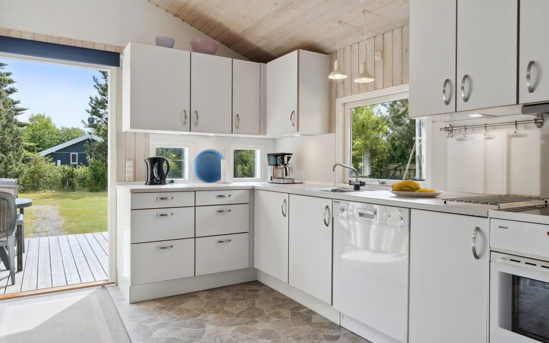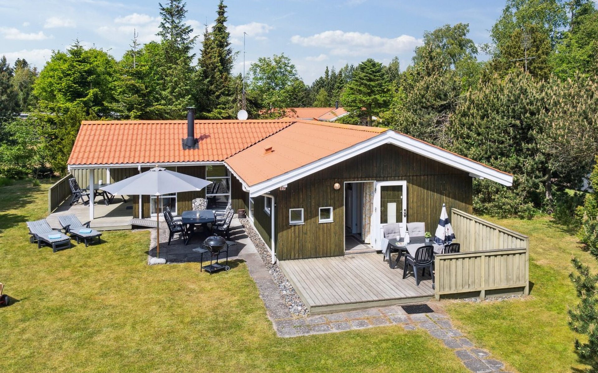 Eengezinswoning, bouwjaar 1992. 500 m van zee. Voor alleengebruik: wild terrein 1.000 m2. Barbecue, kinderspeelplaats (schommel). In het huis: sauna, wasmachine, droger. Parkeerplaats bij het huis. Levensmiddelenwinkel 800 m. Golfterrein 3 km. De eigenaar accepteert geen jeugdgroepen.