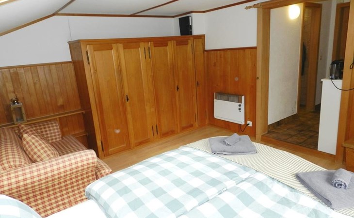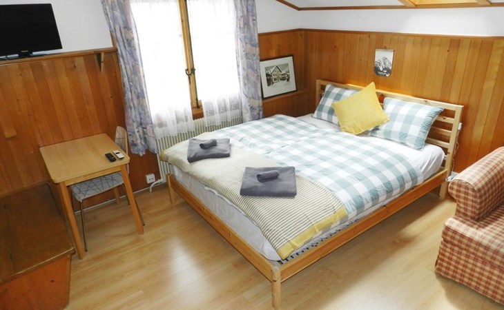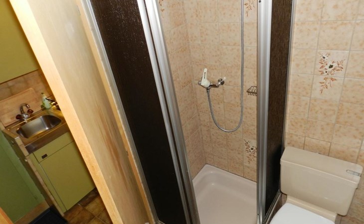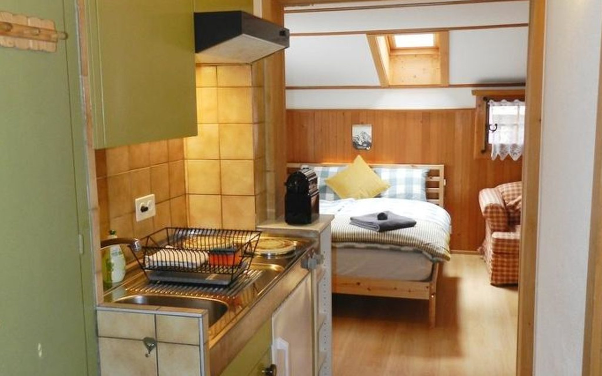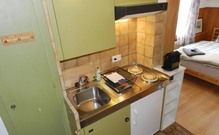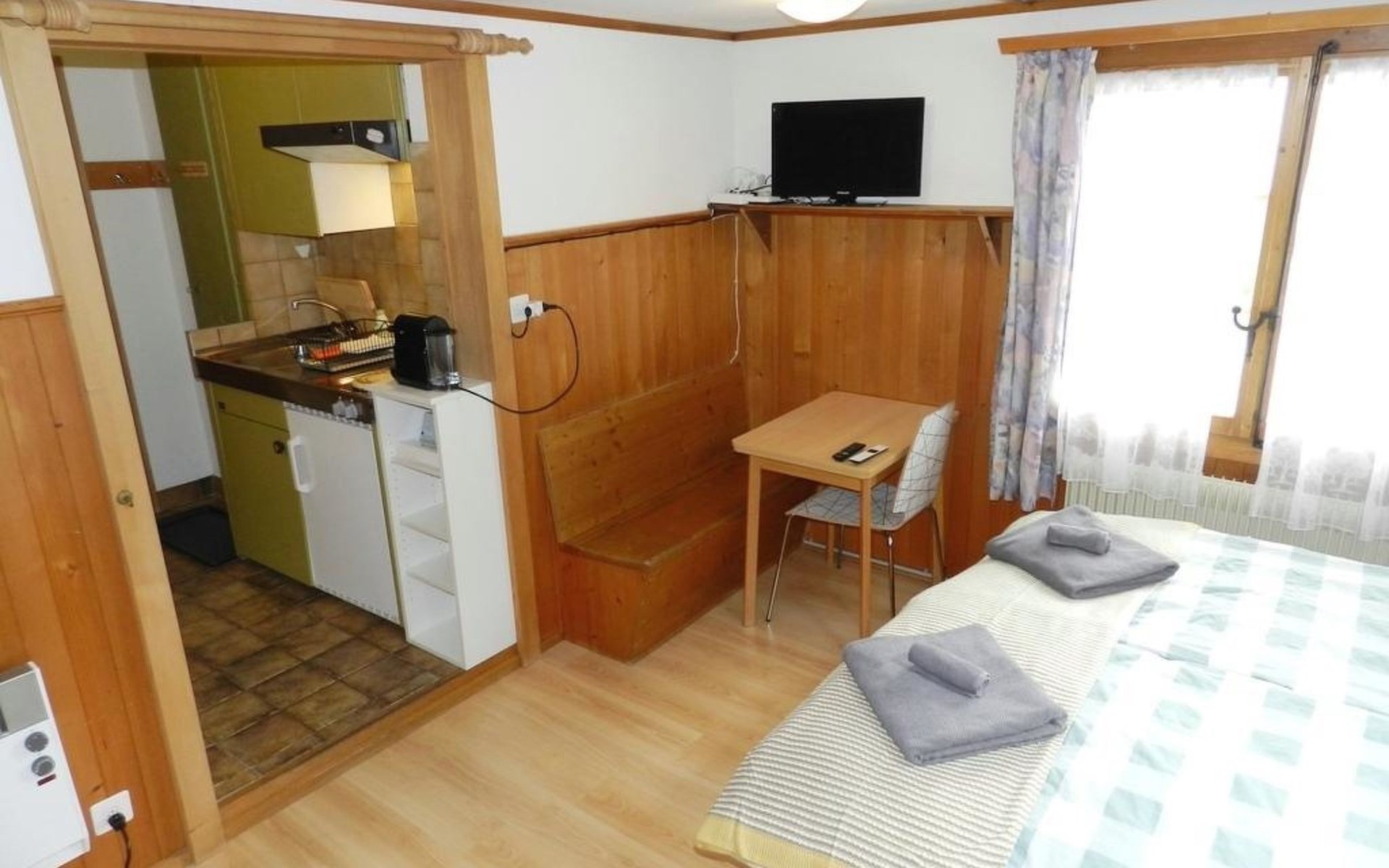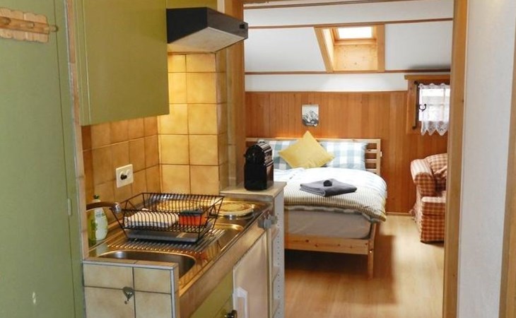 Living/dining/bedroom with 1 grand-lit (2x90x200cm), sofa, small dining table, wardrobe and flat screen TV. Small and simply furnished kitchenette (without oven) with coffee machine with capsules (Nespresso). 1 bathroom with toilet and shower. WiFi.