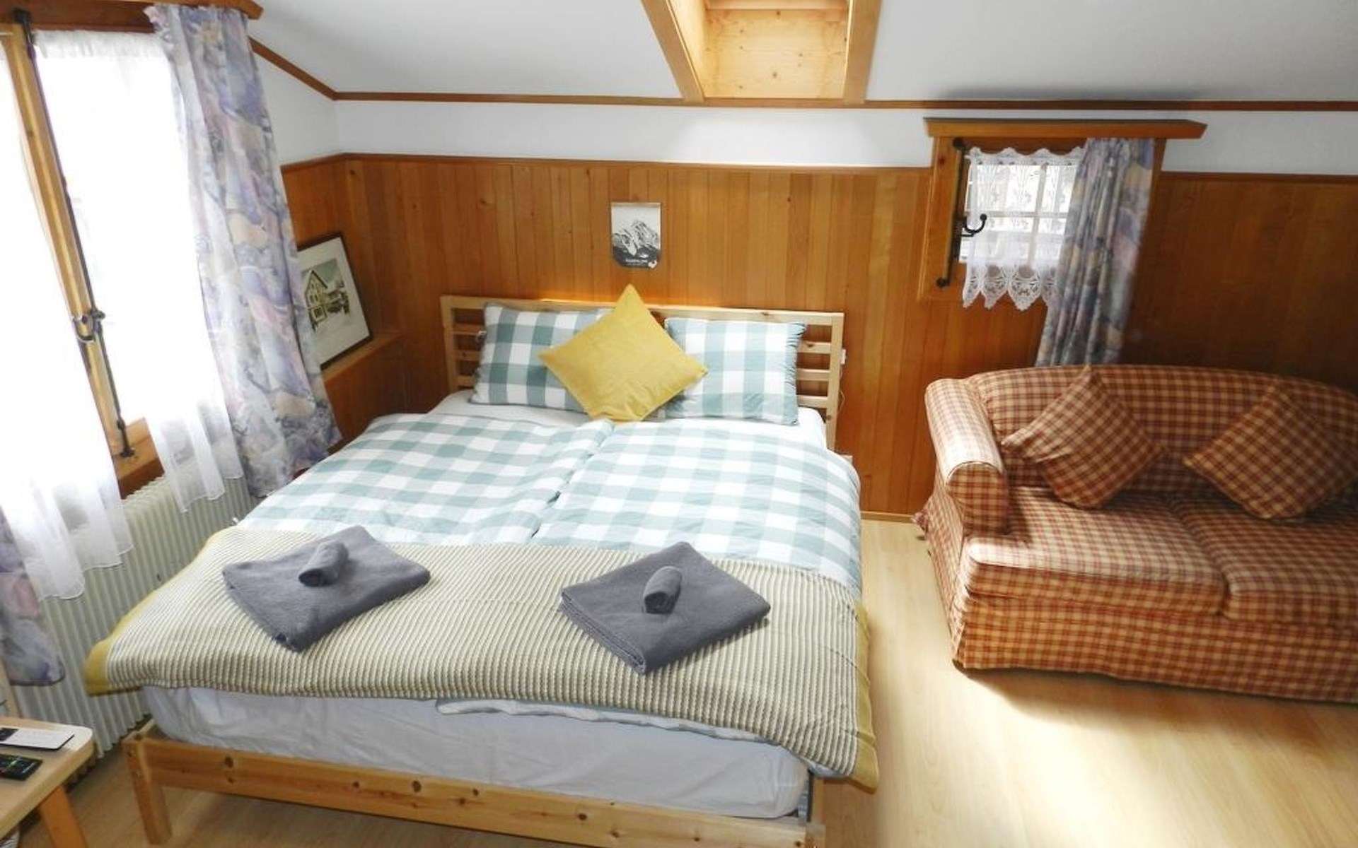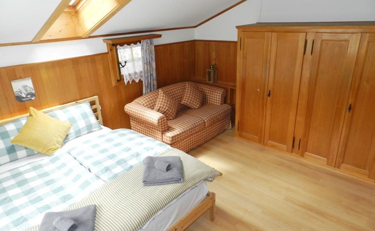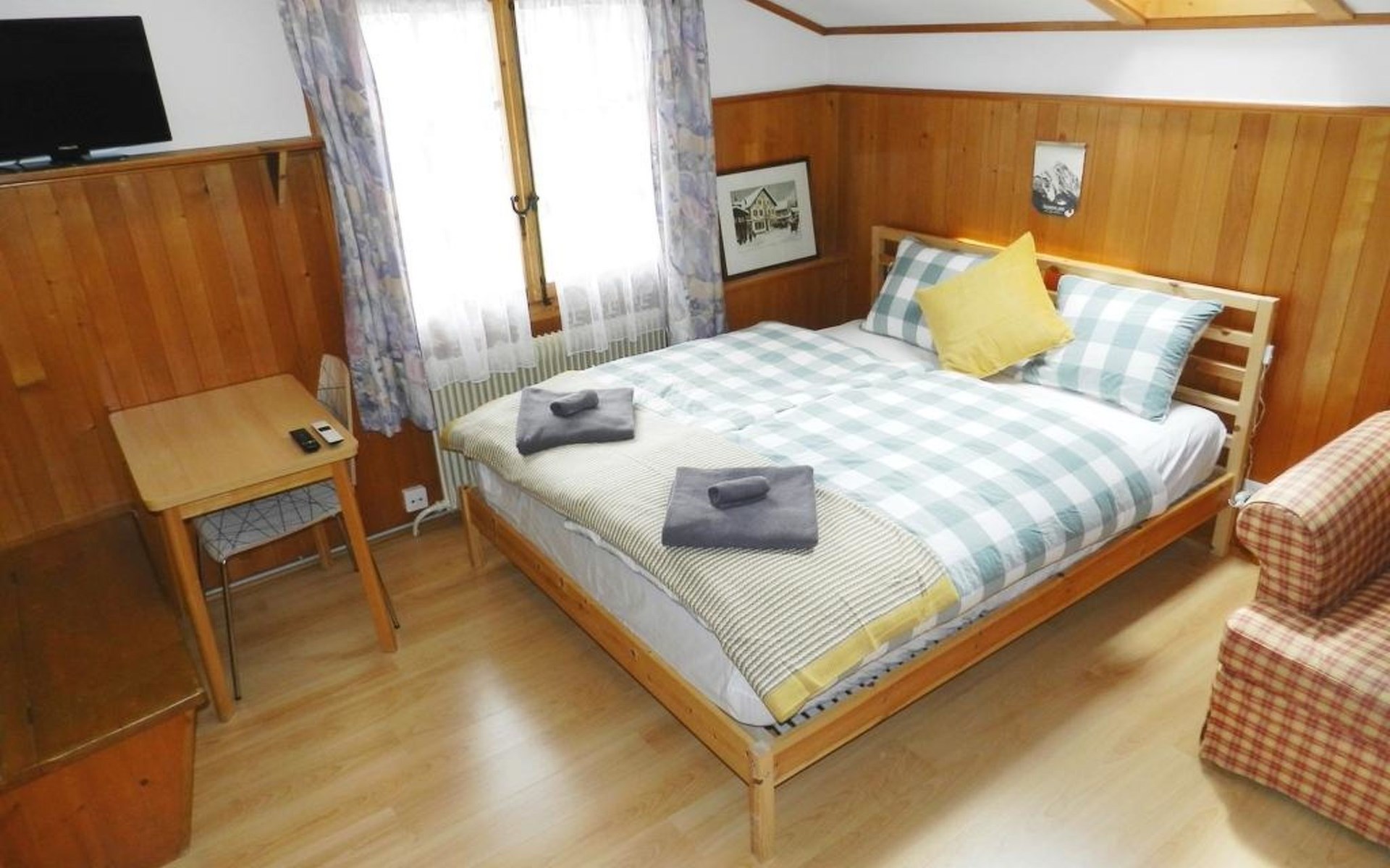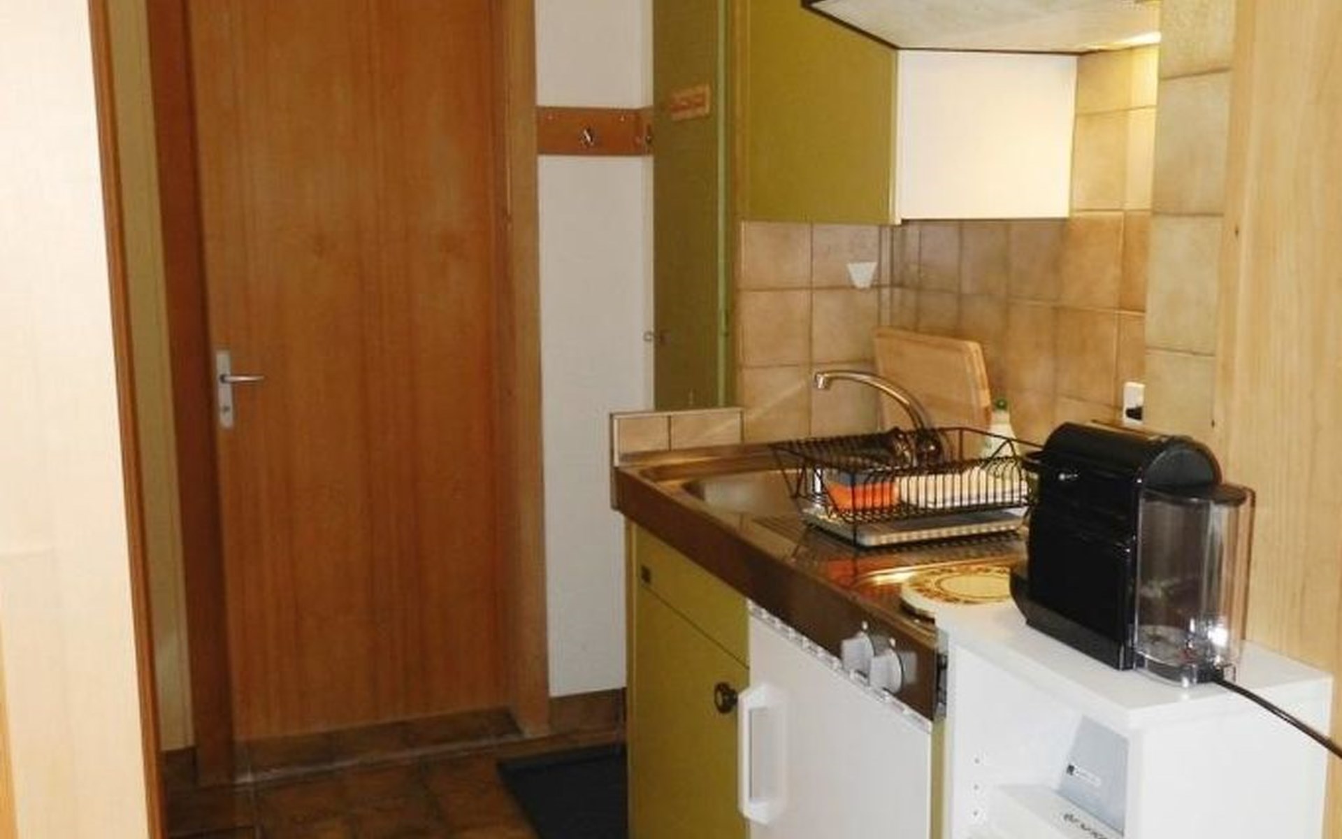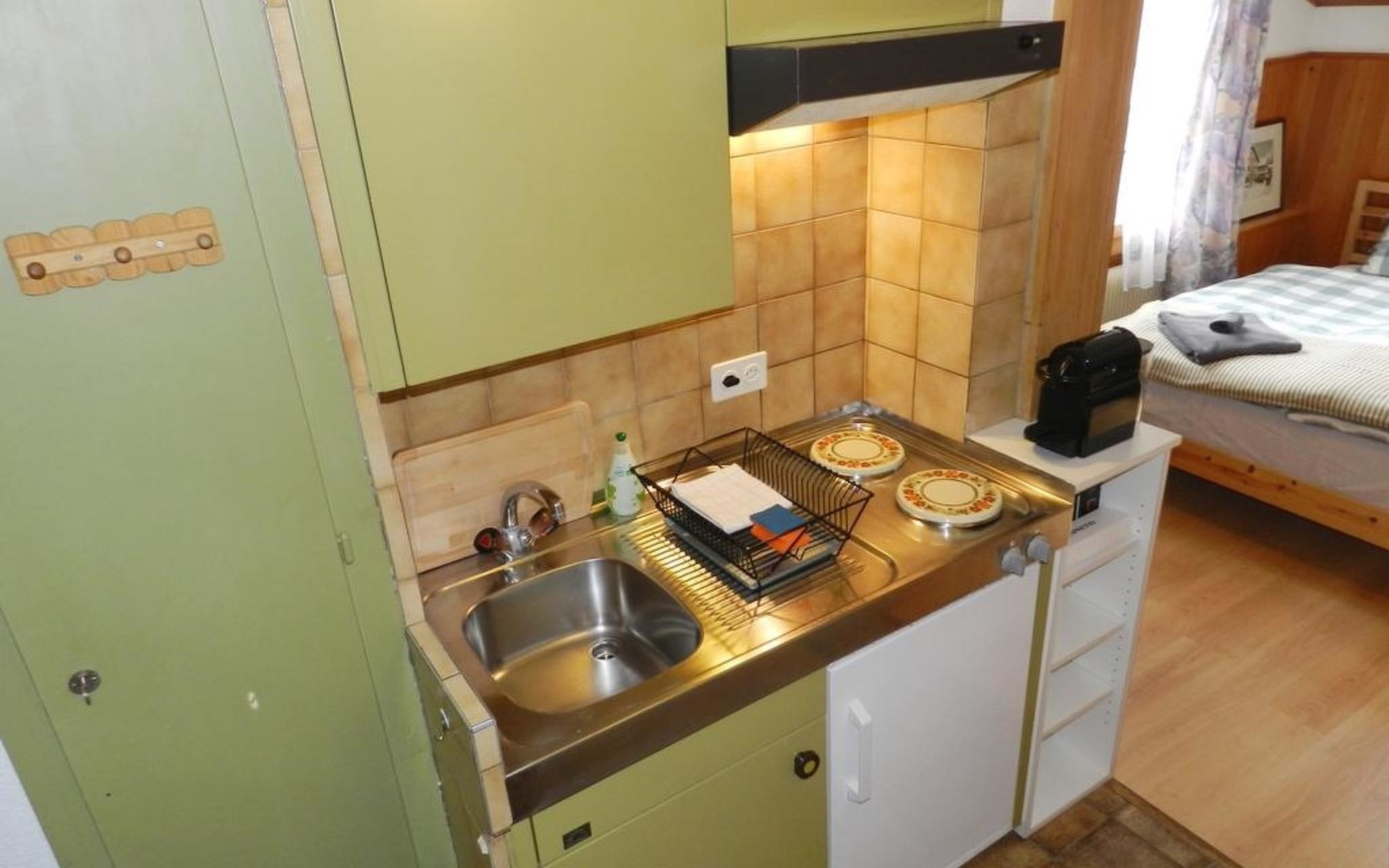 Living/dining/bedroom with 1 grand-lit (2x90x200cm), sofa, small dining table, wardrobe and flat screen TV. Small and simply furnished kitchenette (without oven) with coffee machine with capsules (Nespresso). 1 bathroom with toilet and shower. WiFi.