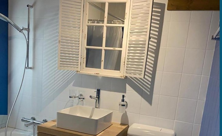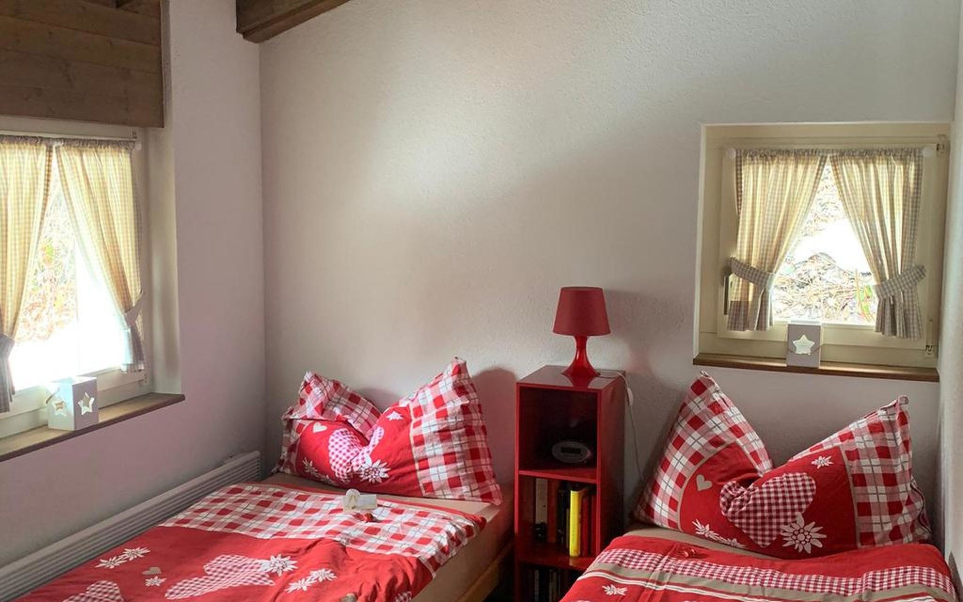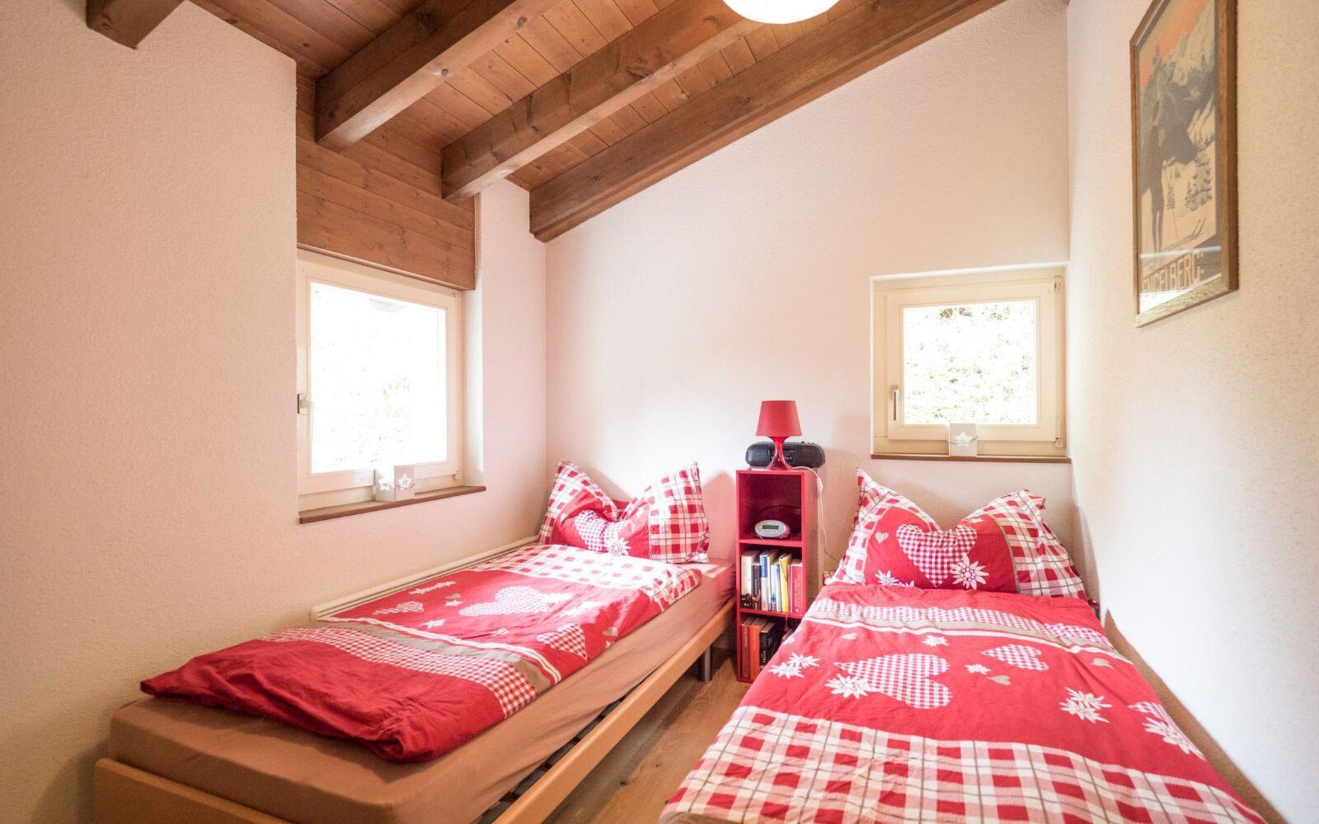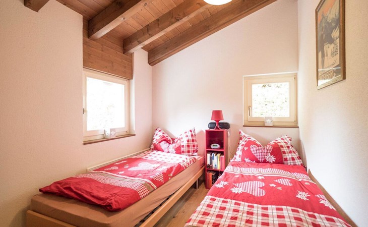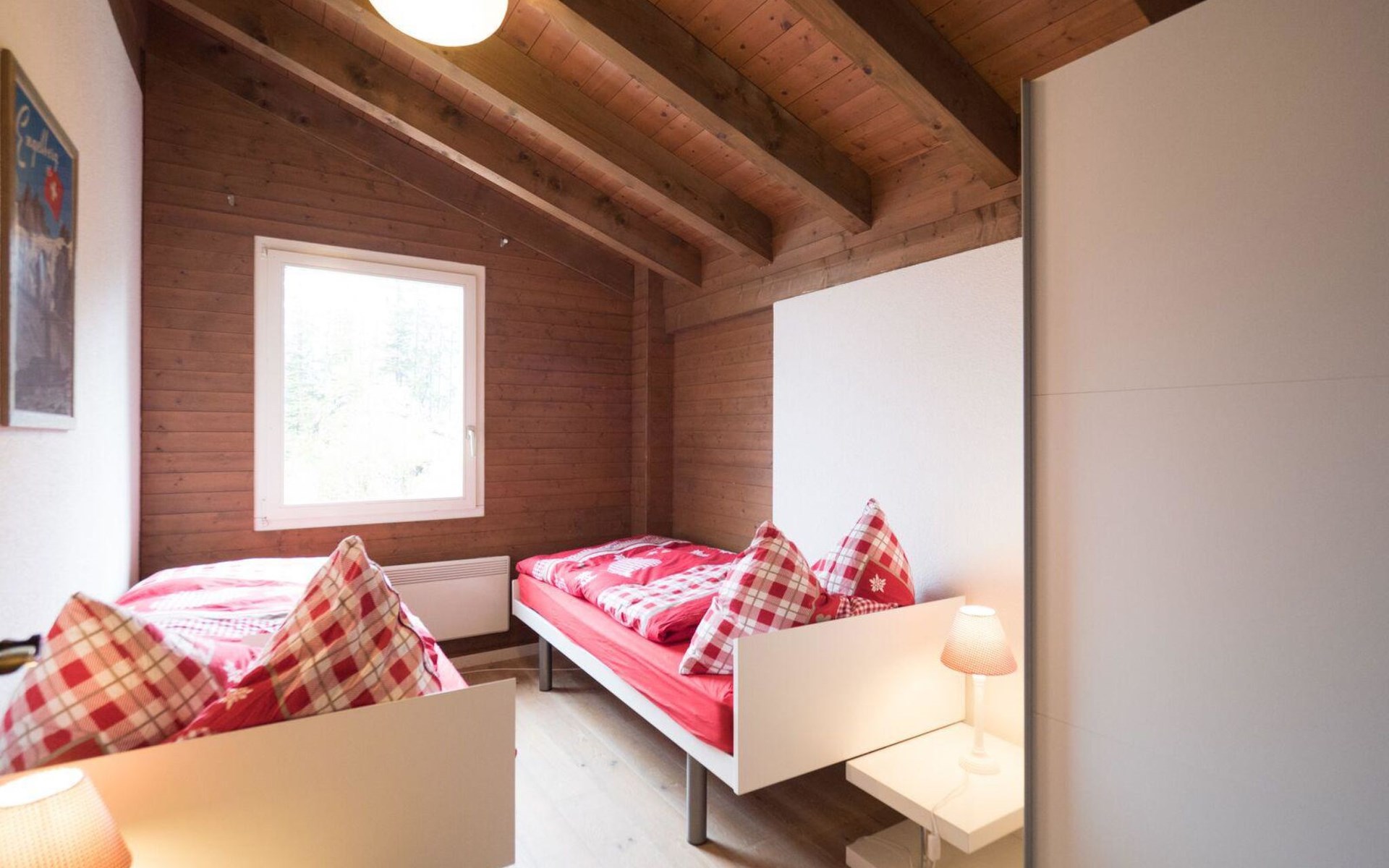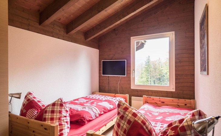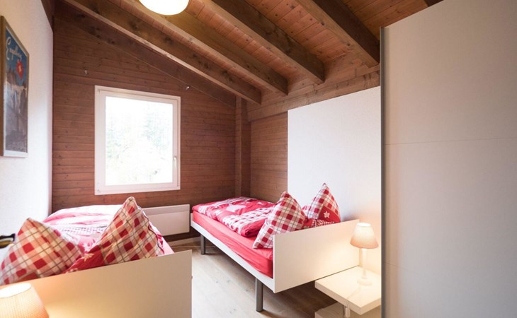 4-room chalet has 3 floors: ground floor entrance area. 1st floor: living room, dining room, kitchen. 2nd floor: 3 bedrooms (each with 2 single beds), bath/WC.