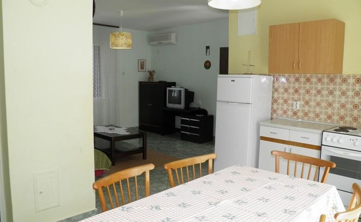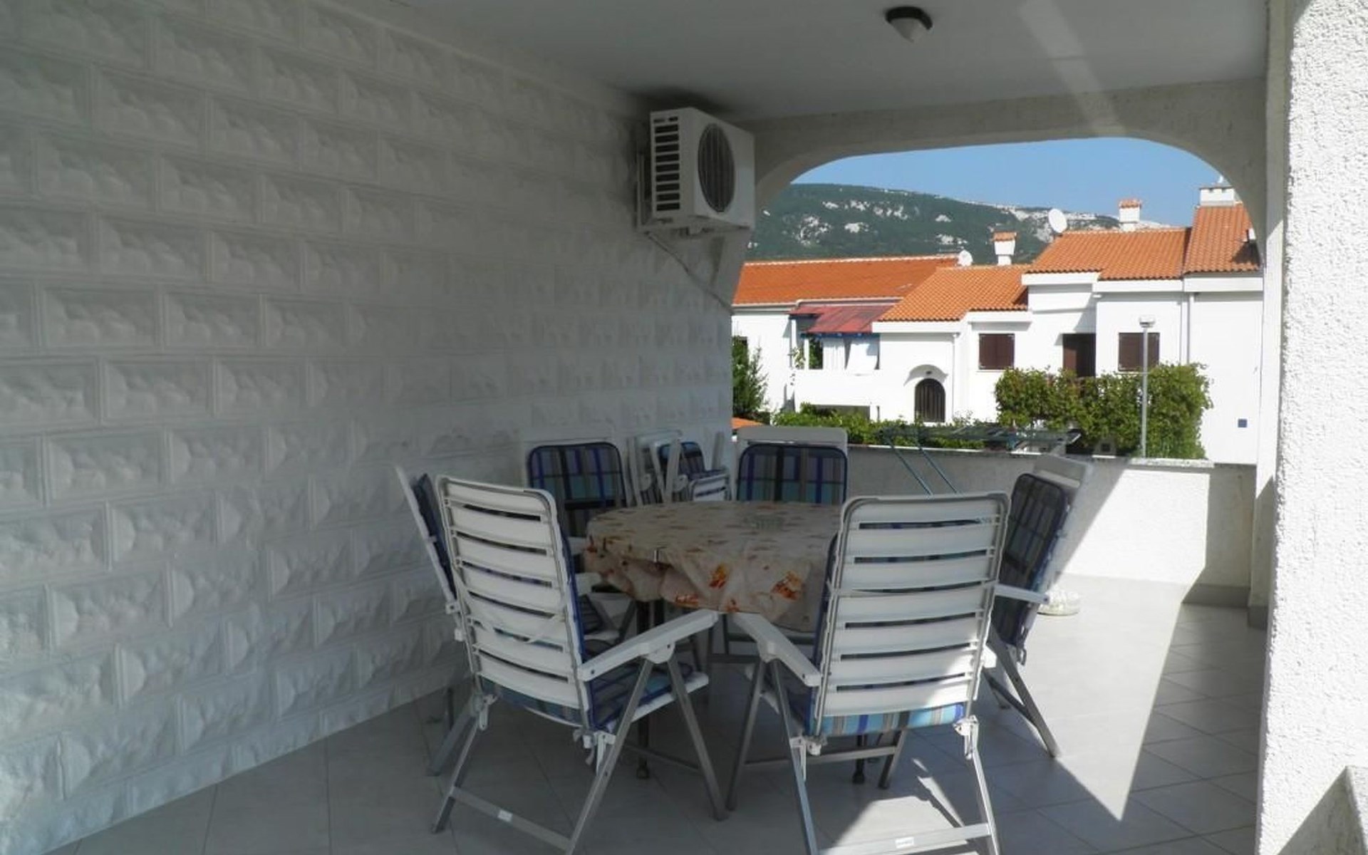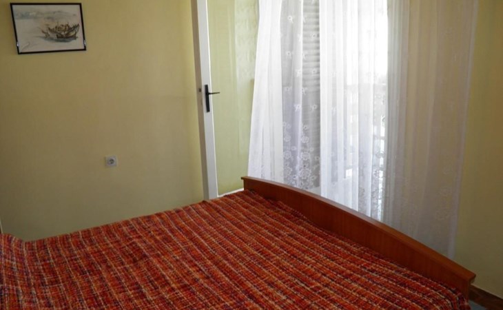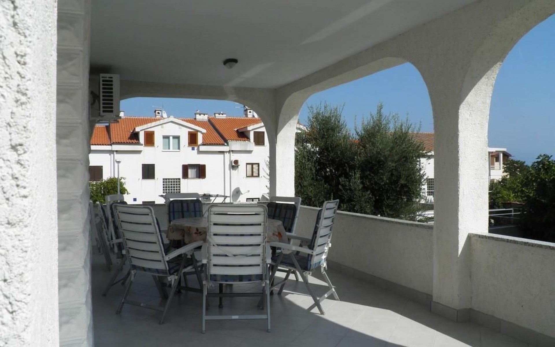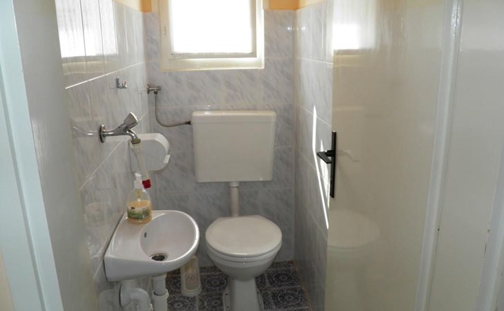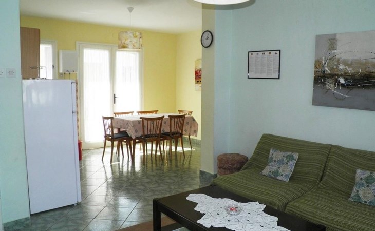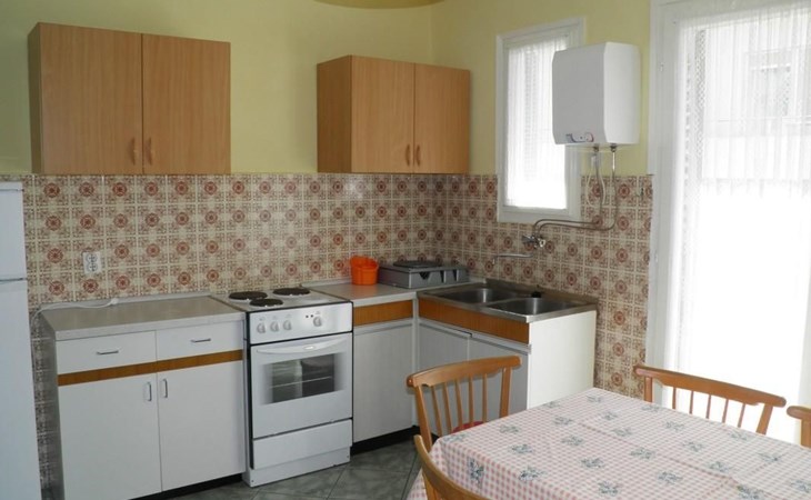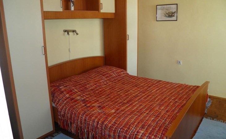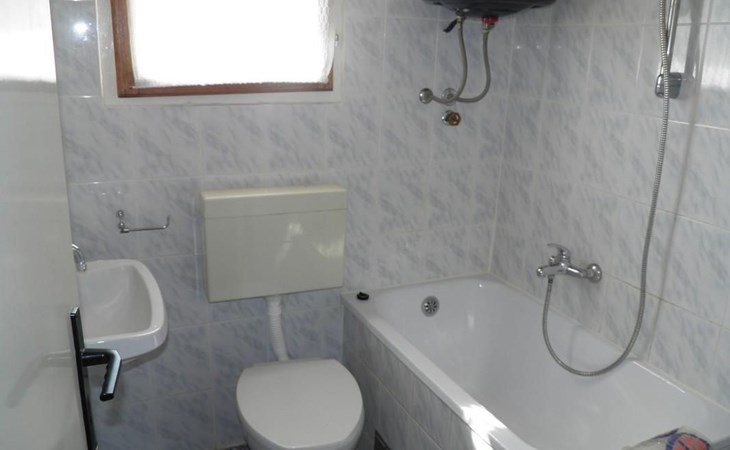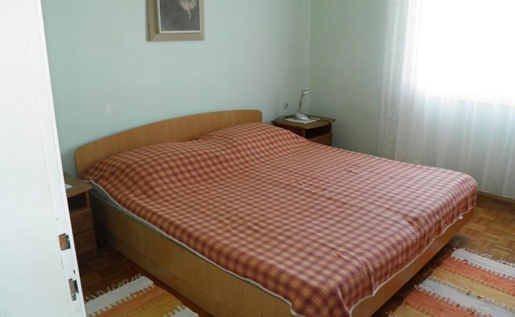 No. of persons: 6-7 Places: 70 m2 (ground floor); air-conditioned, pets are not allowed, free Wi-Fi Info: Satellite TV, bed linen is provided once a week, towels available (1 large, 1 small / per person and week), use of air conditioning is included in the price of the accommodation, Apartment facilities: Bedroom no.1 : double bed , parquet Bedroom no.2 : separate beds , parquet Bedroom no.3 : parquet , French bed living area : living room, dining room and kitchen are one unit ; one additional sleeping possibility on a sofa bed ; with terrace ; tiled kitchen : kitchenette, dining table and seating for all persons, crockery, cooking pots, cutlery etc. available, dish towels available, electric cooker, number of hotplates: 3, oven, fridge with freezer compartment, coffee machine bathroom no. 1 Bathroom with WC, with bathtub Bathroom no.2 : separate WC Terrace : private terrace, covered terrace, table and chairs for the terrace are available. Please bring your own deckchairs and other equipment, terrace area: 20 square metres