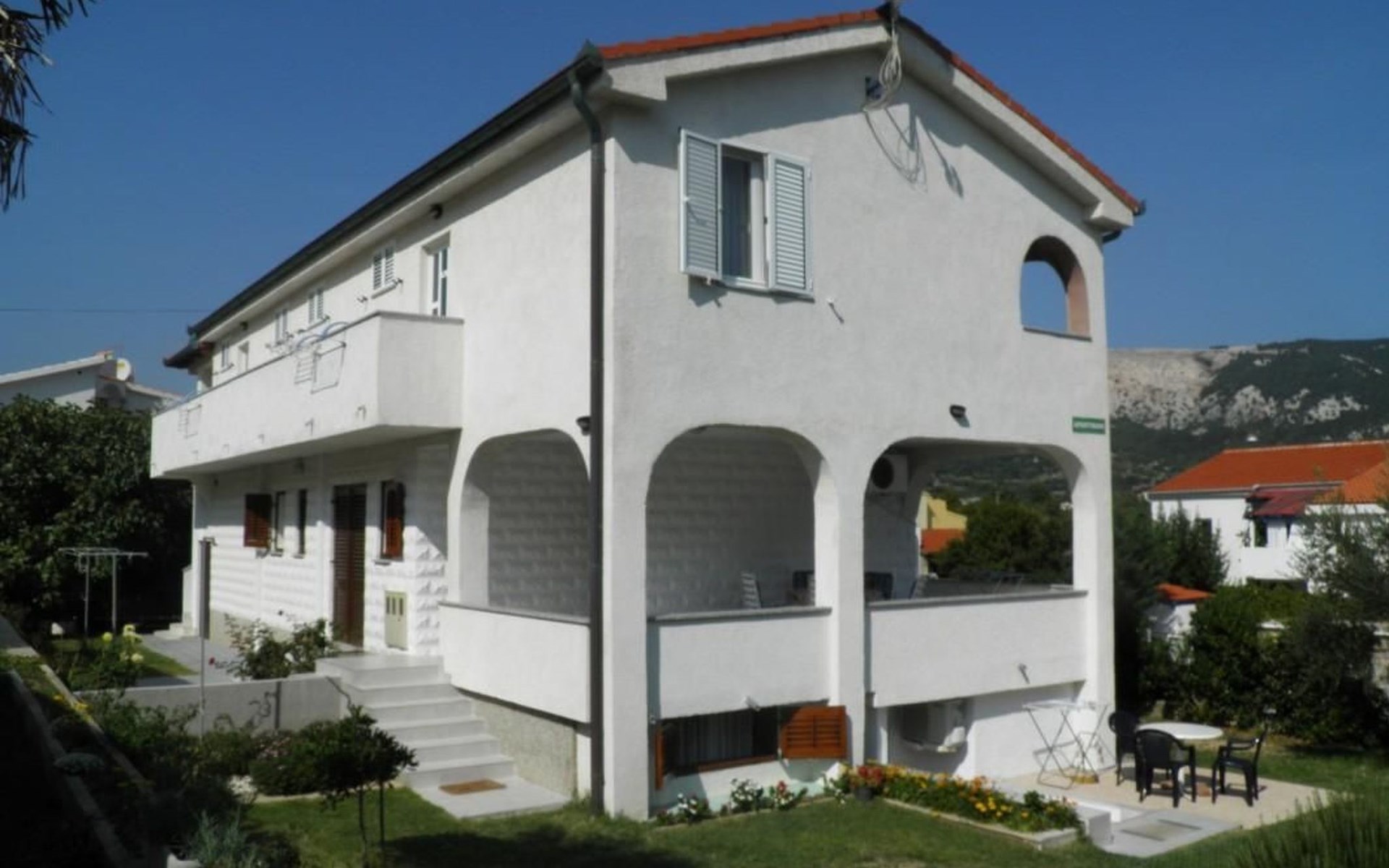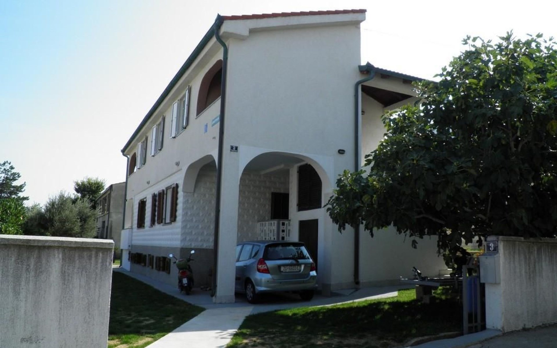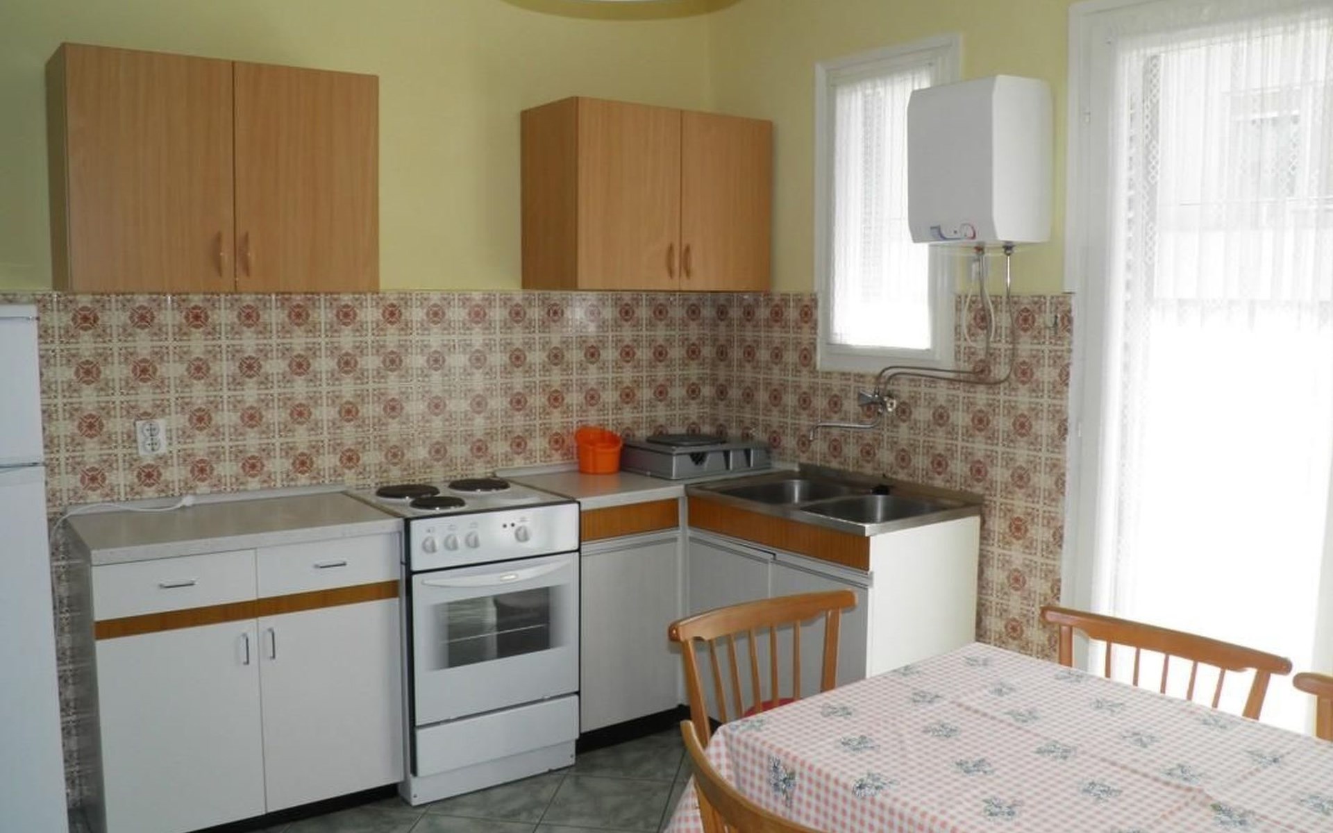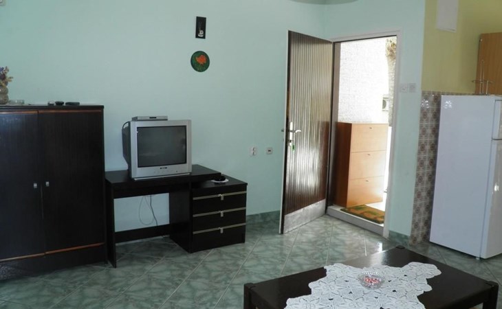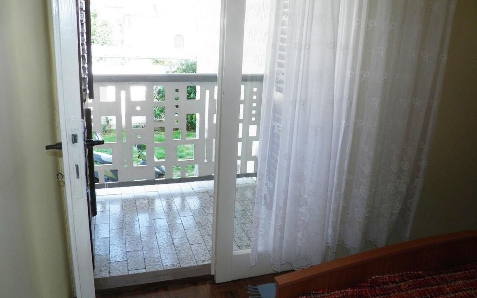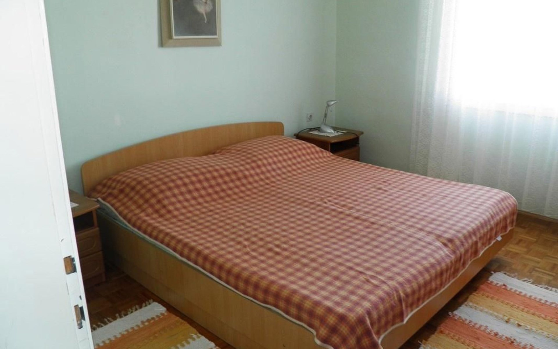 No. of persons: 6-7 Places: 70 m2 (ground floor); air-conditioned, pets are not allowed, free Wi-Fi Info: Satellite TV, bed linen is provided once a week, towels available (1 large, 1 small / per person and week), use of air conditioning is included in the price of the accommodation, Apartment facilities: Bedroom no.1 : double bed , parquet Bedroom no.2 : separate beds , parquet Bedroom no.3 : parquet , French bed living area : living room, dining room and kitchen are one unit ; one additional sleeping possibility on a sofa bed ; with terrace ; tiled kitchen : kitchenette, dining table and seating for all persons, crockery, cooking pots, cutlery etc. available, dish towels available, electric cooker, number of hotplates: 3, oven, fridge with freezer compartment, coffee machine bathroom no. 1 Bathroom with WC, with bathtub Bathroom no.2 : separate WC Terrace : private terrace, covered terrace, table and chairs for the terrace are available. Please bring your own deckchairs and other equipment, terrace area: 20 square metres