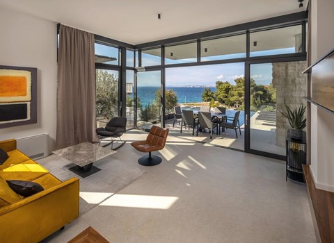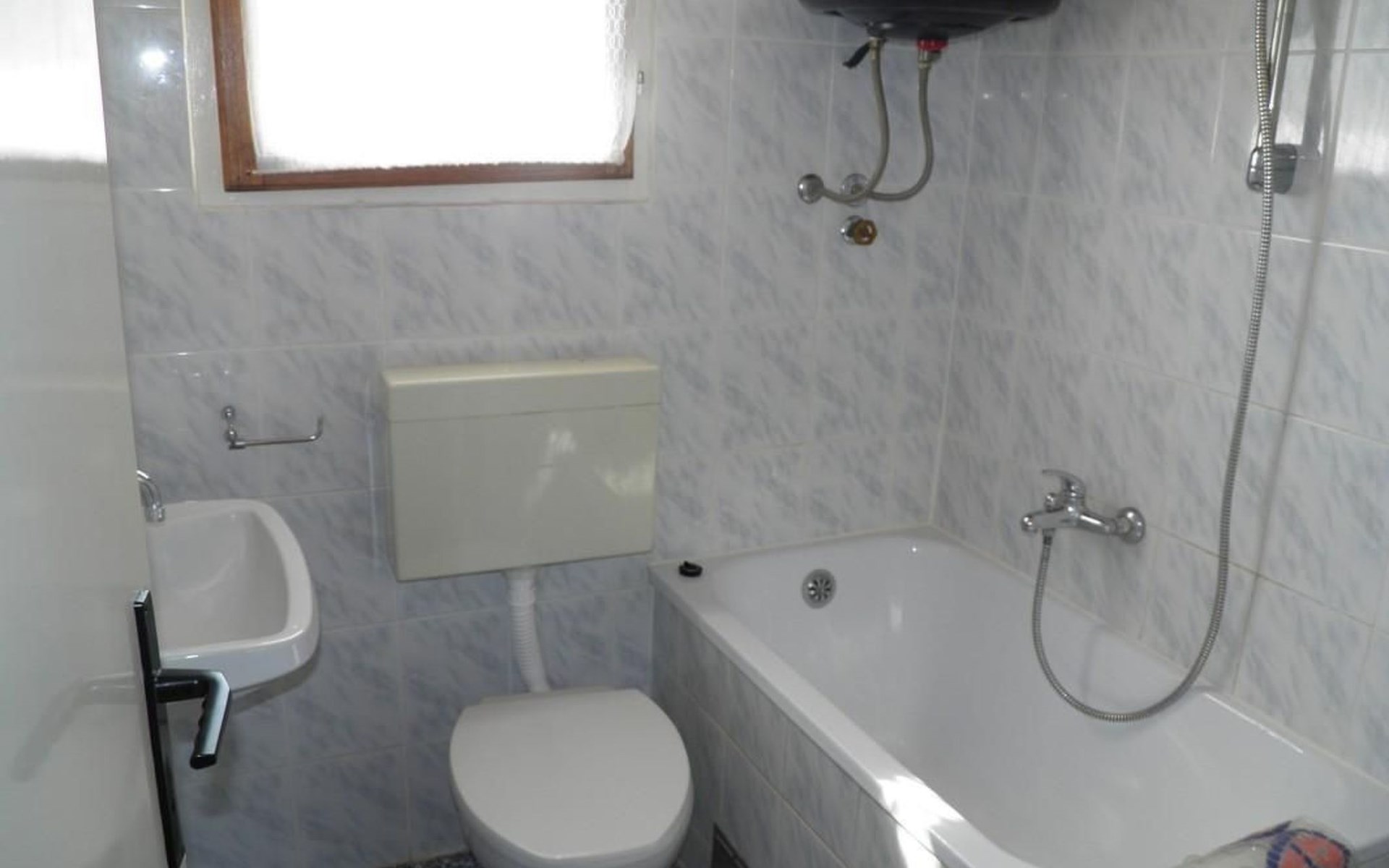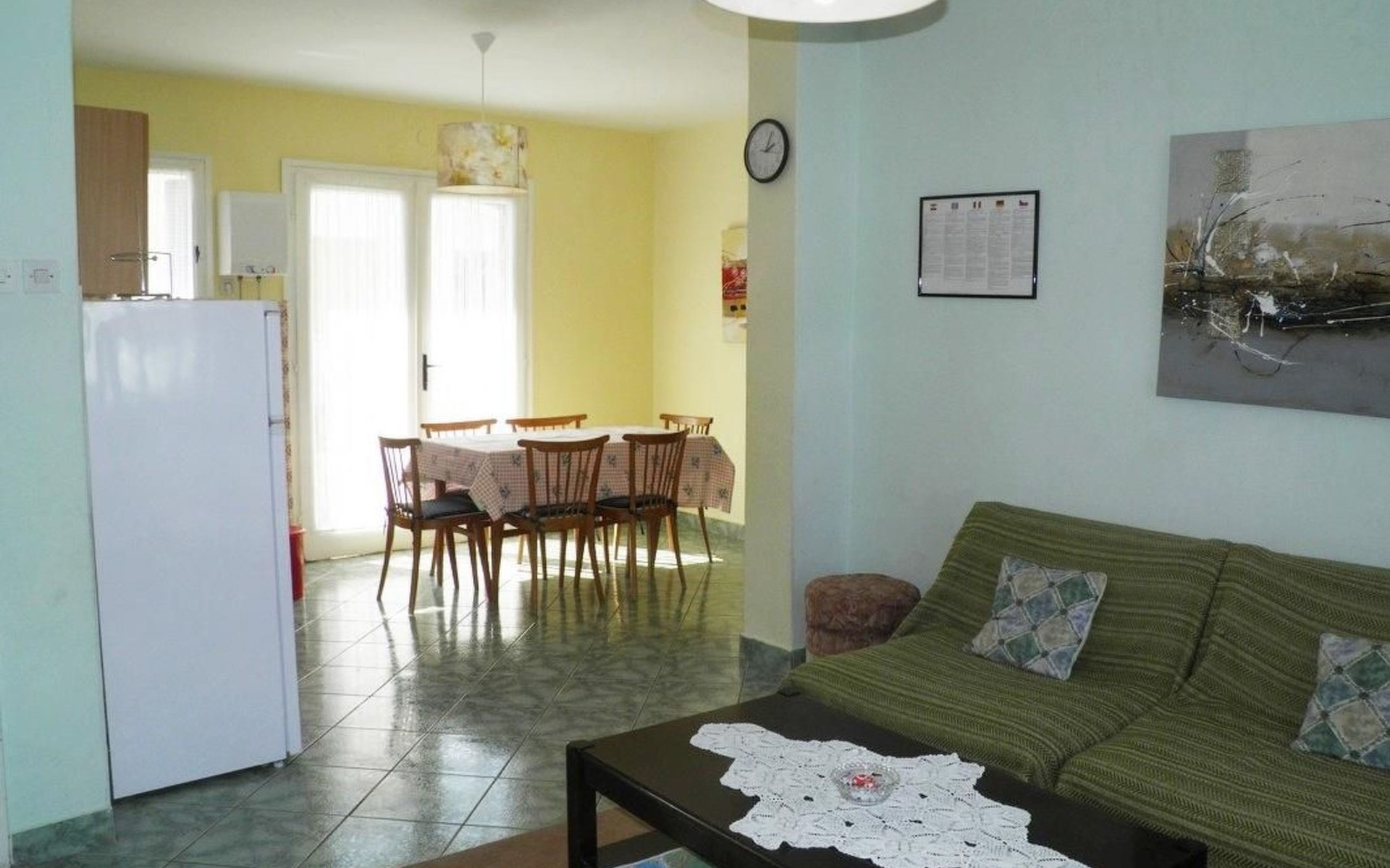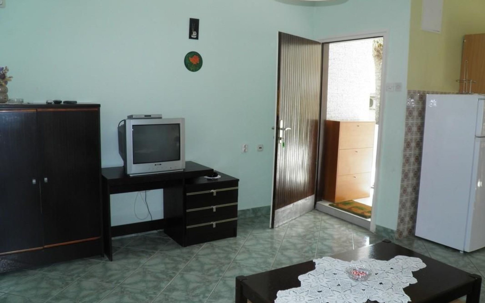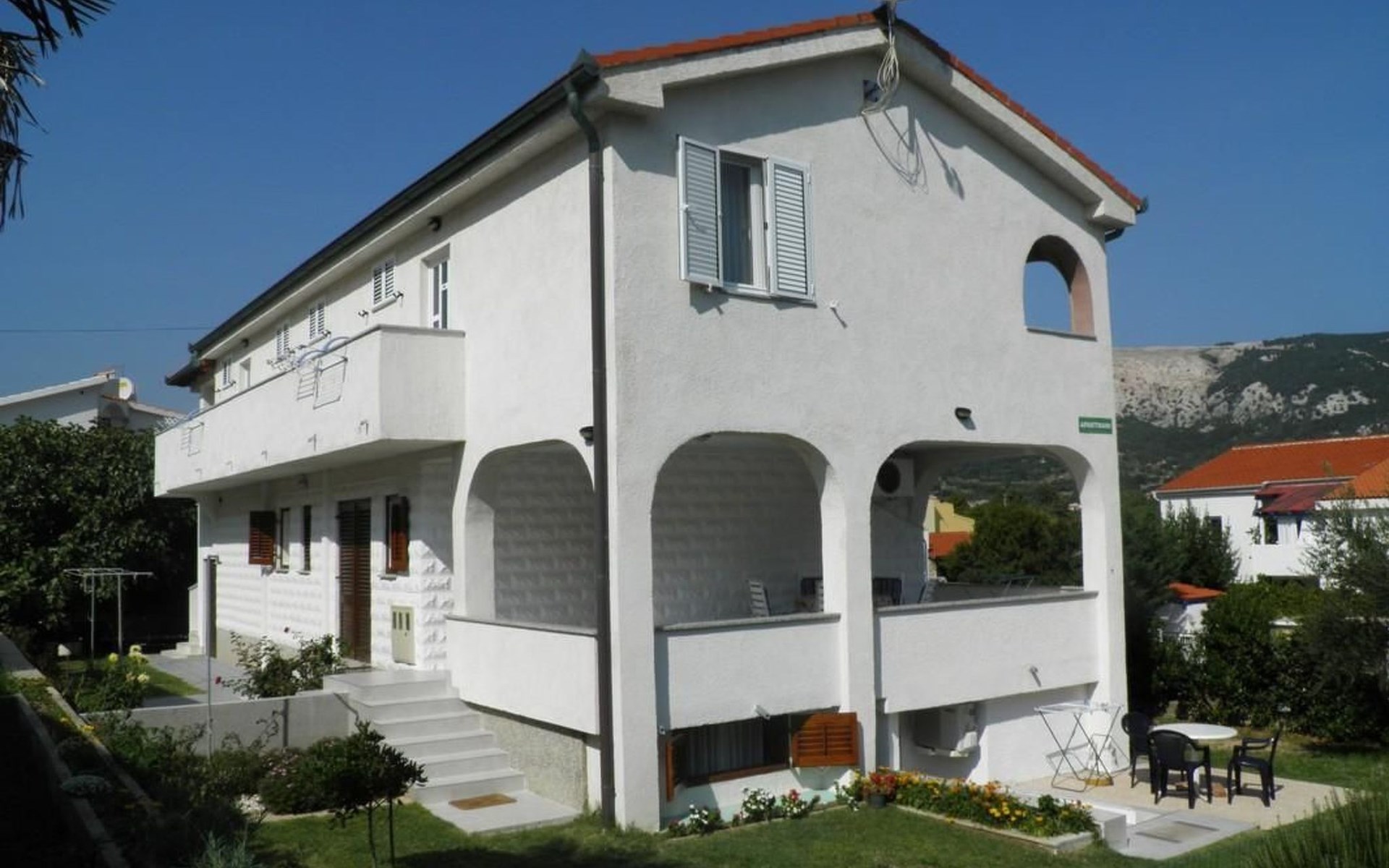 No. of persons: 6-7 Places: 70 m2 (ground floor); air-conditioned, pets are not allowed, free Wi-Fi Info: Satellite TV, bed linen is provided once a week, towels available (1 large, 1 small / per person and week), use of air conditioning is included in the price of the accommodation, Apartment facilities: Bedroom no.1 : double bed , parquet Bedroom no.2 : separate beds , parquet Bedroom no.3 : parquet , French bed living area : living room, dining room and kitchen are one unit ; one additional sleeping possibility on a sofa bed ; with terrace ; tiled kitchen : kitchenette, dining table and seating for all persons, crockery, cooking pots, cutlery etc. available, dish towels available, electric cooker, number of hotplates: 3, oven, fridge with freezer compartment, coffee machine bathroom no. 1 Bathroom with WC, with bathtub Bathroom no.2 : separate WC Terrace : private terrace, covered terrace, table and chairs for the terrace are available. Please bring your own deckchairs and other equipment, terrace area: 20 square metres