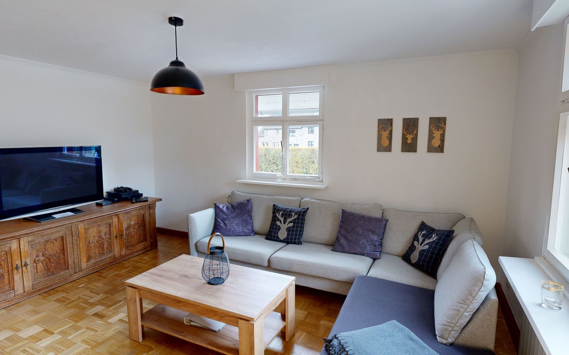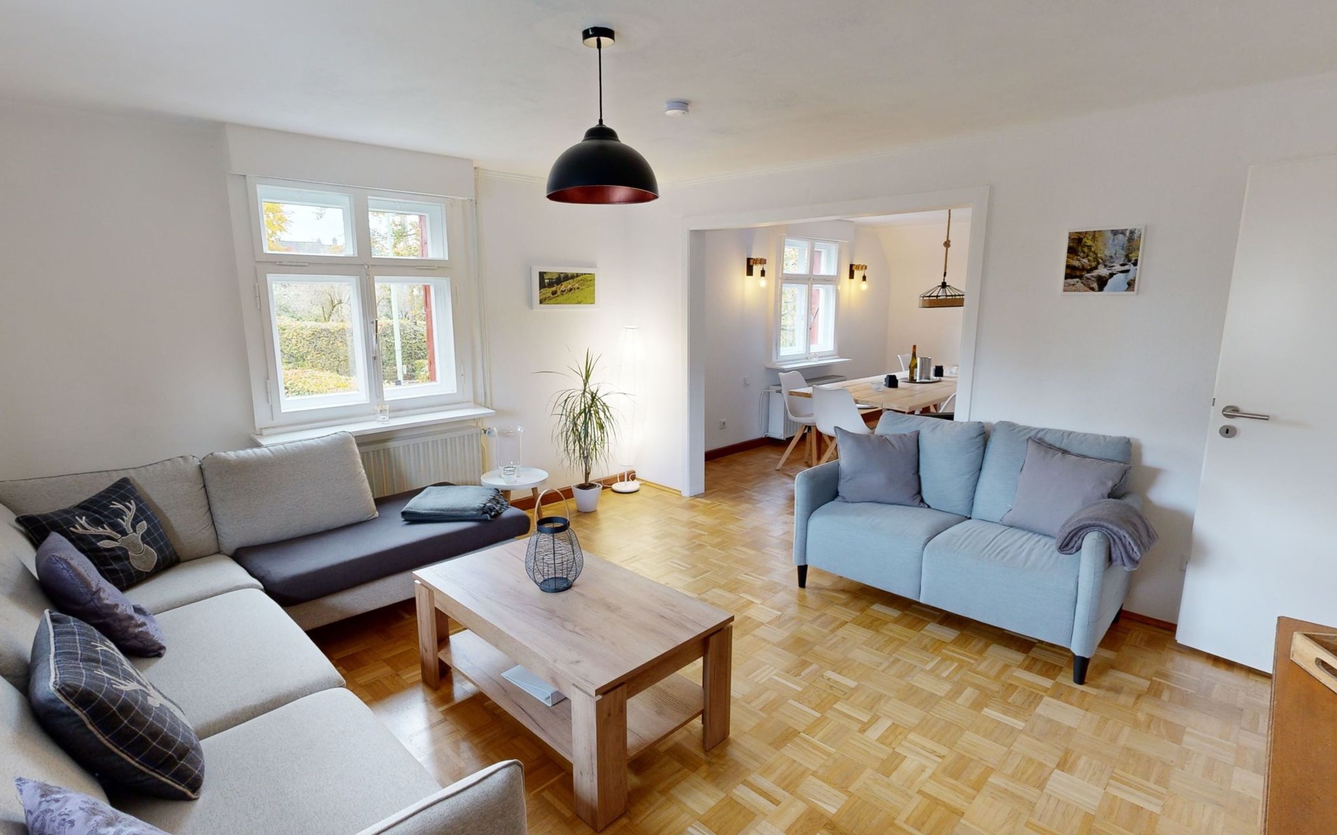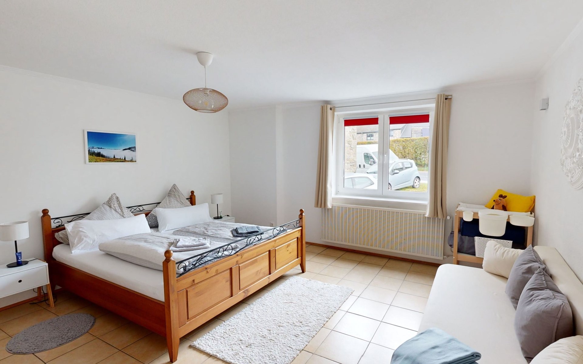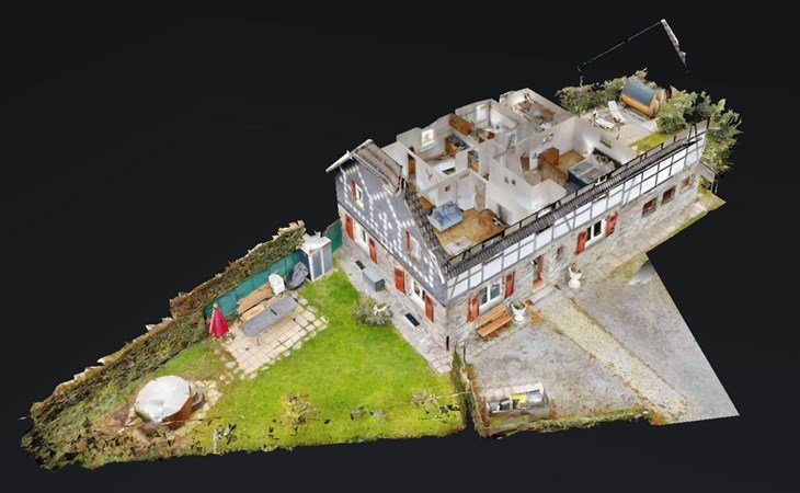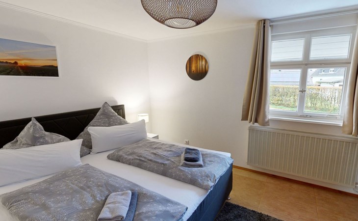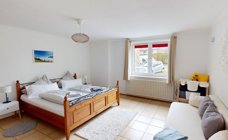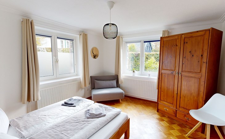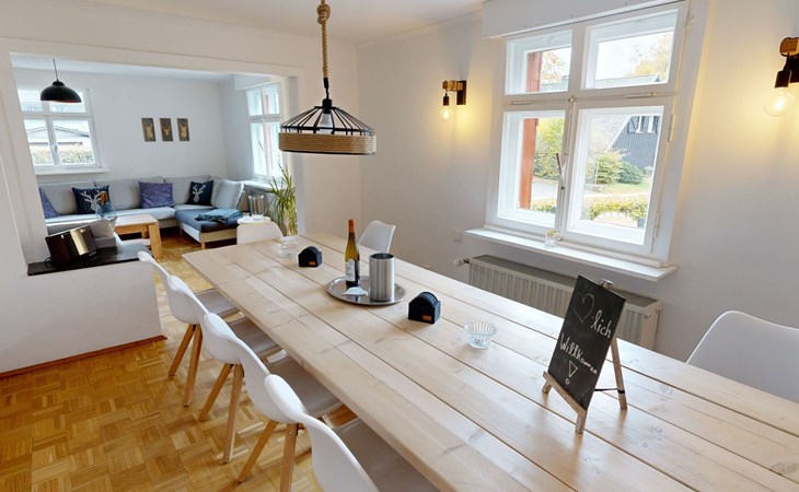 Dreamlike former farmhouse for 10-12 people in Monschau-Höfen Are you looking for a sustainable holiday home in the middle of the beautiful nature of the Eifel, where you can spend a cosy (short) holiday with up to 12 people? Would you also like to enjoy a little wellness in a sauna and a wood-fired hot tub? Then welcome to the Eifel Oasis Monschau.On two floors, the house offers 5 bedrooms with a total of 12 beds; 4 double beds (2 x 160 cm; 2 x 200 cm) and 1 bunk bed ensure a good night's sleep. There is also a sofa bed in 2 of the bedrooms to accommodate a maximum of 2 more people. In a large living room, 2 kitchens, a dining room and 2 bathrooms plus guest toilet, our guests have plenty of space in the house.both kitchens are fully equipped with electric cooker, oven and dishwasher as well as a microwave.in order to take account of the sustainability concept, we have implemented numerous measures, such as a modern pellet heating system, solar thermal energy, biodegradable detergents and cleaning agents, green electricity from Lichtblick, and of course waste separation.a TV set is of course part of the basic equipment of the Eifel Oasis. Younger guests are also catered for: a Playstation 4 with games for the older children is available, as is free Wi-Fi for exclusive use throughout the house (100 Mbit). Toys, a travel cot and a high chair are available for younger guests. Various toys and books are also freely available to our guests, as well as amenities such as a washing machine, iron and ironing board, and dogs are welcome on request. Bowls and a bed are available in the house if required.The outdoor areas of the Eifel Oasis are also spacious: two gardens with a sauna, a hot tub, plenty of seating and a charcoal barbecue promise relaxing moments. There are also 3 car parking spaces directly in front of the house. Use of the sauna is included per stay (usage times 08:00 to 22:00).Wellness area with barrel sauna and hot tub.The Eifel-Oase holiday home is less than 4 kilometres from the historic old town of Monschau and offers a wide range of leisure activities such as hiking, cycling and sightseeing on the edge of the Eifel National Park - Tor Höfen. The Vennradweg, the Eifelsteig, Vogelsang Castle and the Monschau Mustard Museum are all within easy reach of the holiday home. In winter, the beautiful Christmas market in the medieval old town is also enchanting. Regular shuttle buses ensure a smooth arrival and departure.