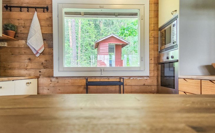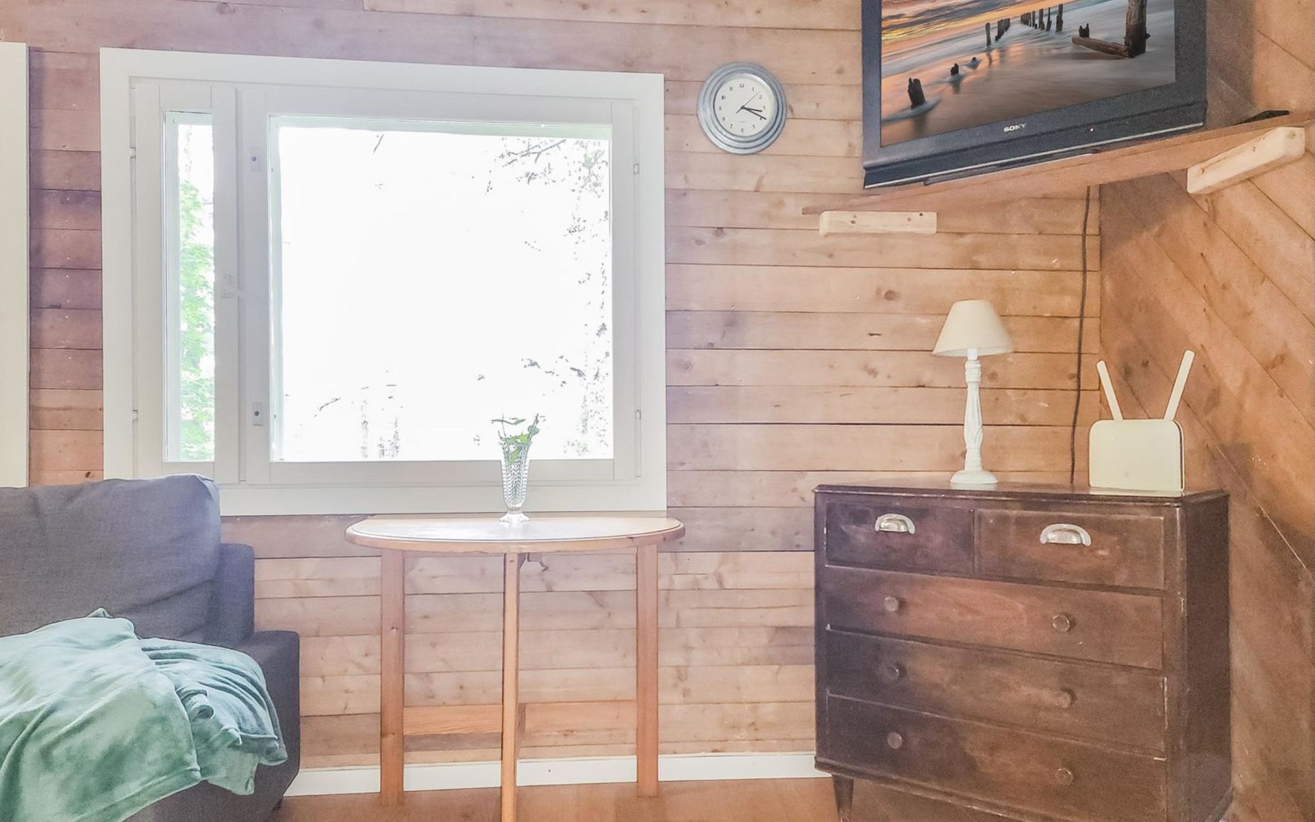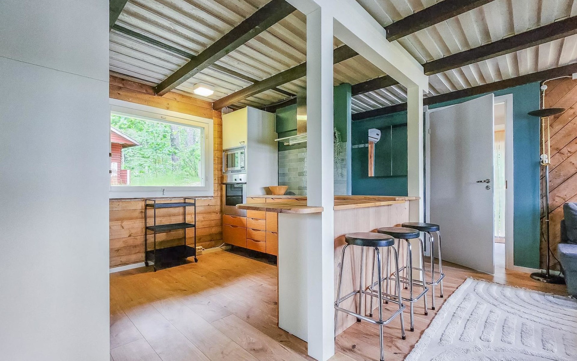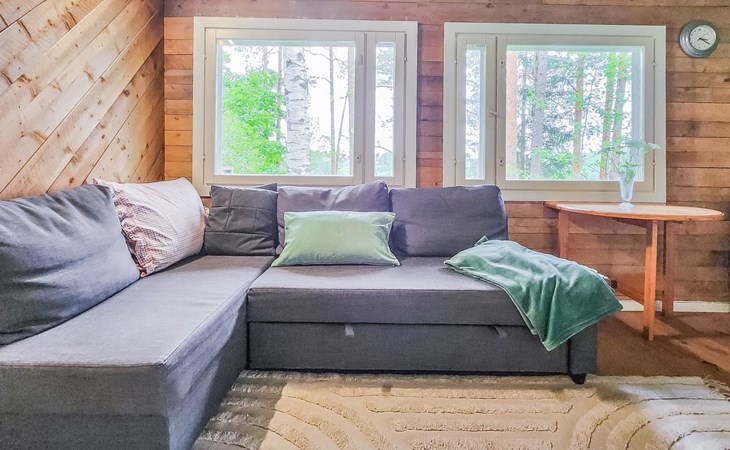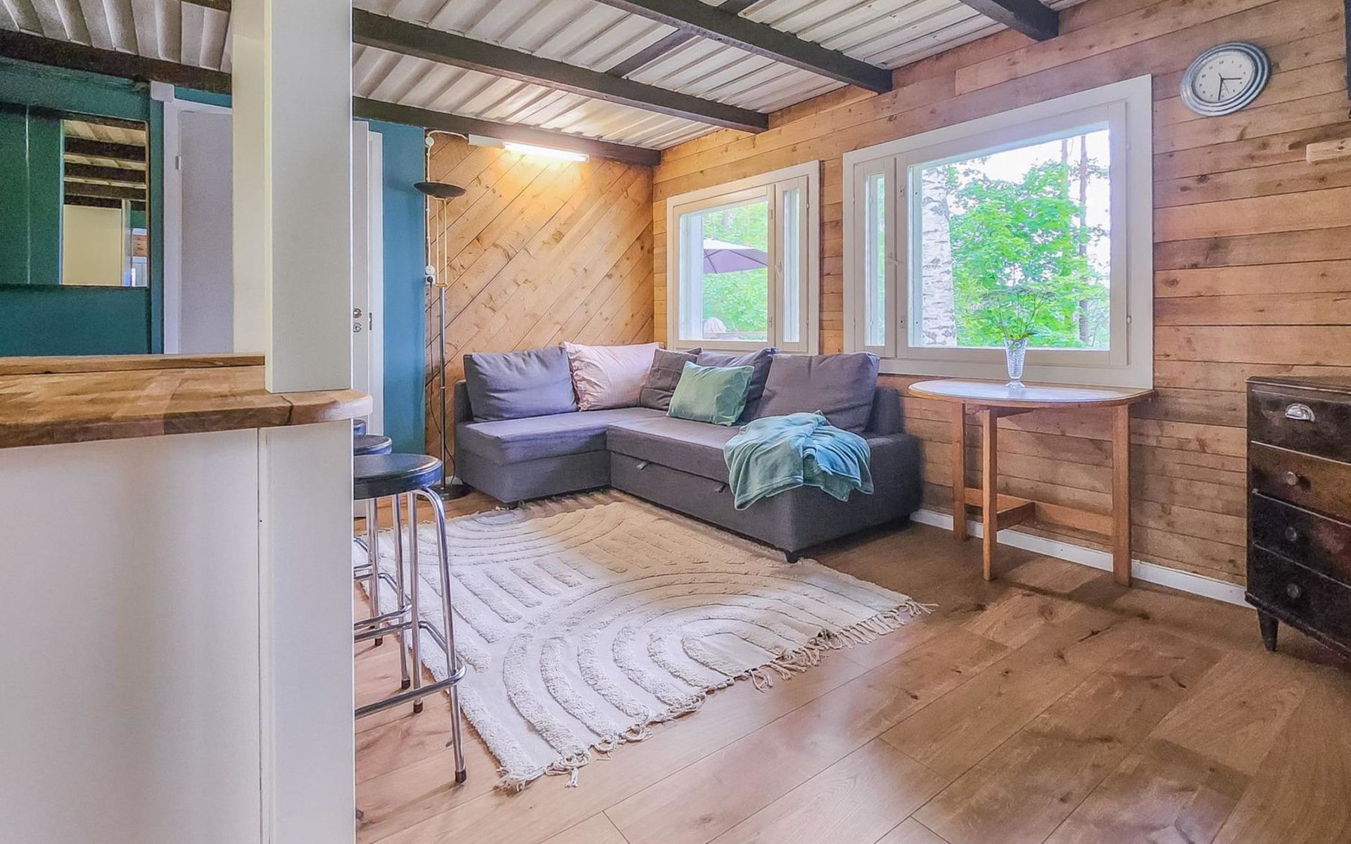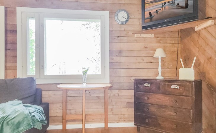 Wooden cottage 1959, renovated 1994, refurbished 2006 and 2024, living room/ kitchen sofa bed (1-2 persons, 140 cm) sleeping alcove with door: twin bed for 2, sleeping alcove with door: separate beds 2 x 80 cm, small (wood heated) sauna indoors, shower is in sauna, laundry area with sink.