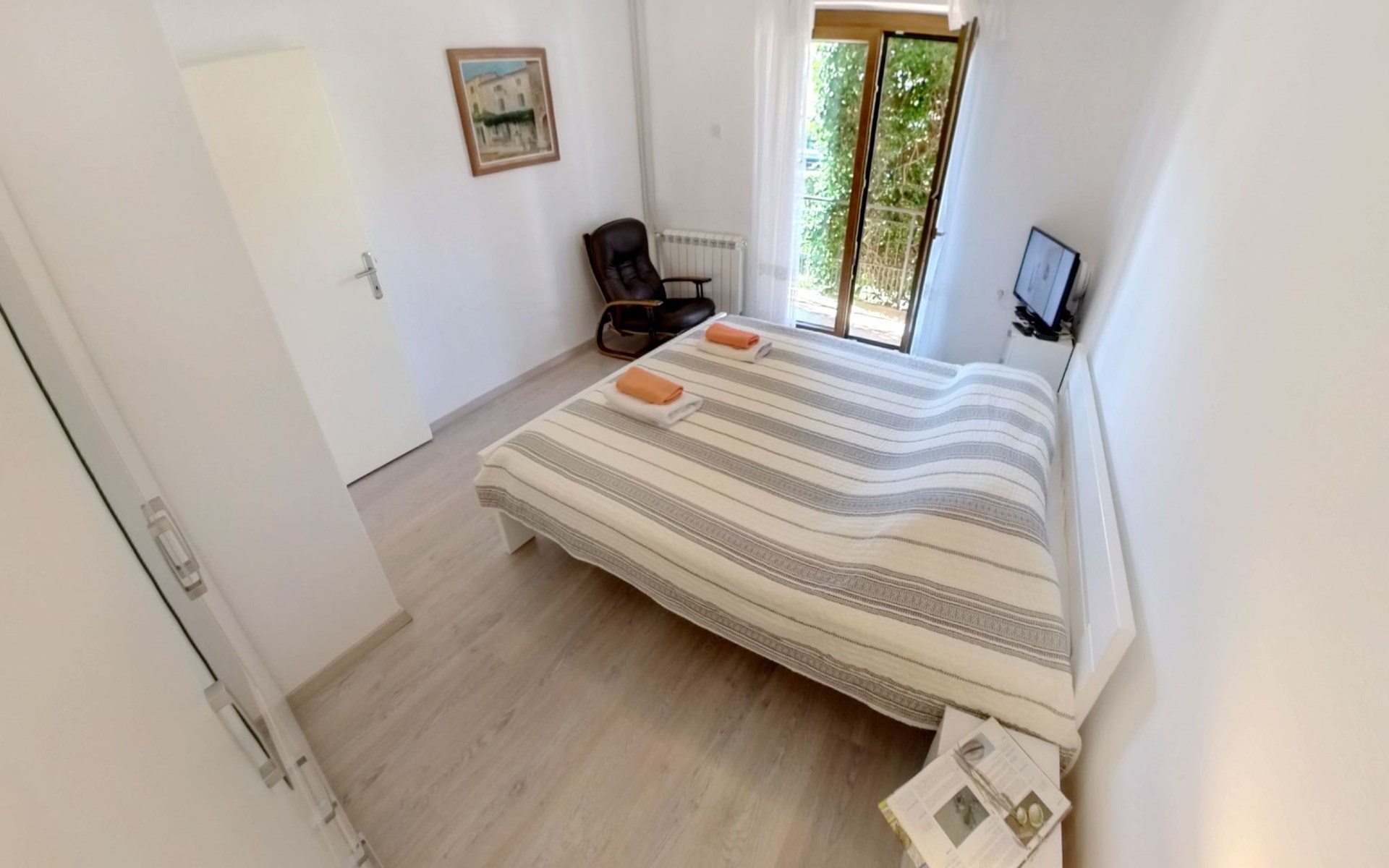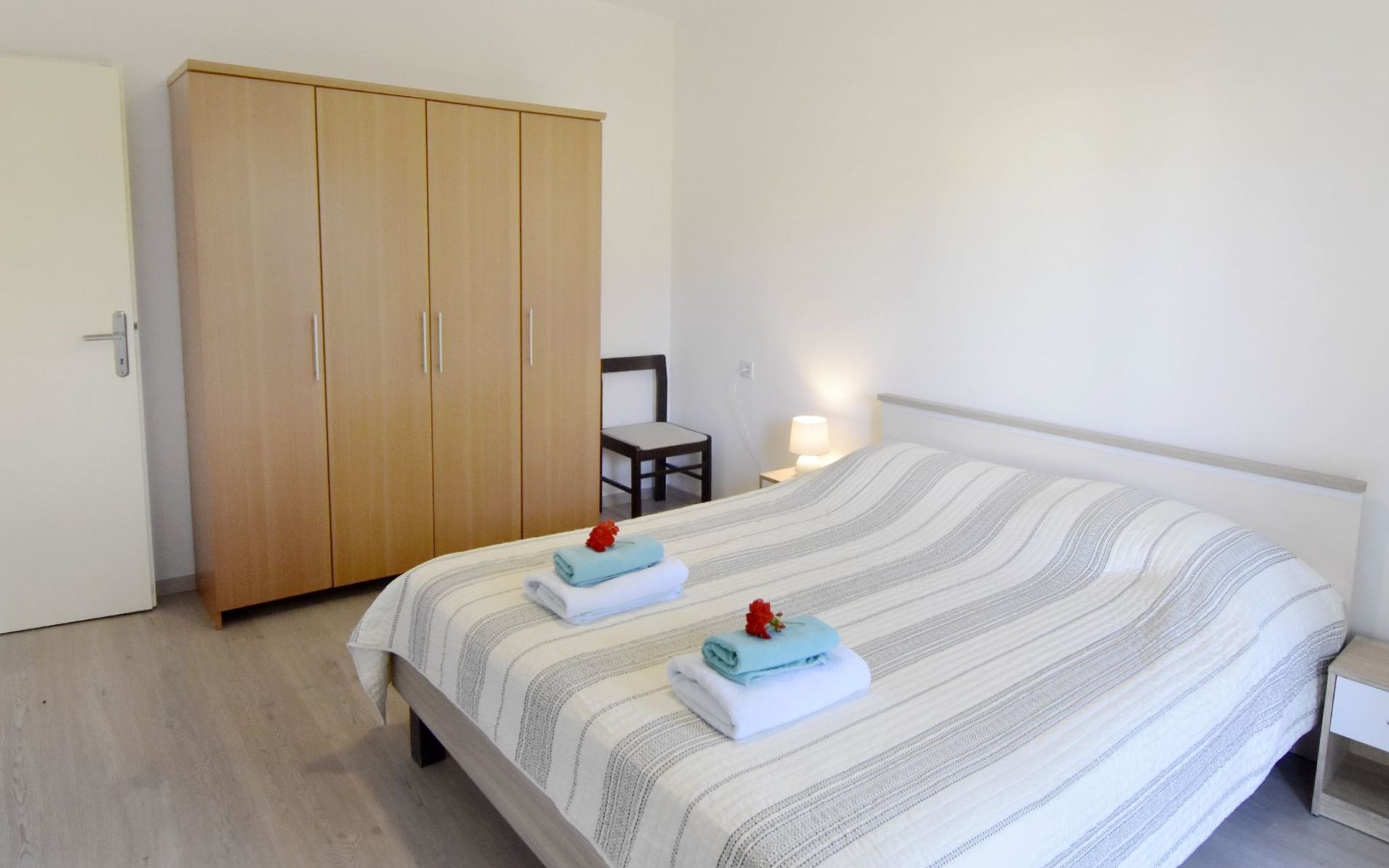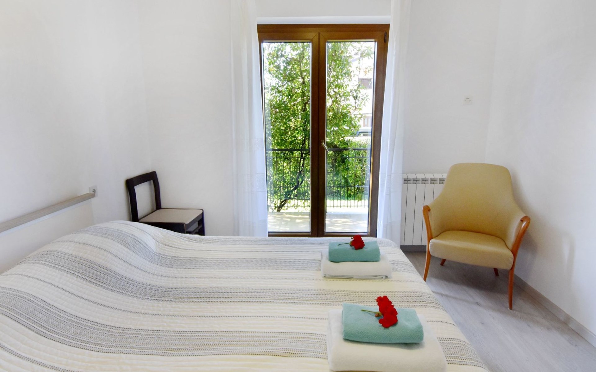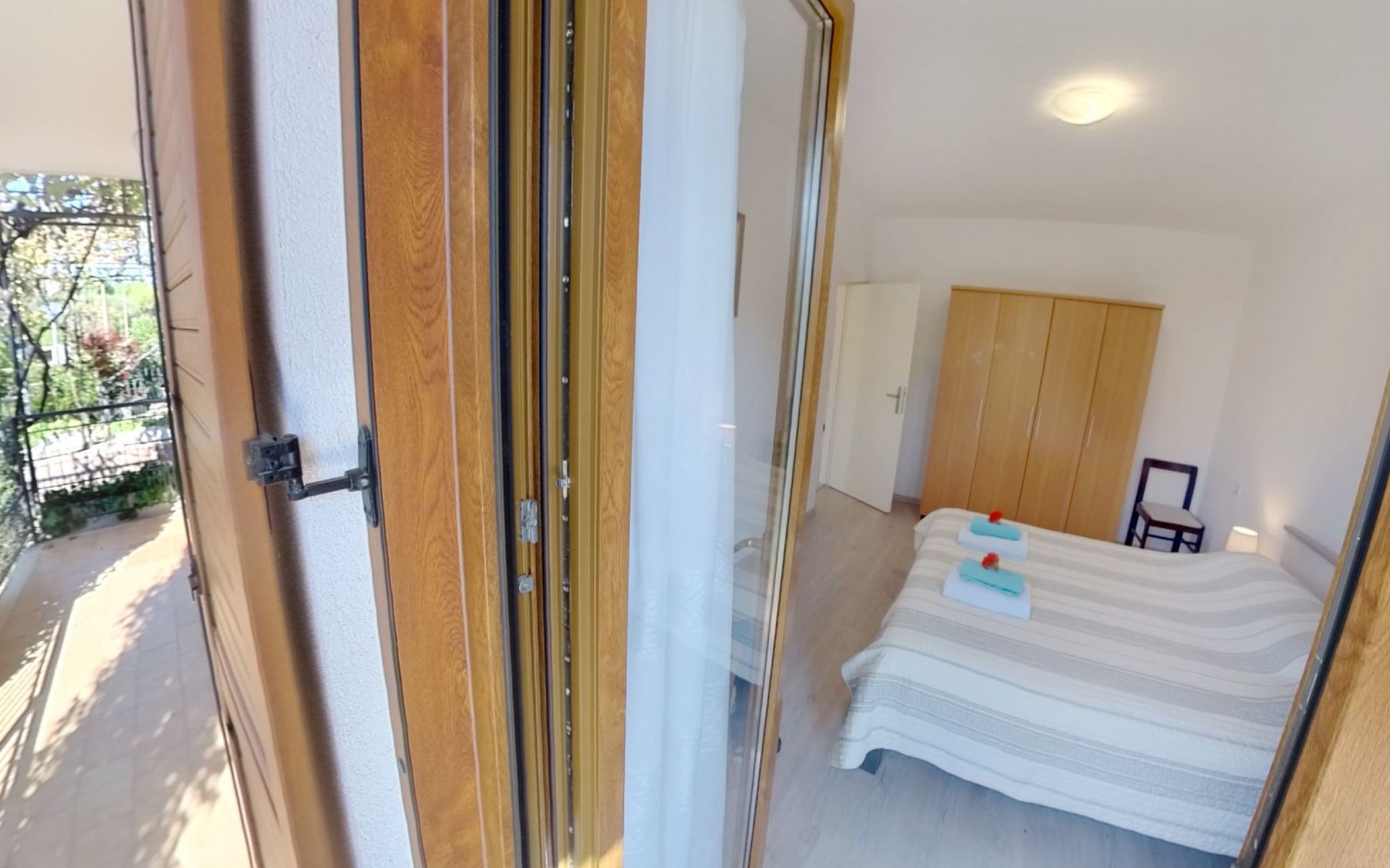 The simple, air-conditioned 55m2 apartment is located on the ground floor of a family house with garden, garden furniture and private entrance. The beach and the center of Umag are easily reachable on foot in a few minutes. The area is quiet and central. It has 2 bedrooms with double beds and a garden so it is ideal for two couples of friends, families or for those who want not to use the car during the holiday. The apartment consists of two bedrooms with double beds (160x200), bedside tables, night lamps, and wardrobes, exit to the terrace.Bed linen is provided (changed weekly).The bathroom with shower, toilet, bidet, sink with wardrobe and mirror, two towels per person are provided (changed weekly).The fully equipped eat-in kitchen with refrigerator with freezer area, oven, hob with 3 gas and one electric burner, extractor hood, kettle, coffee maker, dining table with 4 chairs, satellite TV and DVD, free Wi-Fi Internet connection, air conditioner.A utility room with a washing machine available.At the entrance, there is a terrace overlooking the garden furnished with a table, chairs, and umbrella.In the well-kept garden, the barbecue is for shared use with the owners of the house.Free parking near the house.The location is excellent for those who do not like to travel by car during the holiday due to the proximity to the beaches and the city center.The closest beach at 150m is sandy with concrete areas on the shore and a fast-food restaurant on the coast offering great menus and hammocks in the sea. . The rocky beach is called Africa is 300 meters from the apartment. Both beaches are easily reachable on foot in a few minutes.Attached to the Africa beach is a bar where you can enjoy a good coffee, cold drinks or fast food, as well as a volleyball court.The park with pine trees 200 m from the house, the city center, bakery, supermarket, bars, restaurants 300-400 m, all within easy walking distance. In the center of Umag, it is worth visiting the museum, the aquarium, the cathedral, or taking a walk along the famous Umag Dam and exploring the narrow and interesting streets of the historical center of Umag or visiting the stalls. There are various leisure facilities nearby: Tennis courts, the Adriatic Golf Club with 18 holes, horse riding, water sports, night clubs, adrenaline park, mini-golf course, fishing. It is also possible to go on various organized excursions by boat or bus. The area is full of renowned restaurants, simple restaurants, pizzerias, fast food restaurants, and bars. We recommend visiting the Istrian hinterland for days away from the beach or to spend the evenings. Very interesting is the artists' village of Grožnjan, Motovun, the typical medieval town on a hill, famous for the film festival held every year at the end of July. The village of Livade is very famous for its white truffles. For cave lovers, visit the Baredine Cave. Don't miss the opportunity to visit Hum, the smallest town in the world, only 60 km from Umag. Interesting are also the places on the coast such as NP Brijuni, Pula, Rovinj, and Poreč. Organize different fish picnic boat trips where you have the opportunity to visit Rovinj and Poreč or Novigrad. The day trip by hydrofoil to Venice. To visit the water park Istralandia 20 km from Umag to the delight of children and the Dinopark in Vrsar, there is guaranteed fun. For gourmets, various possibilities for tasting wines, cheeses, olive oil, typical Istrian ham, and much more. For organized excursions, we recommend the agency Trevitours.* Registration on the first day, to be paid on the spot on arrival. * Pets are allowed (only small ones, up to 10 kg) Additional costs, to be paid on site on arrival. * Guests are requested to use the equipment with care. * It is forbidden to smoke inside, but you can smoke on the terrace. * For damages caused, guests are asked to inform the owner or the agency that after a careful assessment of the damage, the cost of the damage will be charged on the spot.Short descriptionOther : Non-smoking houseShort description 1Number of kitchens : 1Bathroom 1Other bathroom equipment : Washing machineSurroundingNearby sports facilities : Basketball, Bike tours, Diving, Fishing, Football area, Golf course, Hunting facilities, Mountainbiking, Riding possibilities, Sailing, Sport center, Surfing, Tennis, Water skiingRental Facilities : Bicycle rental service, Boat rental service, car rentalGarden and outdoorGarden facilities : Garden furniture provided, GrillService benefitsService facilities (may incur additional costs) : Transfer service (airport etc)