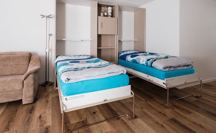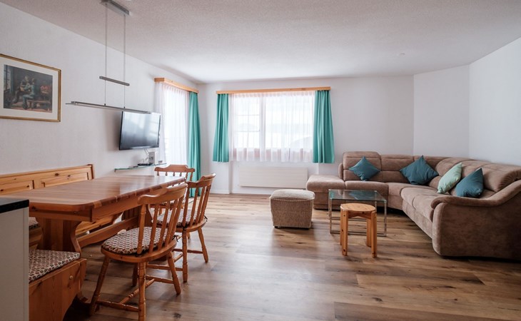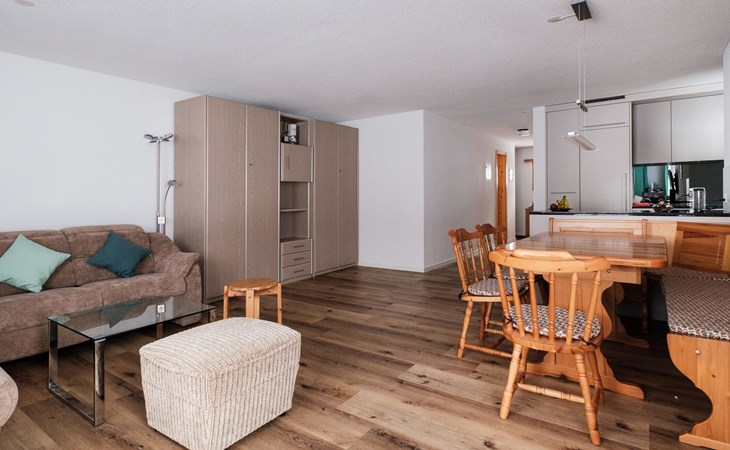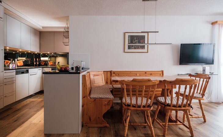The apartment was renovated in summer 2021. It is on the 1st floor. The apartment is equipped for 4 people. It has a living-/ dining room with a modern kitchen. 8-piece crockery and cutlery. 1 shower / toilet / sink and 1 bedroom on the same floor. In the living area there is a bed cabinet with 2 beds. TV / radio / WiFi available free of charge. Ski room in the basement; Washing machine / tumbler in the basement are only available by prior arrangement.