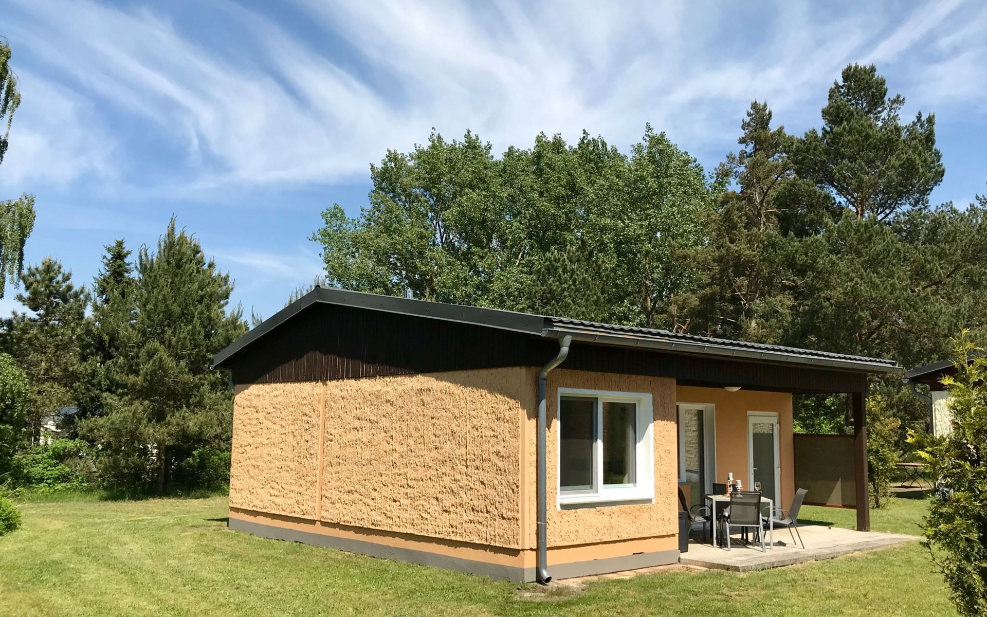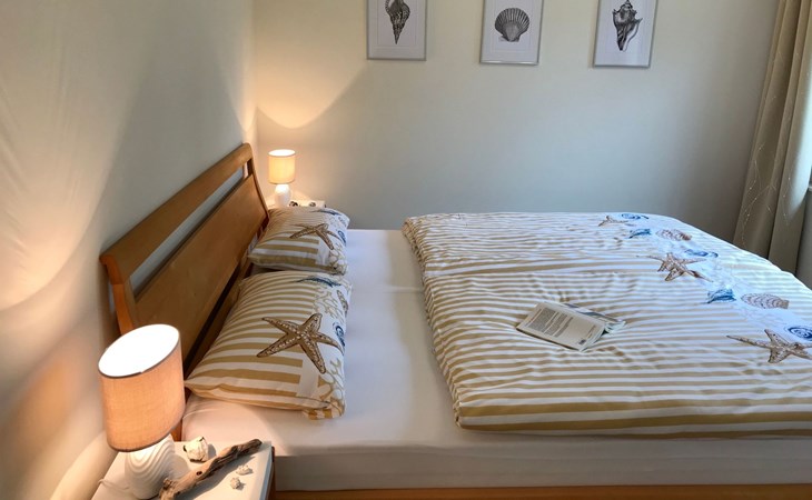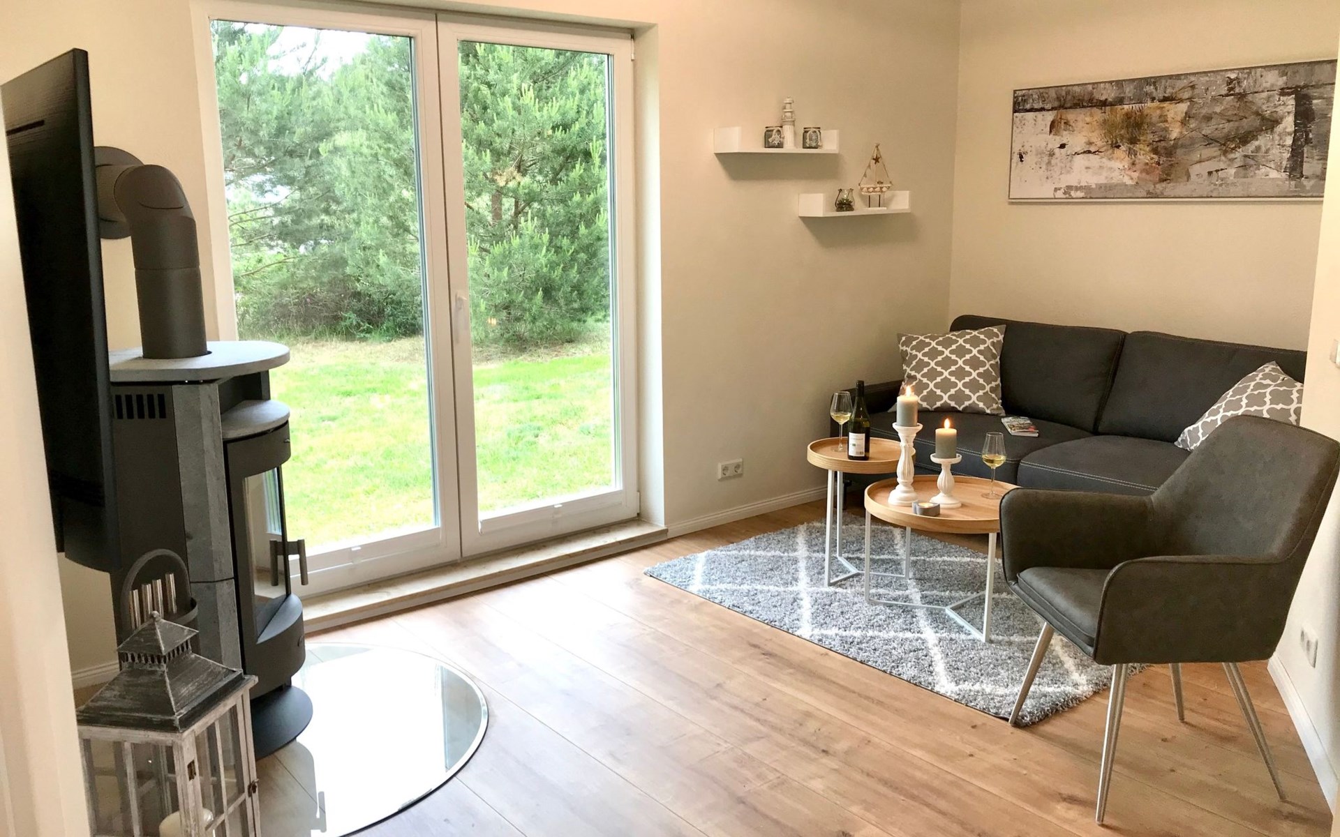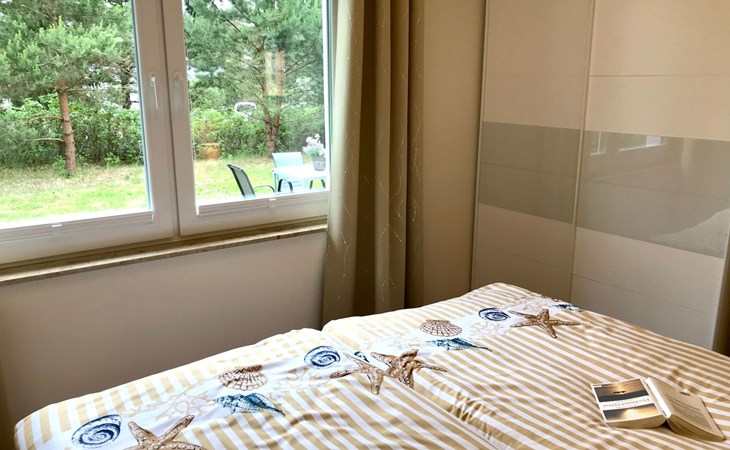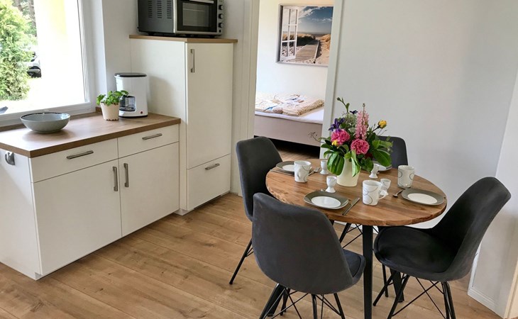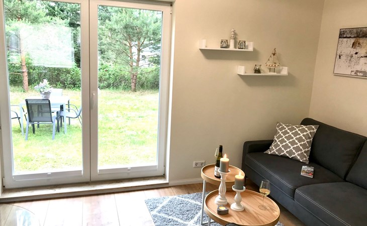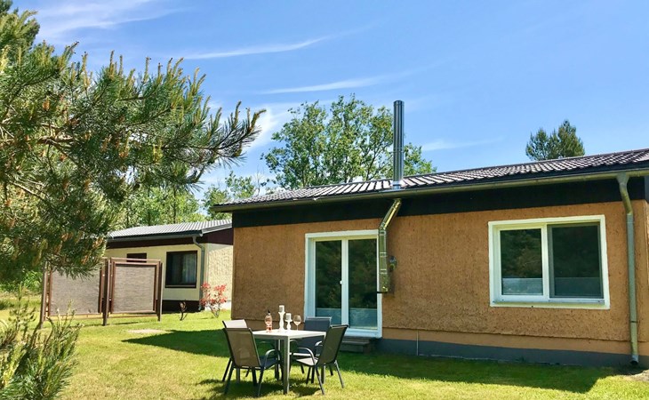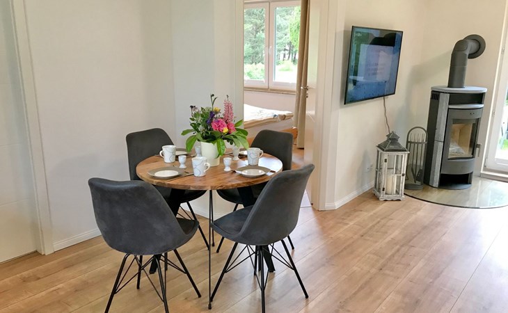 Very quiet and idyllically situated on the outskirts of Pruchten, the holiday home Wiesenblick 6 offers you an ideal holiday domicile on the large natural meadow property.The beautiful Baltic Sea beach, the Fischland-Darß peninsula with its unique natural landscape and the Vorpommersche Boddenlandschaft National Park are perfect for holidaymakers of all ages and are only a few minutes' drive away.Relax and unwind away from the hustle and bustle of the coastal resorts and still enjoy the proximity to beautiful Baltic Sea beaches and many sights.Our holiday home Wiesenblick 6 awaits you modern and comfortable with a wood-burning stove, infrared heating and free internet access (WLAN).On a living area of approx. 60 m², you will find a living and dining room with a wood-burning stove, infrared heating, couch & armchair, 50" flat-screen TV and a dining table for 4 people in this holiday home. The large windows offer a marvellous view of the surrounding natural garden.In the open and well-equipped kitchen with dishwasher, ceramic hob, oven, fridge with freezer compartment, etc., cooking with the whole family is great fun. For a restful night's sleep on the quiet property, there is a large double bed (180x200) and a spacious wardrobe in the first bedroom. In the second bedroom, you can choose between two single beds (90x200).The bright and friendly bathroom is equipped with a shower, WC and washbasin to ensure your well-being.We offer you a covered terrace and a seating area on the lawn with seating for 4 people, two sun loungers and a charcoal barbecue.Bicycles that you have brought or borrowed can be stored separately (the very well-developed cycle path network invites you to go on extended cycle tours).You can park your car right next to the holiday home.Please note that the holiday home is accessible via an unpaved path (approx. 250m).The bathing area at Bodstedter Bodden is only approx. 800m away. You can reach the fine sandy Baltic Sea beach via the cycle path, as well as by car or bus in approx. 9km.A small shopping centre is approx. 400m away and many supermarkets and shops can be found in the Vineta town of Barth (5.5km). In the resort of Pruchten there is also a bakery, a delicious ice cream stand on the village street, as well as a bicycle hire and a boat hire in the small harbour.For water sports enthusiasts, there are opportunities for kitesurfing and stand-up paddleboarding. The local kite club offers the appropriate equipment and courses.Historic Hanseatic cities such as Rostock (50km) and Stralsund (37km) are within easy reach. They offer numerous sights and a wide range of entertainment options.Or let yourself be whisked away on a journey through time and take a tour of the Bodden on an authentic Mississippi steamer.The Vineta town of Barth awaits your visit with its shops, small museums and beautiful harbour. There is also plenty for children to discover in the surrounding area.Karls Erlebnishof in Rövershagen or the bird park in Marlow will make every child's heart beat faster. In spring and autumn, you can experience a special kind of natural spectacle here when cranes fly to their resting places in the immediate vicinity.Watch the "bird of happiness" and enjoy the special beauty of our nature!