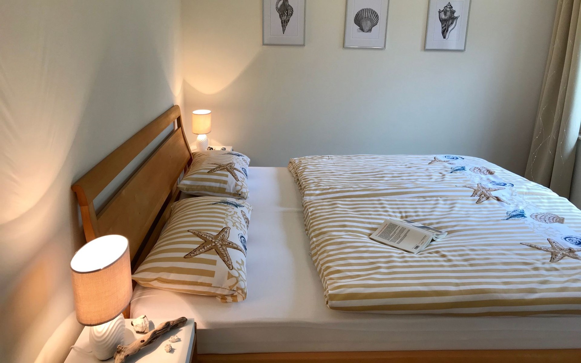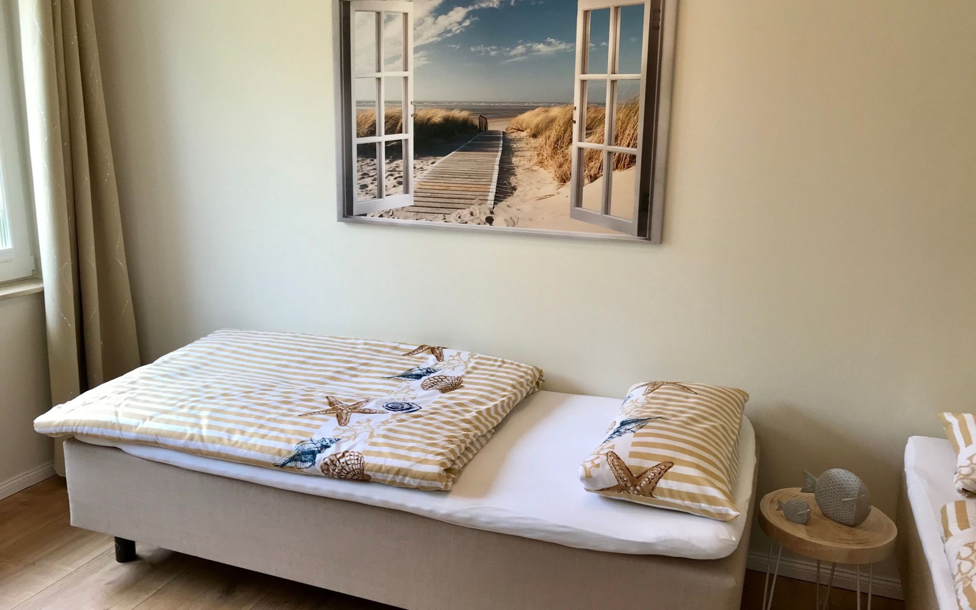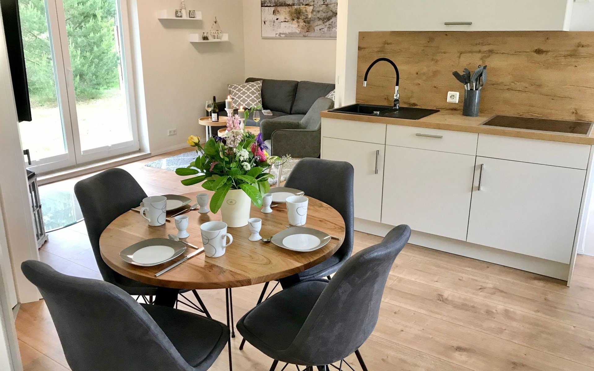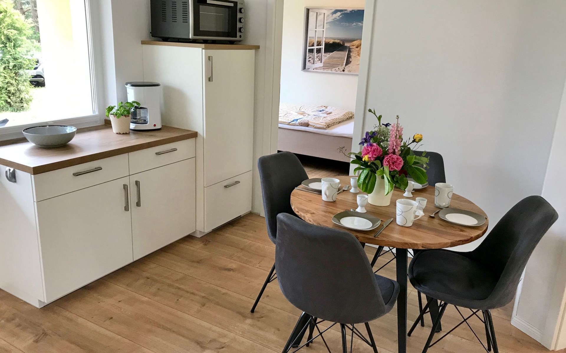 Very quiet and idyllically situated on the outskirts of Pruchten, the holiday home Wiesenblick 6 offers you an ideal holiday domicile on the large natural meadow property.The beautiful Baltic Sea beach, the Fischland-Darß peninsula with its unique natural landscape and the Vorpommersche Boddenlandschaft National Park are perfect for holidaymakers of all ages and are only a few minutes' drive away.Relax and unwind away from the hustle and bustle of the coastal resorts and still enjoy the proximity to beautiful Baltic Sea beaches and many sights.Our holiday home Wiesenblick 6 awaits you modern and comfortable with a wood-burning stove, infrared heating and free internet access (WLAN).On a living area of approx. 60 m², you will find a living and dining room with a wood-burning stove, infrared heating, couch & armchair, 50" flat-screen TV and a dining table for 4 people in this holiday home. The large windows offer a marvellous view of the surrounding natural garden.In the open and well-equipped kitchen with dishwasher, ceramic hob, oven, fridge with freezer compartment, etc., cooking with the whole family is great fun. For a restful night's sleep on the quiet property, there is a large double bed (180x200) and a spacious wardrobe in the first bedroom. In the second bedroom, you can choose between two single beds (90x200).The bright and friendly bathroom is equipped with a shower, WC and washbasin to ensure your well-being.We offer you a covered terrace and a seating area on the lawn with seating for 4 people, two sun loungers and a charcoal barbecue.Bicycles that you have brought or borrowed can be stored separately (the very well-developed cycle path network invites you to go on extended cycle tours).You can park your car right next to the holiday home.Please note that the holiday home is accessible via an unpaved path (approx. 250m).The bathing area at Bodstedter Bodden is only approx. 800m away. You can reach the fine sandy Baltic Sea beach via the cycle path, as well as by car or bus in approx. 9km.A small shopping centre is approx. 400m away and many supermarkets and shops can be found in the Vineta town of Barth (5.5km). In the resort of Pruchten there is also a bakery, a delicious ice cream stand on the village street, as well as a bicycle hire and a boat hire in the small harbour.For water sports enthusiasts, there are opportunities for kitesurfing and stand-up paddleboarding. The local kite club offers the appropriate equipment and courses.Historic Hanseatic cities such as Rostock (50km) and Stralsund (37km) are within easy reach. They offer numerous sights and a wide range of entertainment options.Or let yourself be whisked away on a journey through time and take a tour of the Bodden on an authentic Mississippi steamer.The Vineta town of Barth awaits your visit with its shops, small museums and beautiful harbour. There is also plenty for children to discover in the surrounding area.Karls Erlebnishof in Rövershagen or the bird park in Marlow will make every child's heart beat faster. In spring and autumn, you can experience a special kind of natural spectacle here when cranes fly to their resting places in the immediate vicinity.Watch the "bird of happiness" and enjoy the special beauty of our nature!