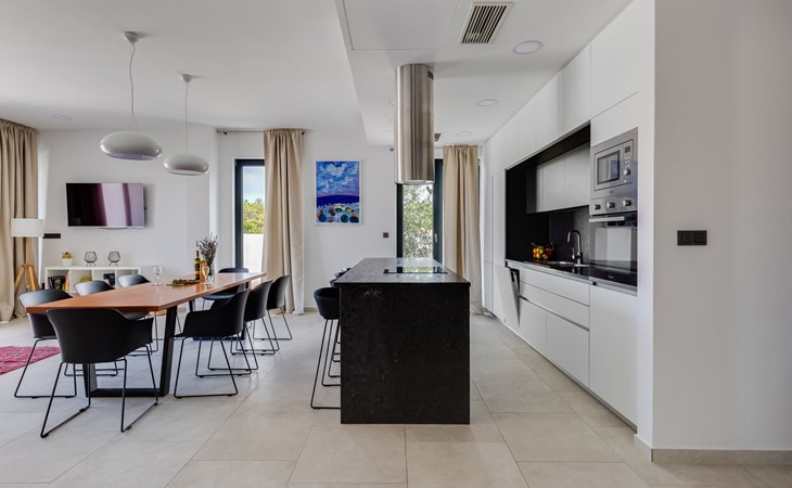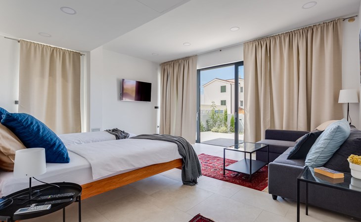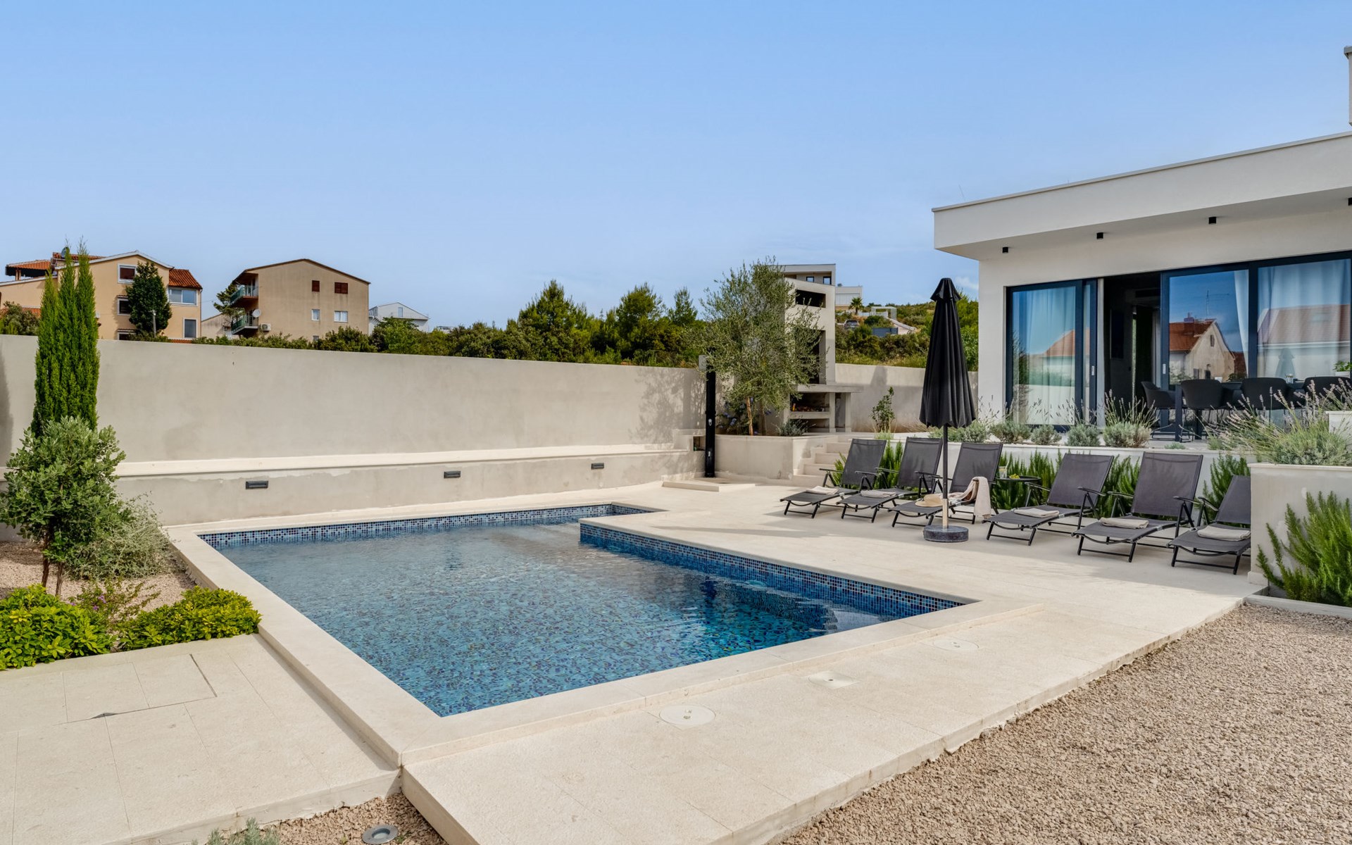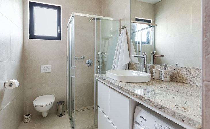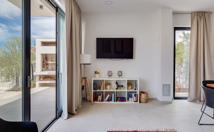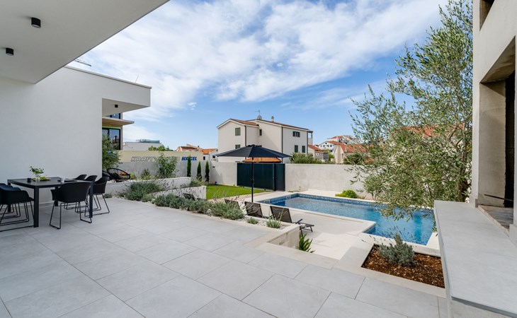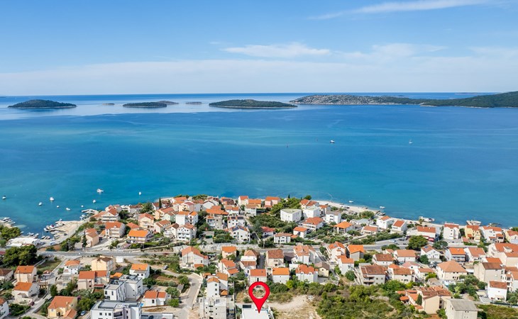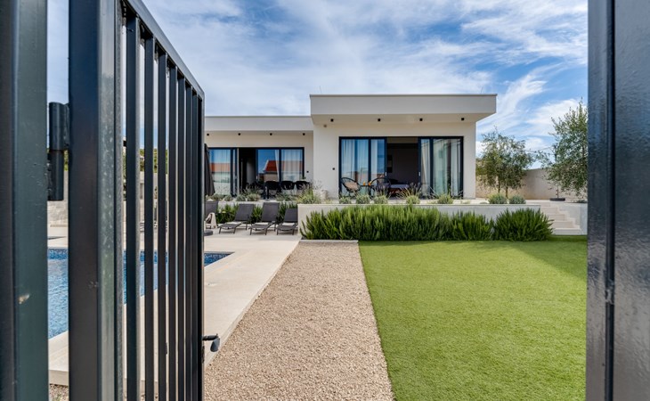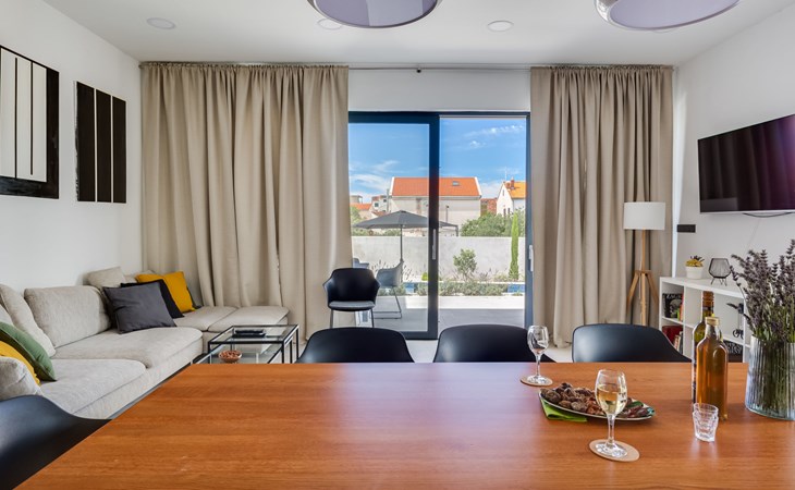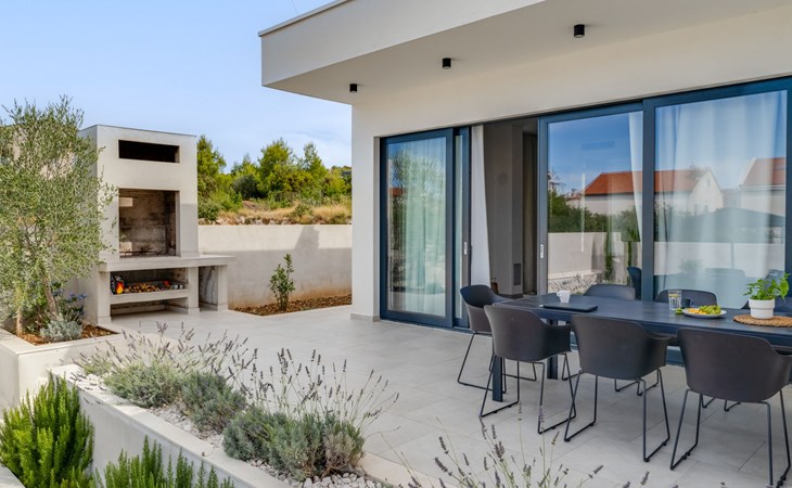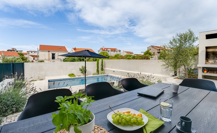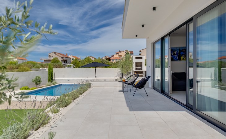 Moderne, mooi villa "Inizio". Zonnige ligging, 250 m van zee, 250 m van het strand. Voor alleengebruik: terrein 700 m2, openluchtzwembad hoekig (7 x 3 m, 27 m2, 150 cm diepte, seizoensgebonden beschikbaarheid: 15.Mei. - 15.Okt.) met trap. Buitendouche, barbecue. In het huis: internetaansluiting, wasmachine. Toegangsweg tot aan het huis (50 m onverharde weg). Parkeerplaats (voor 3 auto's) bij het huis op het terrein. Winkel 250 m, restaurant 260 m, bushalte 550 m, kiezelstrand 250 m, strandbad 900 m. Jachthaven 4 km. Attracties in de buurt: Aquapark 2 km, NP Krka 17 km.