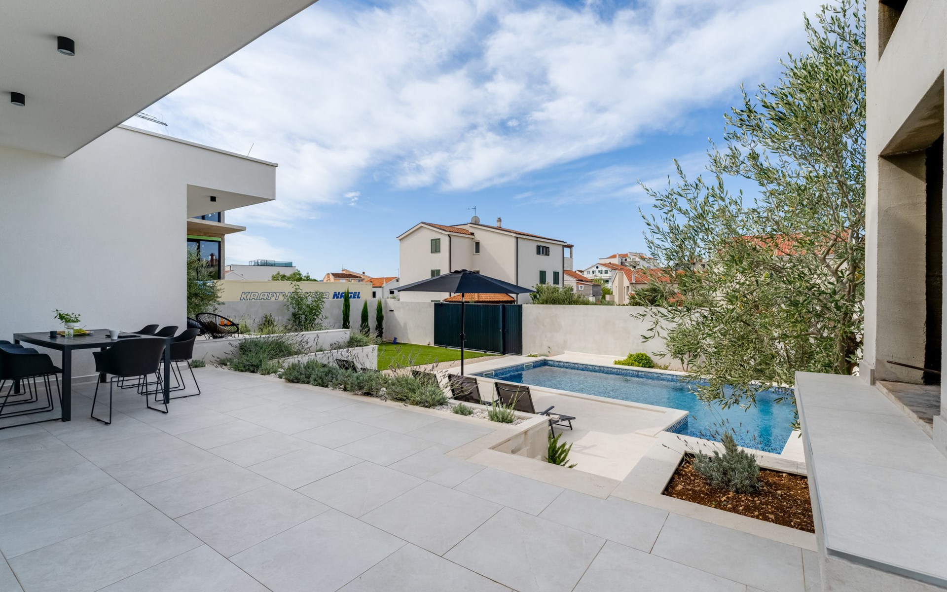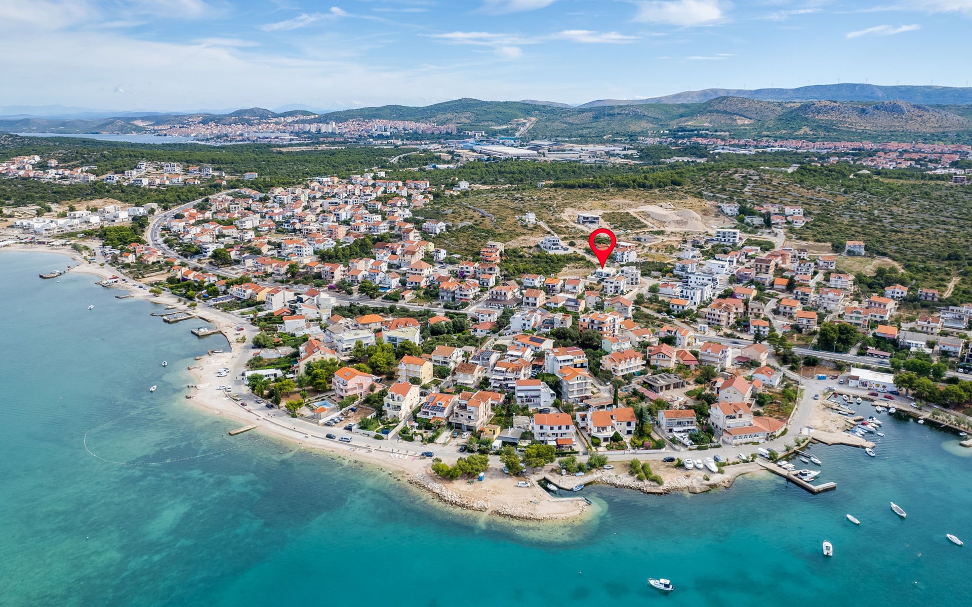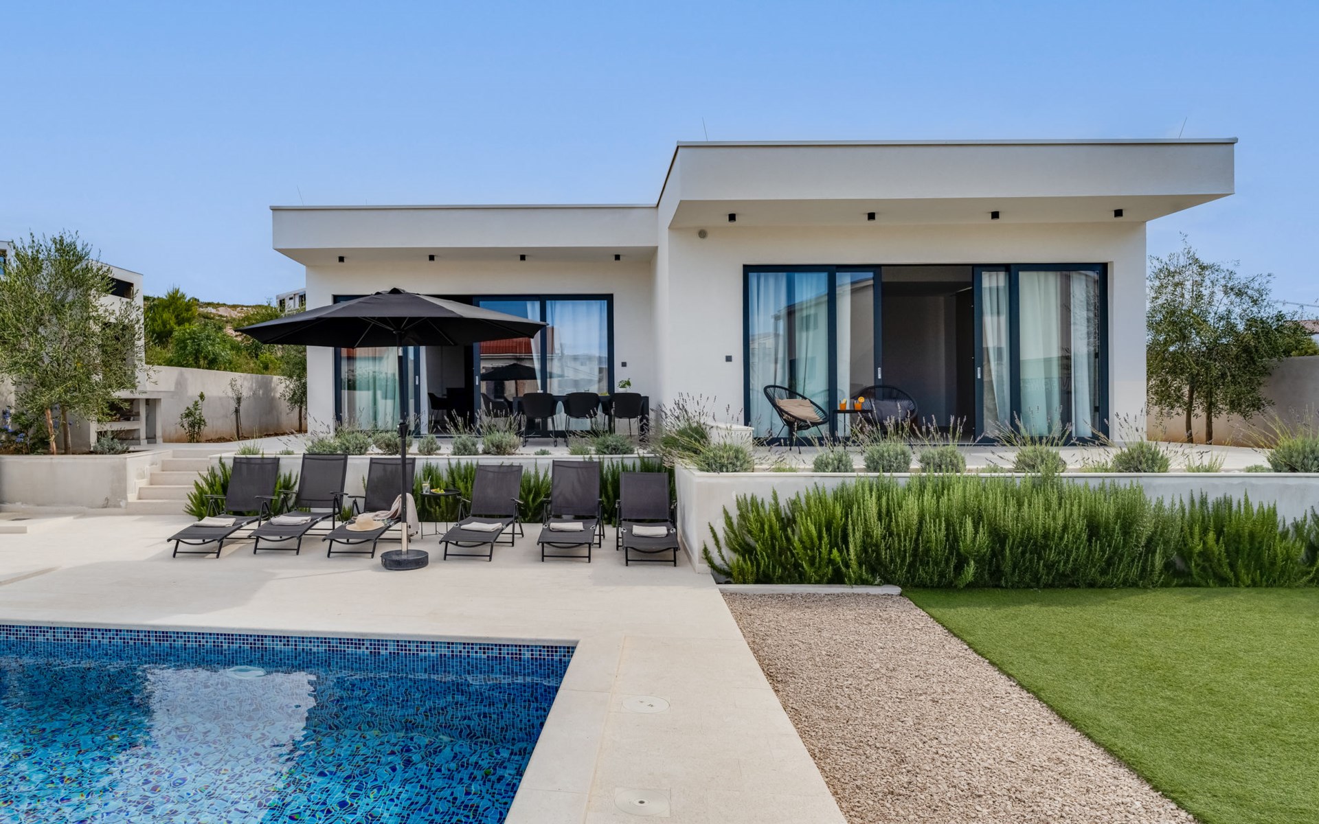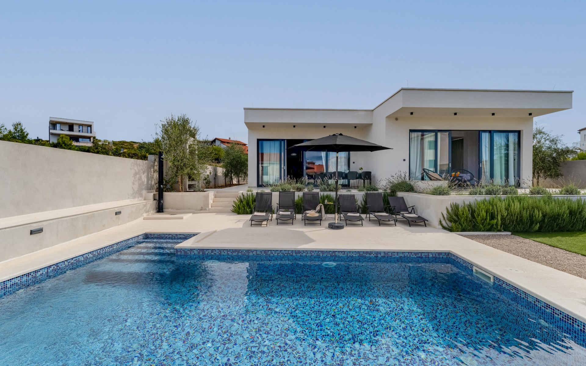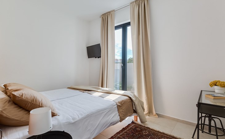 Moderne, mooi villa "Inizio". Zonnige ligging, 250 m van zee, 250 m van het strand. Voor alleengebruik: terrein 700 m2, openluchtzwembad hoekig (7 x 3 m, 27 m2, 150 cm diepte, seizoensgebonden beschikbaarheid: 15.Mei. - 15.Okt.) met trap. Buitendouche, barbecue. In het huis: internetaansluiting, wasmachine. Toegangsweg tot aan het huis (50 m onverharde weg). Parkeerplaats (voor 3 auto's) bij het huis op het terrein. Winkel 250 m, restaurant 260 m, bushalte 550 m, kiezelstrand 250 m, strandbad 900 m. Jachthaven 4 km. Attracties in de buurt: Aquapark 2 km, NP Krka 17 km.