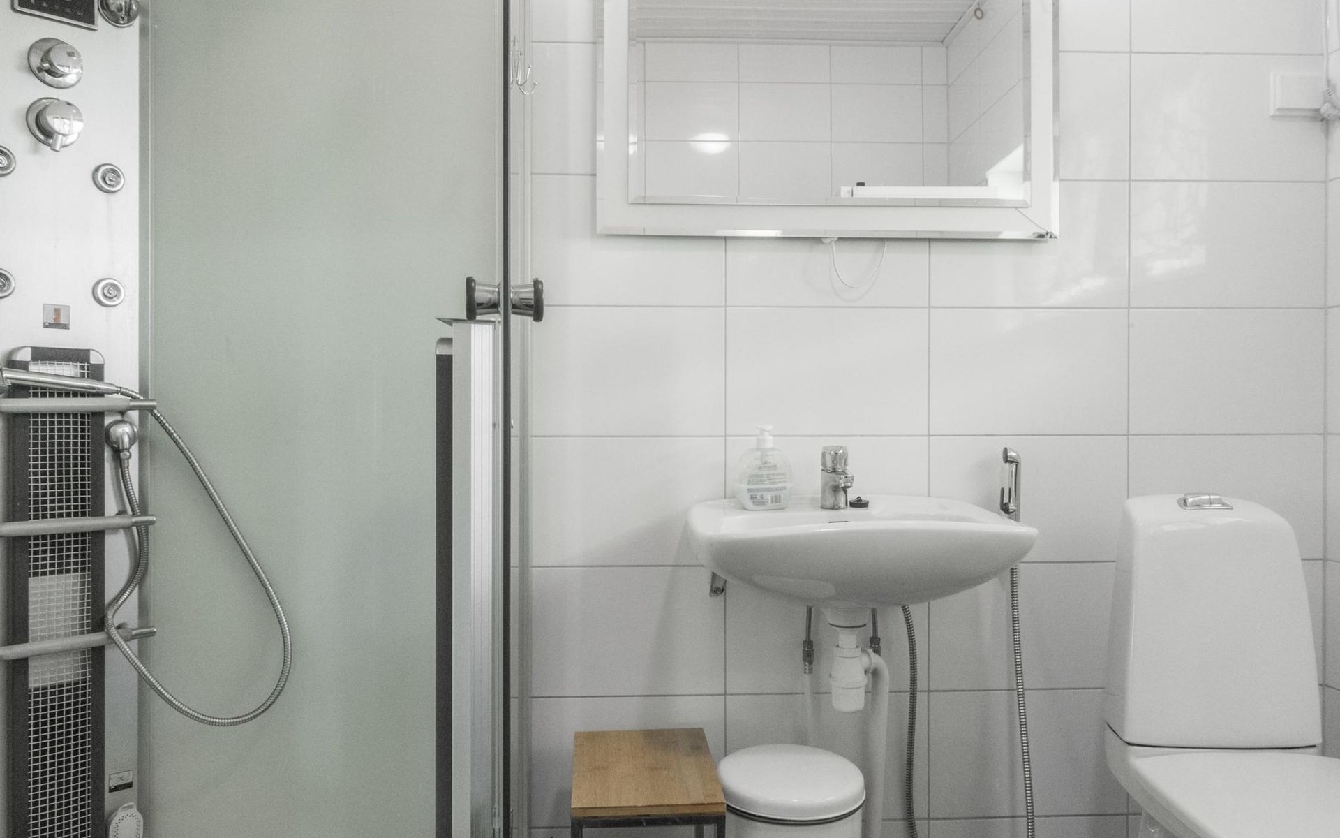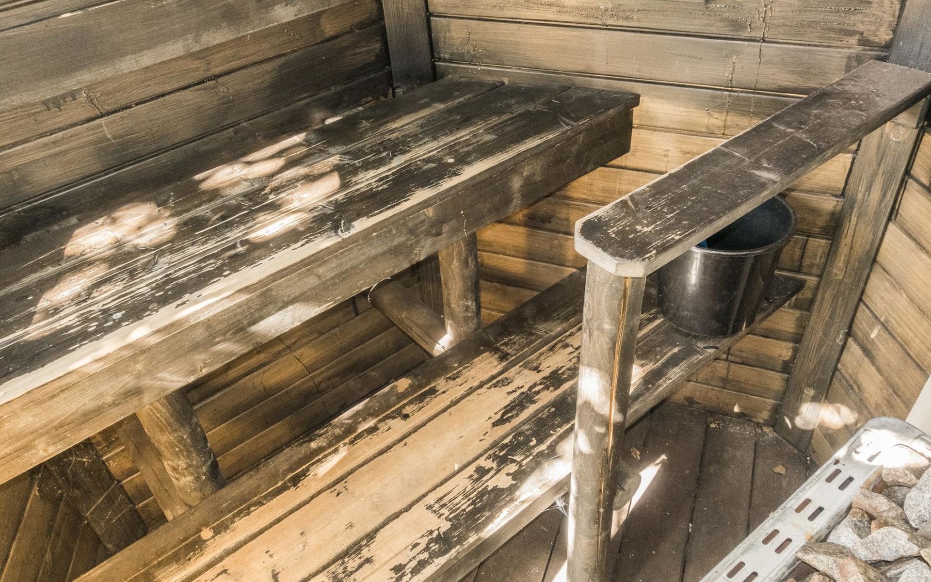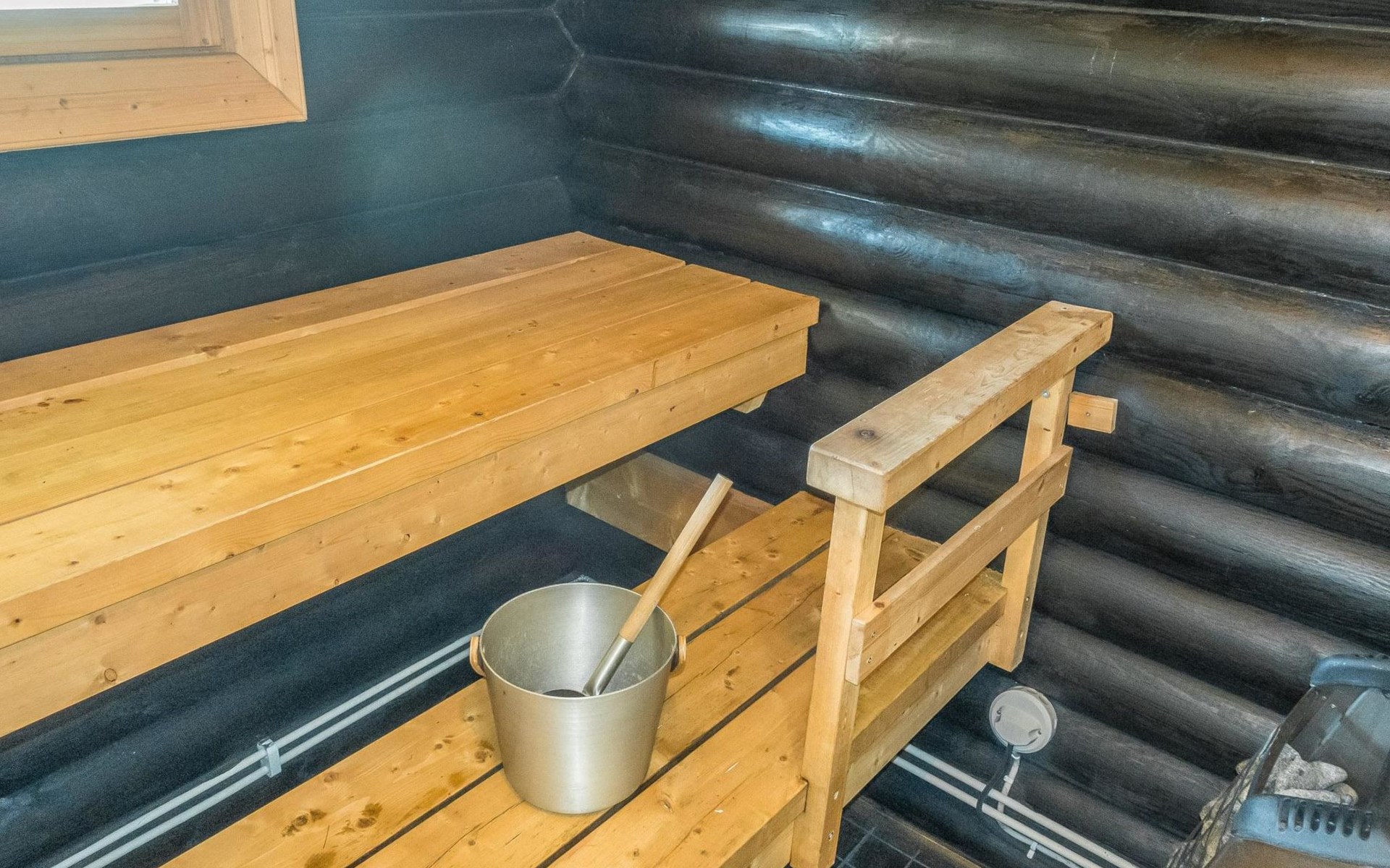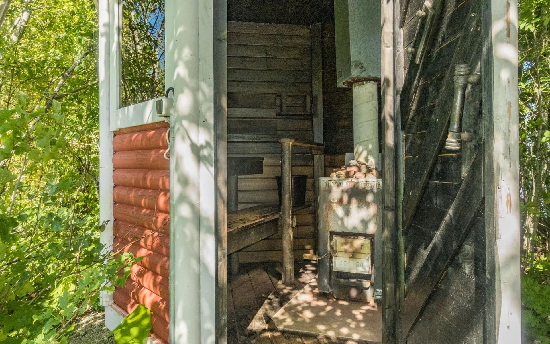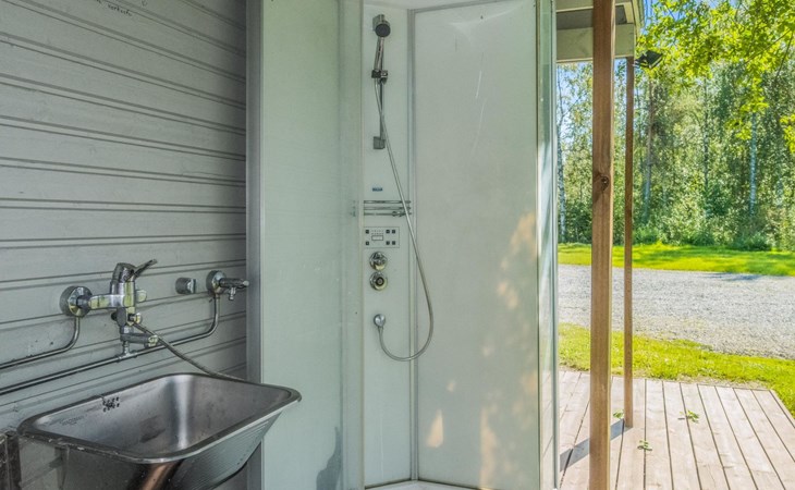Separate wooden heated sauna (traditional, small), next to the summer kitchen / barbeque area (red small building). Hot water form the summer kitchen (boiler 60 l) in summer time. This sauna can be heated also in winter time, but water has to be heated in water tank (or You can have a shower in the main building).