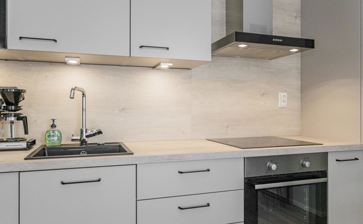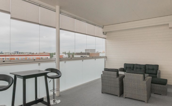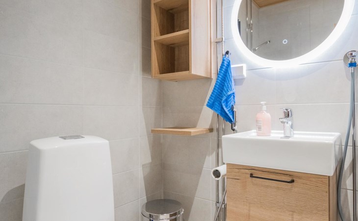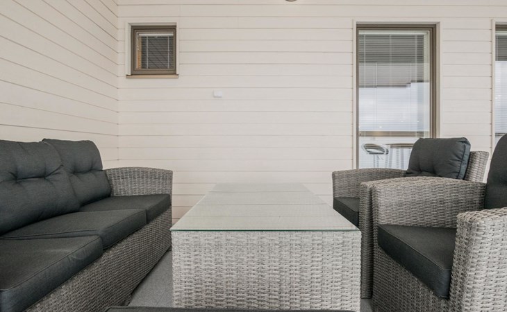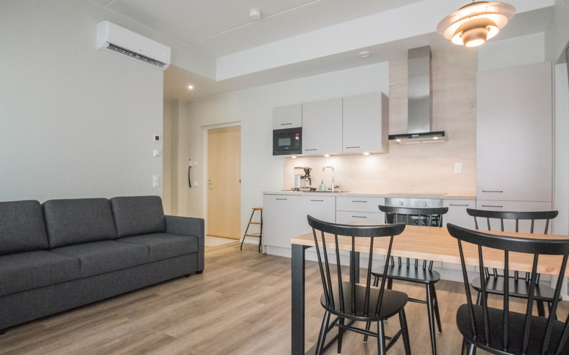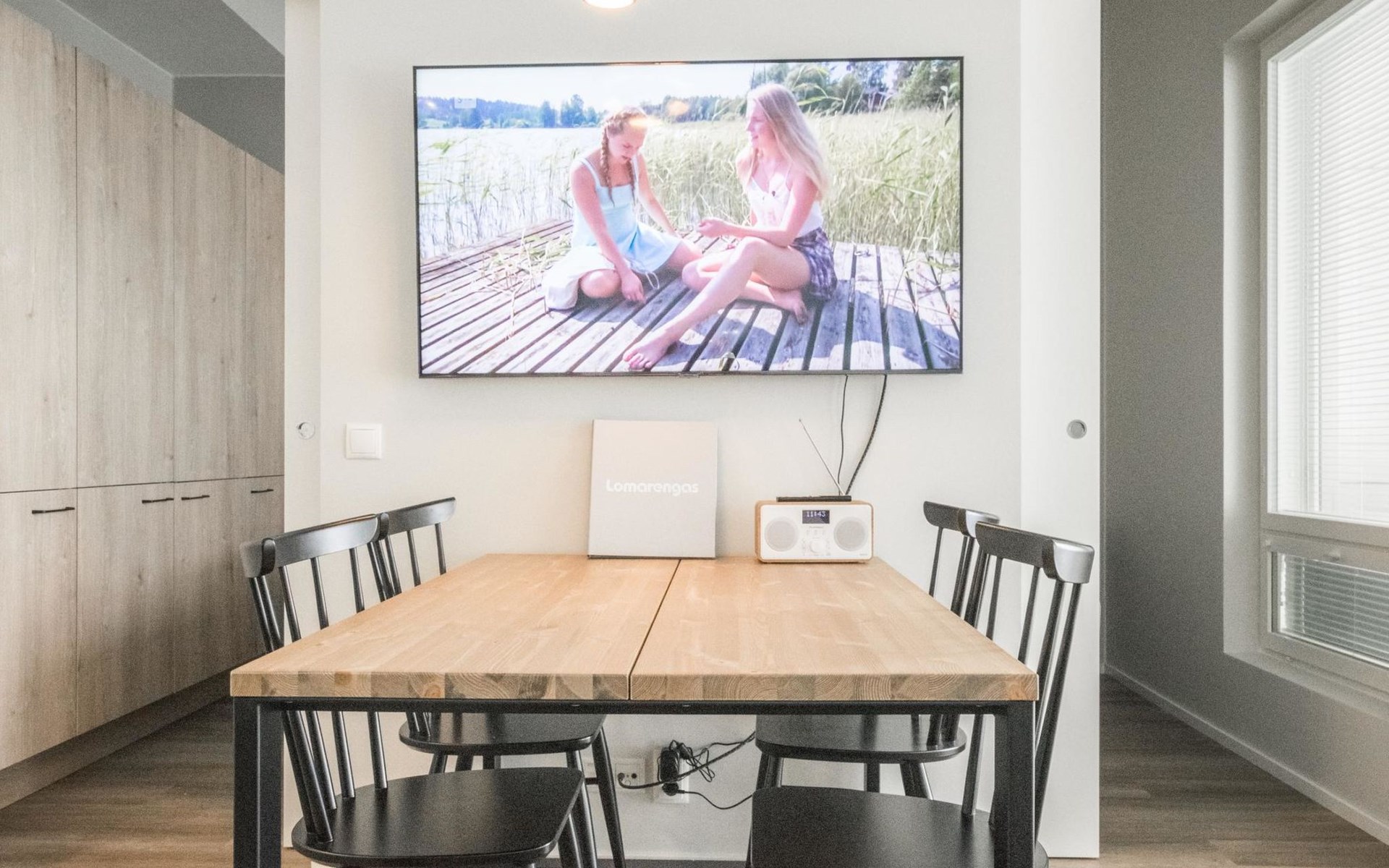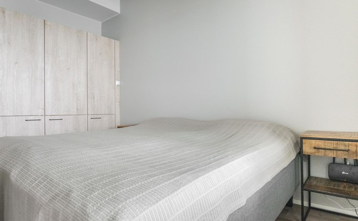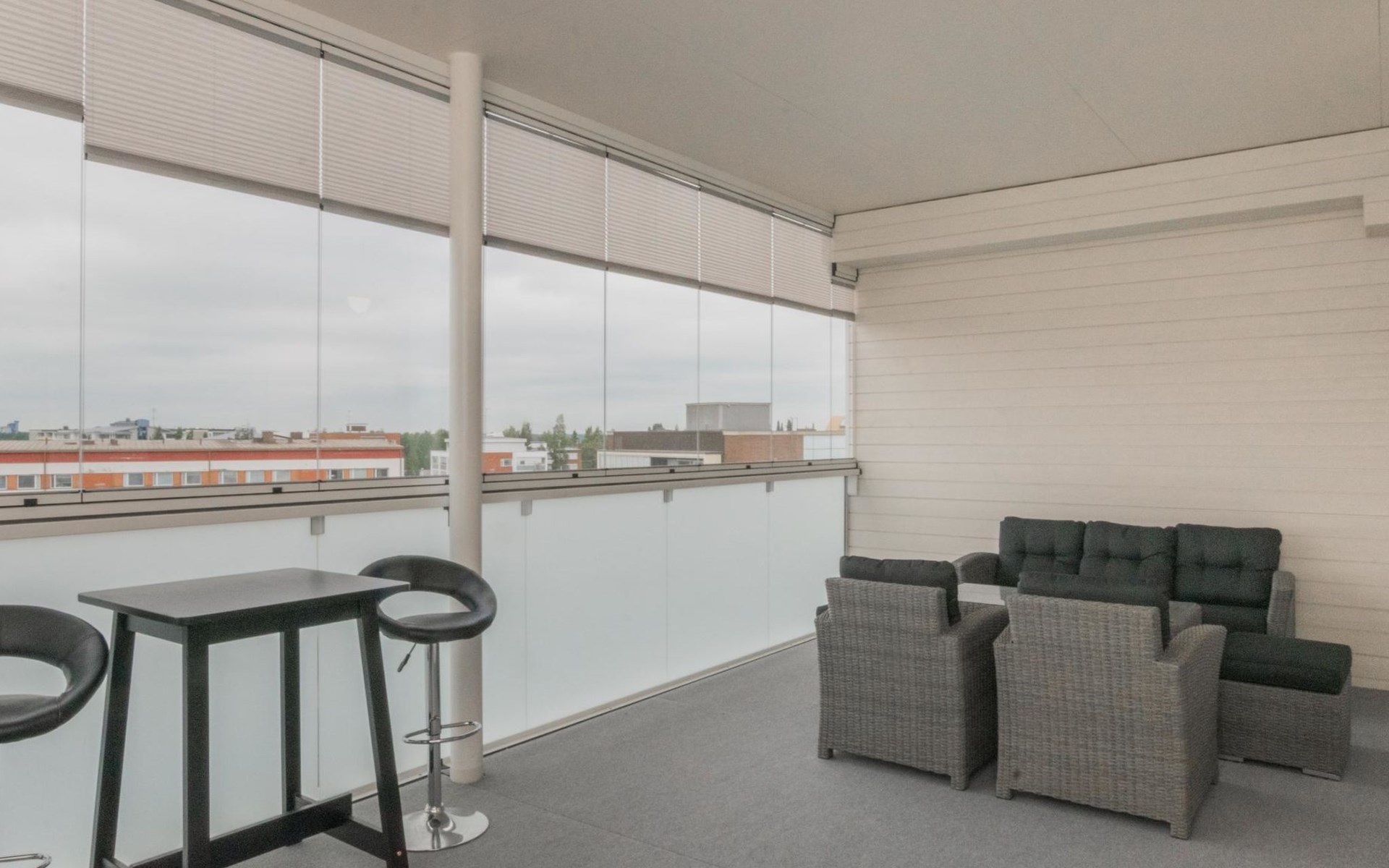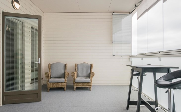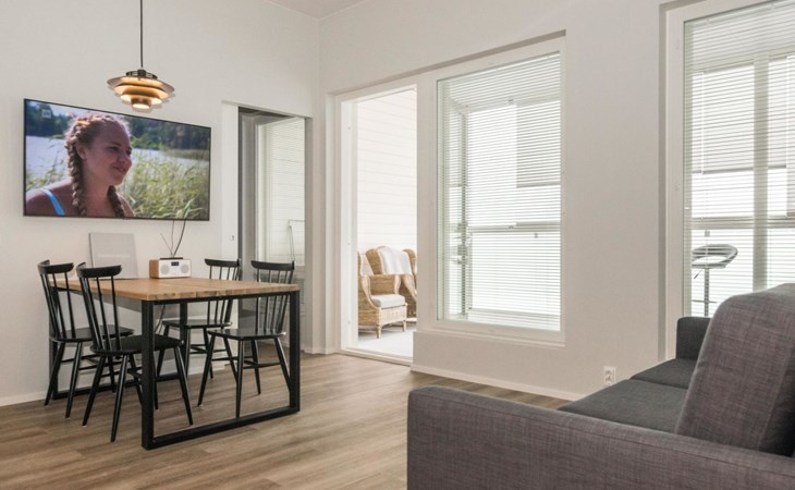 Dagmarin Kulma was built in 2023. It features a living room/kitchen, a living area with a sofa bed (140x190cm for two), and a sleeping alcove with a double bed. There is also an electric sauna, bathroom with shower, WC, washing machine, and a dryer. The spacious glazed balcony has a sofa set for relaxation. The building's inner courtyard offers a parking space with the option for car heating or electric car charging.