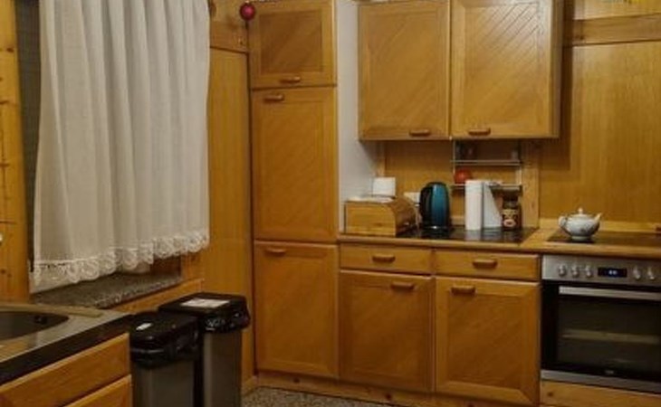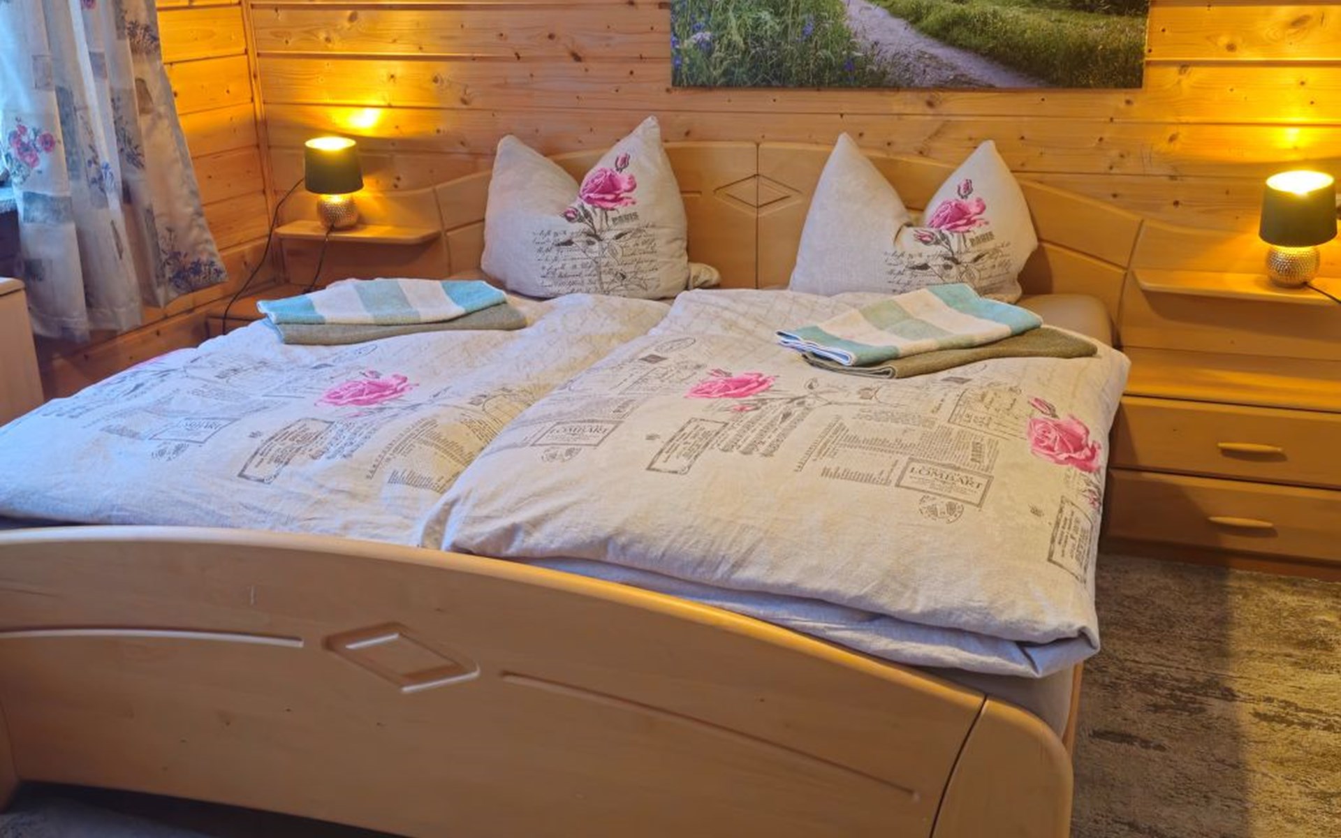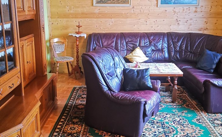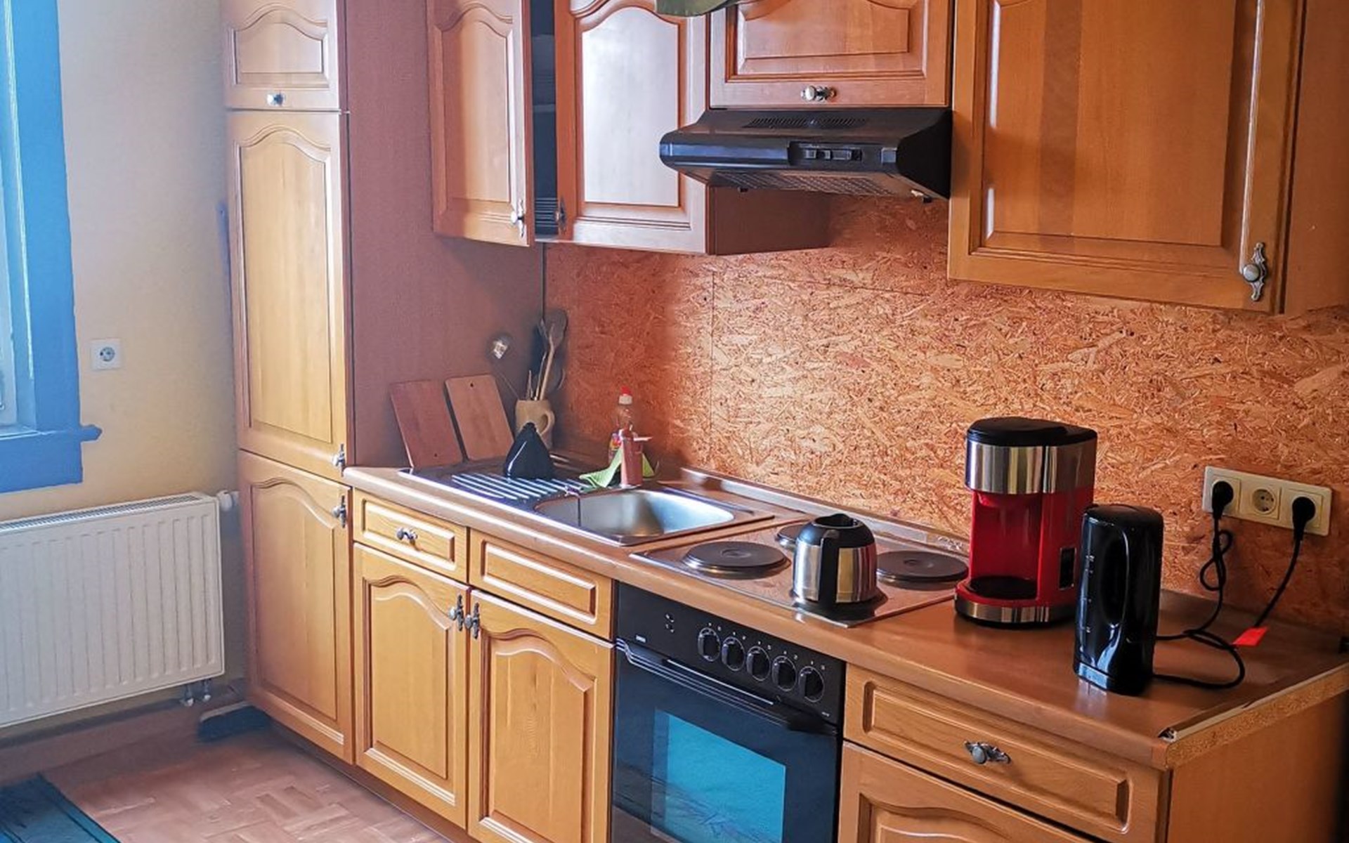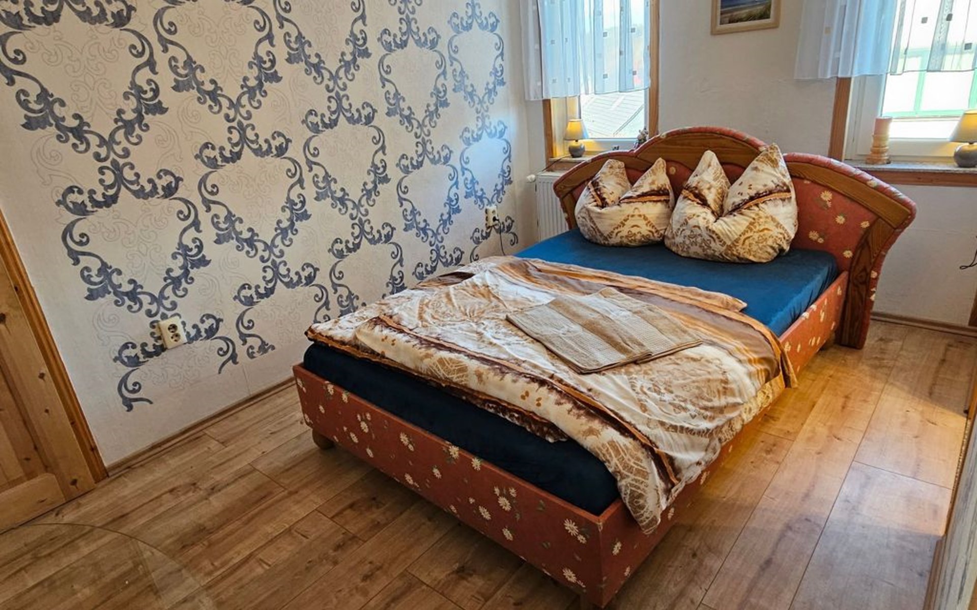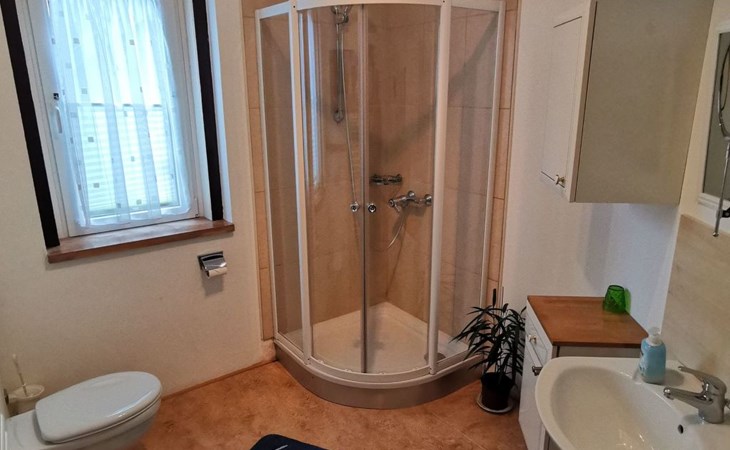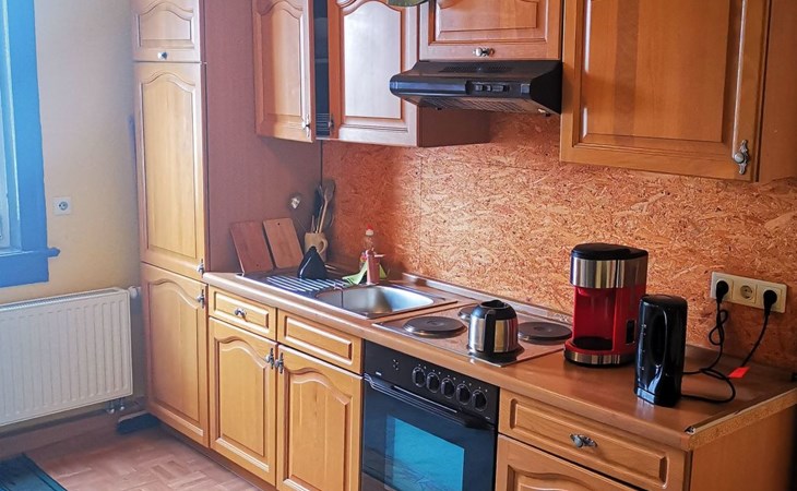 The flat on the upper floor is romantically furnished and offers you every comfort for a relaxing stay. A cosy living room with cable TV and stereo system is at your disposal. The well-equipped eat-in kitchen with cooker, microwave, coffee machine, kettle and fridge invites you to enjoy meals together. The bathroom is equipped with a separate shower, WC and a large washbasin and offers cosy warmth at all times thanks to the central heating. For ultimate relaxation, the house also features a private Finnish sauna. The comfortable bedrooms with one double bed measuring 2m x 2m and two double beds measuring 1.8m x 2m ensure a good night's sleep.