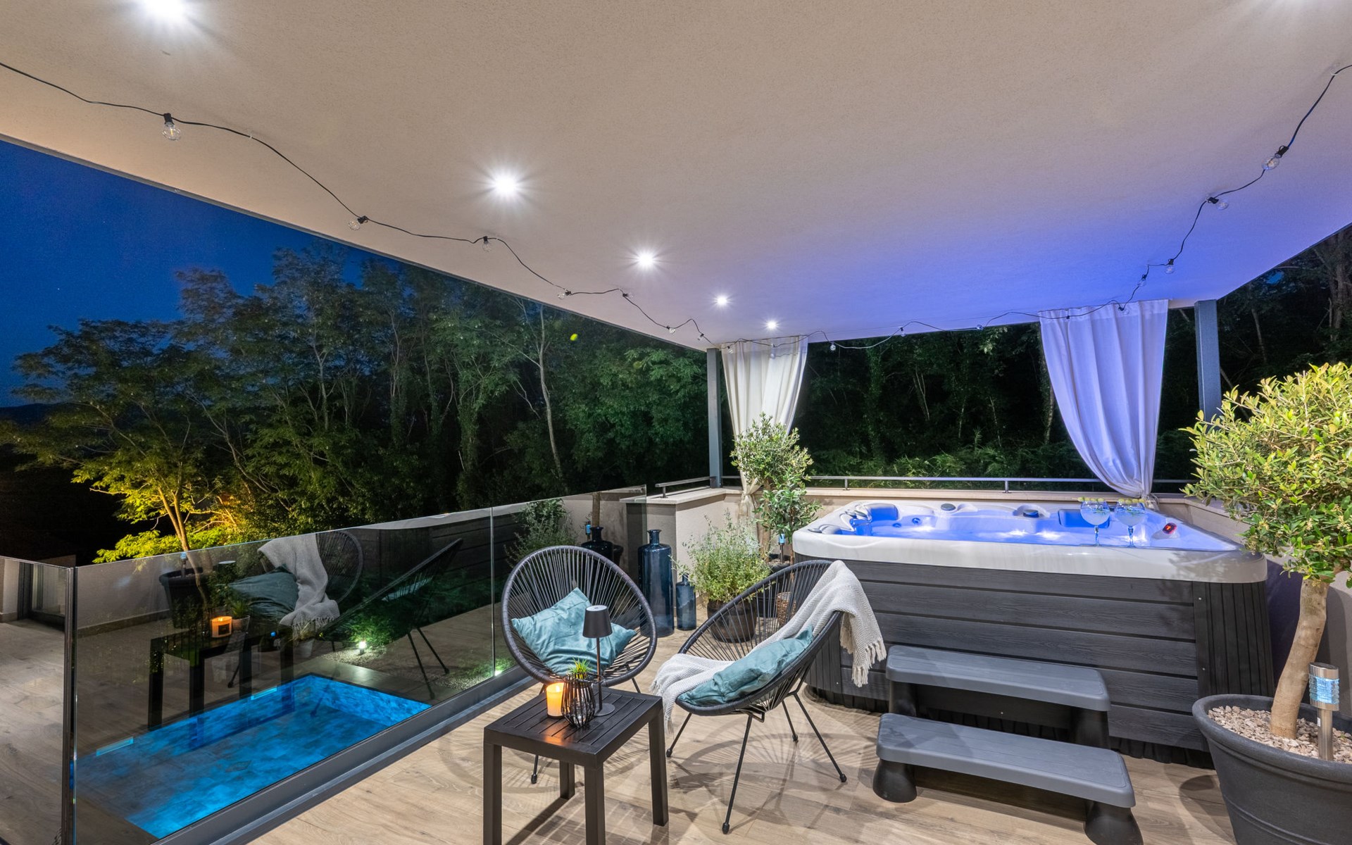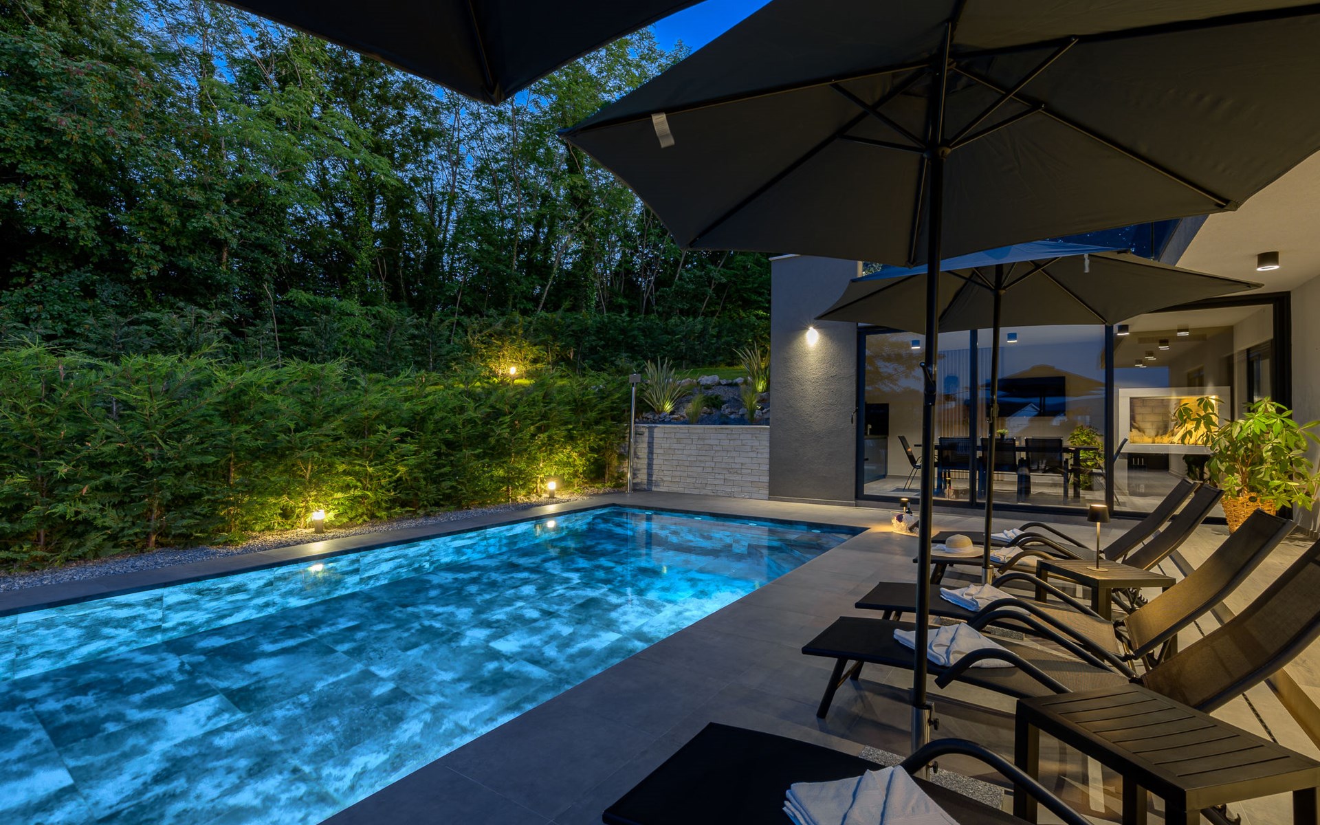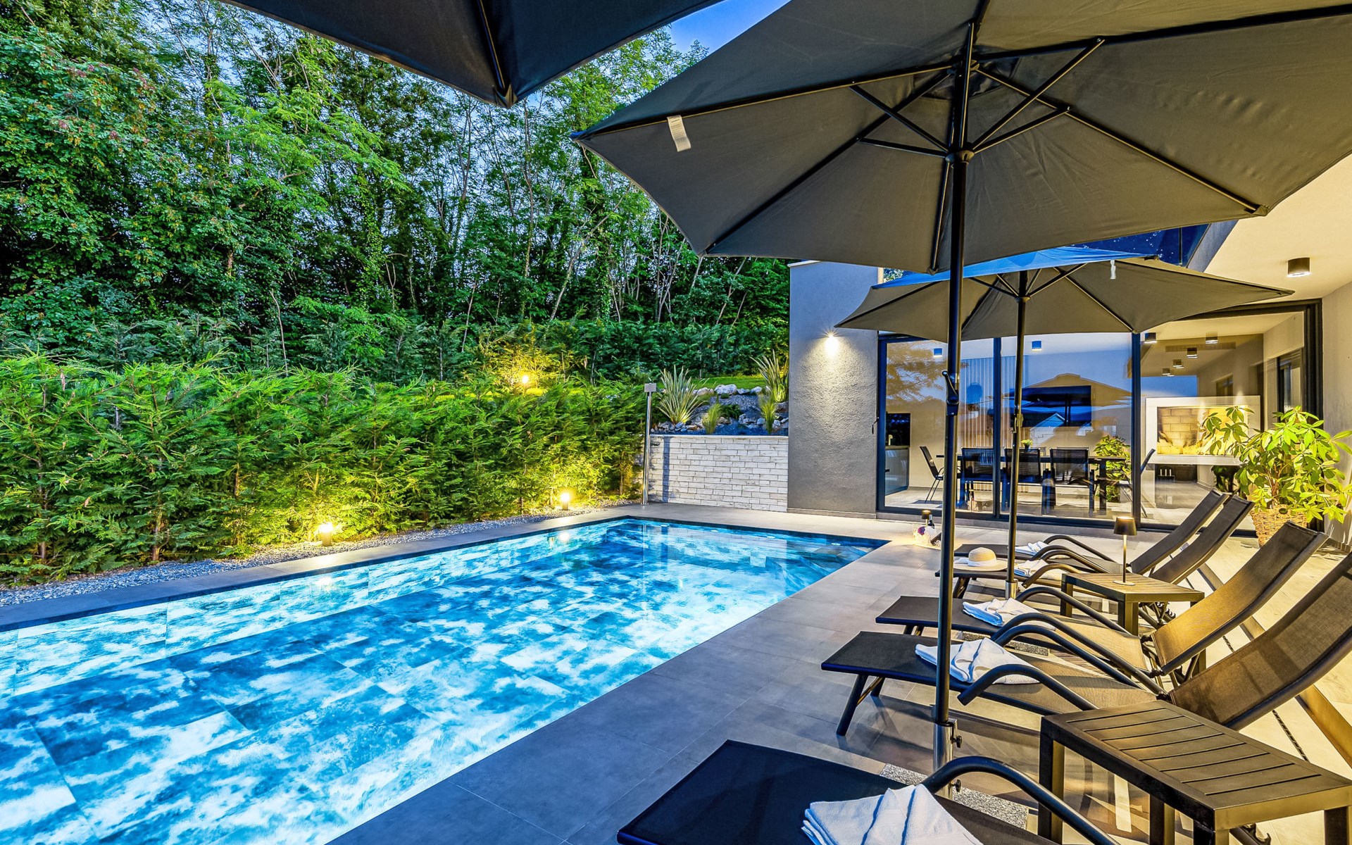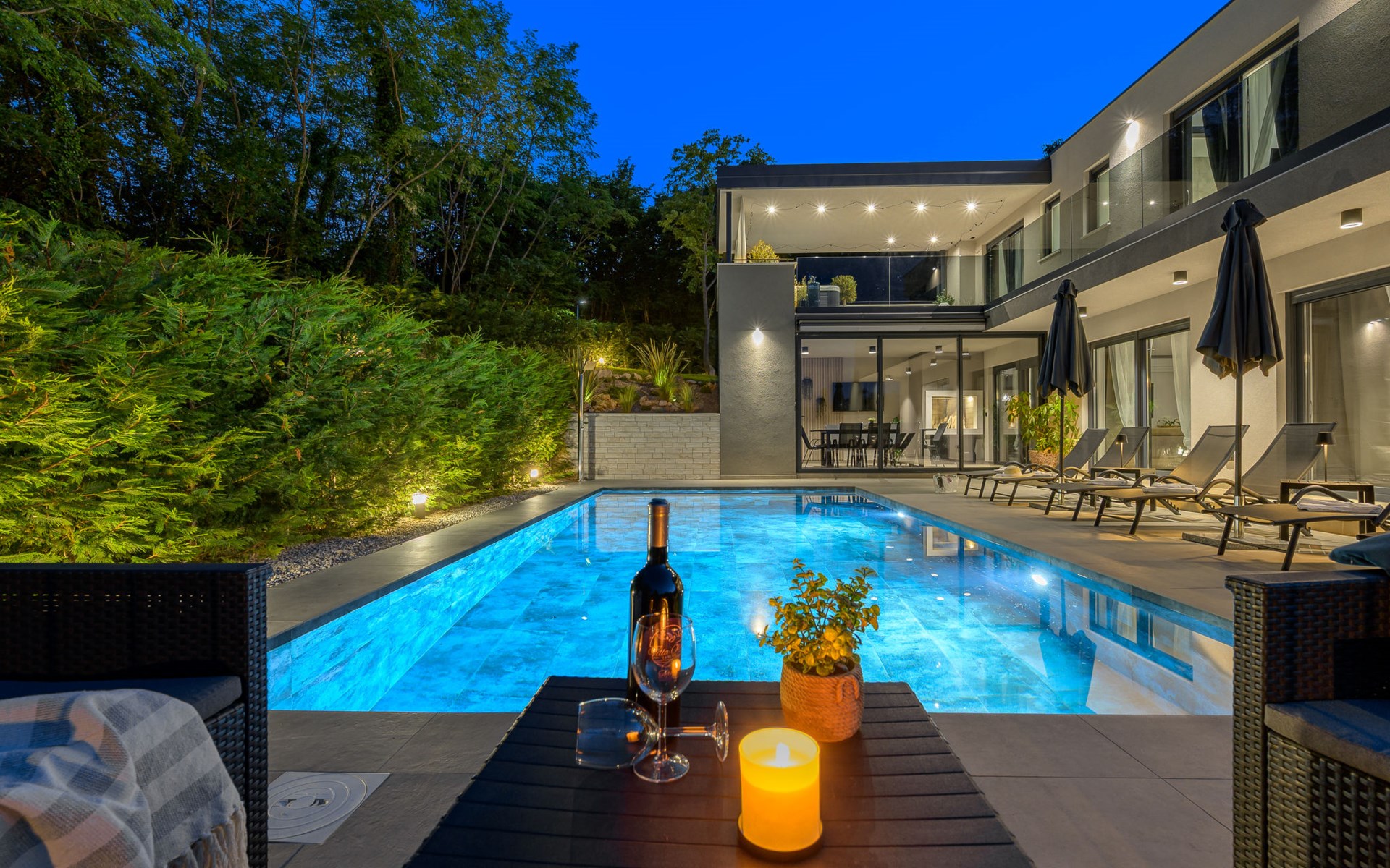 Zeer mooi, luxueuze villa "Ollea", van 3 verdiepingen. In het gehucht Radovići, 10 km van het centrum van Labin, 15 km van het centrum van Rabac, 15 km van zee. Voor alleengebruik: terrein 900 m2 (omheind) met planten en bomen, openluchtzwembad hoekig (8 x 4 m, 150 cm diepte, seizoensgebonden beschikbaarheid: 01.Apr. - 30.Okt.) met trap. Buitendouche, hot tub, tafeltennis, barbecue (glijbaan, schommel), onderhoud zwembad door de eigenaar/tuinman. In het huis: internetaansluiting, sauna, tafelvoetbal, wasmachine, droger. Overdekte parkeerplaats (voor 4 auto's) bij het huis op het terrein. Winkel 4 km, supermarkt 10 km, restaurant 4 km, bushalte "Labin" 10 km, kiezelstrand 15 km. De eigenaar accepteert geen jeugdgroepen. Vliegveld 53 km van het huis. Videobewaking bij de oprit en parkeerplaats.