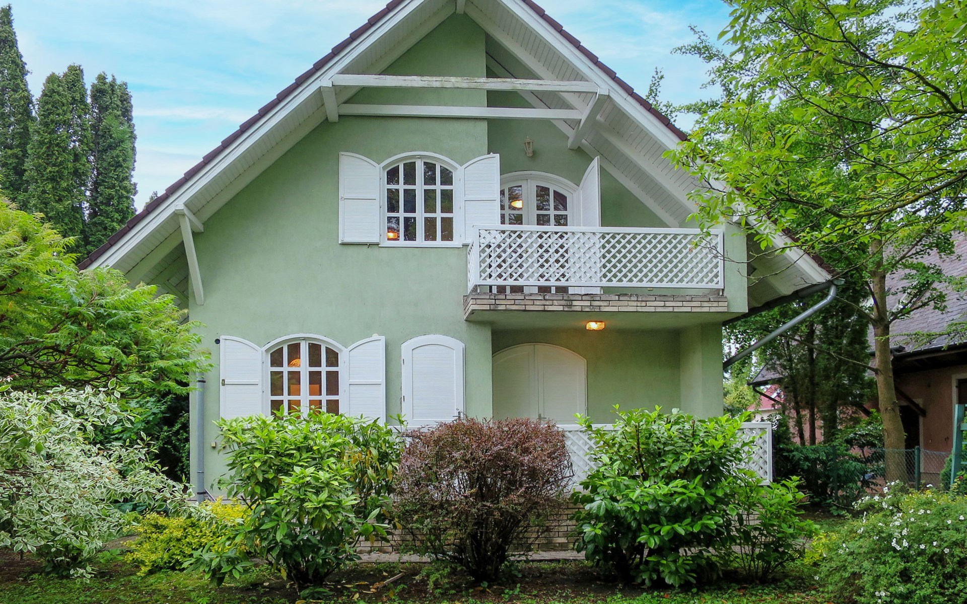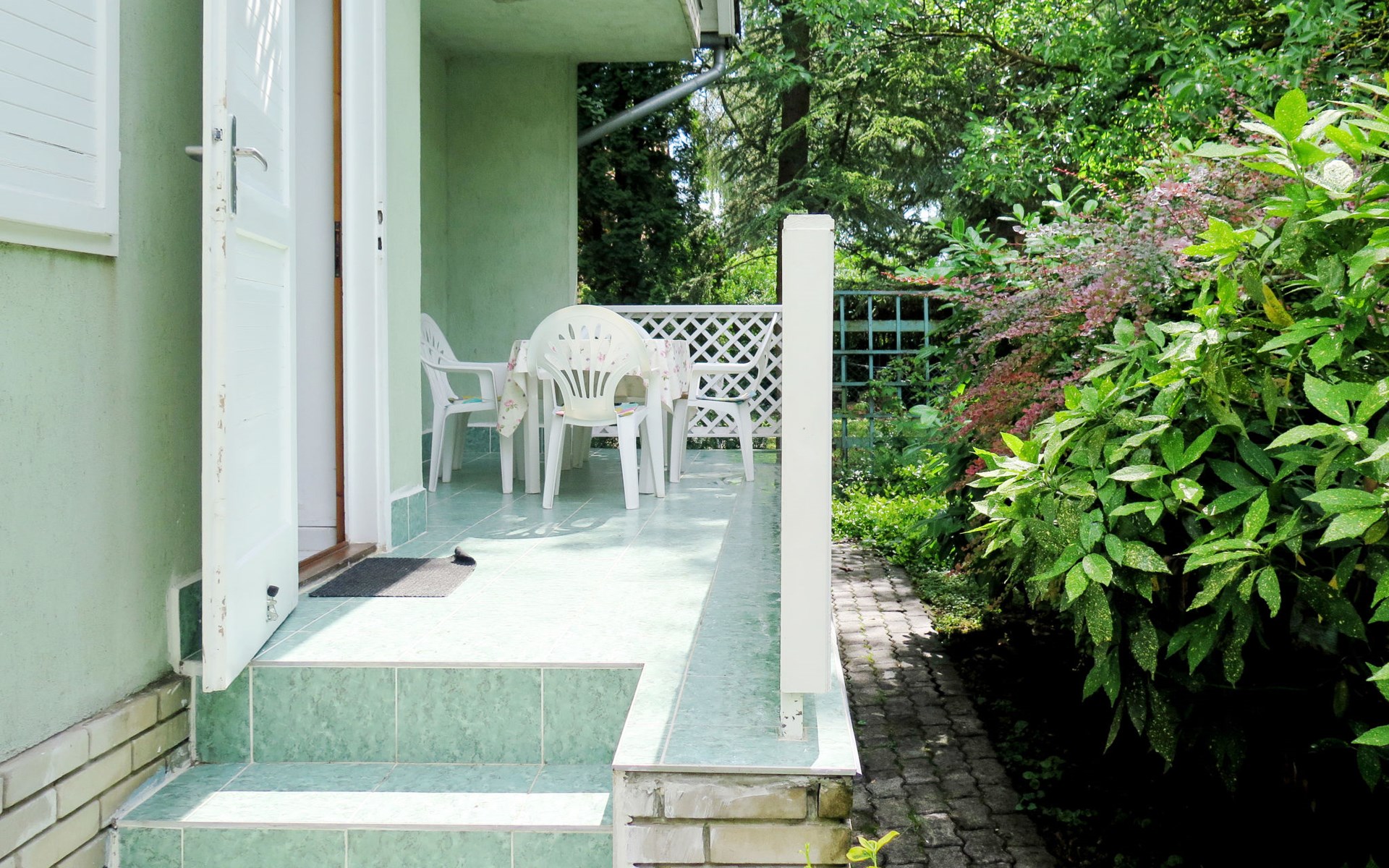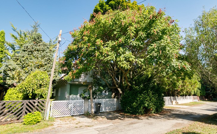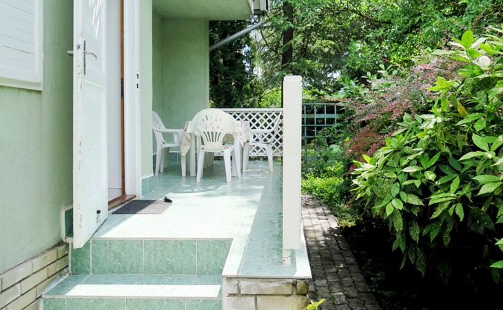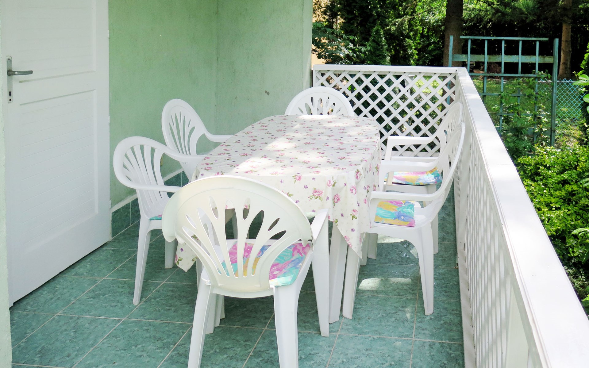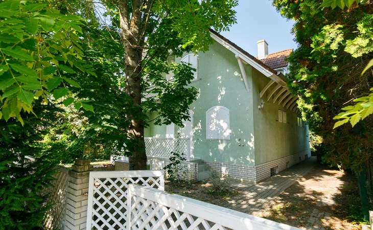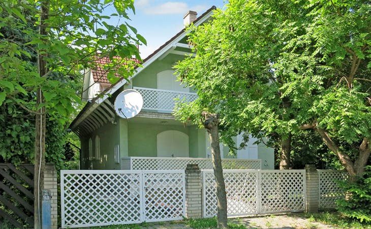 Siófok: Twee onder één kap woning "Elisabeth". 400 m van het centrum van Sosto, 6 km van het centrum van Siofok, in een woonwijk, 500 m van het meer, 650 m van het strand. Voor alleengebruik: terrein 200 m2 (omheind) met bomen, weide, parkeerplaats (voor 2 auto's) op het terrein. Winkel, restaurant 400 m, grasstrand 500 m. Eigenaar woont in apart huisgedeelte.