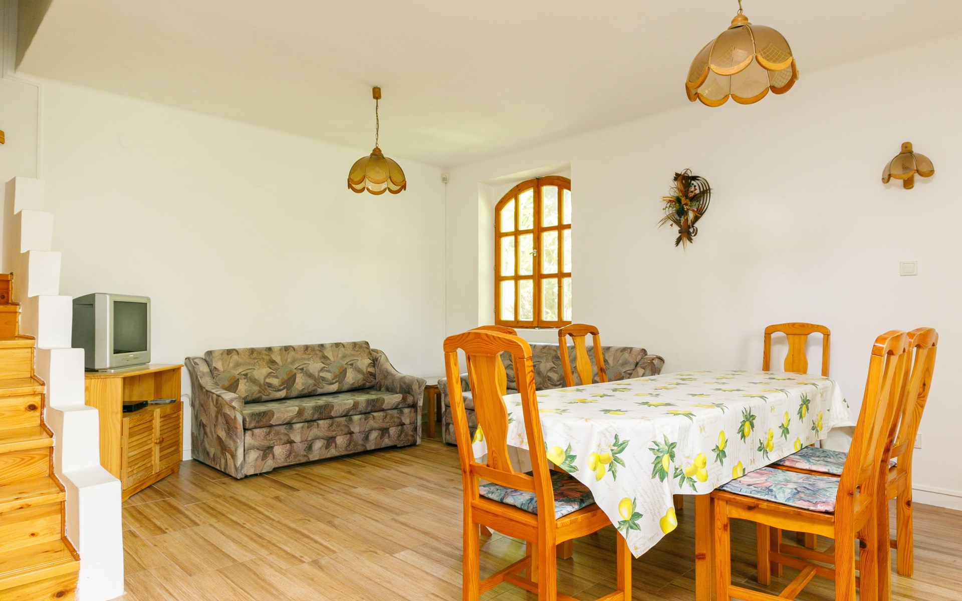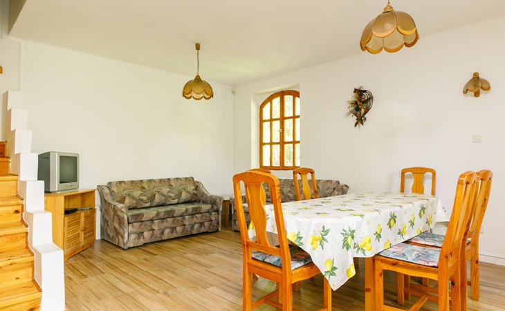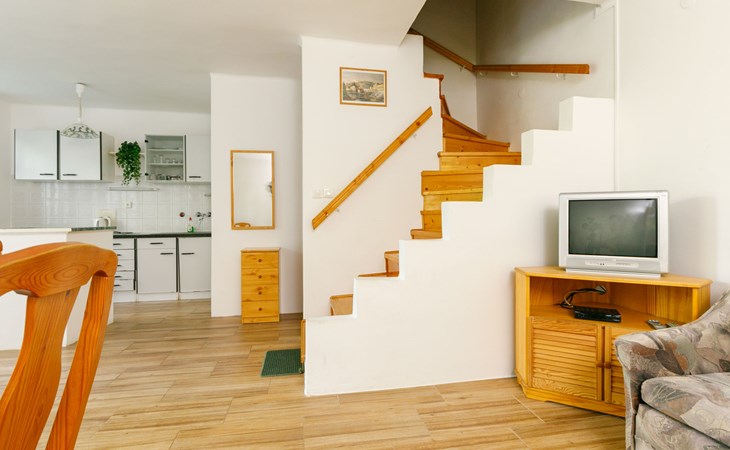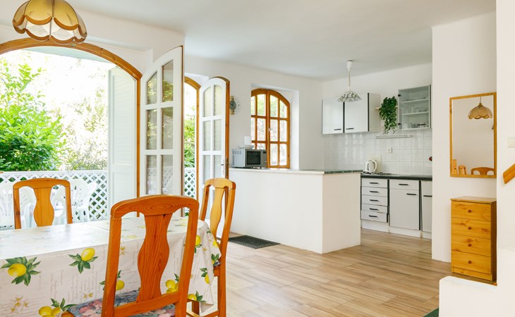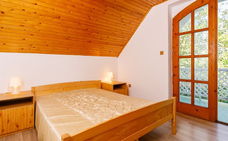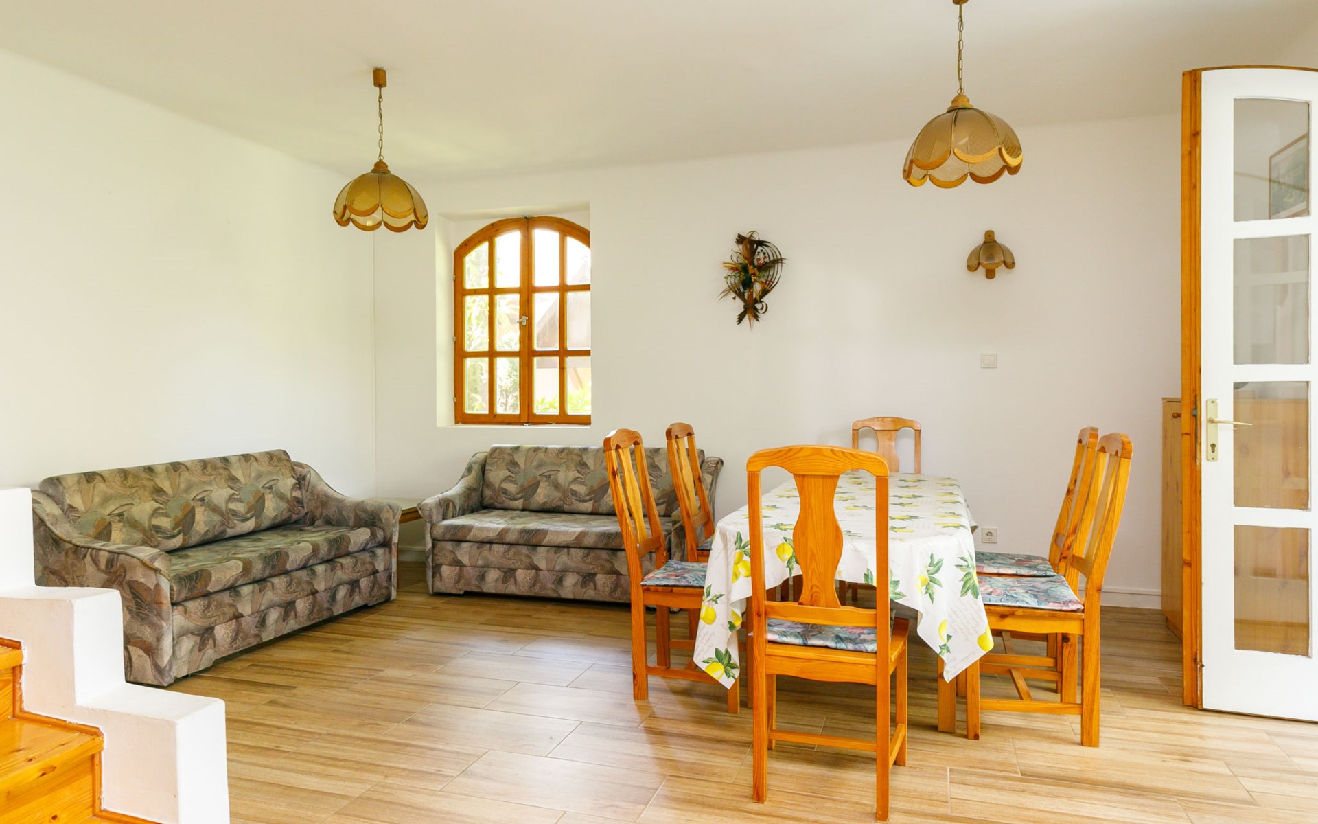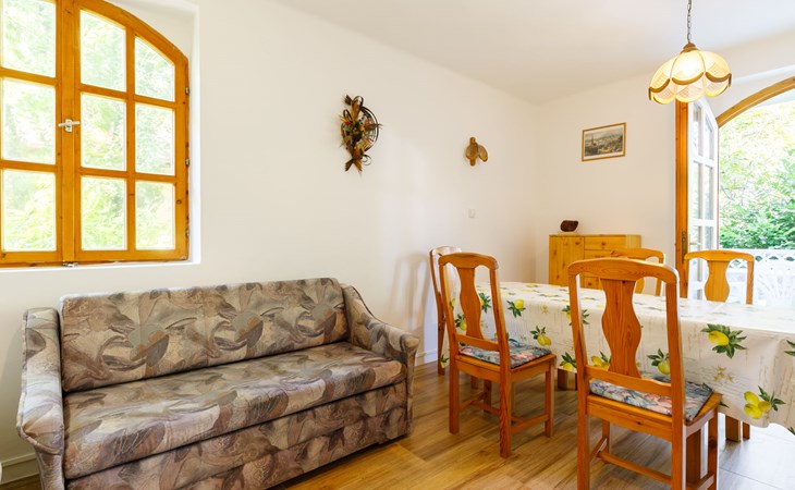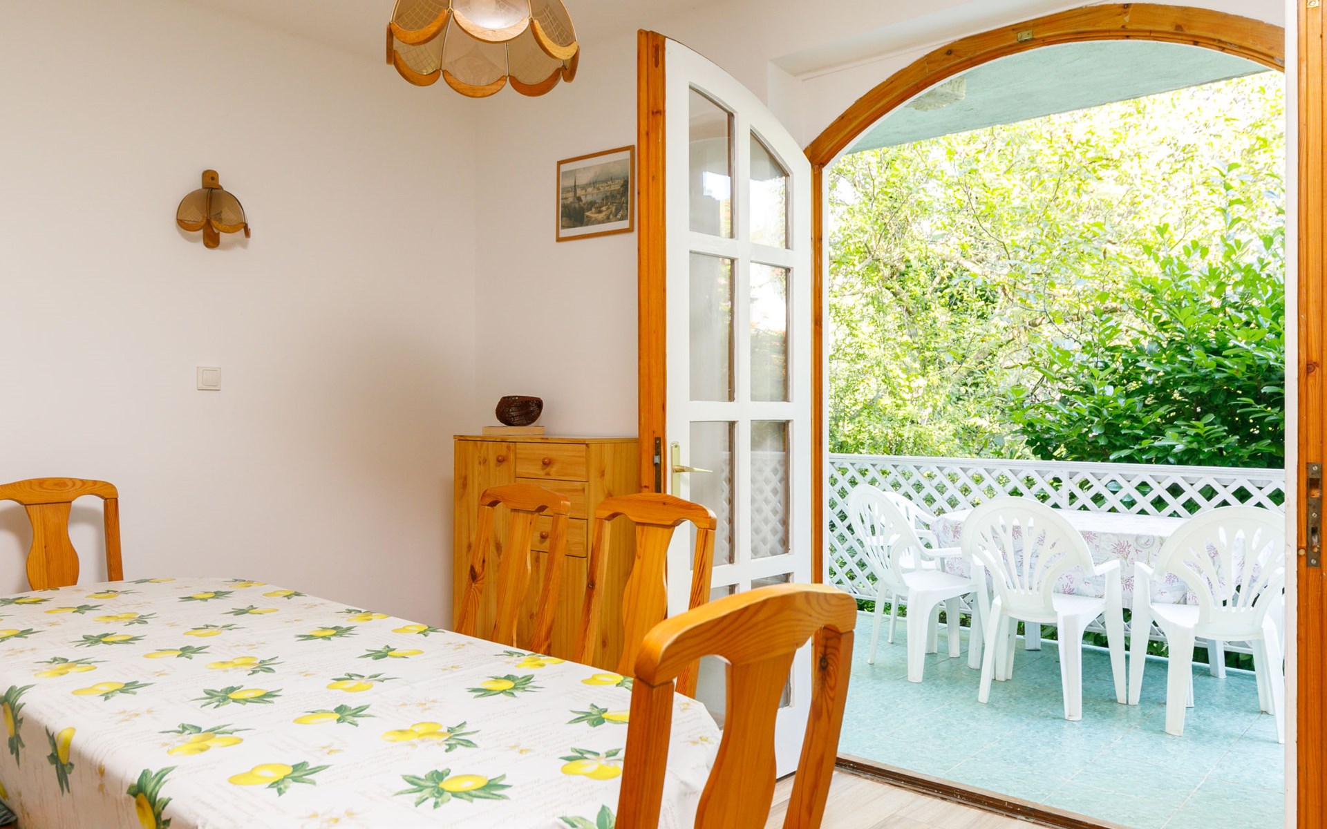 Siófok: Twee onder één kap woning "Elisabeth". 400 m van het centrum van Sosto, 6 km van het centrum van Siofok, in een woonwijk, 500 m van het meer, 650 m van het strand. Voor alleengebruik: terrein 200 m2 (omheind) met bomen, weide, parkeerplaats (voor 2 auto's) op het terrein. Winkel, restaurant 400 m, grasstrand 500 m. Eigenaar woont in apart huisgedeelte.