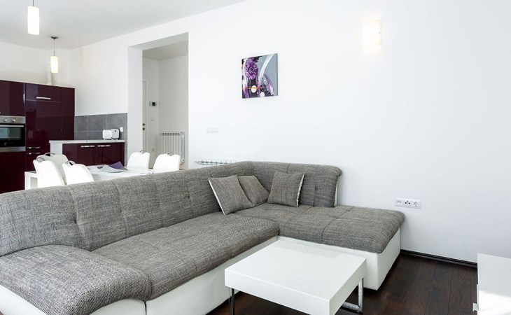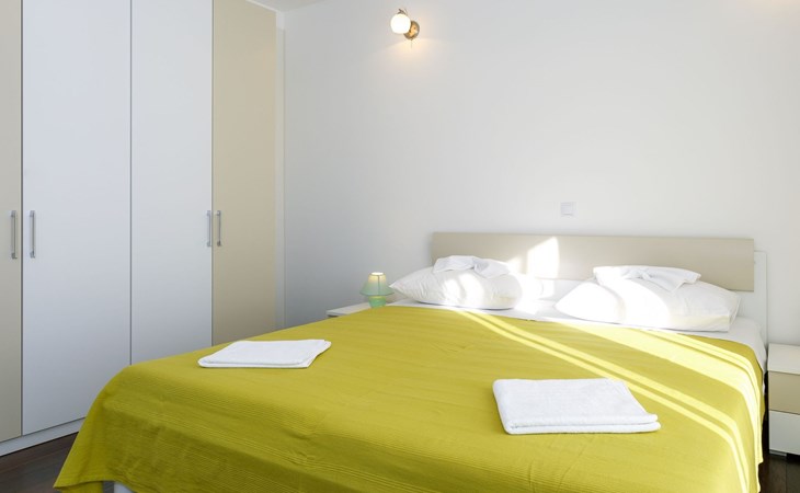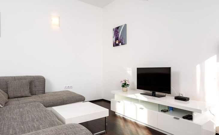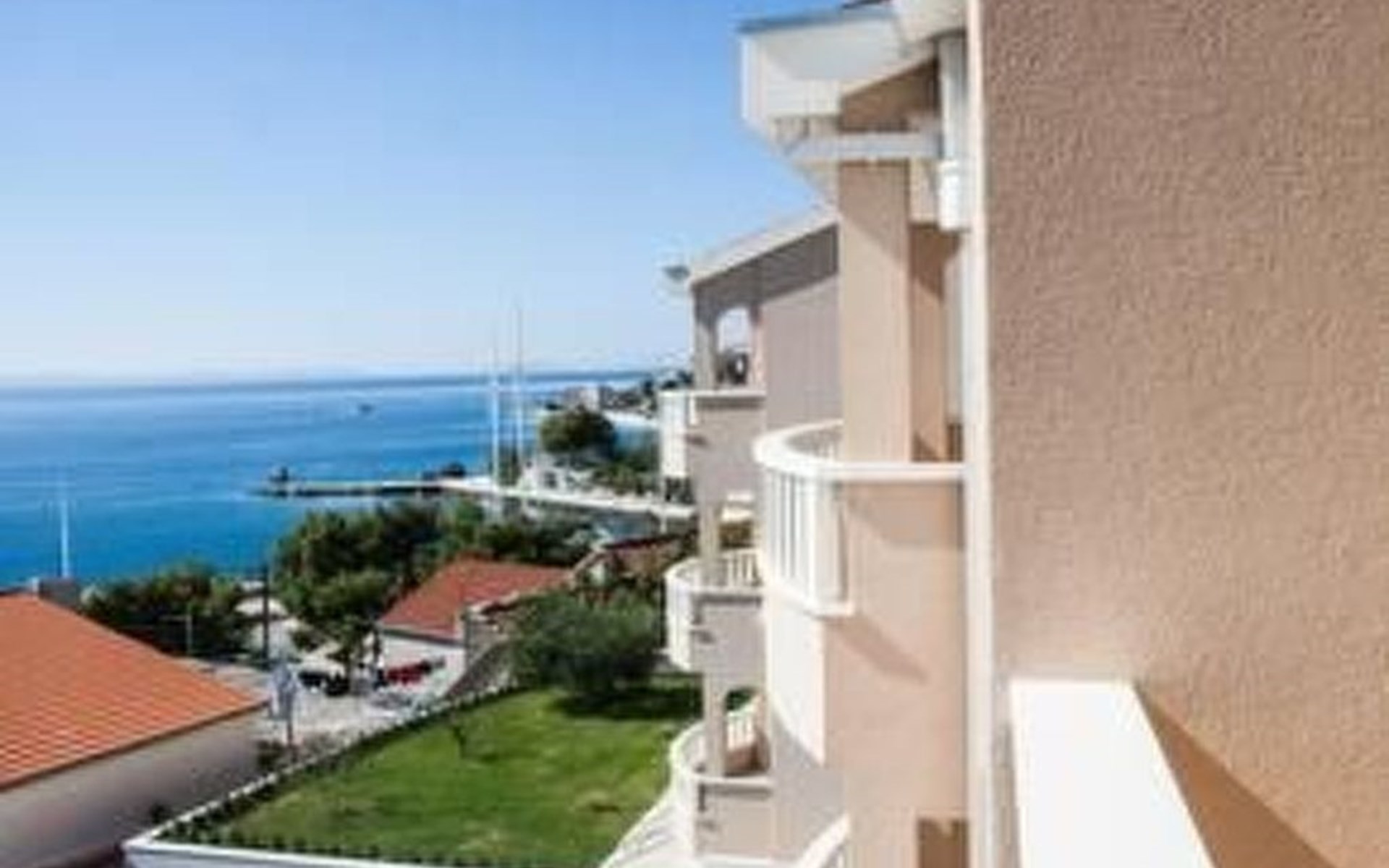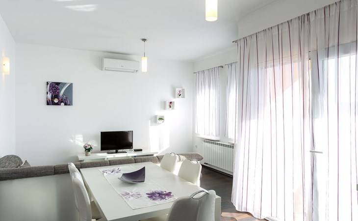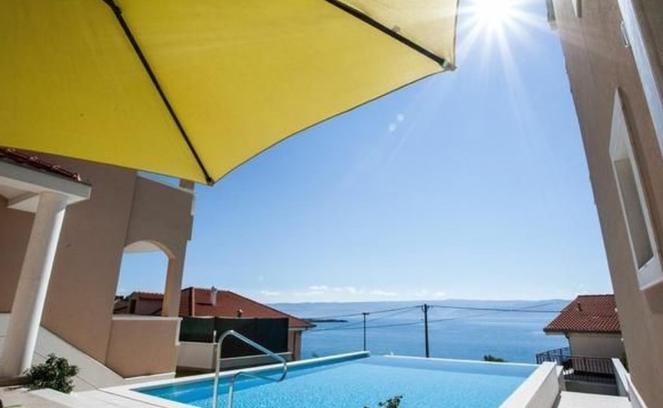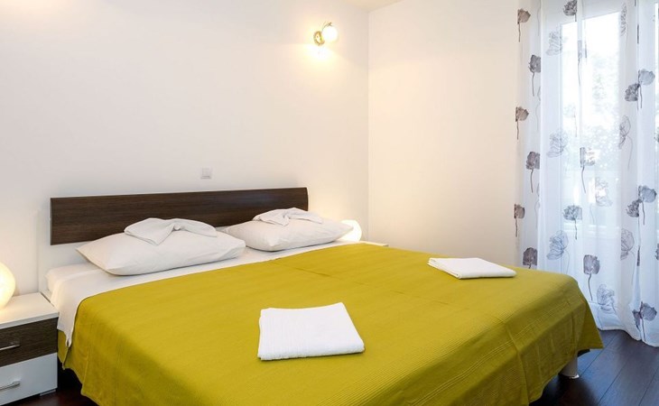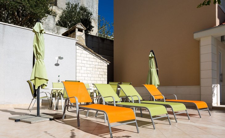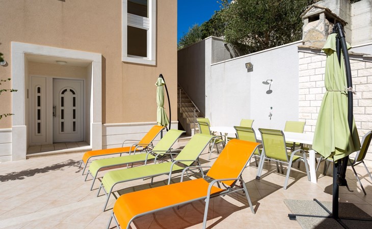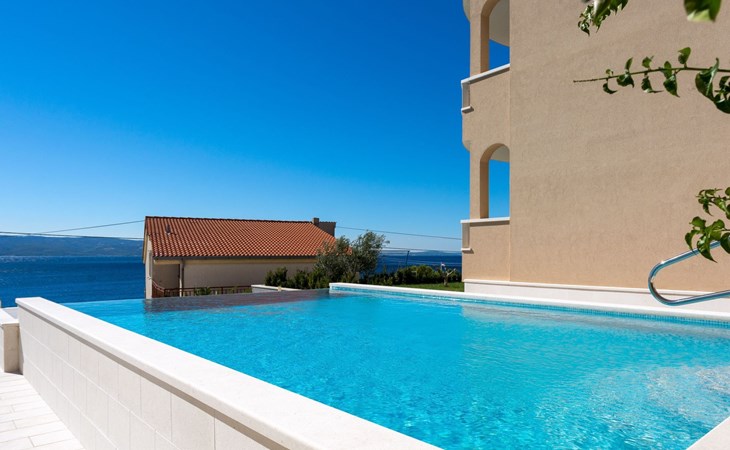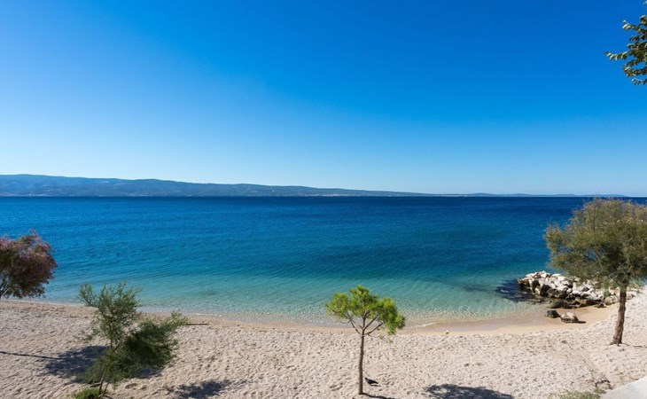 Our holiday apartment "Apartmani Muše A4“ is one of six apartments with a sea view, for a maximum of 5 people, a five-minute walk from the town centre in Dugi Rat. The apartment is on the ground floor of the west house. It is 50 metres from the private guest parking space right in front of the house to the beach – a very well-maintained and clean pebble beach with two small cafés, inviting you to relax, sunbathe and swim. It is 6 km to Omiš and 20km to Split, the ‘capital of Dalmatia’Holiday apartment “Apartmani Muše A4” with an infinity pool, right by the sea at Dugi Rat - No smoking in the entire indoor and outdoor areaOur holiday apartments are all equipped to a high standard, so you can enjoy the level of comfort you are accustomed to from home on your holiday. The prices includes the following amenities: air conditioning, wireless Internet access, satellite TV (with USB port), a washing machine, dishwasher, fridge (with freezer compartment), oven, microwave, kettle, toaster, coffee machine, an iron, towels and bed linen, a hairdryer and a safe for your valuables. All the windows and balcony doors are fitted with fly screens and blinds. A cot and highchair can be provided free of charge, but availability is limited, so these should be requested in advance.The 76m² of living space (not including the balconies) provides ample space to relax. You can recharge your batteries in the two bedrooms with comfortable double beds, a balcony and a sea view. The living room, the dining room and the kitchen are very light owing to the balcony. The comfortable pull-out sofa bed invites you to relax. You can prepare delicious meals in the open, fully-equipped kitchen. You can dine in the dining space by day or on the balcony on the evening, wherever you prefer. The two beautiful bathrooms with modern fittings provide a bath or a shower.You can do shopping conveniently on your holiday, either for self-catering or window shopping – the choice is yours. Dugi Rat provides most everyday essentials. You do not need a car, as the bakery, supermarket, butcher, post office, ATM etc. are within easy walking distance (50-200m). Here is a little overview of the great leisure activities for the whole family, either on the doorstep or within a short drive: jet-ski hire, rafting, canyoning, kayaking, hiking, diving, climbing, zipline, banana boat rides, parasailing, boat trips to islands etc. Those who love beautiful sandy beaches will enjoy Duce (3km) or Omis (6km). Public transport: there are good half-hourly bus connections and the bus stops are only about 250 metres from the holiday apartments. Split itself offers a wide range of transport connections: bus, train, ferry and plane.There is a pool with sun loungers, two showers, a generous terrace and a 220m² lawn. Two large parasols on the terrace provide pleasant shade during the midday hours if required. In the evening the large stone grill next to the terrace is particularly popular. The tables and chairs provide ample space even for a large family and meals simply taste better outdoors on a warm summer’s evening, looking out over the infinity pool towards the sea and the lights on the island of Brač.Important note: Smoking is not permitted in our holiday complex, both indoors and in the entire outdoor area (including the balconies)!