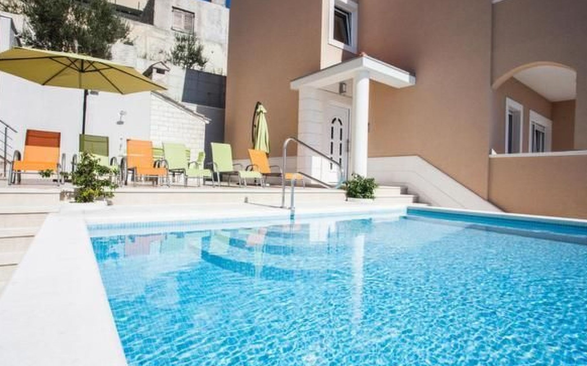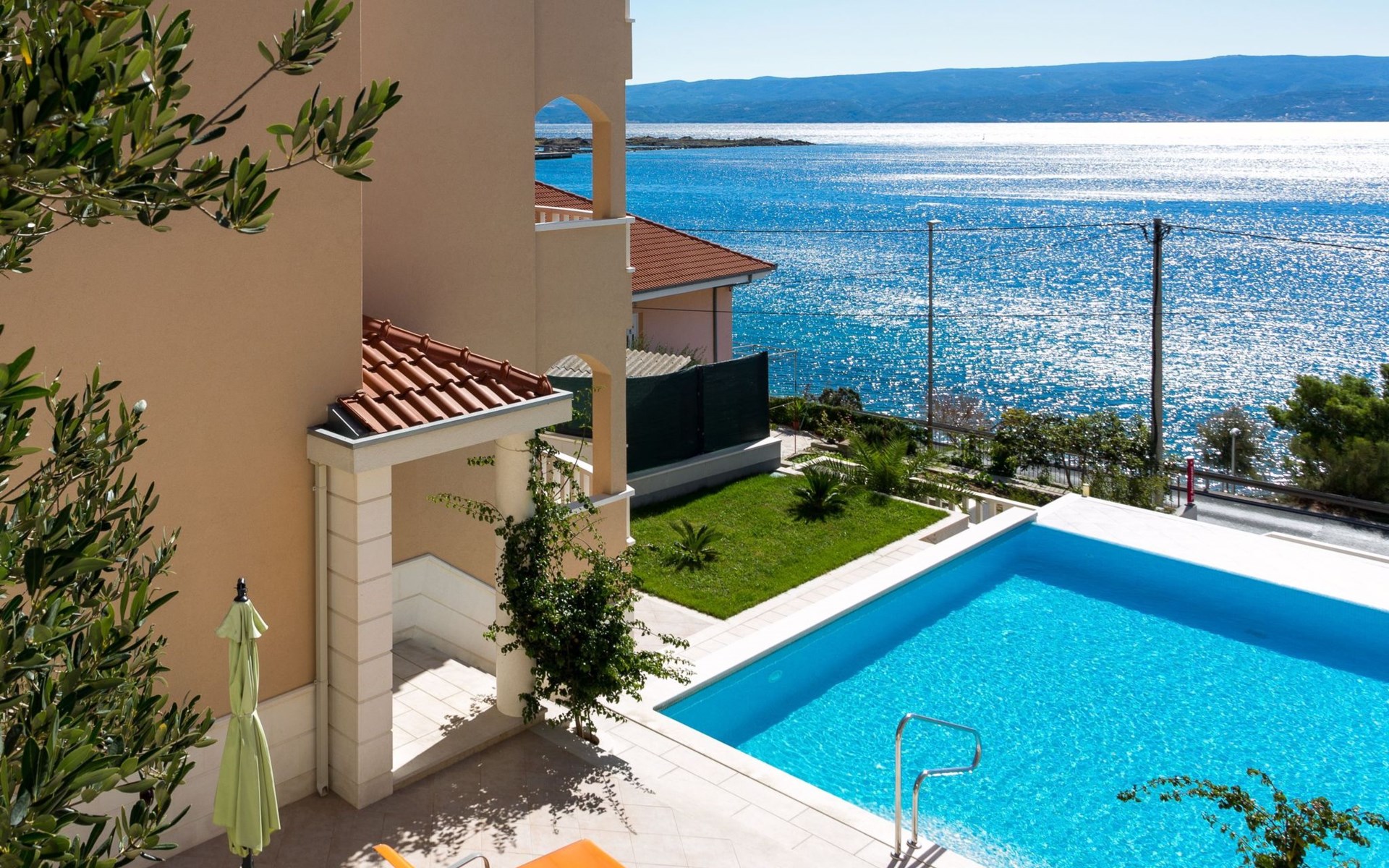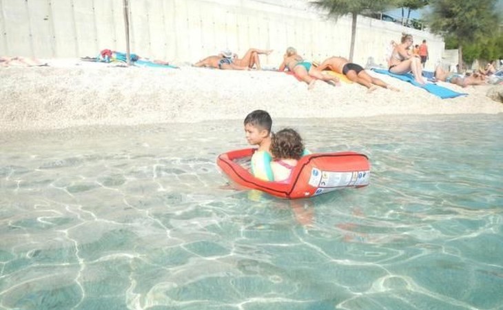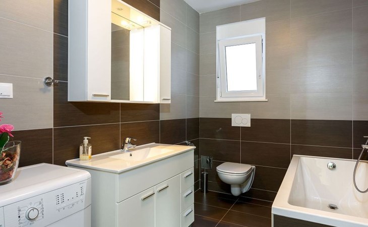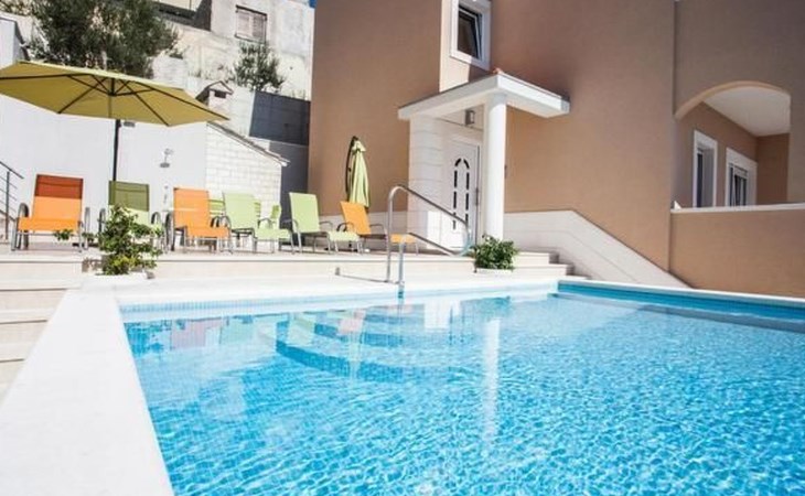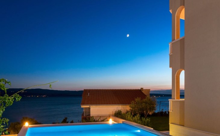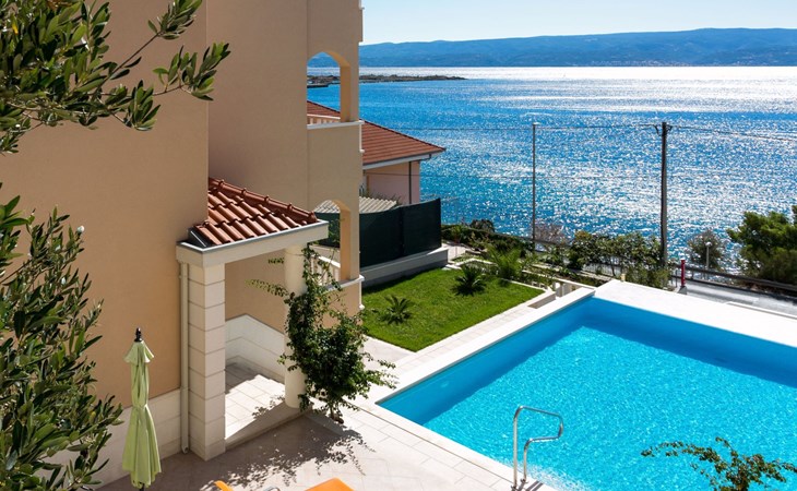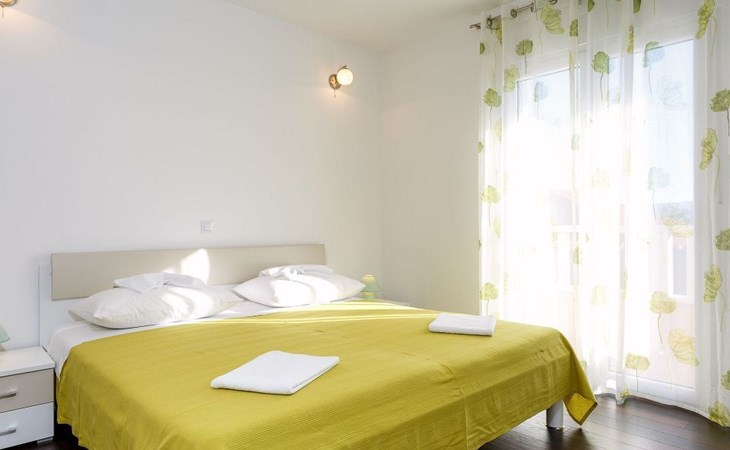 Our holiday apartment "Apartmani Muše A4“ is one of six apartments with a sea view, for a maximum of 5 people, a five-minute walk from the town centre in Dugi Rat. The apartment is on the ground floor of the west house. It is 50 metres from the private guest parking space right in front of the house to the beach – a very well-maintained and clean pebble beach with two small cafés, inviting you to relax, sunbathe and swim. It is 6 km to Omiš and 20km to Split, the ‘capital of Dalmatia’Holiday apartment “Apartmani Muše A4” with an infinity pool, right by the sea at Dugi Rat - No smoking in the entire indoor and outdoor areaOur holiday apartments are all equipped to a high standard, so you can enjoy the level of comfort you are accustomed to from home on your holiday. The prices includes the following amenities: air conditioning, wireless Internet access, satellite TV (with USB port), a washing machine, dishwasher, fridge (with freezer compartment), oven, microwave, kettle, toaster, coffee machine, an iron, towels and bed linen, a hairdryer and a safe for your valuables. All the windows and balcony doors are fitted with fly screens and blinds. A cot and highchair can be provided free of charge, but availability is limited, so these should be requested in advance.The 76m² of living space (not including the balconies) provides ample space to relax. You can recharge your batteries in the two bedrooms with comfortable double beds, a balcony and a sea view. The living room, the dining room and the kitchen are very light owing to the balcony. The comfortable pull-out sofa bed invites you to relax. You can prepare delicious meals in the open, fully-equipped kitchen. You can dine in the dining space by day or on the balcony on the evening, wherever you prefer. The two beautiful bathrooms with modern fittings provide a bath or a shower.You can do shopping conveniently on your holiday, either for self-catering or window shopping – the choice is yours. Dugi Rat provides most everyday essentials. You do not need a car, as the bakery, supermarket, butcher, post office, ATM etc. are within easy walking distance (50-200m). Here is a little overview of the great leisure activities for the whole family, either on the doorstep or within a short drive: jet-ski hire, rafting, canyoning, kayaking, hiking, diving, climbing, zipline, banana boat rides, parasailing, boat trips to islands etc. Those who love beautiful sandy beaches will enjoy Duce (3km) or Omis (6km). Public transport: there are good half-hourly bus connections and the bus stops are only about 250 metres from the holiday apartments. Split itself offers a wide range of transport connections: bus, train, ferry and plane.There is a pool with sun loungers, two showers, a generous terrace and a 220m² lawn. Two large parasols on the terrace provide pleasant shade during the midday hours if required. In the evening the large stone grill next to the terrace is particularly popular. The tables and chairs provide ample space even for a large family and meals simply taste better outdoors on a warm summer’s evening, looking out over the infinity pool towards the sea and the lights on the island of Brač.Important note: Smoking is not permitted in our holiday complex, both indoors and in the entire outdoor area (including the balconies)!