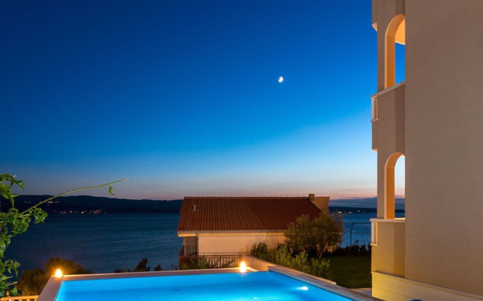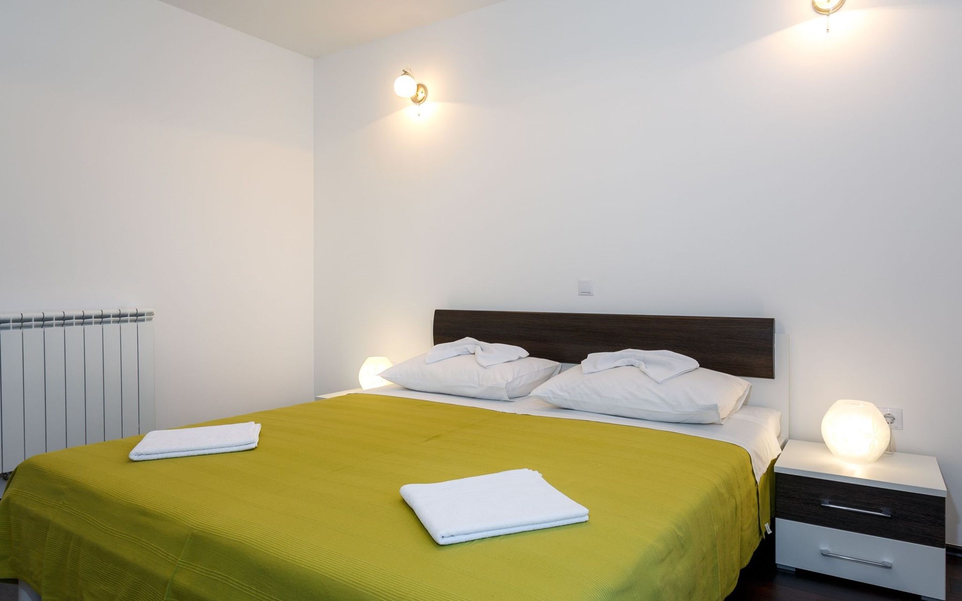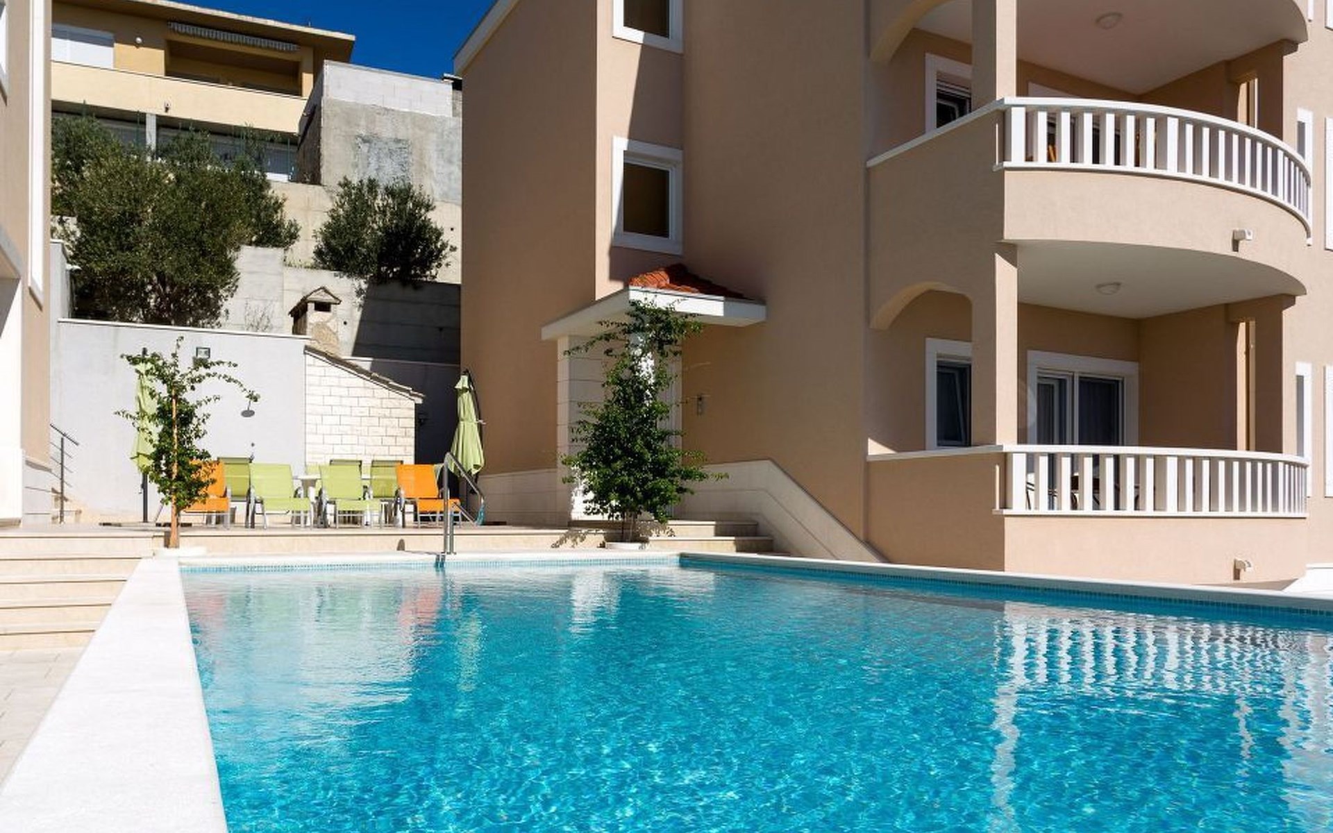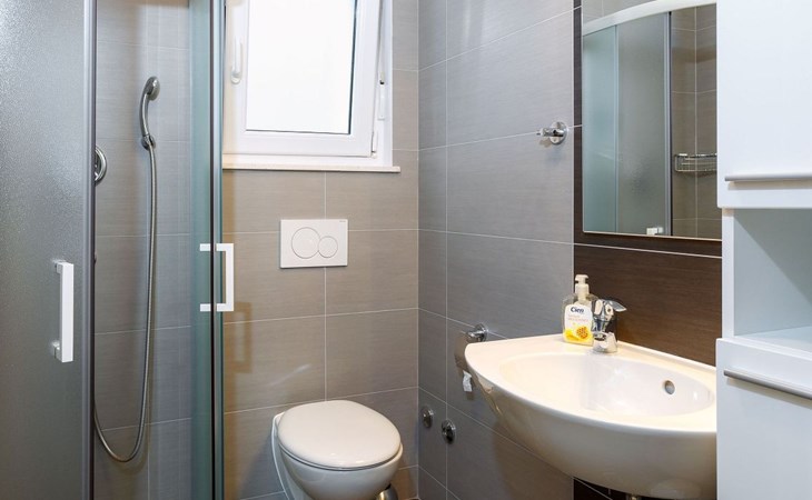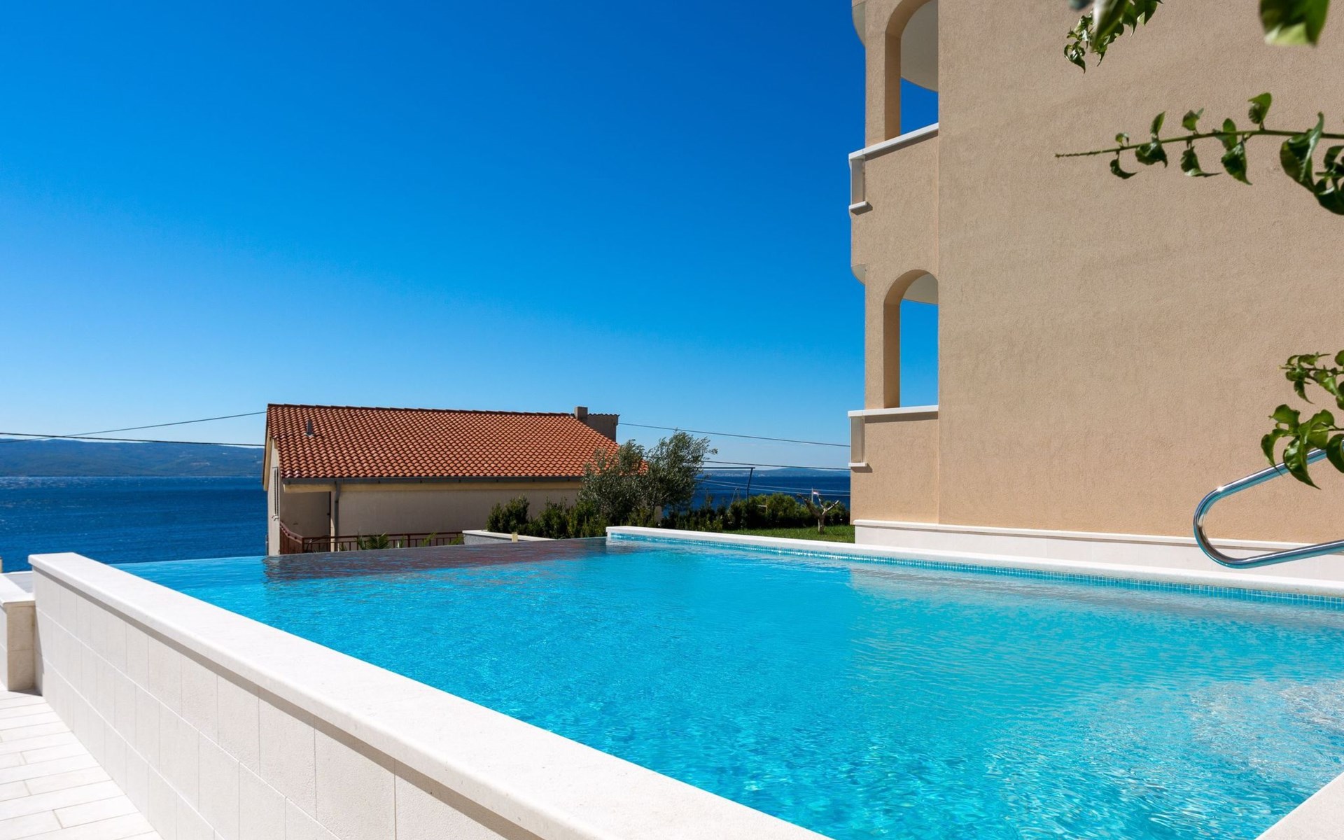 Our holiday apartment "Apartmani Muše A4“ is one of six apartments with a sea view, for a maximum of 5 people, a five-minute walk from the town centre in Dugi Rat. The apartment is on the ground floor of the west house. It is 50 metres from the private guest parking space right in front of the house to the beach – a very well-maintained and clean pebble beach with two small cafés, inviting you to relax, sunbathe and swim. It is 6 km to Omiš and 20km to Split, the ‘capital of Dalmatia’Holiday apartment “Apartmani Muše A4” with an infinity pool, right by the sea at Dugi Rat - No smoking in the entire indoor and outdoor areaOur holiday apartments are all equipped to a high standard, so you can enjoy the level of comfort you are accustomed to from home on your holiday. The prices includes the following amenities: air conditioning, wireless Internet access, satellite TV (with USB port), a washing machine, dishwasher, fridge (with freezer compartment), oven, microwave, kettle, toaster, coffee machine, an iron, towels and bed linen, a hairdryer and a safe for your valuables. All the windows and balcony doors are fitted with fly screens and blinds. A cot and highchair can be provided free of charge, but availability is limited, so these should be requested in advance.The 76m² of living space (not including the balconies) provides ample space to relax. You can recharge your batteries in the two bedrooms with comfortable double beds, a balcony and a sea view. The living room, the dining room and the kitchen are very light owing to the balcony. The comfortable pull-out sofa bed invites you to relax. You can prepare delicious meals in the open, fully-equipped kitchen. You can dine in the dining space by day or on the balcony on the evening, wherever you prefer. The two beautiful bathrooms with modern fittings provide a bath or a shower.You can do shopping conveniently on your holiday, either for self-catering or window shopping – the choice is yours. Dugi Rat provides most everyday essentials. You do not need a car, as the bakery, supermarket, butcher, post office, ATM etc. are within easy walking distance (50-200m). Here is a little overview of the great leisure activities for the whole family, either on the doorstep or within a short drive: jet-ski hire, rafting, canyoning, kayaking, hiking, diving, climbing, zipline, banana boat rides, parasailing, boat trips to islands etc. Those who love beautiful sandy beaches will enjoy Duce (3km) or Omis (6km). Public transport: there are good half-hourly bus connections and the bus stops are only about 250 metres from the holiday apartments. Split itself offers a wide range of transport connections: bus, train, ferry and plane.There is a pool with sun loungers, two showers, a generous terrace and a 220m² lawn. Two large parasols on the terrace provide pleasant shade during the midday hours if required. In the evening the large stone grill next to the terrace is particularly popular. The tables and chairs provide ample space even for a large family and meals simply taste better outdoors on a warm summer’s evening, looking out over the infinity pool towards the sea and the lights on the island of Brač.Important note: Smoking is not permitted in our holiday complex, both indoors and in the entire outdoor area (including the balconies)!