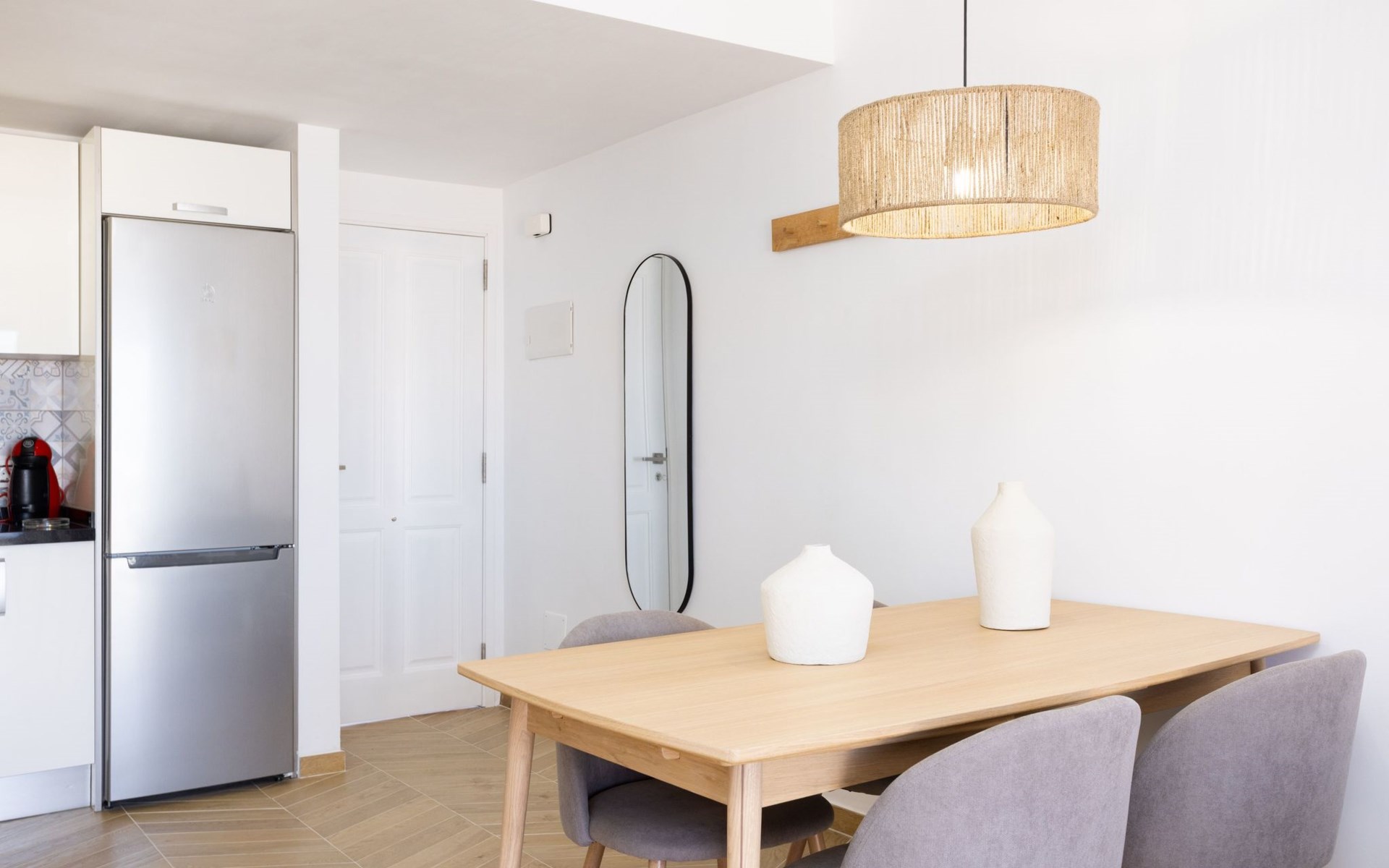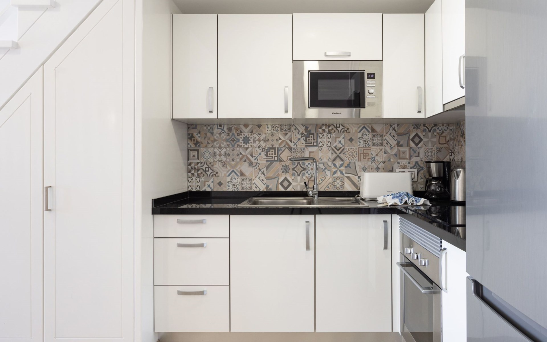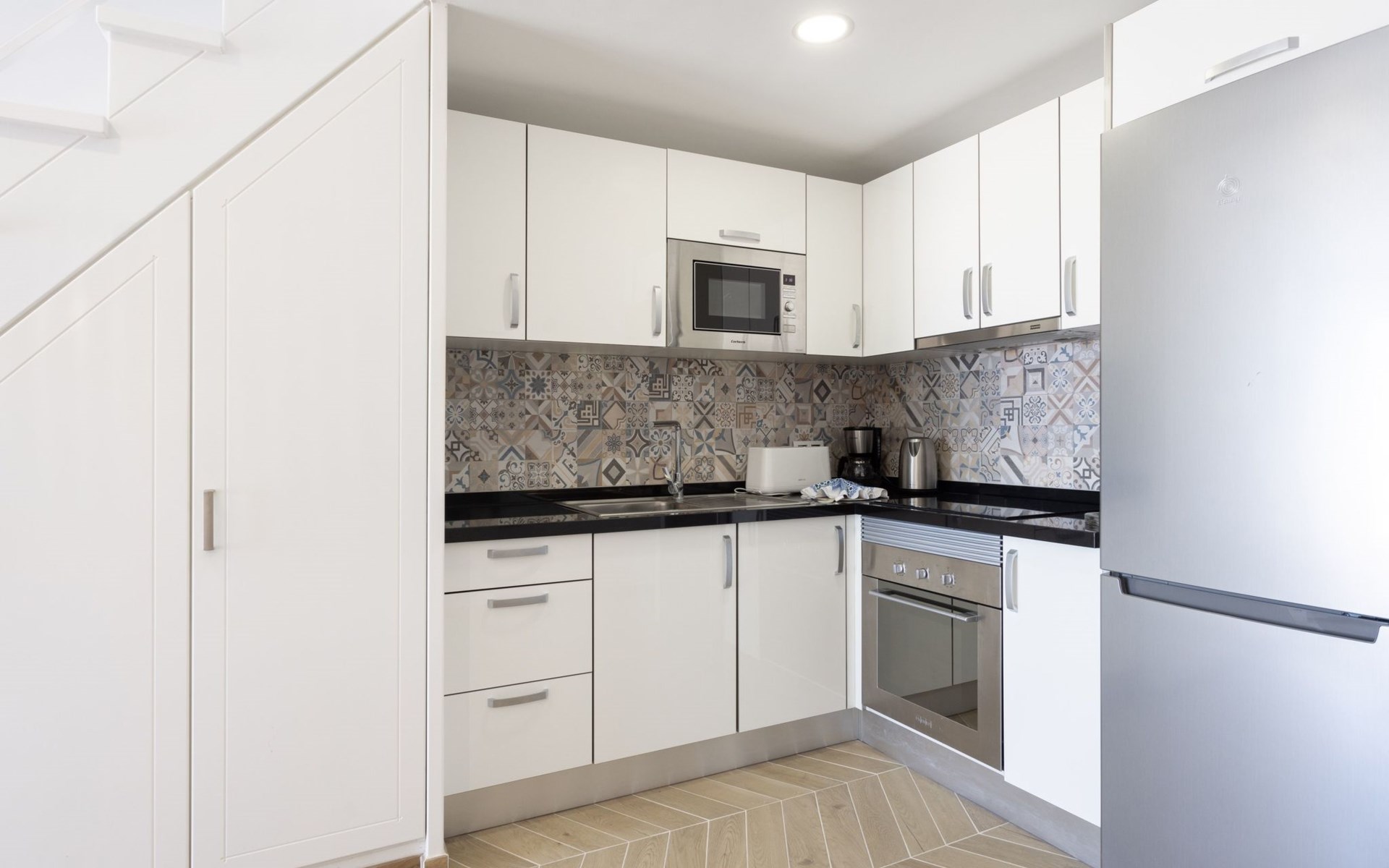 De flat is zeer comfortabel ingericht. De keuken is volledig uitgerust met fornuis met keramische kookplaat, oven, magnetron, koffiezetapparaat, broodrooster en waterkoker.