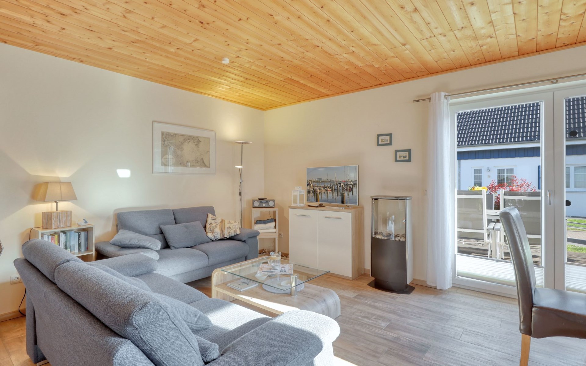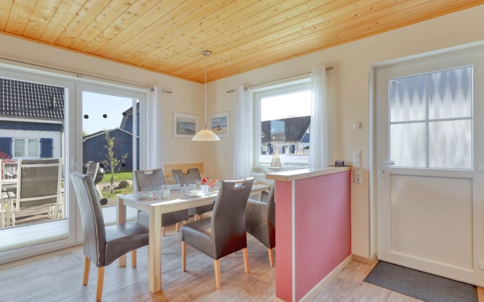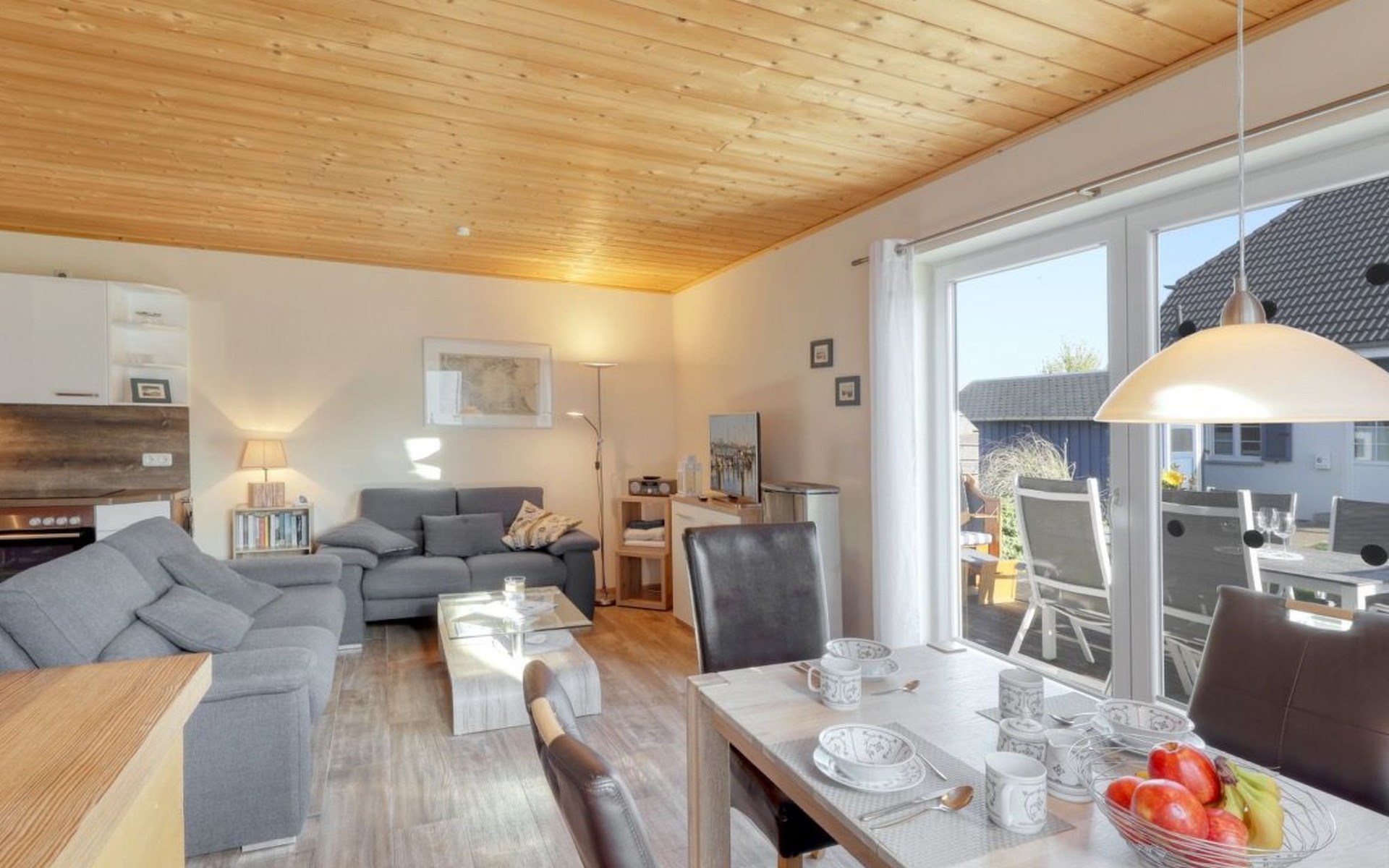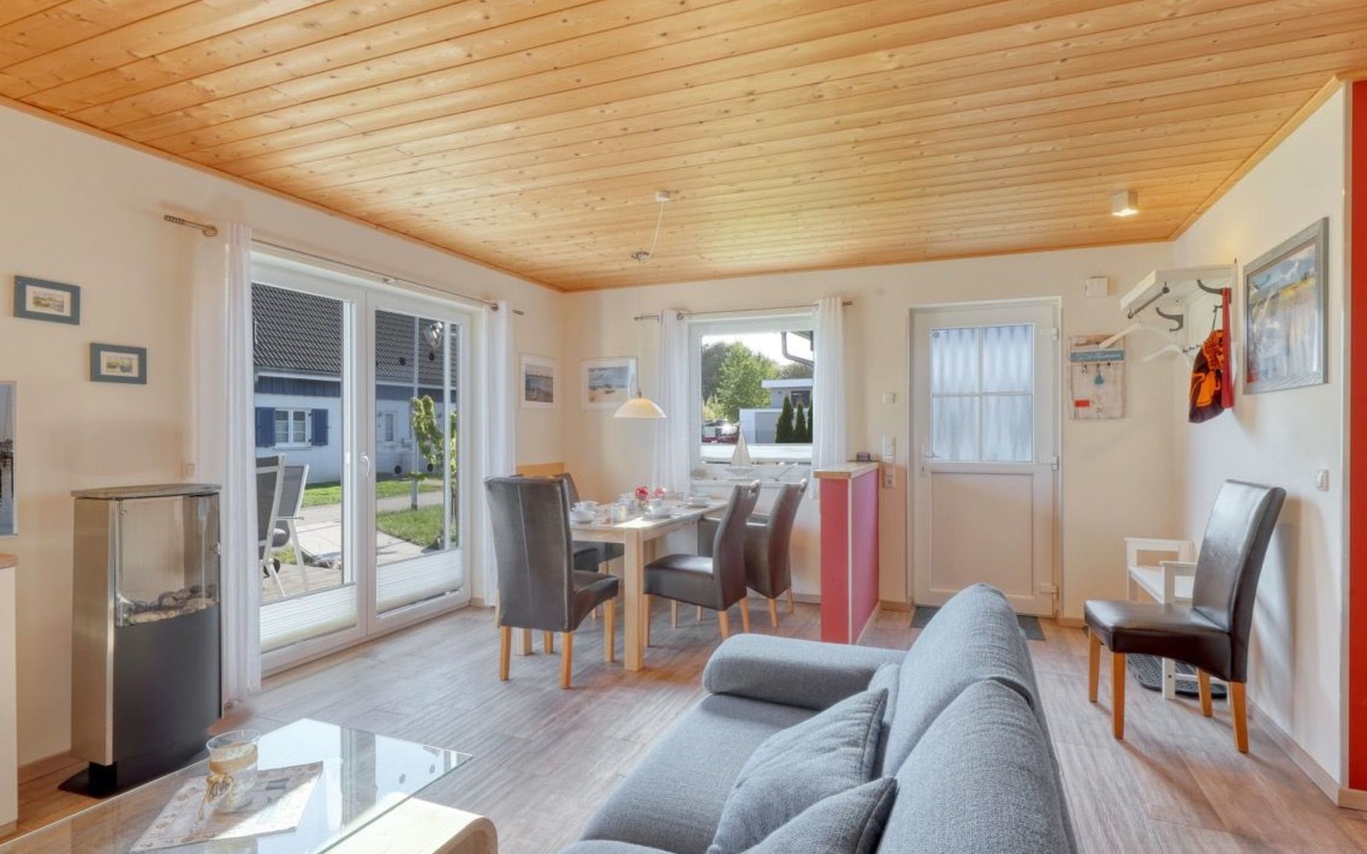Holiday home LA MERAltefähr on the sunny island of RügenOur holiday home LA MER, built in 2016, offers you the ideal place for an active and/or passive holiday. LA MER is part of the Sonnengarten holiday home park and our semi-detached house is 72 square metres in size and can accommodate six people. The house has a large living and dining area, two separate bedrooms, as well as a bedroom in the attic, bathroom with shower, sun terrace and is modern-functional and furnished with great attention to detail.Altefähr has always been the gateway to the island of Rügen and is located on the Strelasund opposite the time-honoured Hanseatic city of Stralsund. The panoramic view from Altefähr to Stralsund alone is worth the trip.Altefähr is a small, quiet, idyllic and tranquil place that invites you to relax.The child-friendly bathing beach with playground and plenty of space for digging is just a five-minute walk from the holiday home.You can watch boats at the harbour or set sail yourself. Anglers can pursue their hobby all year round, but other major sporting events (e.g. the Sundschwimmen, Rügenbrückenlauf, etc.) also invite you to take part or watch.Altefähr is the ideal starting point for swimming, fishing, surfing, hiking, cycling (the holiday home is located directly on the Rügen circular route / Baltic Sea coast cycle path), boating or boat trips.three bicycles are available to guests free of charge. You can store your bikes safely in the lockable shed. For smaller repairs there is a tool / repair kit and an air pump available.Various offers such as the forest climbing ropes course a few minutes walk from the house, or the Ozeanum and the maritime museum in Stralsund, etc. offer plenty of variety for your stay.We wish you a nice and relaxing stay.short descriptionOther : Non-smoking houseShort description 1Number of kitchens : 1Other rooms : lockable shed (for bicycles or similar)Living room 1Other : kitchen 1Living room 1Other living room equipment : Stove is heated with bioethanolSurroundingsLeisure facilities : Boat rental, bicycle rentalSports facilities in the area : Fishing, canoeing, climbing, cycling, riding, sailing, surfingSurroundings 1Excursion possibilities : By ferry to Stralsund, Hiddensee, Ozeaneum StralsundLocation description : Small quiet, tranquil place in the countryside on the Strelasund opposite Stralsund. Bathing beach, boat hire, surf school at the harbour. Everything within walking distanceGarden and outdoor facilitiesGarden equipment : Garden furniture available, barbecue, gazeboServicesServices (possibly chargeable) : Bread roll service