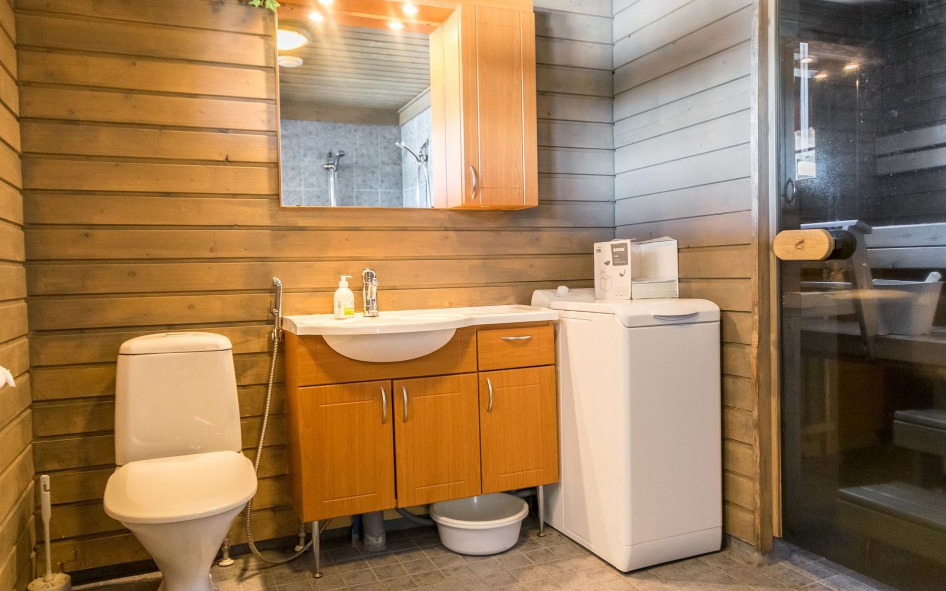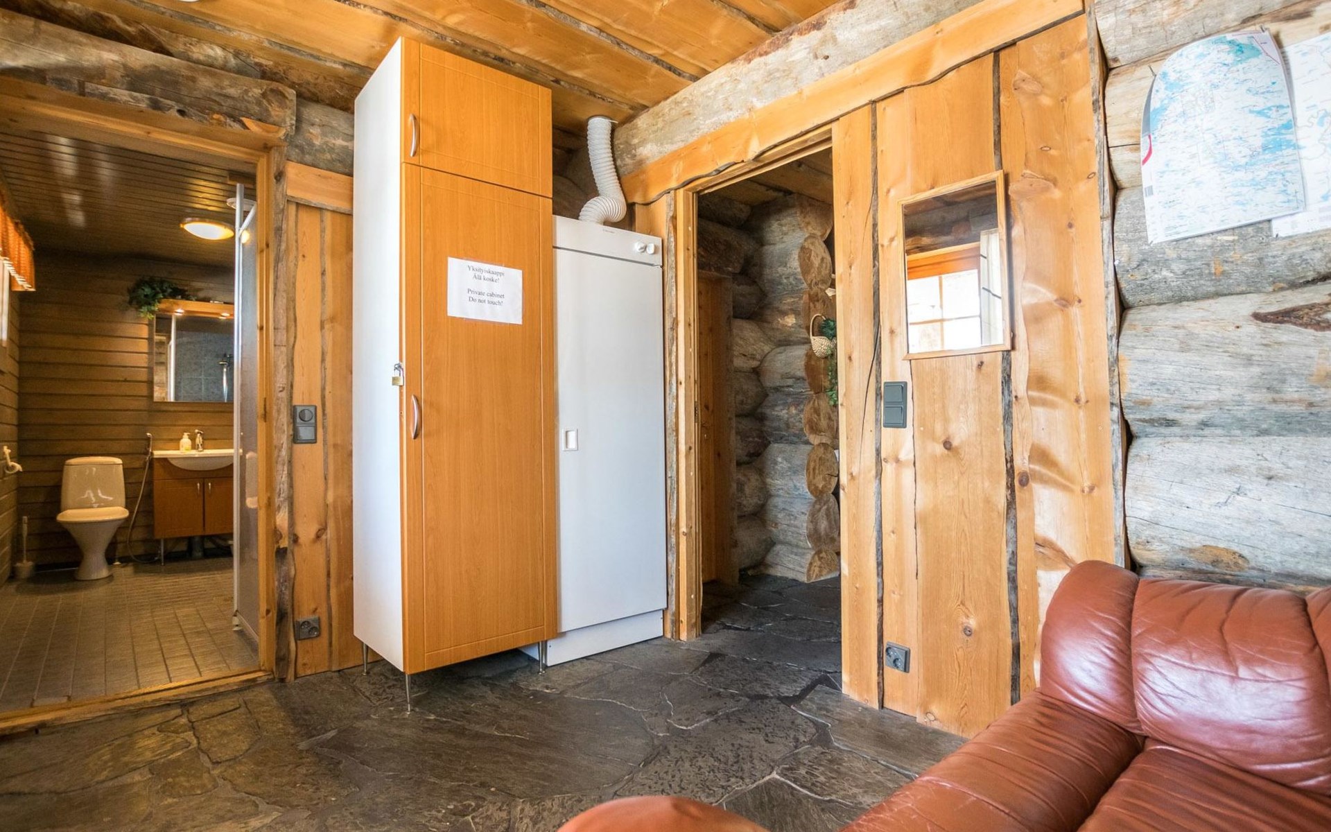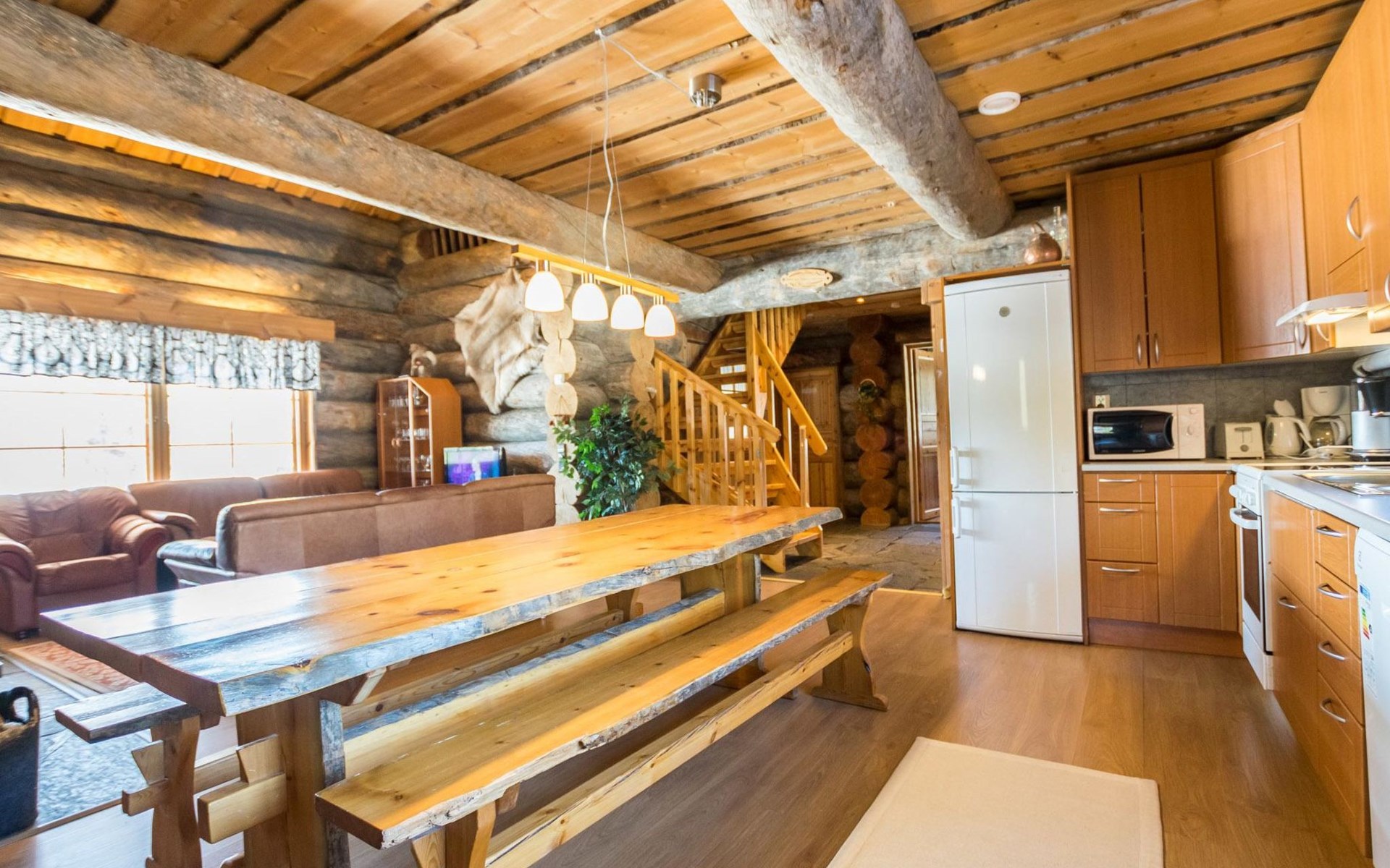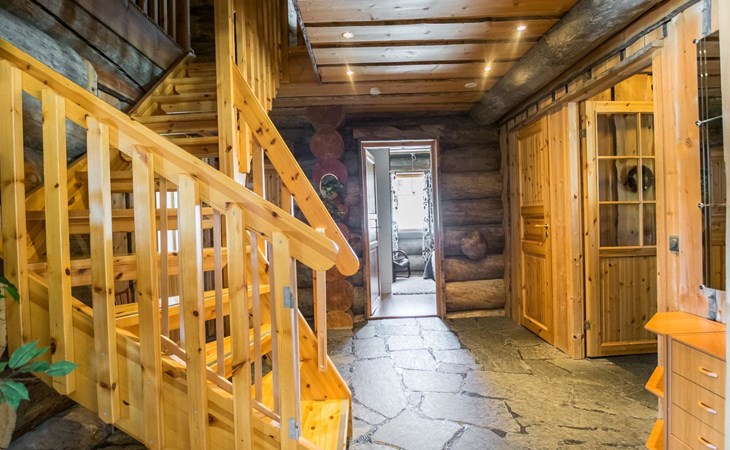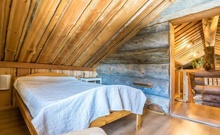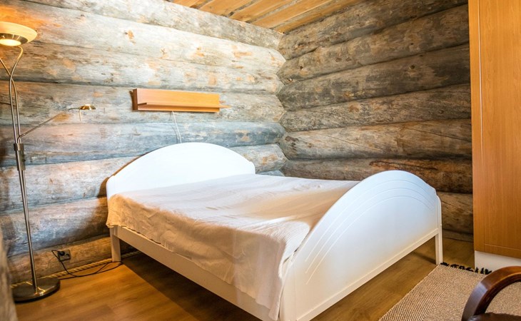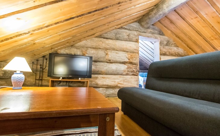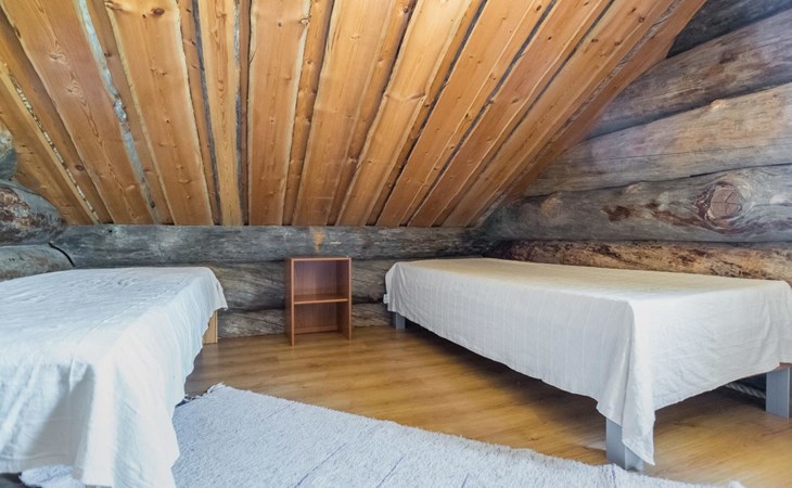 Log cabin, built in 2007. Living room/kitchen. Ground floor: three bedrooms, each with 2 beds. Upstairs with sloping ceilings: two bedrooms (no door): one with 2 beds and mattress, other with 3 single beds. Convertible sofa bed as extra bed in upstairs lobby. Electric sauna and bathroom with toilet. Additionally separate toilet.