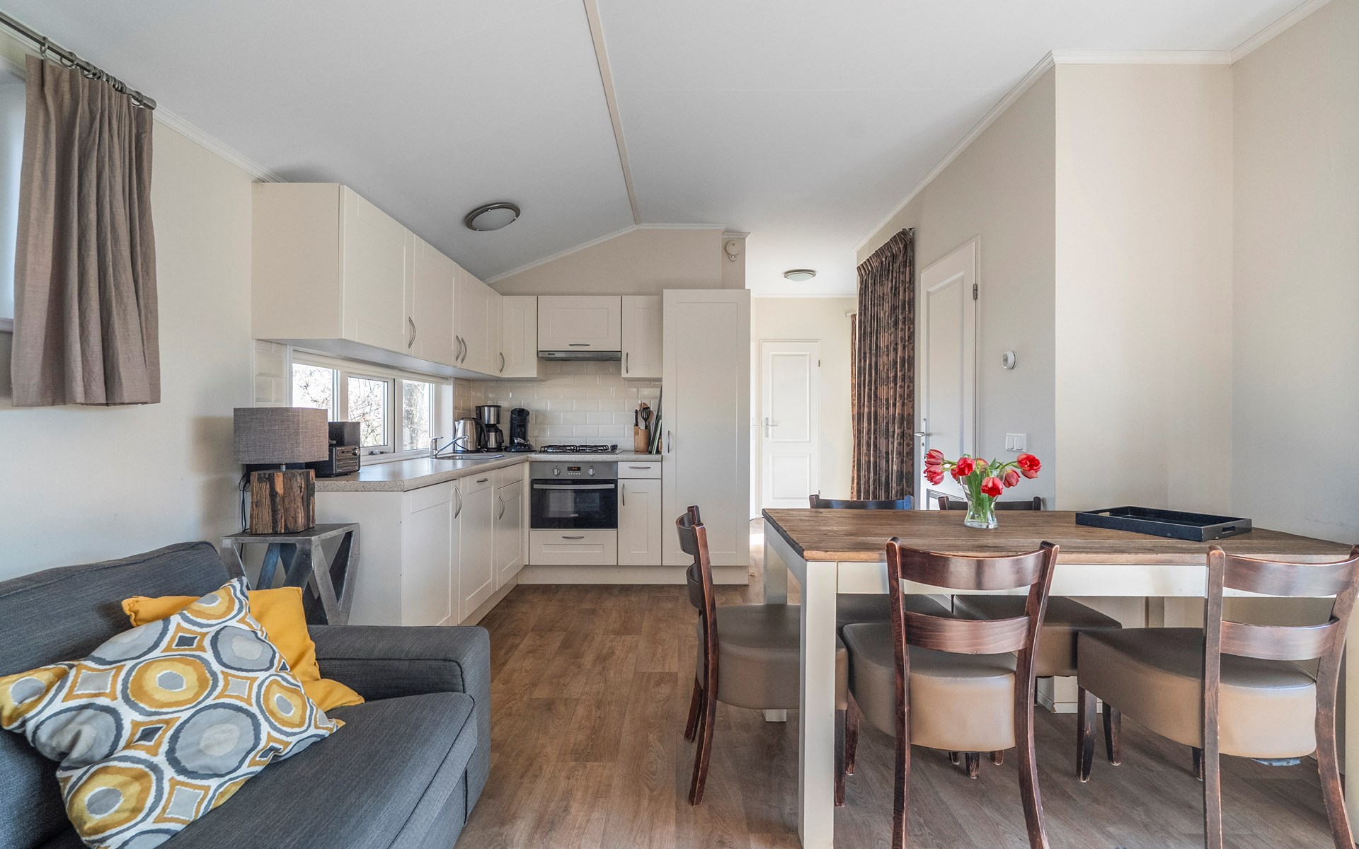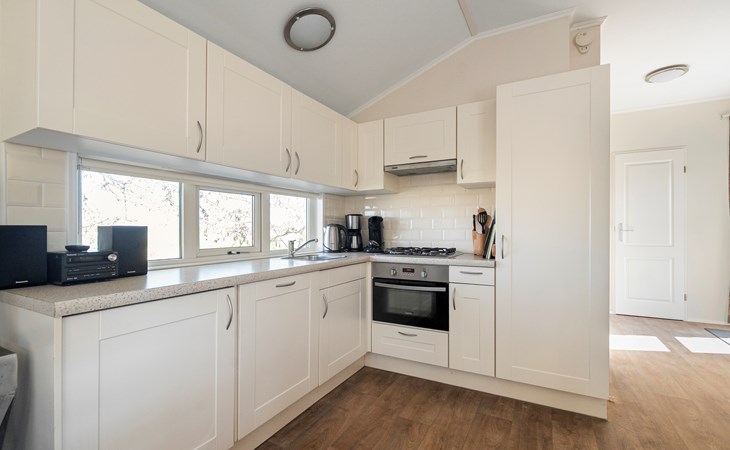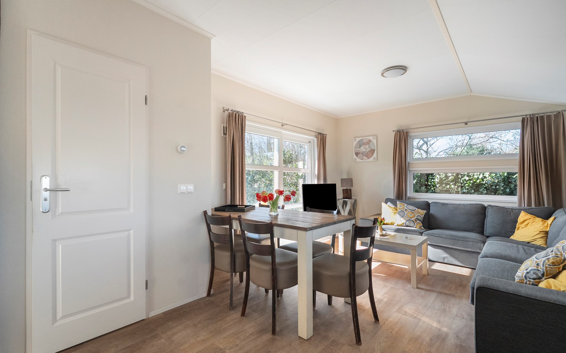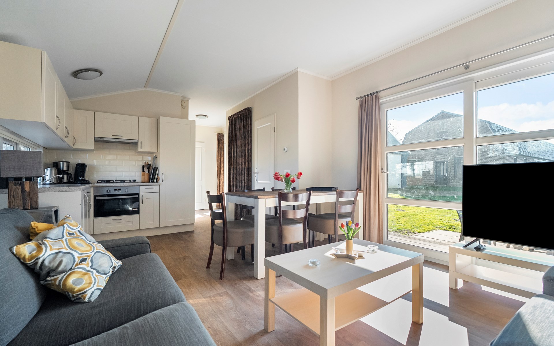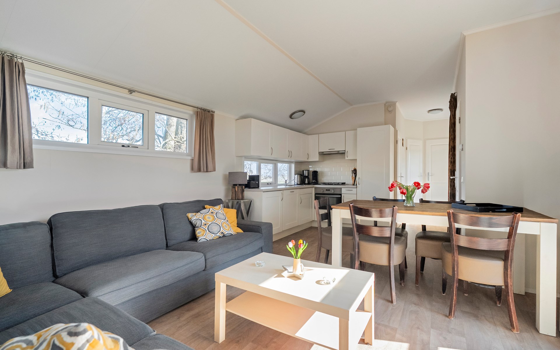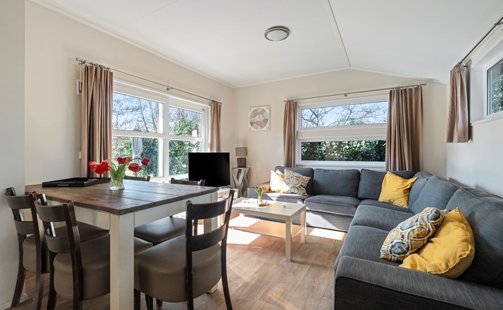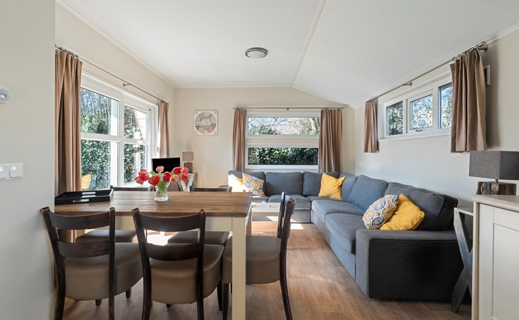 De lichte woonkamer is sfeervol ingericht en vormt het hart van het chalet. De open indeling zorgt voor een prettige verbinding tussen zithoek, eethoek en keuken. Grote ramen zorgen voor veel daglicht en een ruimtelijk gevoel.