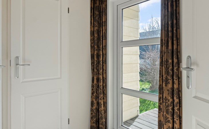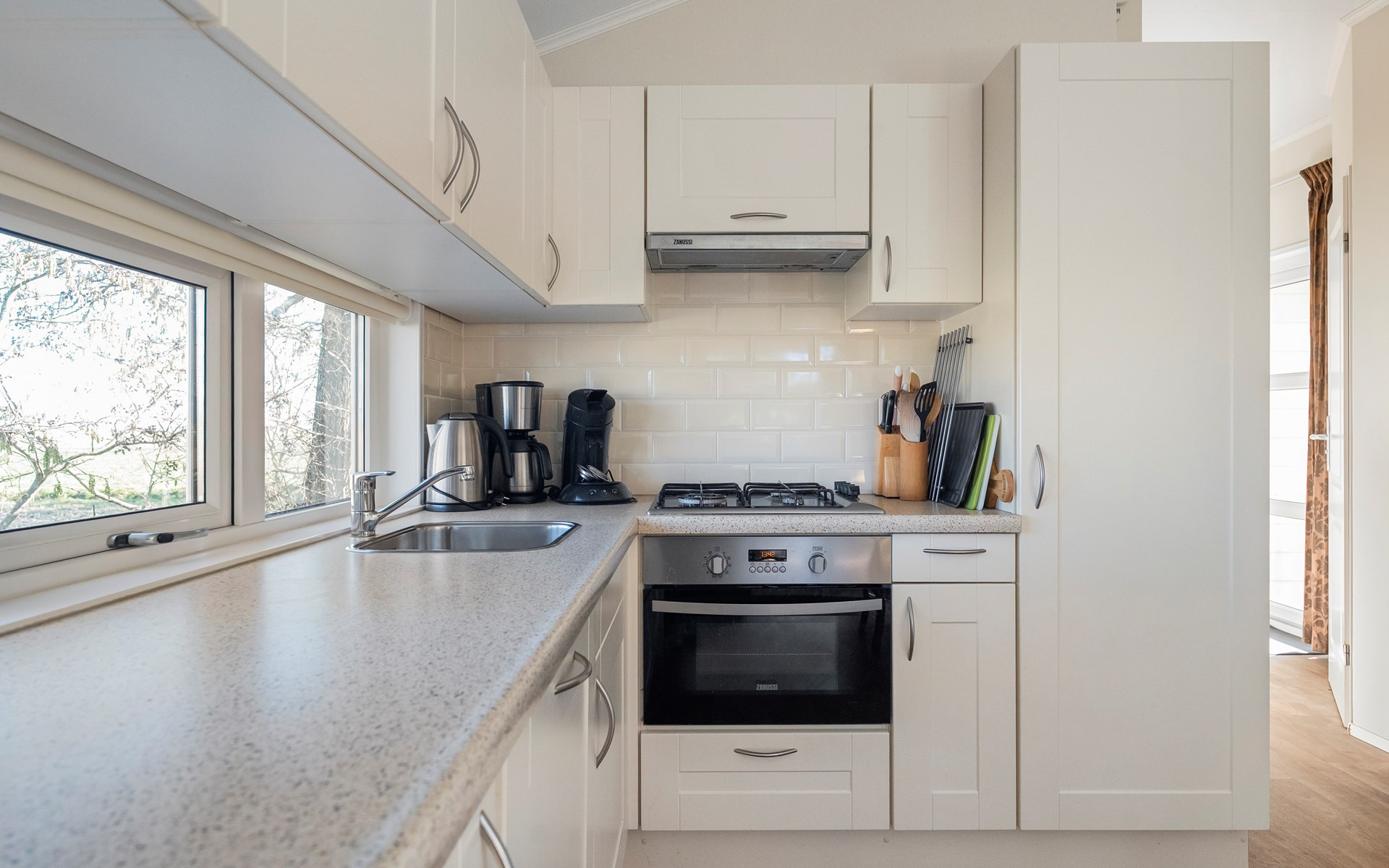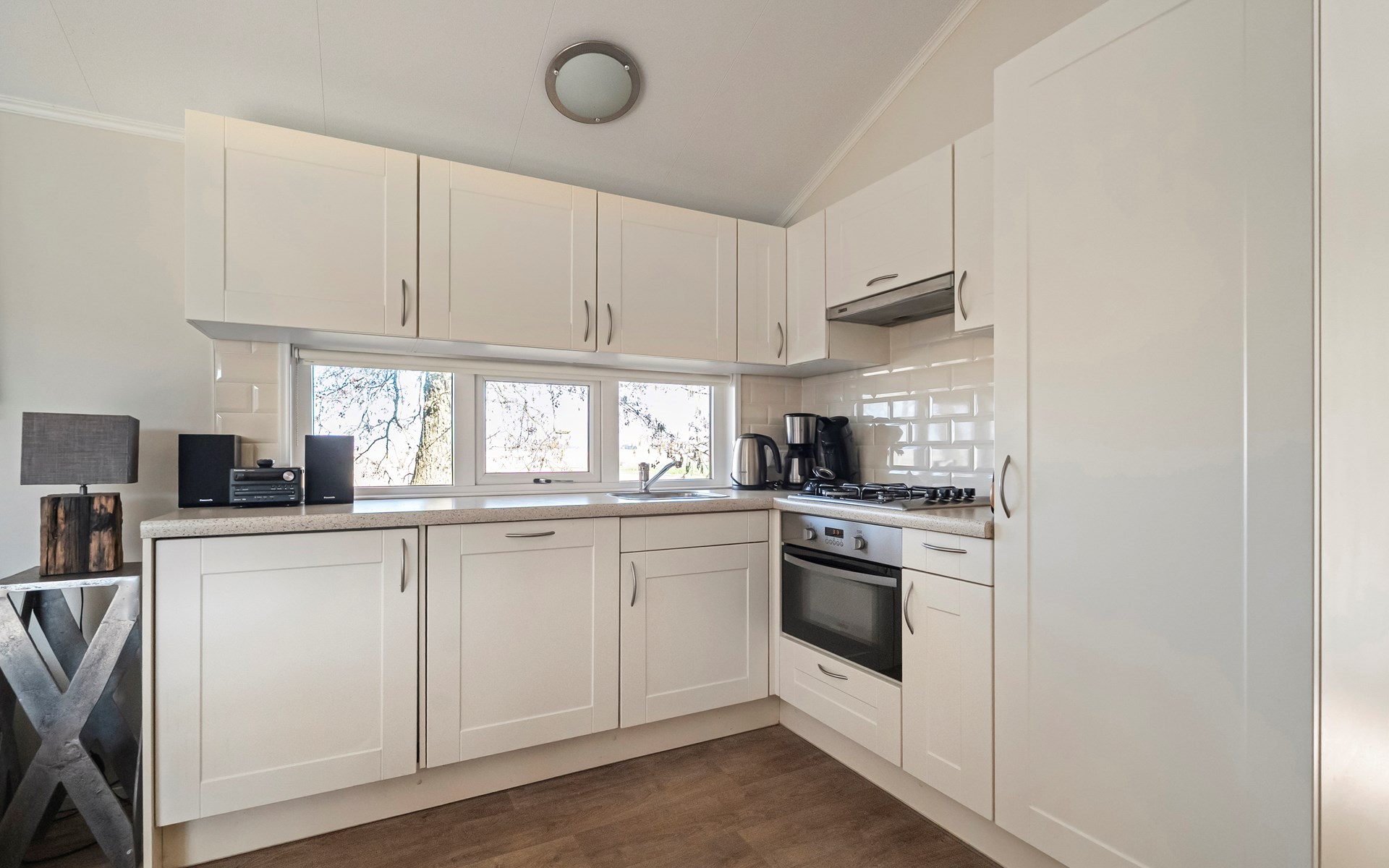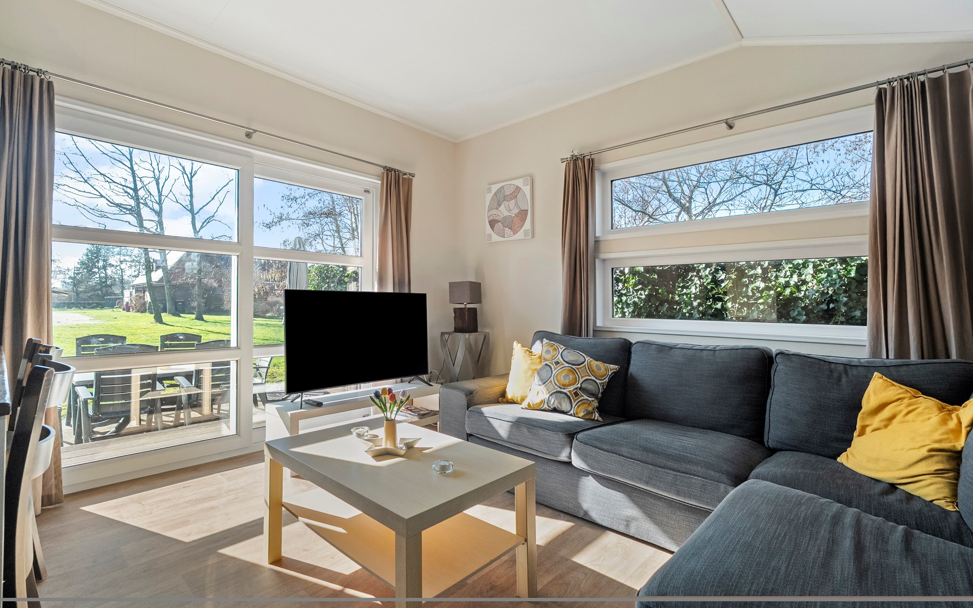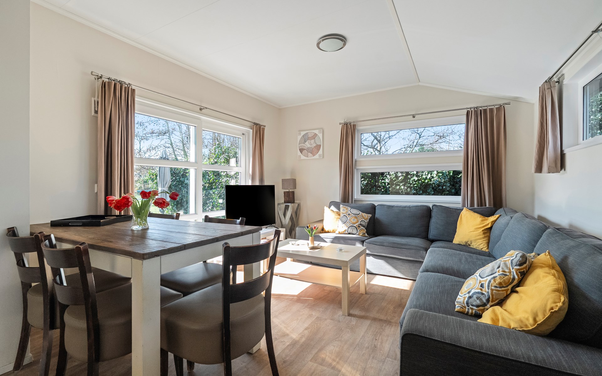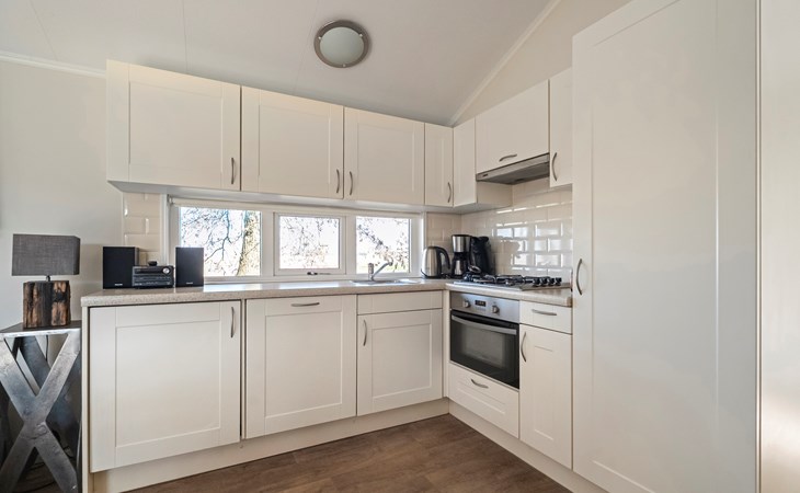 De lichte woonkamer is sfeervol ingericht en vormt het hart van het chalet. De open indeling zorgt voor een prettige verbinding tussen zithoek, eethoek en keuken. Grote ramen zorgen voor veel daglicht en een ruimtelijk gevoel.