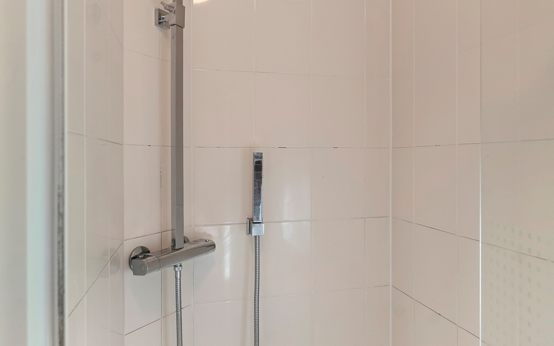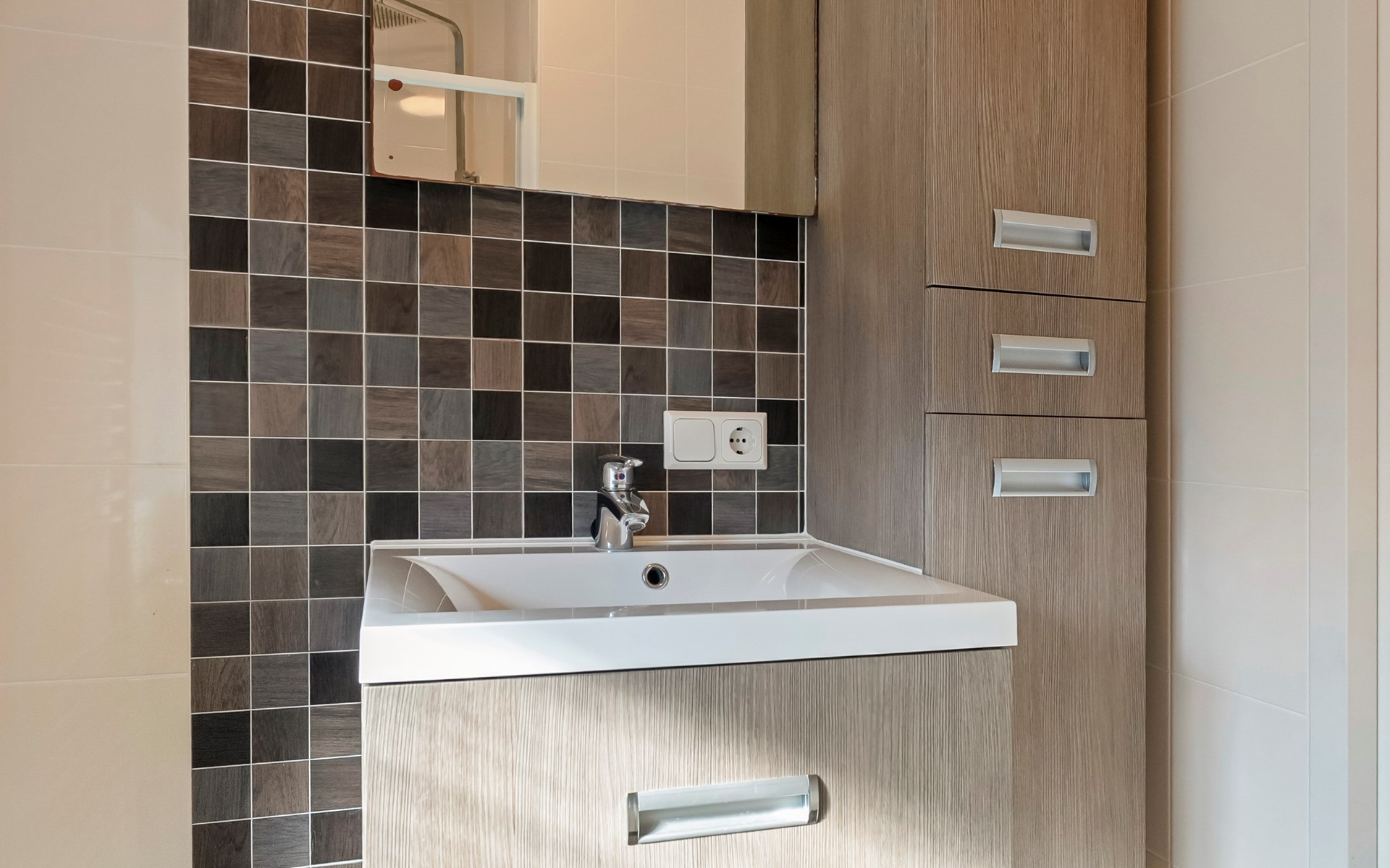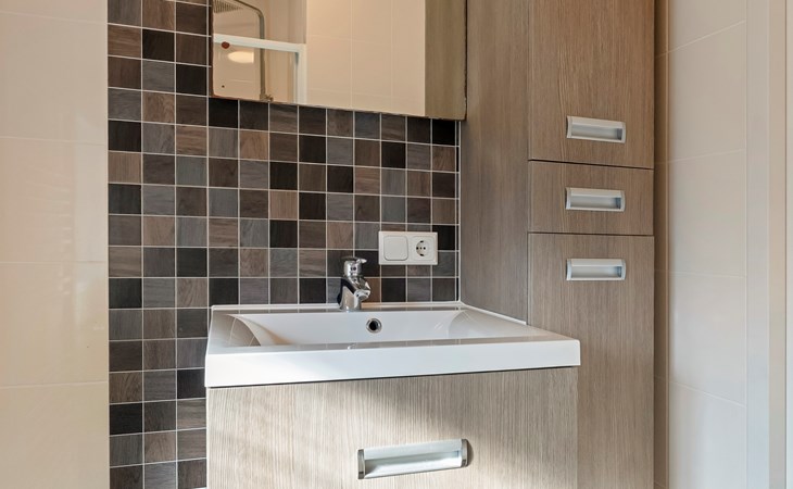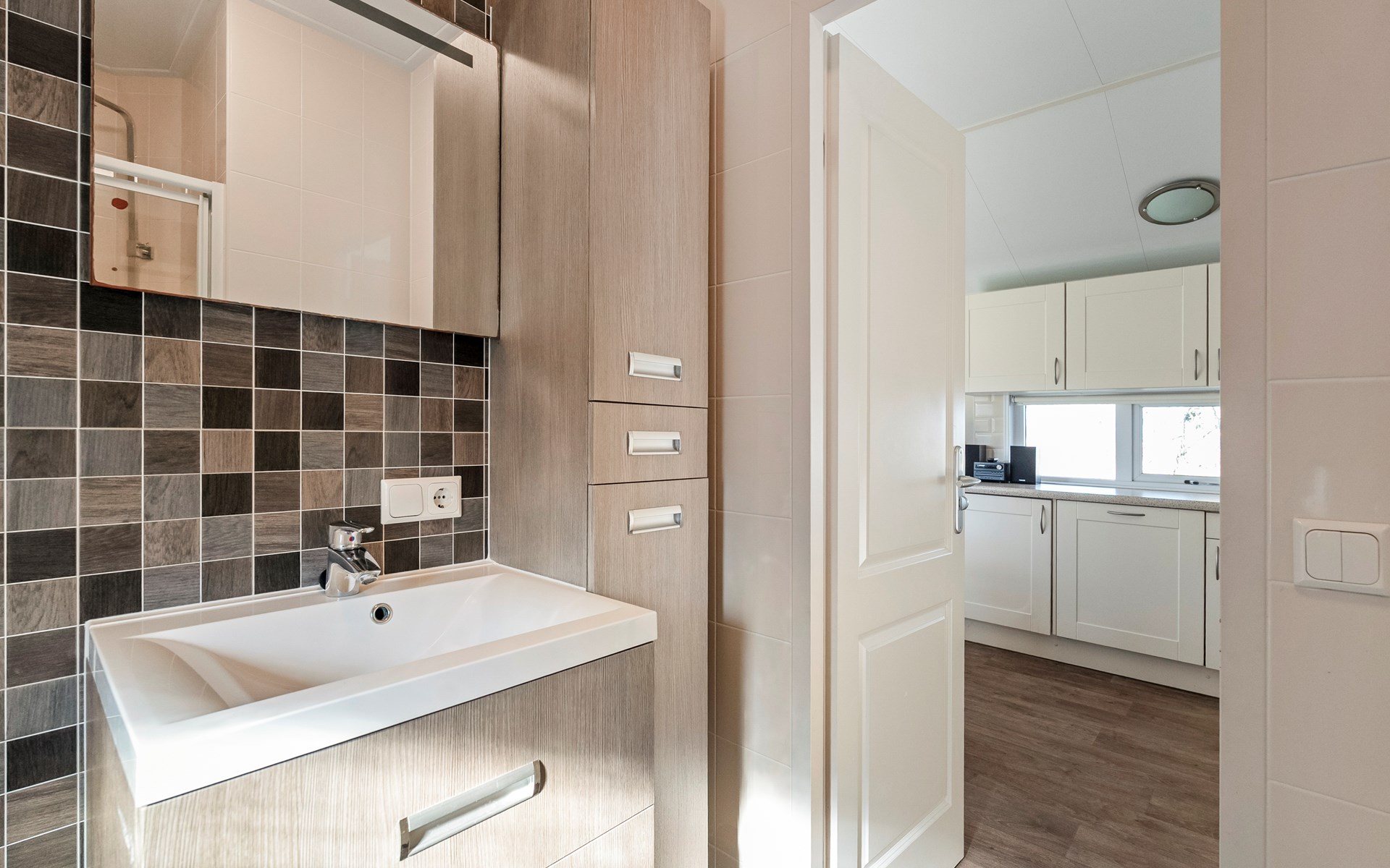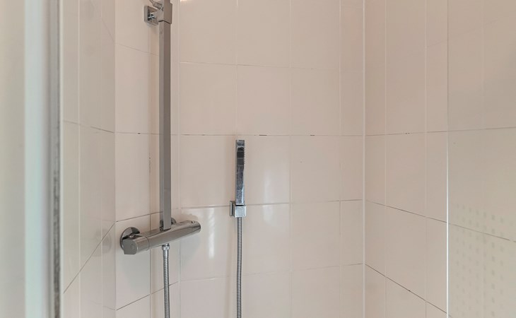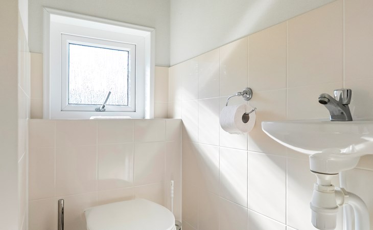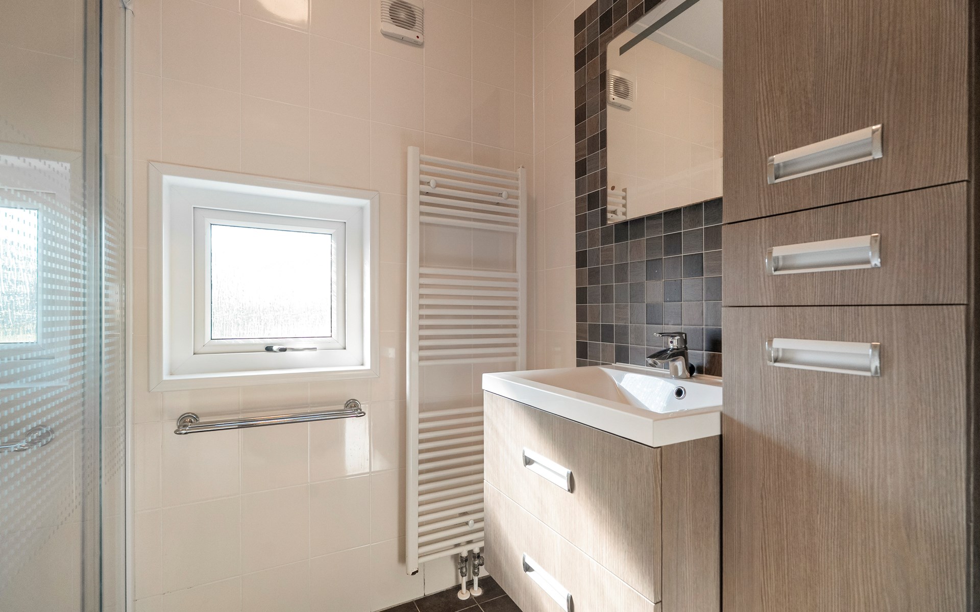 De moderne badkamer is stijlvol afgewerkt en voorzien van een douche en wastafel. Daarnaast beschikt het chalet over een separaat toilet — extra comfortabel voor een verblijf met meerdere personen.