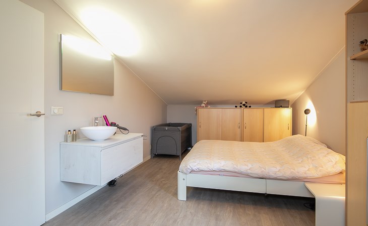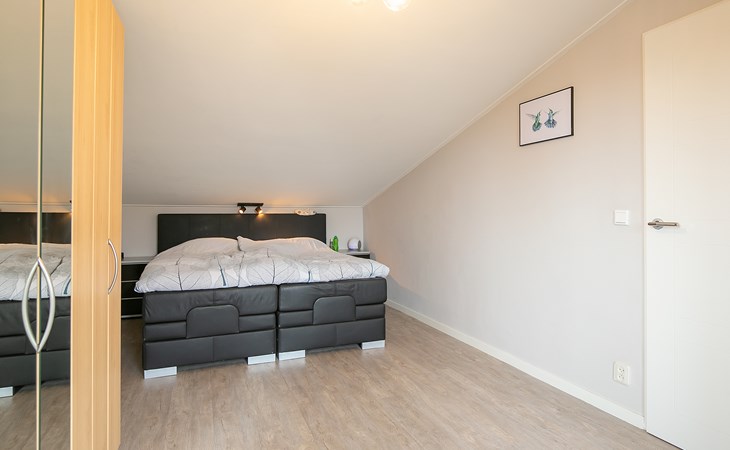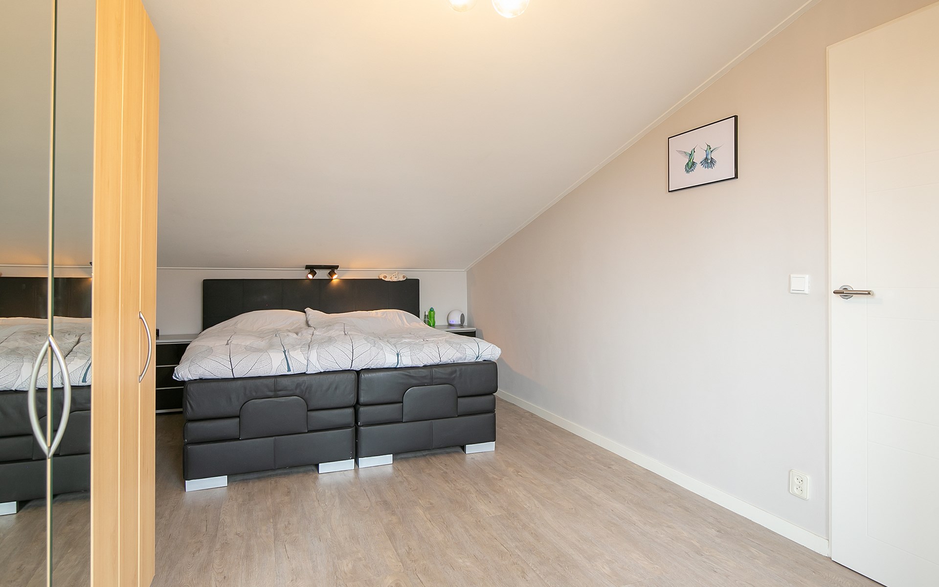 Via de wenteltrap in de woonkamer komt u uit op de eerste etage. Hier vindt u een tweepersoons slaapkamer met wastafel en een tweepersoons slaapkamer met toegang tot het dakterras. Vanaf hier heeft u uitzicht op de prachtig aangelegde tuin met diverse zithoeken en de jachthaven in de verte.